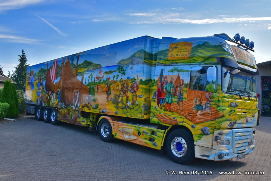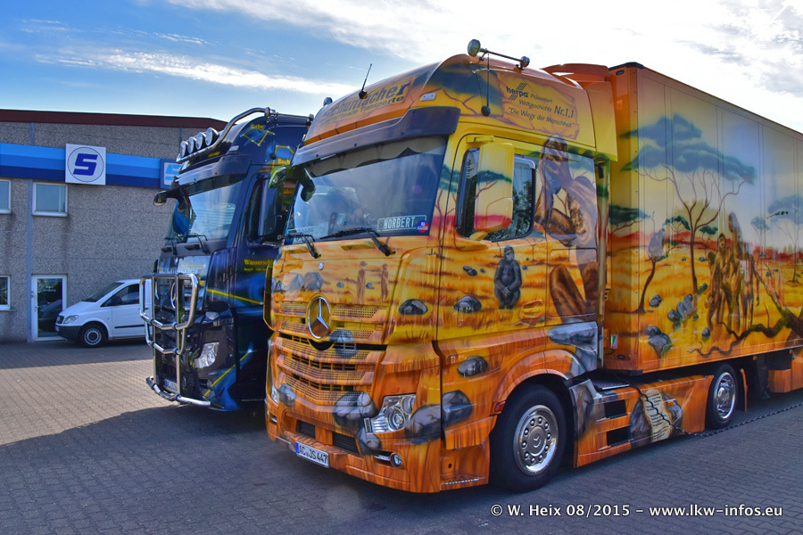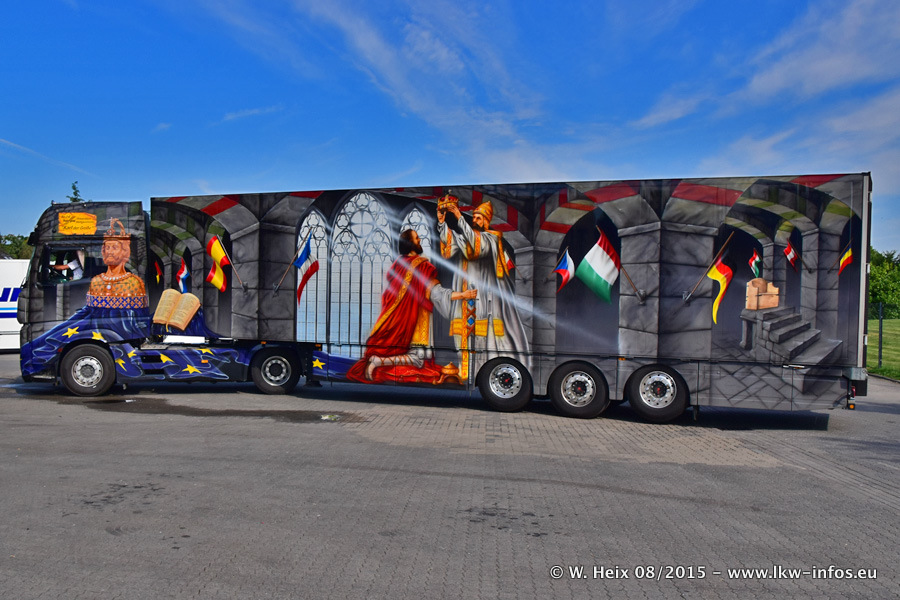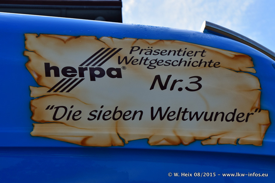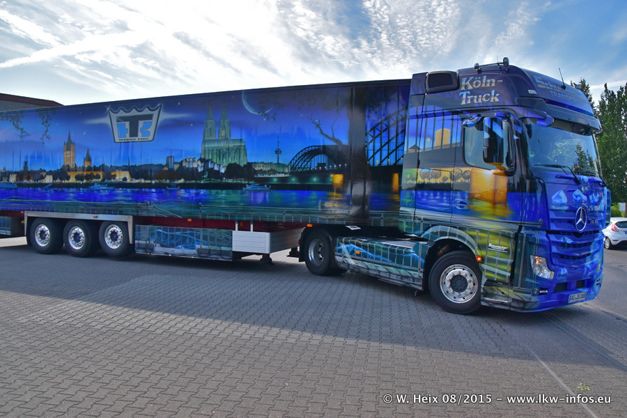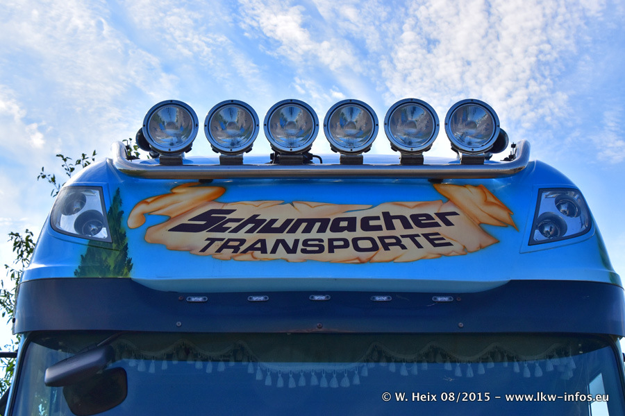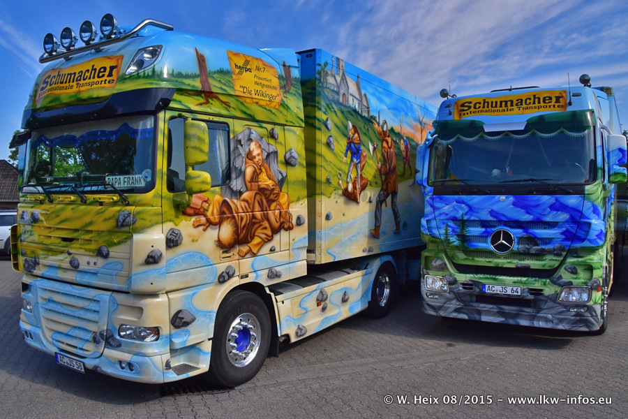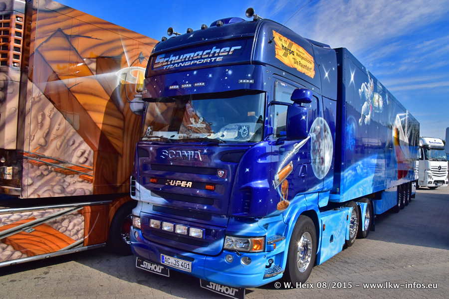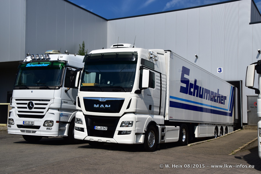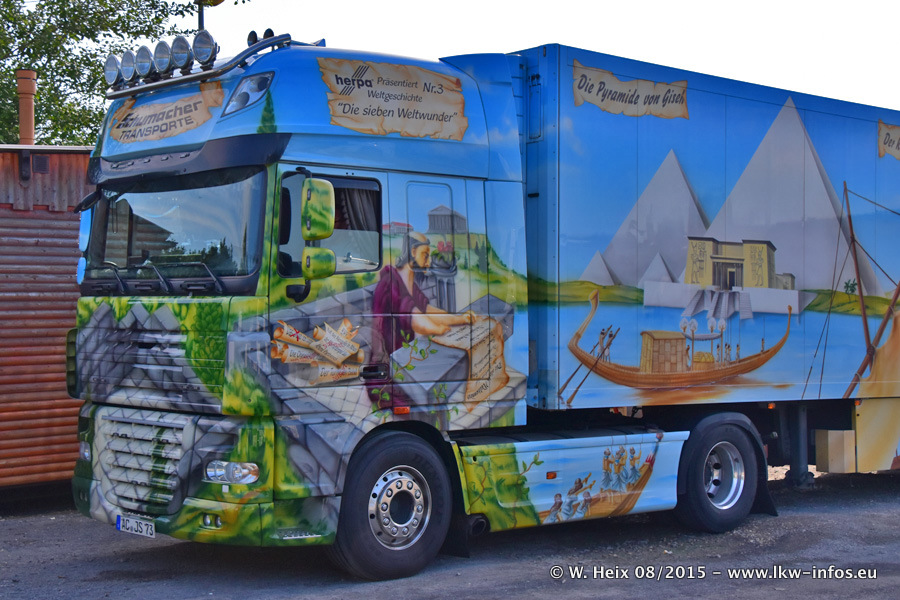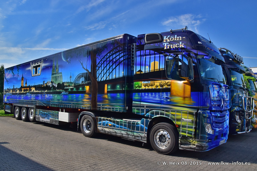 Bei diesem Besuch waren bis auf einen LKW alle Showtrucks der Herpa-Serie zuhause. Schumacher hat ja bekanntlich inzwischen den größten Teil dieser 14 Trucks im Fuhrpark. Die Nummer 1 bekam vor einigen Monaten eine neue Zugmaschine und läuft jetzt unter der Numer 1.1 "Die Wiege der Menschheit". Ende 2014 bekam Schumacher die Nummer 14 der Serie: "Herpa präsentiert Weltgeschichte Nr. 14 - Karl der Große". Das ist aktuell der letzte neue Showtruck der Herpa-Serie. Außerdem konnte ich diesmal den Köln-Truck von allen Seiten fotografieren, da dieser auch zuhause war. Danke an den/die Fahrer von Schumacher, die mir die Showtrucks zum Fotografieren auf dem Hof "ins richtige Licht" gerückt haben.