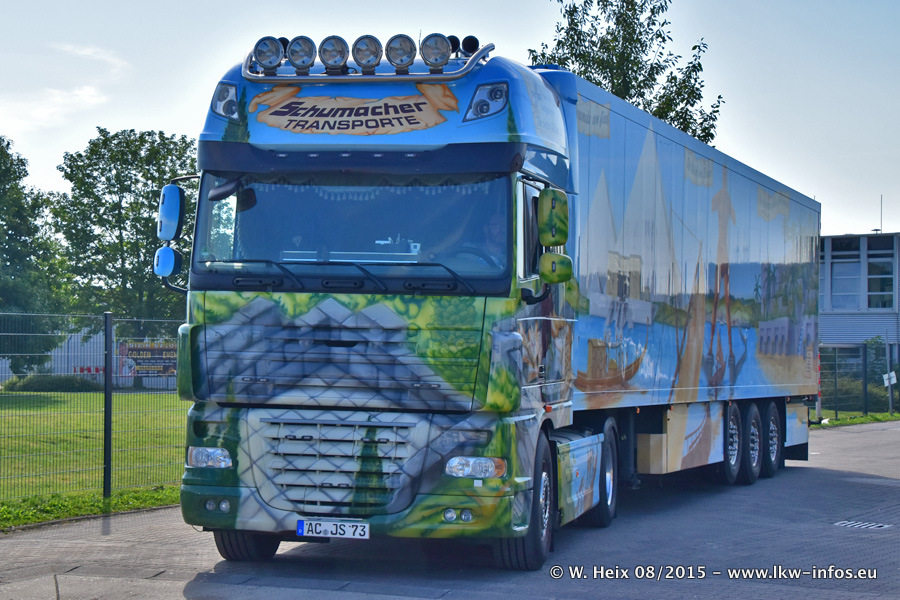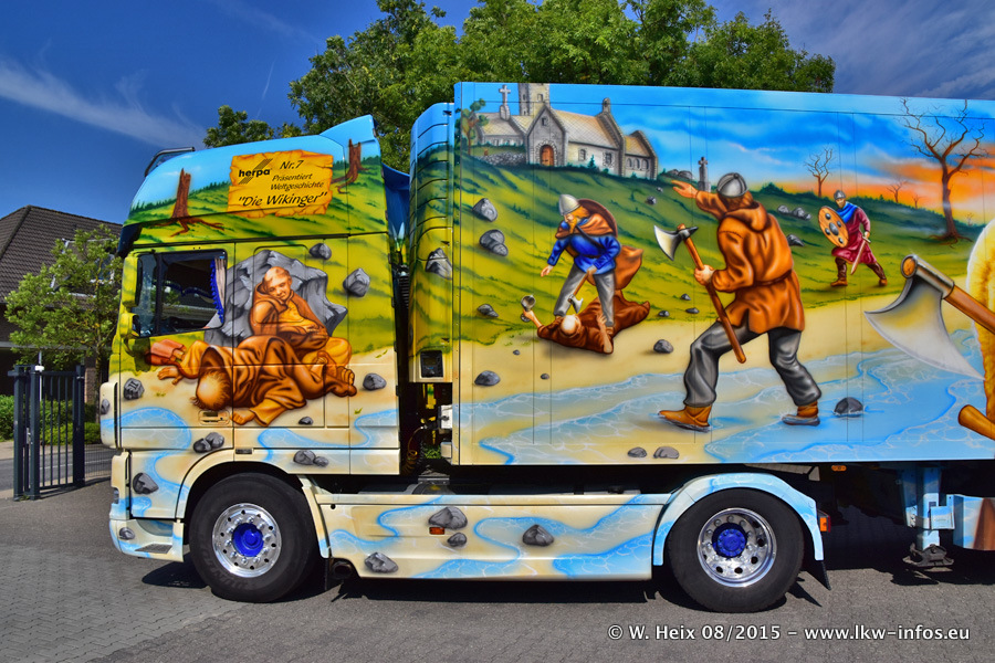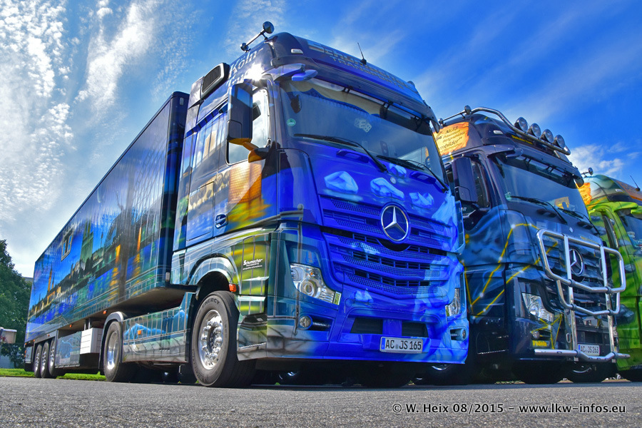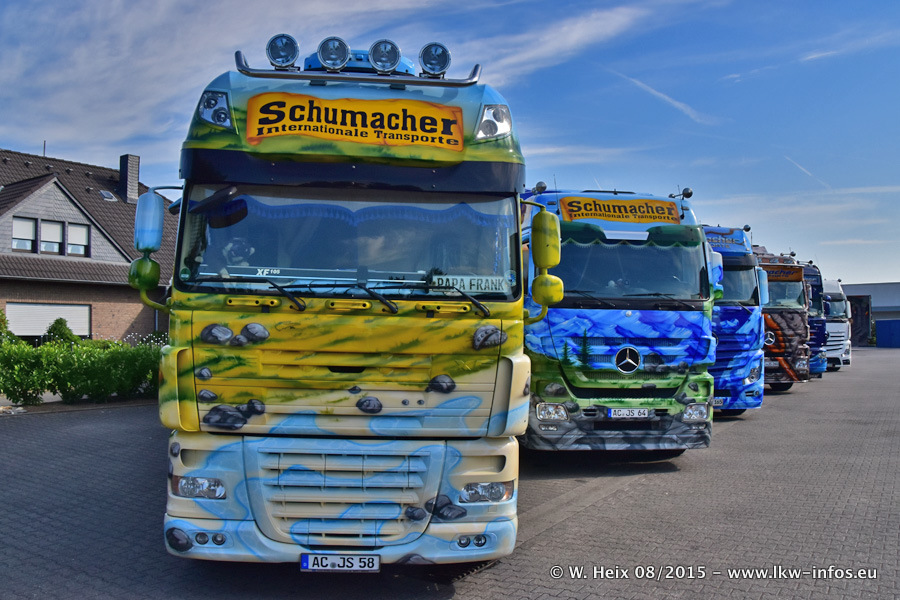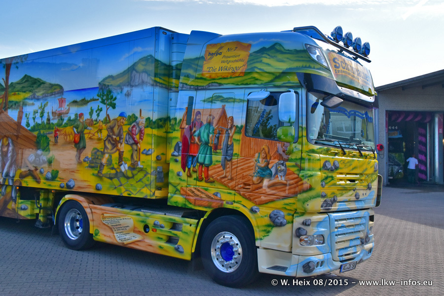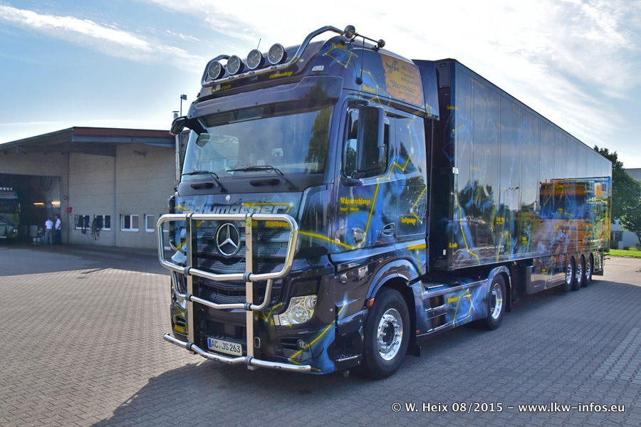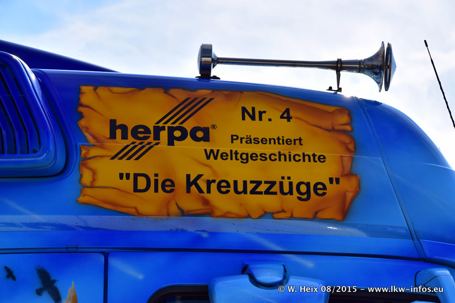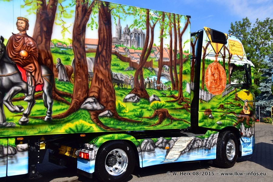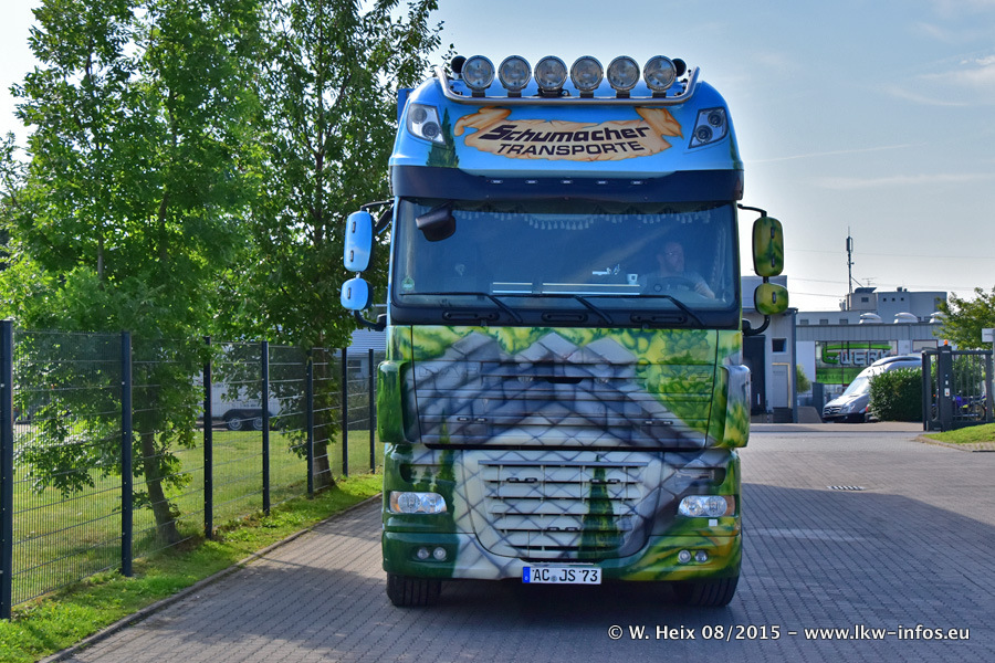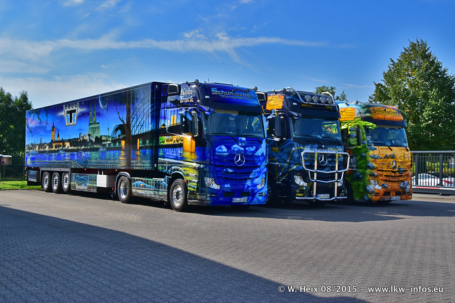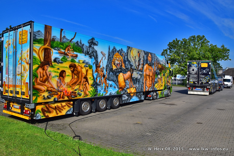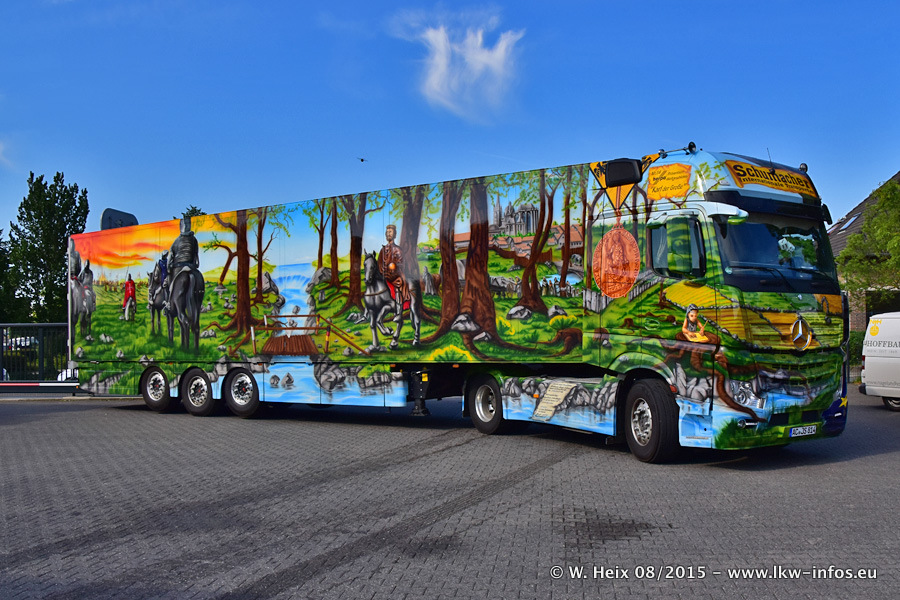 Bei diesem Besuch waren bis auf einen LKW alle Showtrucks der Herpa-Serie zuhause. Schumacher hat ja bekanntlich inzwischen den größten Teil dieser 14 Trucks im Fuhrpark. Die Nummer 1 bekam vor einigen Monaten eine neue Zugmaschine und läuft jetzt unter der Numer 1.1 "Die Wiege der Menschheit". Ende 2014 bekam Schumacher die Nummer 14 der Serie: "Herpa präsentiert Weltgeschichte Nr. 14 - Karl der Große". Das ist aktuell der letzte neue Showtruck der Herpa-Serie. Außerdem konnte ich diesmal den Köln-Truck von allen Seiten fotografieren, da dieser auch zuhause war. Danke an den/die Fahrer von Schumacher, die mir die Showtrucks zum Fotografieren auf dem Hof "ins richtige Licht" gerückt haben.