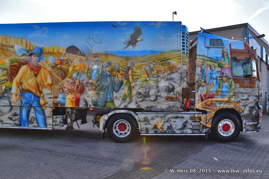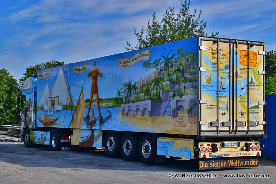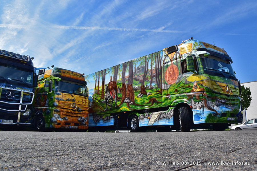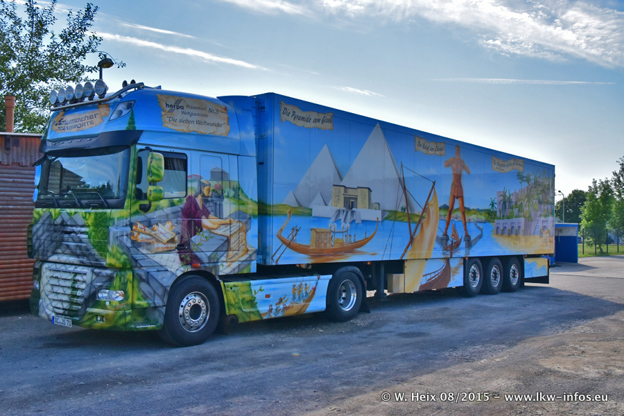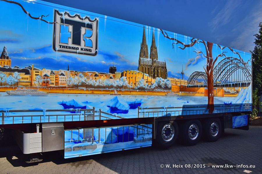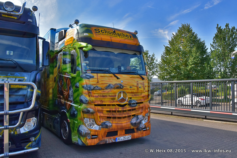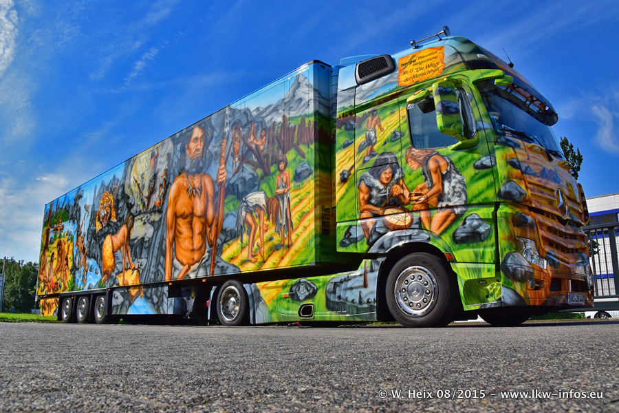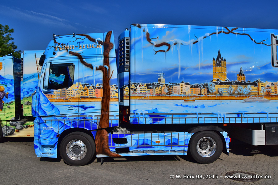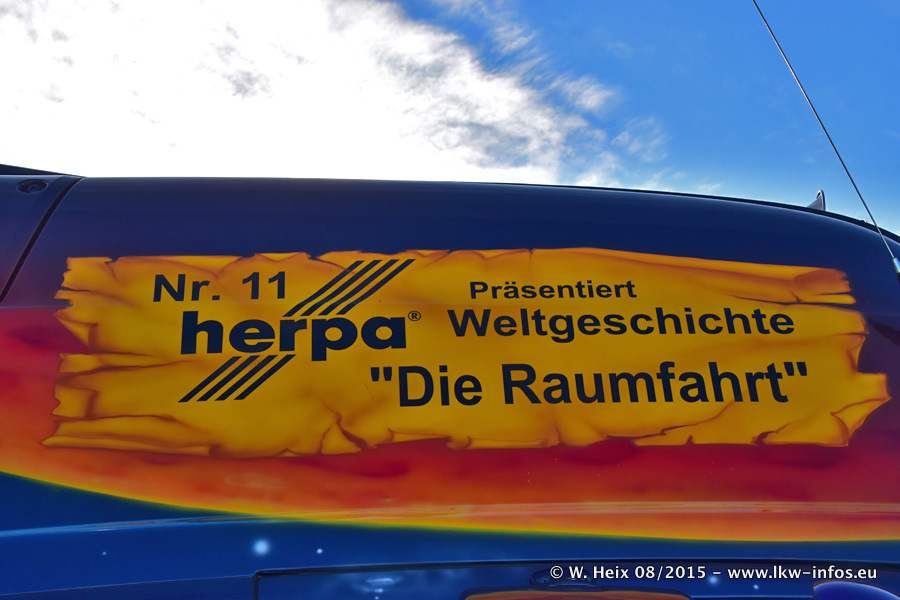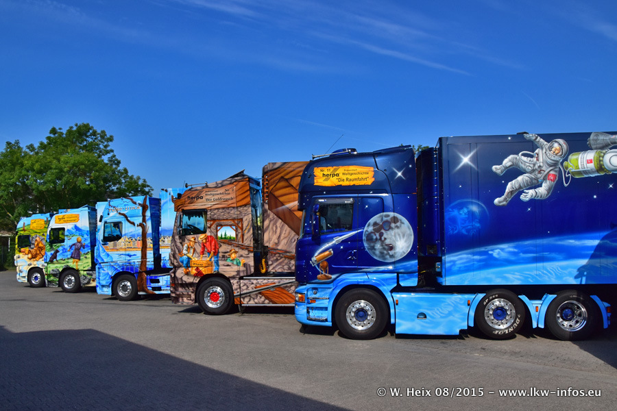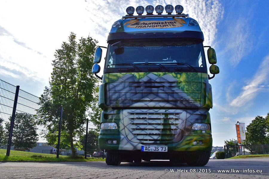 Bei diesem Besuch waren bis auf einen LKW alle Showtrucks der Herpa-Serie zuhause. Schumacher hat ja bekanntlich inzwischen den größten Teil dieser 14 Trucks im Fuhrpark. Die Nummer 1 bekam vor einigen Monaten eine neue Zugmaschine und läuft jetzt unter der Numer 1.1 "Die Wiege der Menschheit". Ende 2014 bekam Schumacher die Nummer 14 der Serie: "Herpa präsentiert Weltgeschichte Nr. 14 - Karl der Große". Das ist aktuell der letzte neue Showtruck der Herpa-Serie. Außerdem konnte ich diesmal den Köln-Truck von allen Seiten fotografieren, da dieser auch zuhause war. Danke an den/die Fahrer von Schumacher, die mir die Showtrucks zum Fotografieren auf dem Hof "ins richtige Licht" gerückt haben.
