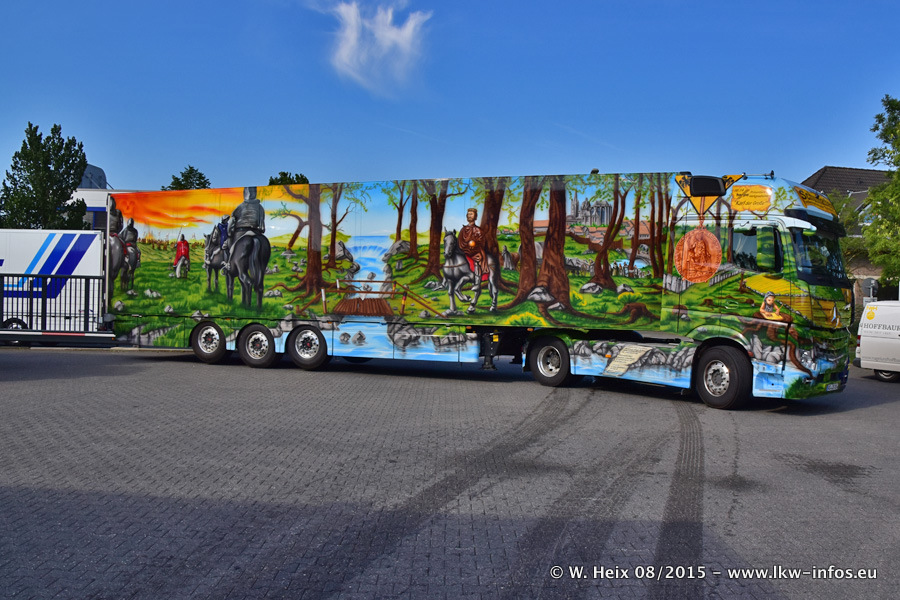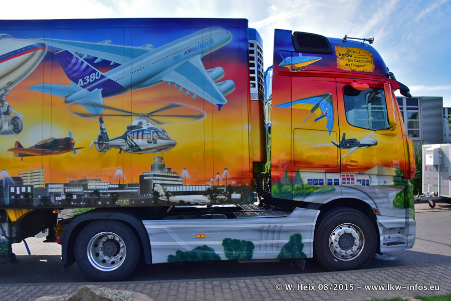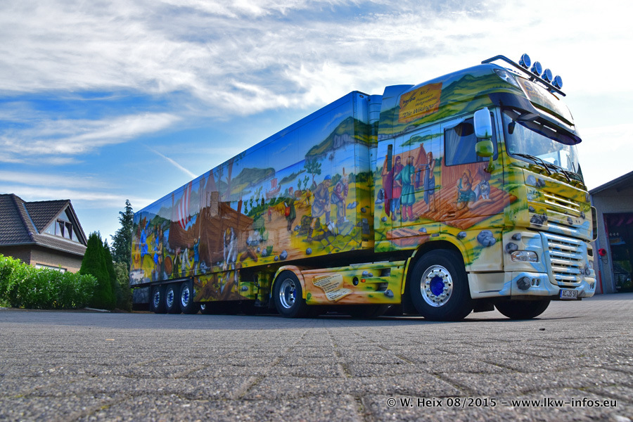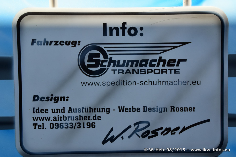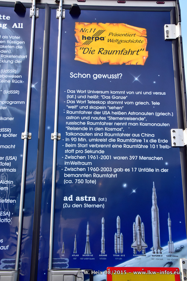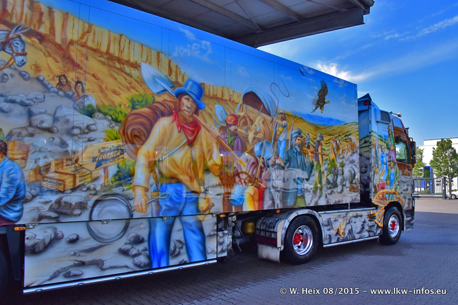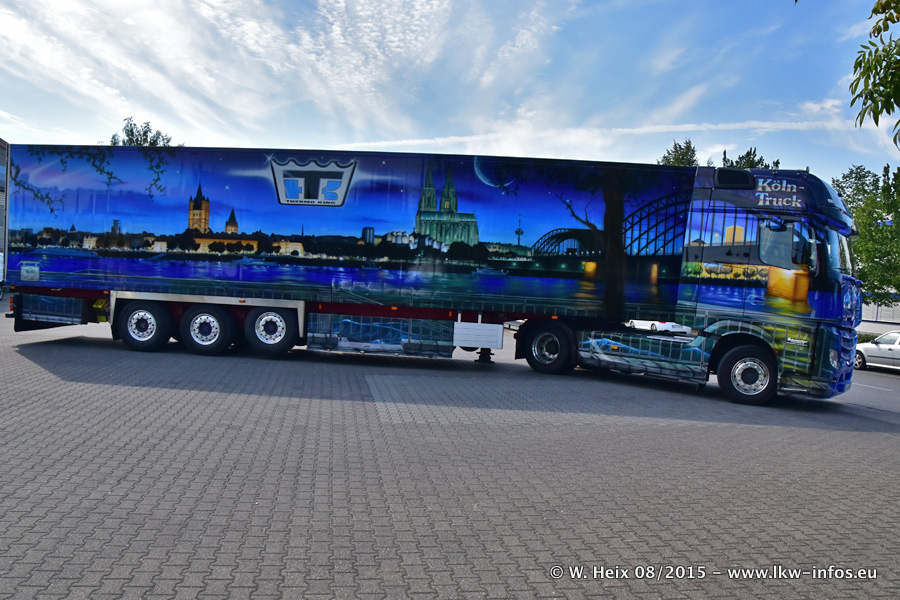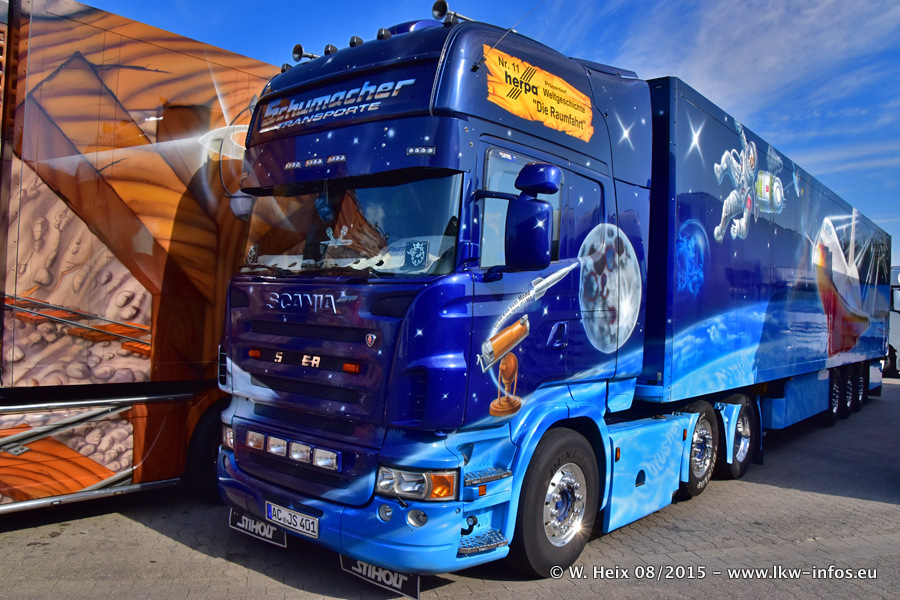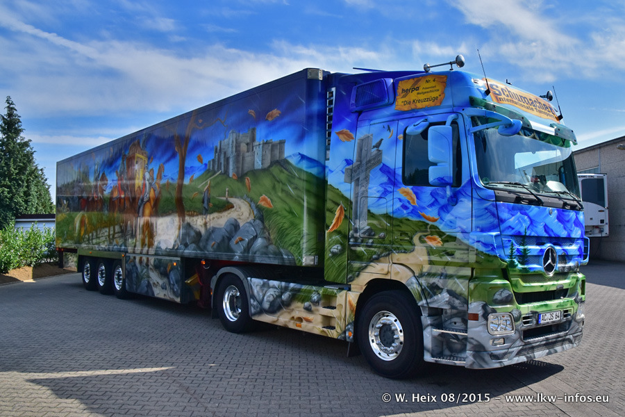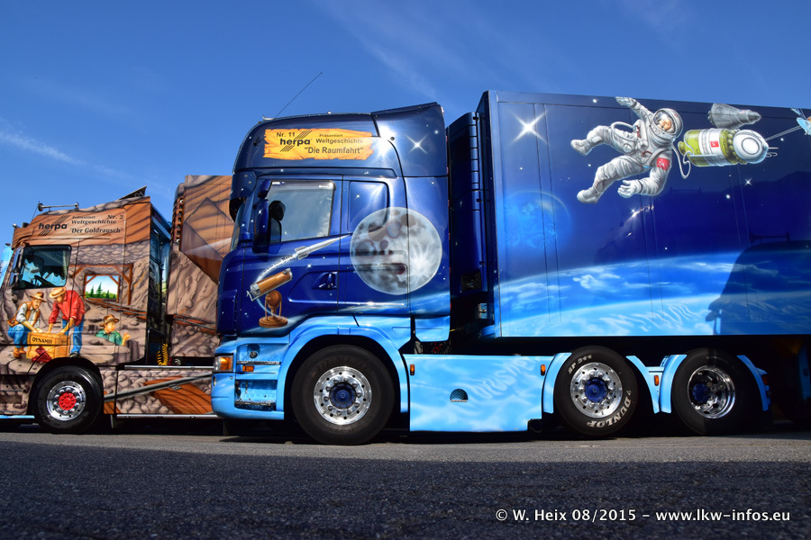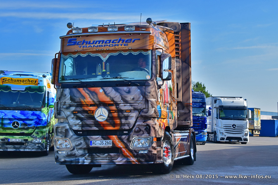 Bei diesem Besuch waren bis auf einen LKW alle Showtrucks der Herpa-Serie zuhause. Schumacher hat ja bekanntlich inzwischen den größten Teil dieser 14 Trucks im Fuhrpark. Die Nummer 1 bekam vor einigen Monaten eine neue Zugmaschine und läuft jetzt unter der Numer 1.1 "Die Wiege der Menschheit". Ende 2014 bekam Schumacher die Nummer 14 der Serie: "Herpa präsentiert Weltgeschichte Nr. 14 - Karl der Große". Das ist aktuell der letzte neue Showtruck der Herpa-Serie. Außerdem konnte ich diesmal den Köln-Truck von allen Seiten fotografieren, da dieser auch zuhause war. Danke an den/die Fahrer von Schumacher, die mir die Showtrucks zum Fotografieren auf dem Hof "ins richtige Licht" gerückt haben.