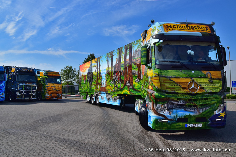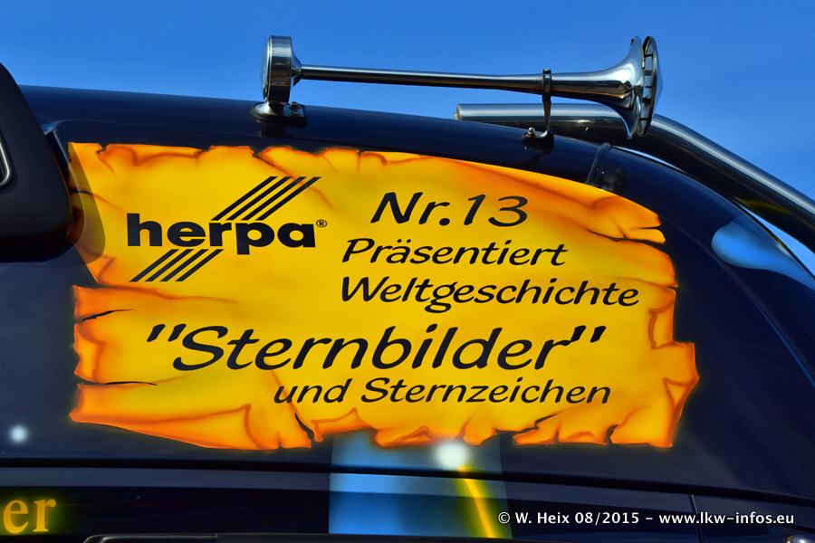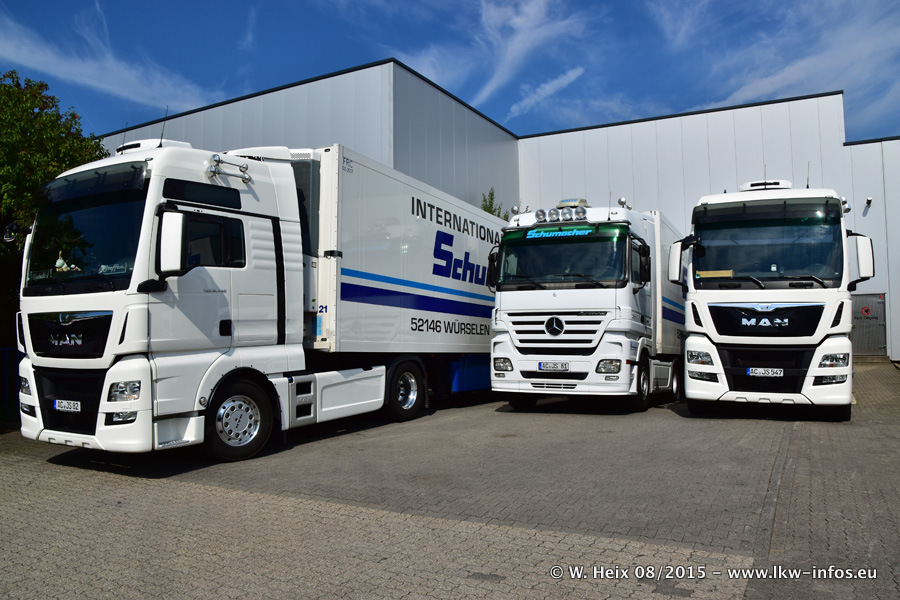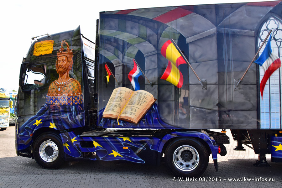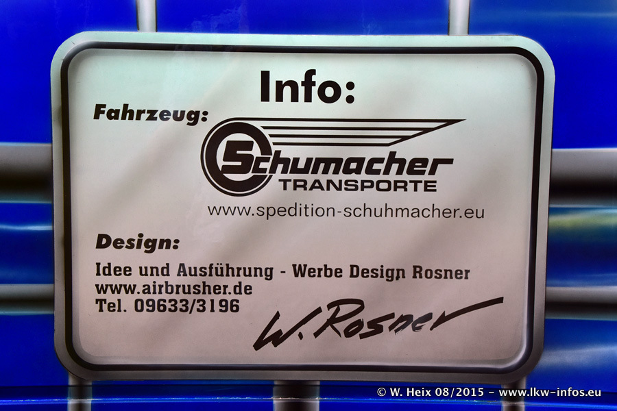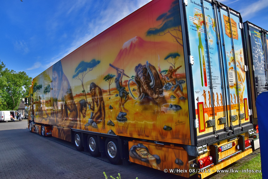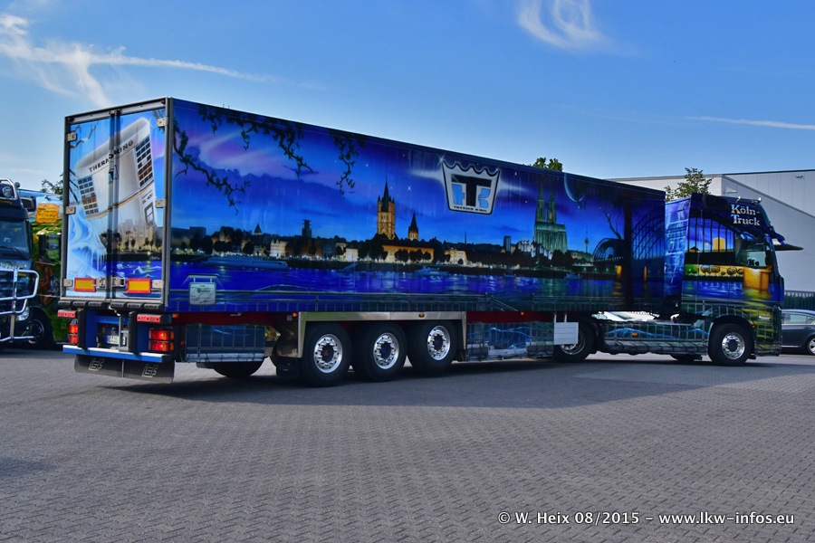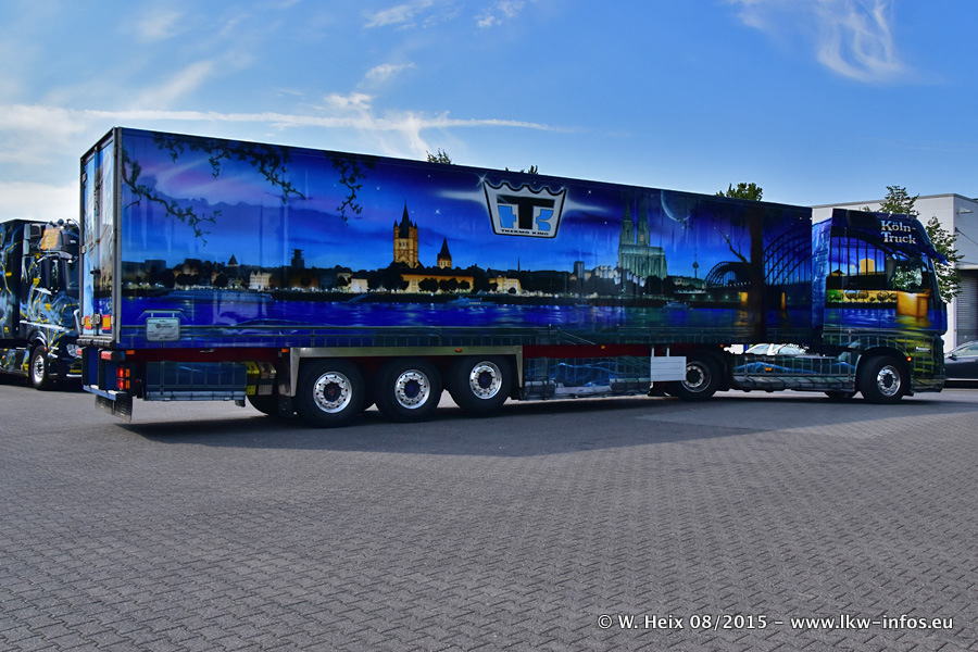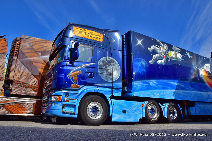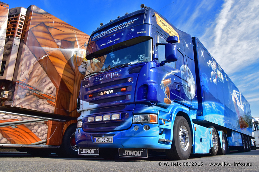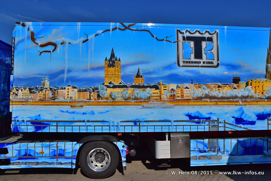 Bei diesem Besuch waren bis auf einen LKW alle Showtrucks der Herpa-Serie zuhause. Schumacher hat ja bekanntlich inzwischen den größten Teil dieser 14 Trucks im Fuhrpark. Die Nummer 1 bekam vor einigen Monaten eine neue Zugmaschine und läuft jetzt unter der Numer 1.1 "Die Wiege der Menschheit". Ende 2014 bekam Schumacher die Nummer 14 der Serie: "Herpa präsentiert Weltgeschichte Nr. 14 - Karl der Große". Das ist aktuell der letzte neue Showtruck der Herpa-Serie. Außerdem konnte ich diesmal den Köln-Truck von allen Seiten fotografieren, da dieser auch zuhause war. Danke an den/die Fahrer von Schumacher, die mir die Showtrucks zum Fotografieren auf dem Hof "ins richtige Licht" gerückt haben.