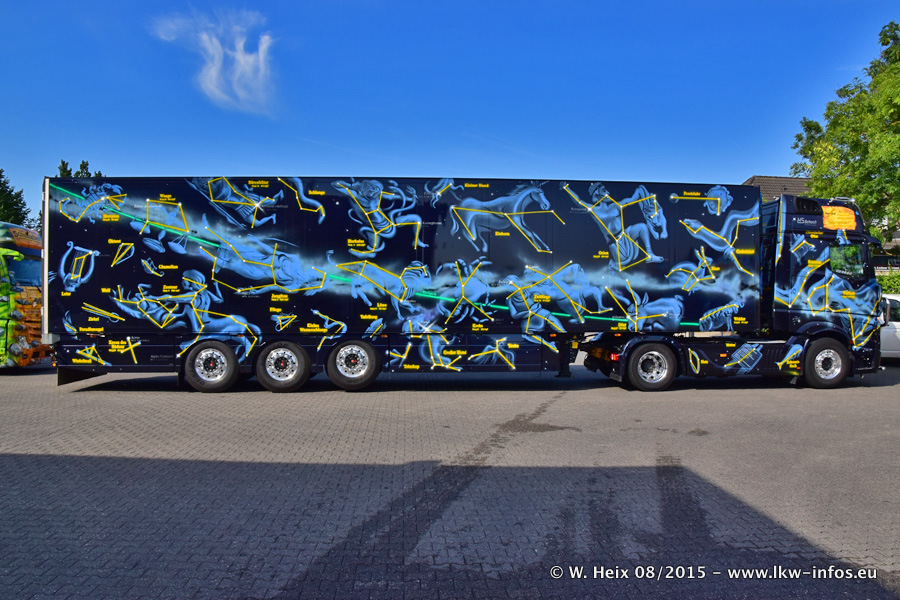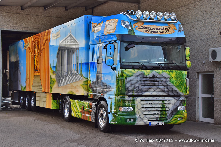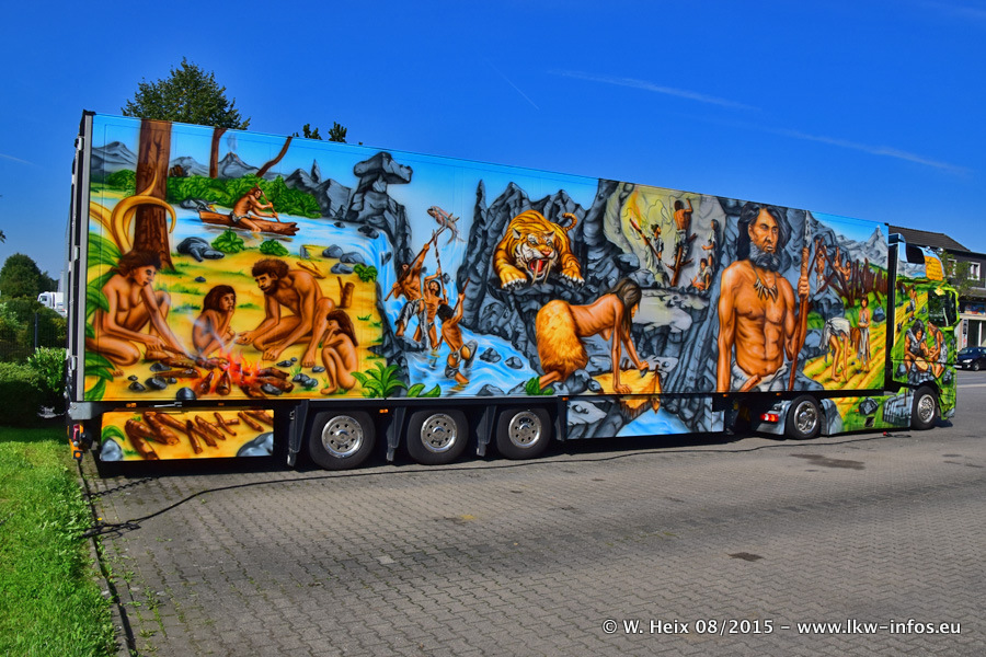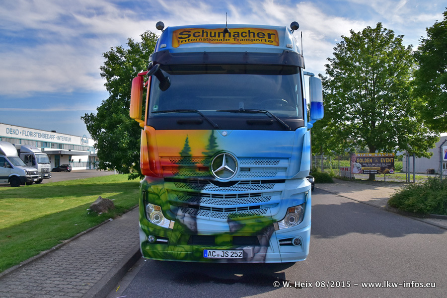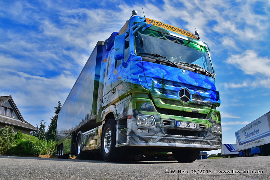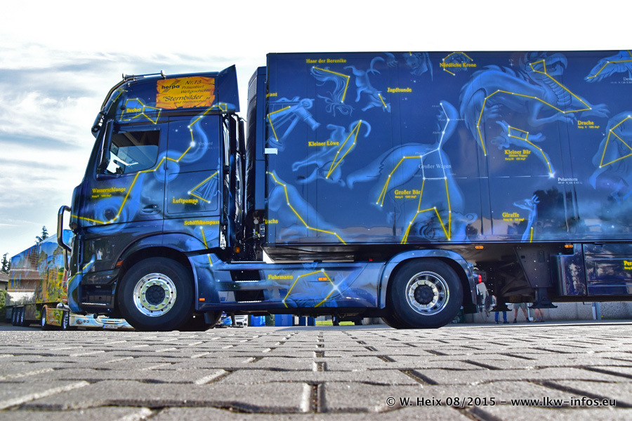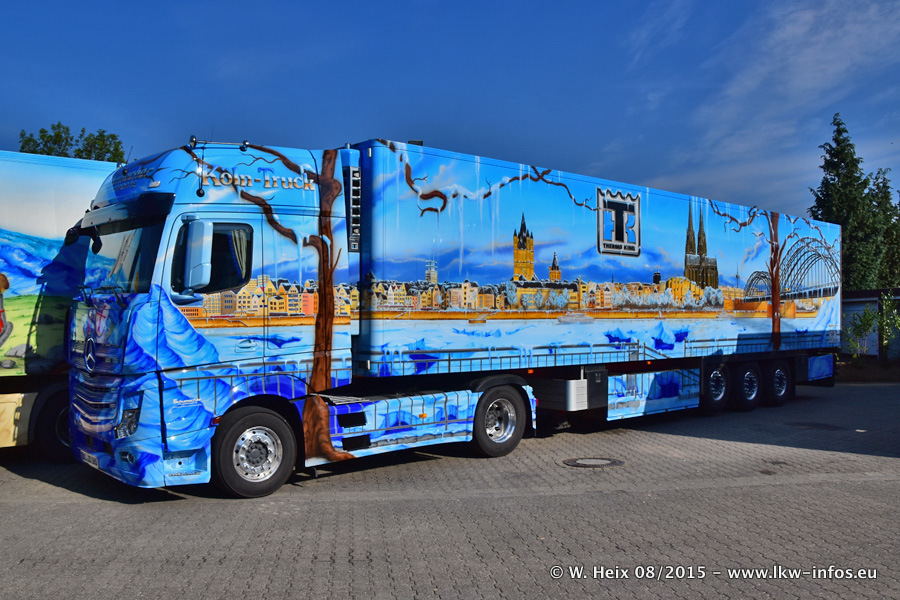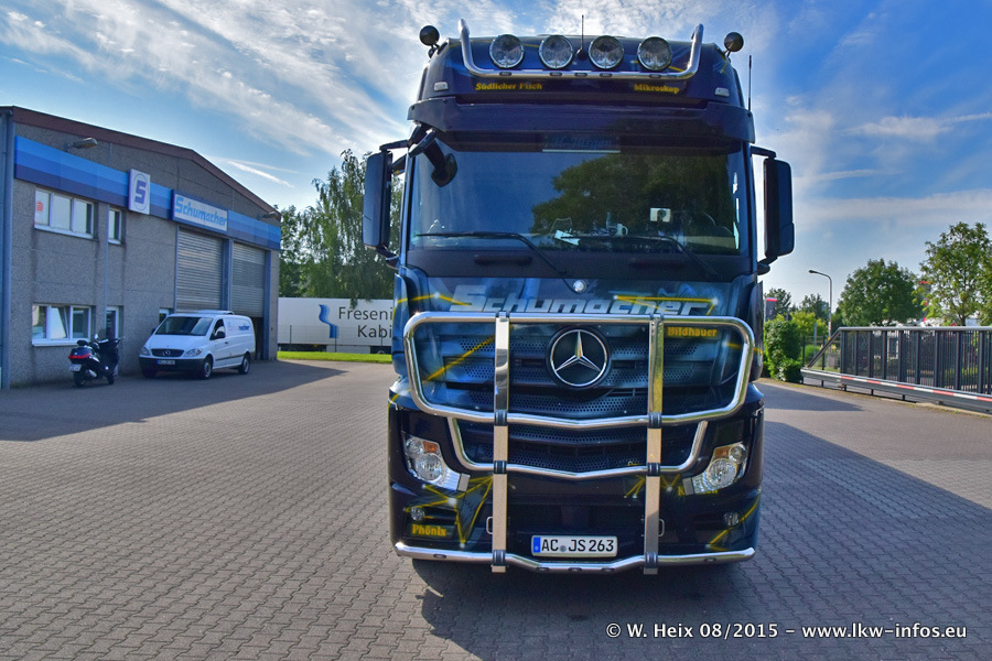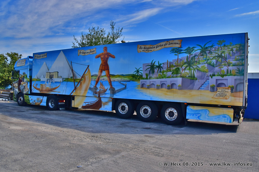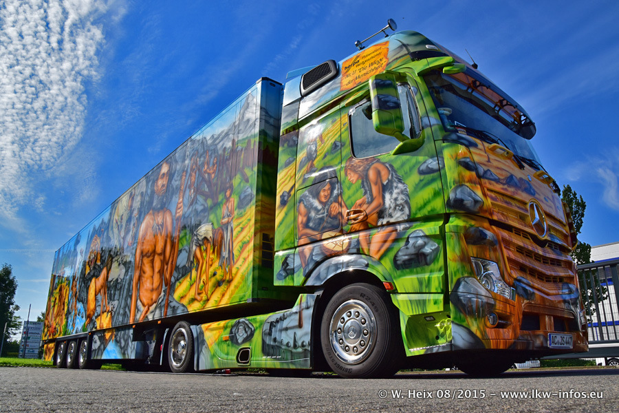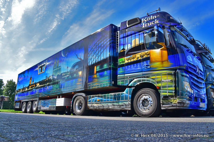 Bei diesem Besuch waren bis auf einen LKW alle Showtrucks der Herpa-Serie zuhause. Schumacher hat ja bekanntlich inzwischen den größten Teil dieser 14 Trucks im Fuhrpark. Die Nummer 1 bekam vor einigen Monaten eine neue Zugmaschine und läuft jetzt unter der Numer 1.1 "Die Wiege der Menschheit". Ende 2014 bekam Schumacher die Nummer 14 der Serie: "Herpa präsentiert Weltgeschichte Nr. 14 - Karl der Große". Das ist aktuell der letzte neue Showtruck der Herpa-Serie. Außerdem konnte ich diesmal den Köln-Truck von allen Seiten fotografieren, da dieser auch zuhause war. Danke an den/die Fahrer von Schumacher, die mir die Showtrucks zum Fotografieren auf dem Hof "ins richtige Licht" gerückt haben.