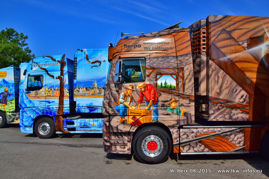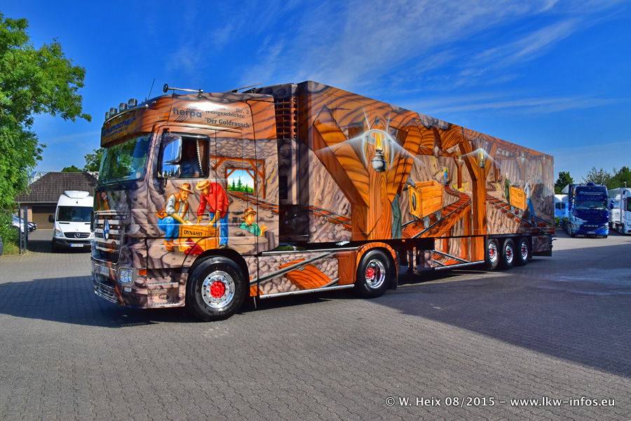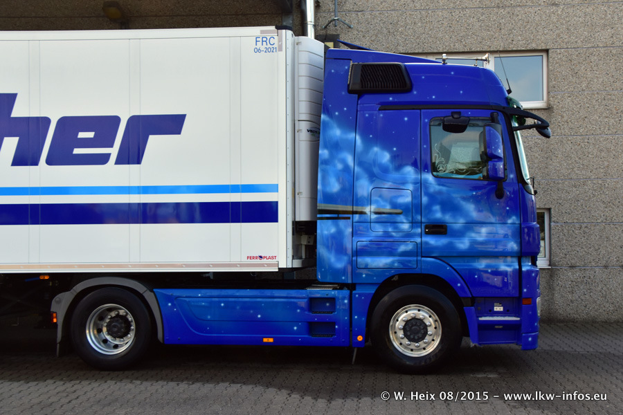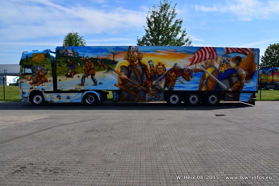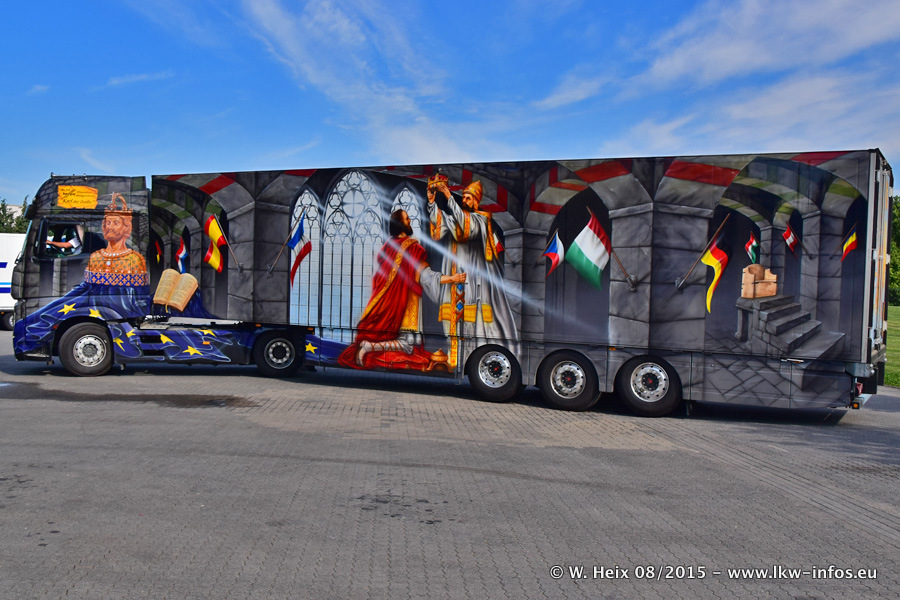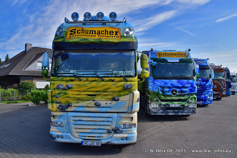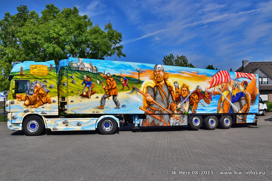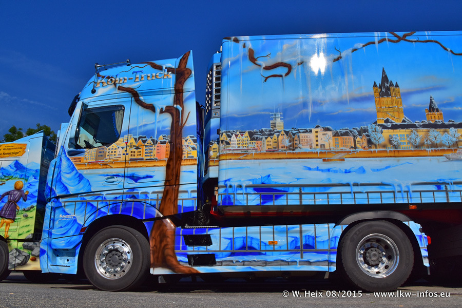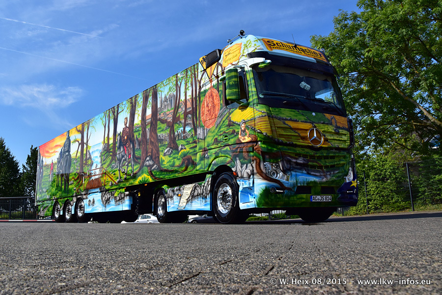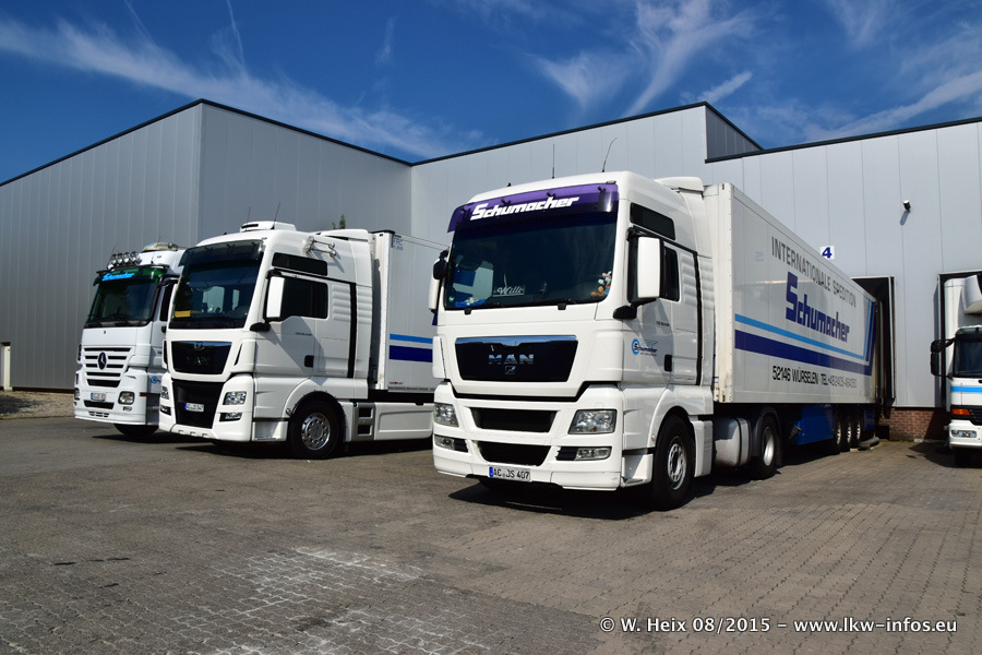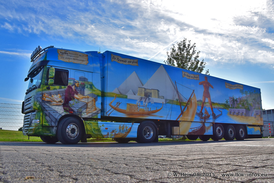 Bei diesem Besuch waren bis auf einen LKW alle Showtrucks der Herpa-Serie zuhause. Schumacher hat ja bekanntlich inzwischen den größten Teil dieser 14 Trucks im Fuhrpark. Die Nummer 1 bekam vor einigen Monaten eine neue Zugmaschine und läuft jetzt unter der Numer 1.1 "Die Wiege der Menschheit". Ende 2014 bekam Schumacher die Nummer 14 der Serie: "Herpa präsentiert Weltgeschichte Nr. 14 - Karl der Große". Das ist aktuell der letzte neue Showtruck der Herpa-Serie. Außerdem konnte ich diesmal den Köln-Truck von allen Seiten fotografieren, da dieser auch zuhause war. Danke an den/die Fahrer von Schumacher, die mir die Showtrucks zum Fotografieren auf dem Hof "ins richtige Licht" gerückt haben.