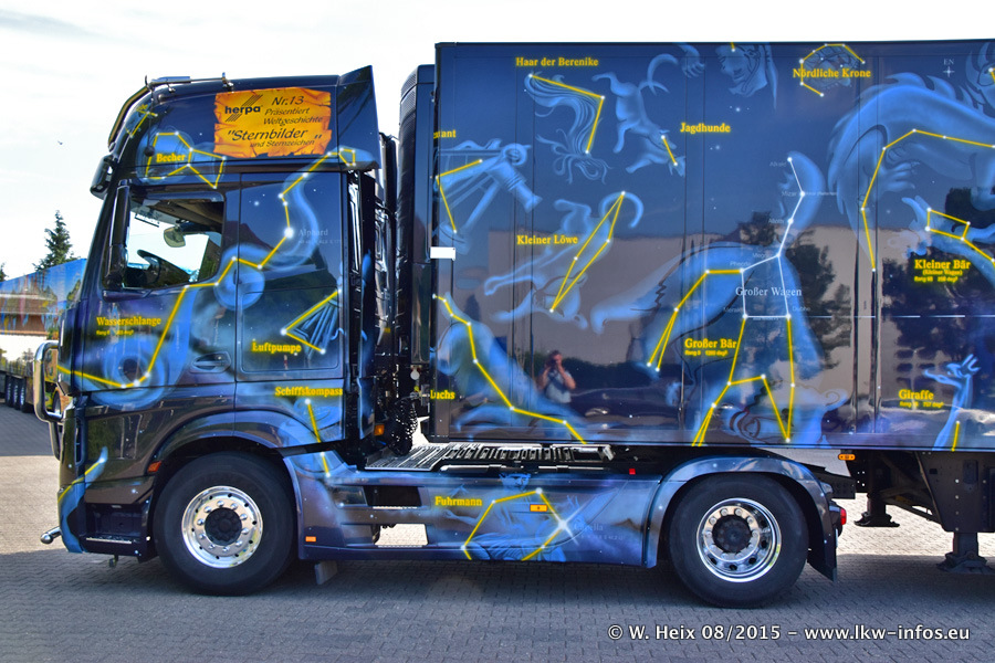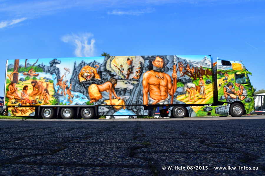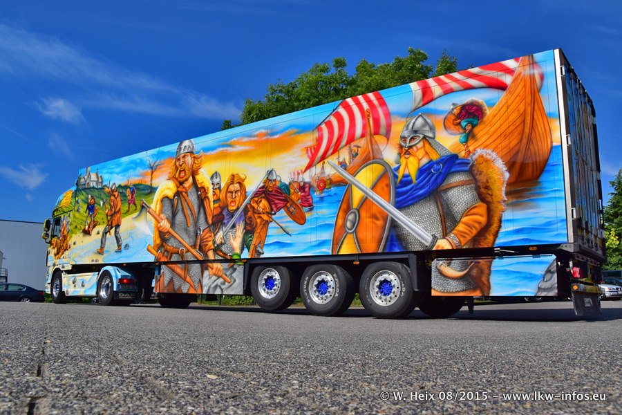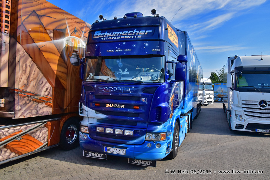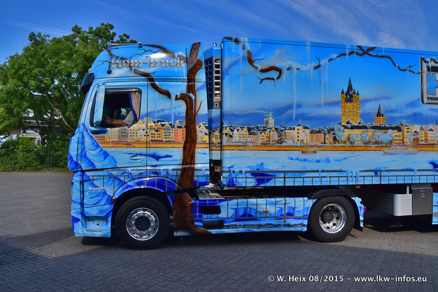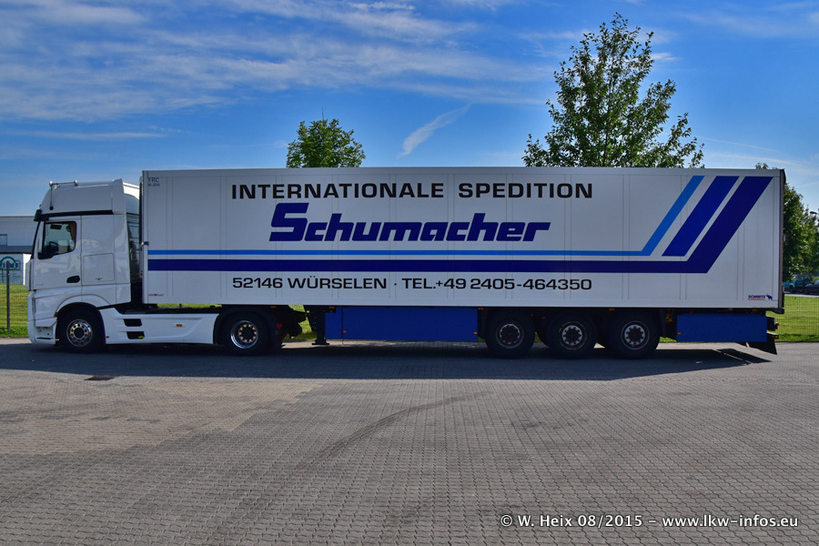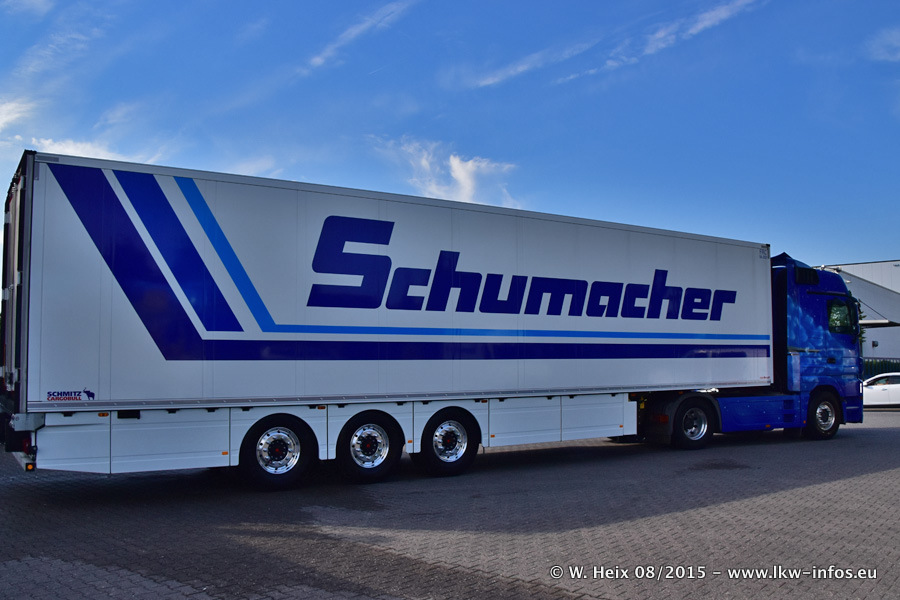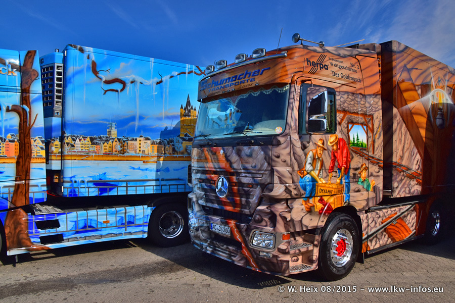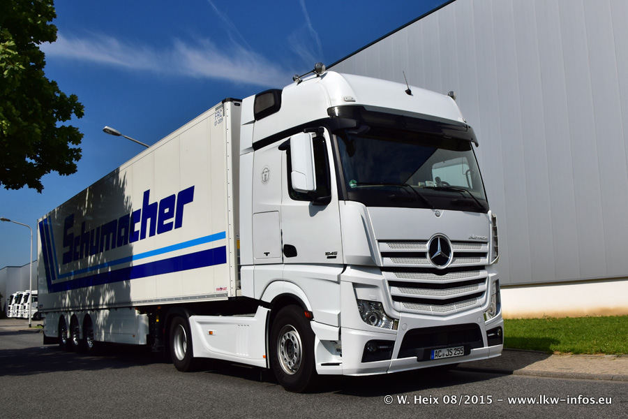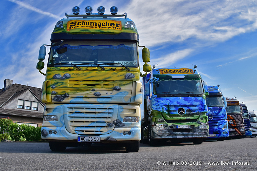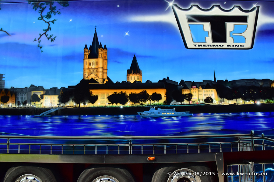 Bei diesem Besuch waren bis auf einen LKW alle Showtrucks der Herpa-Serie zuhause. Schumacher hat ja bekanntlich inzwischen den größten Teil dieser 14 Trucks im Fuhrpark. Die Nummer 1 bekam vor einigen Monaten eine neue Zugmaschine und läuft jetzt unter der Numer 1.1 "Die Wiege der Menschheit". Ende 2014 bekam Schumacher die Nummer 14 der Serie: "Herpa präsentiert Weltgeschichte Nr. 14 - Karl der Große". Das ist aktuell der letzte neue Showtruck der Herpa-Serie. Außerdem konnte ich diesmal den Köln-Truck von allen Seiten fotografieren, da dieser auch zuhause war. Danke an den/die Fahrer von Schumacher, die mir die Showtrucks zum Fotografieren auf dem Hof "ins richtige Licht" gerückt haben.