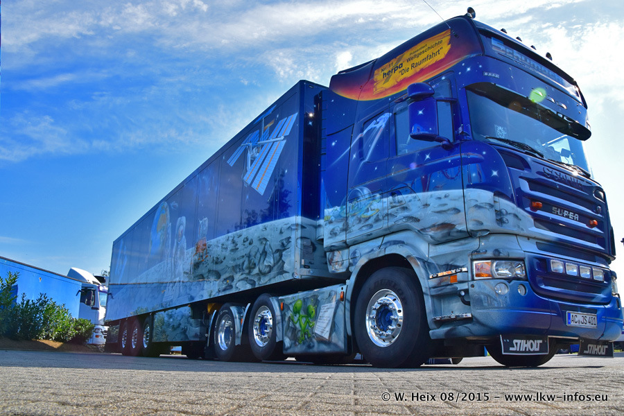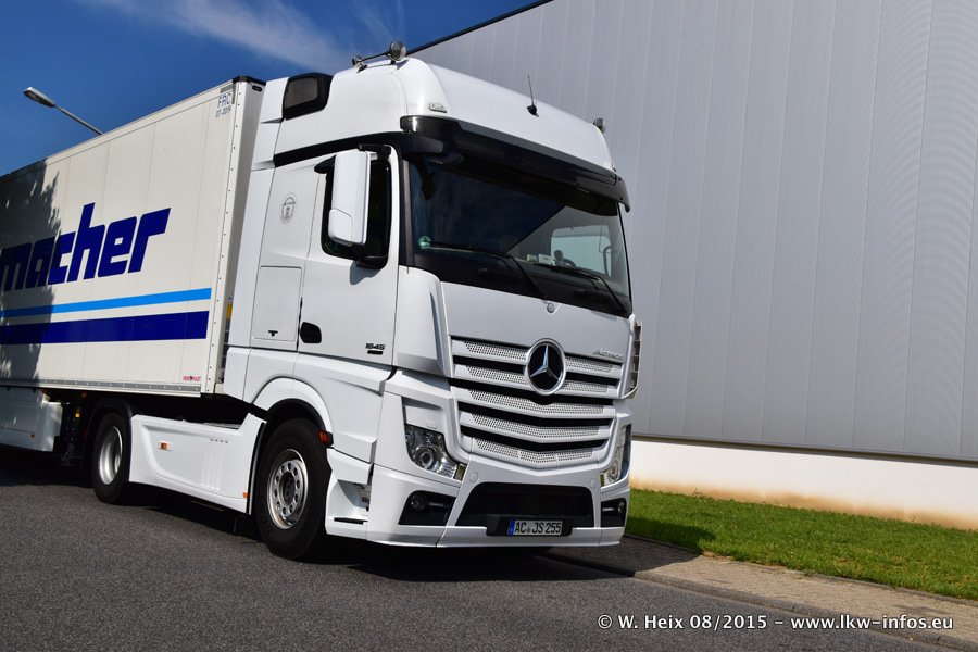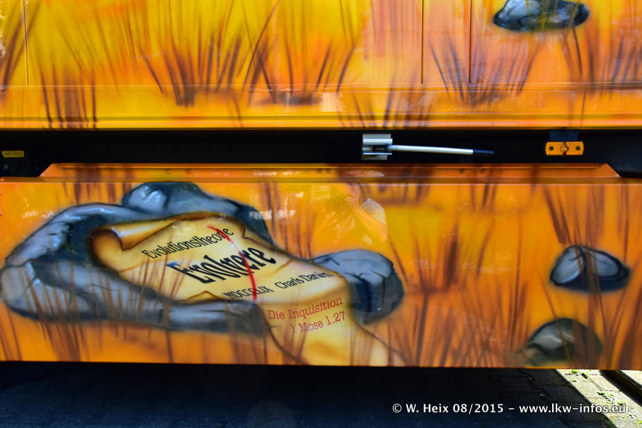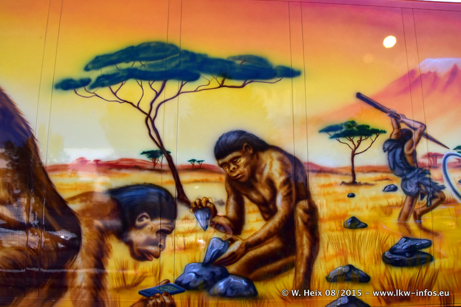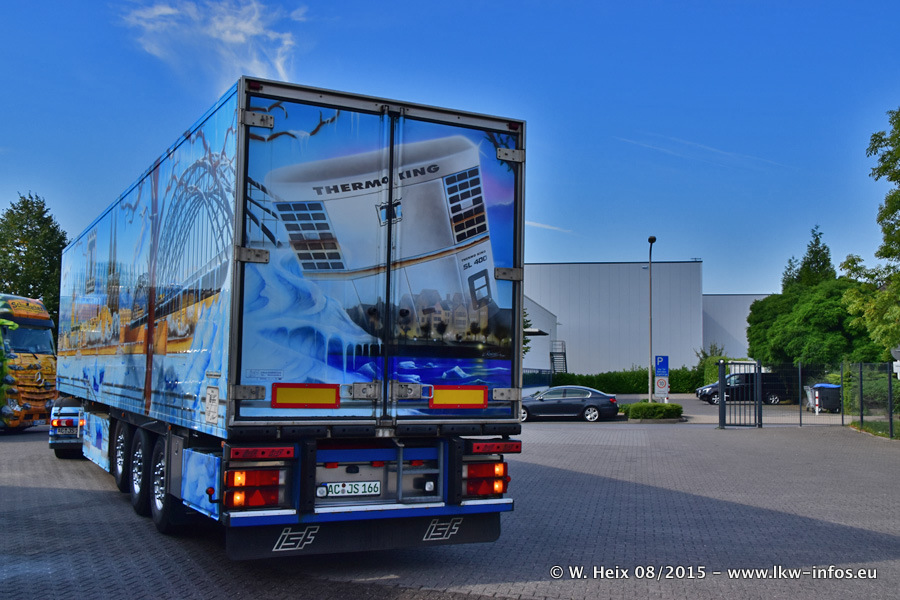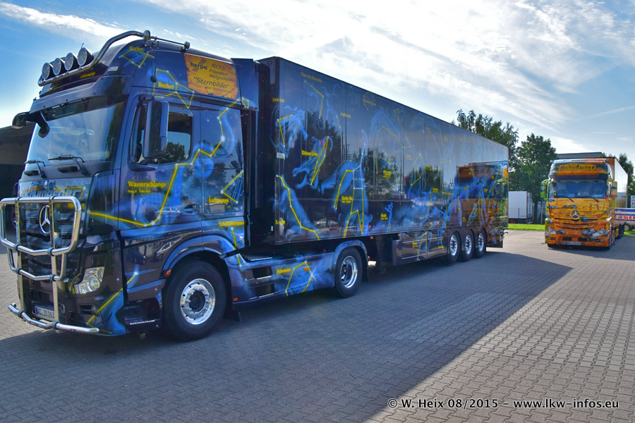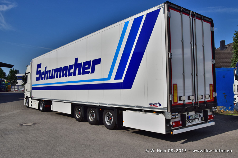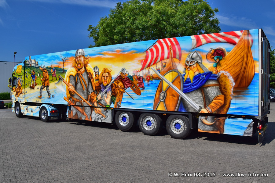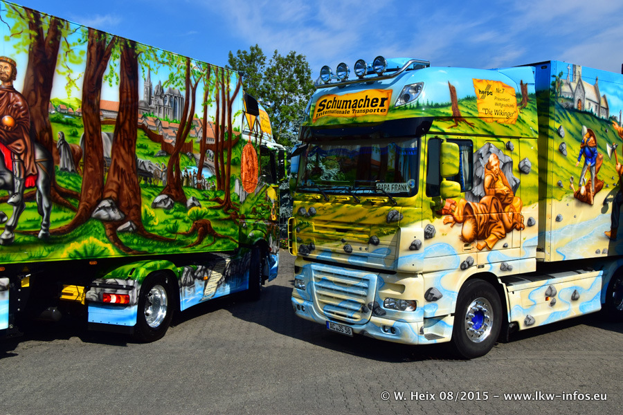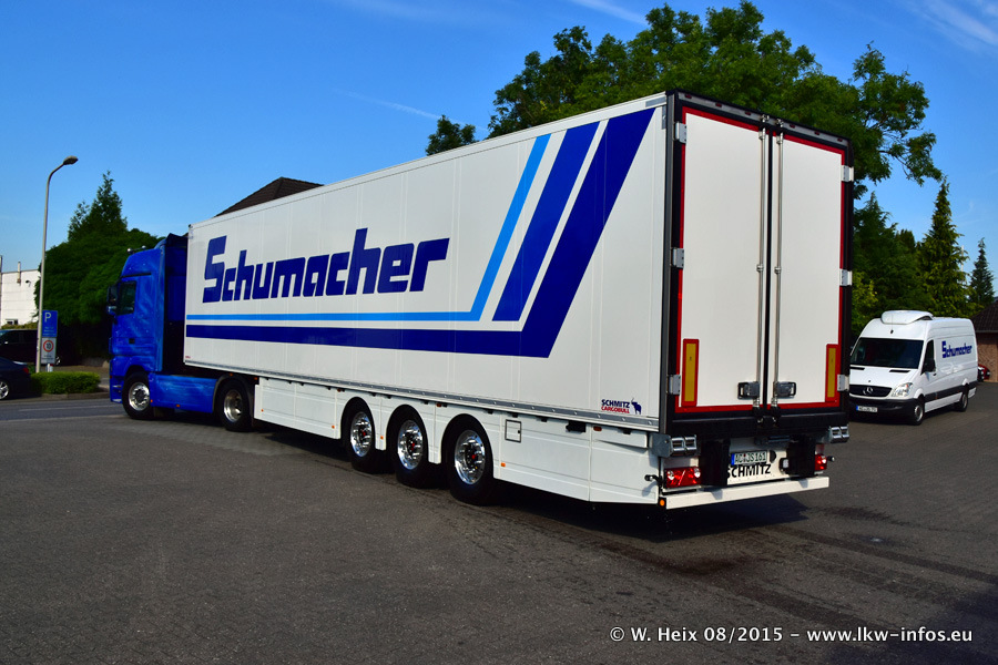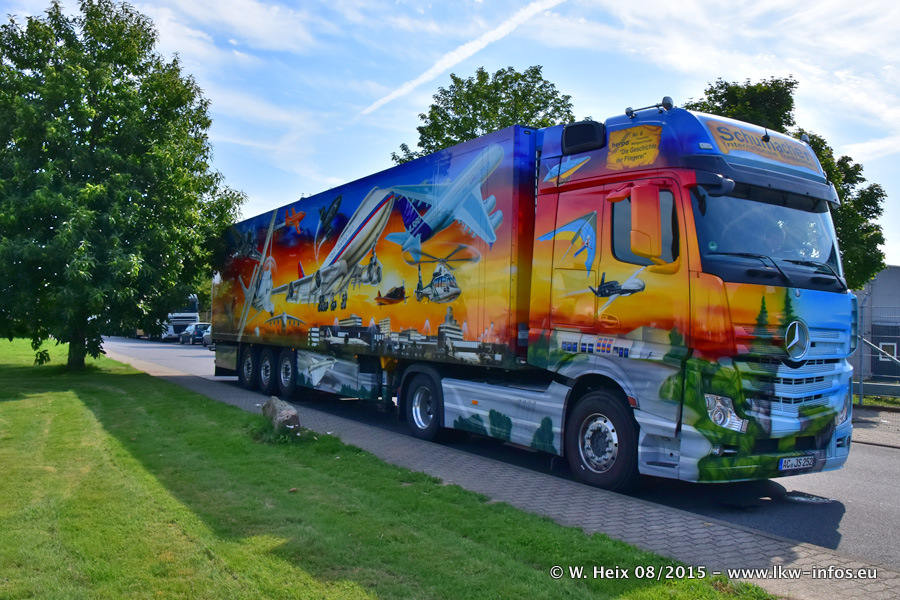 Bei diesem Besuch waren bis auf einen LKW alle Showtrucks der Herpa-Serie zuhause. Schumacher hat ja bekanntlich inzwischen den größten Teil dieser 14 Trucks im Fuhrpark. Die Nummer 1 bekam vor einigen Monaten eine neue Zugmaschine und läuft jetzt unter der Numer 1.1 "Die Wiege der Menschheit". Ende 2014 bekam Schumacher die Nummer 14 der Serie: "Herpa präsentiert Weltgeschichte Nr. 14 - Karl der Große". Das ist aktuell der letzte neue Showtruck der Herpa-Serie. Außerdem konnte ich diesmal den Köln-Truck von allen Seiten fotografieren, da dieser auch zuhause war. Danke an den/die Fahrer von Schumacher, die mir die Showtrucks zum Fotografieren auf dem Hof "ins richtige Licht" gerückt haben.