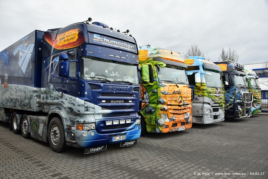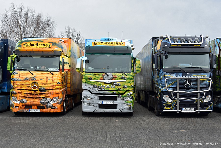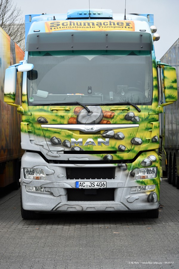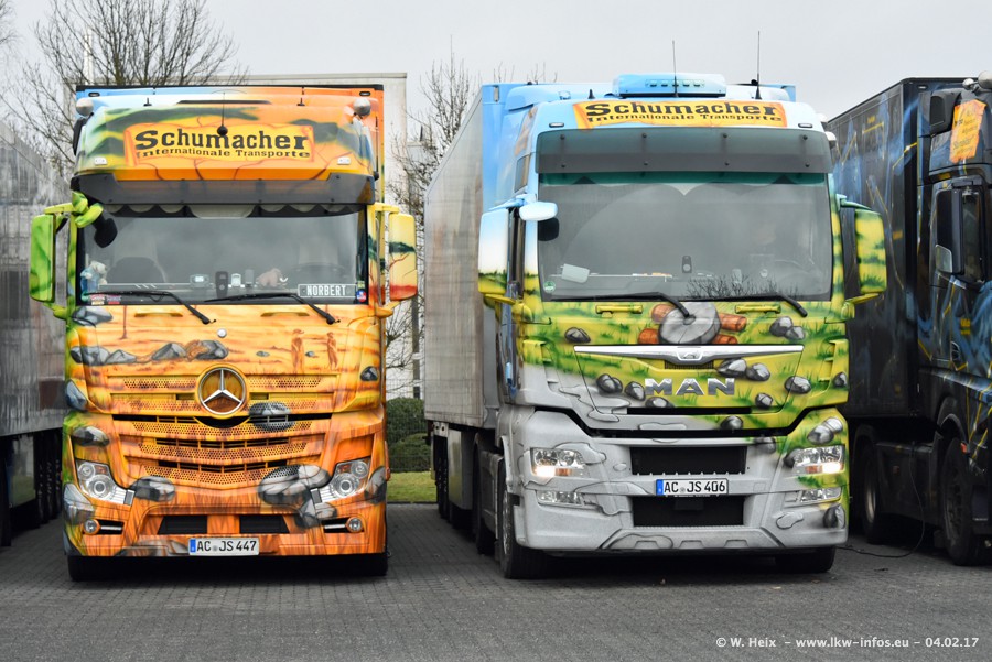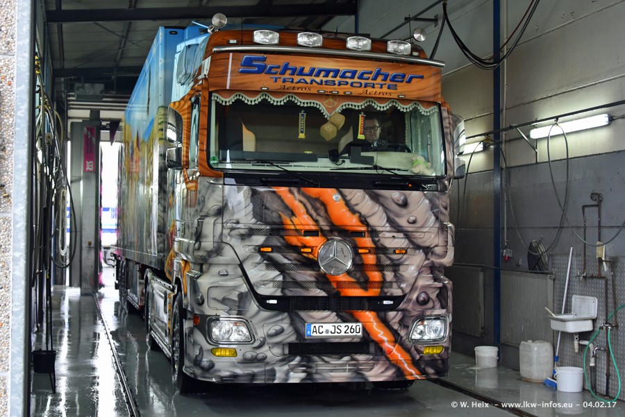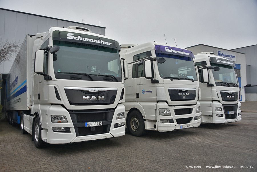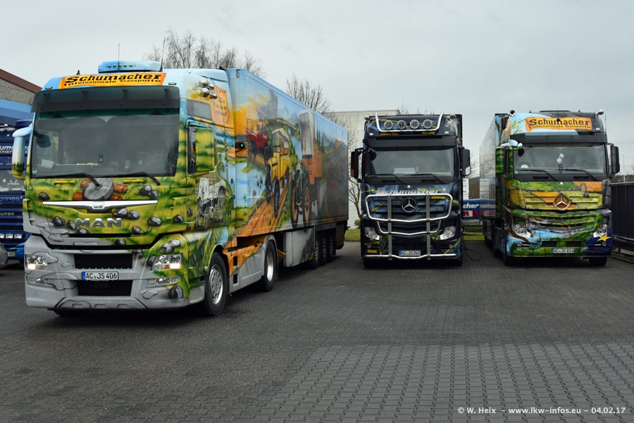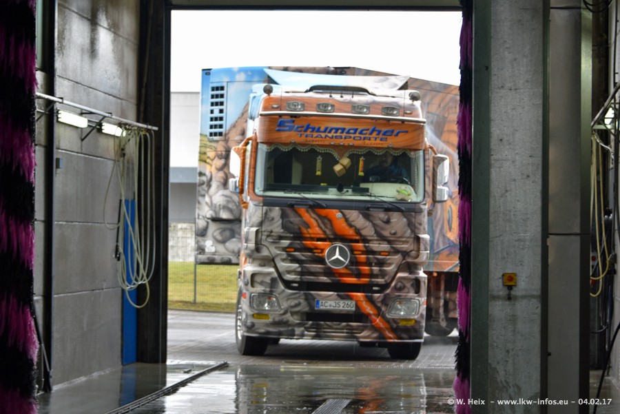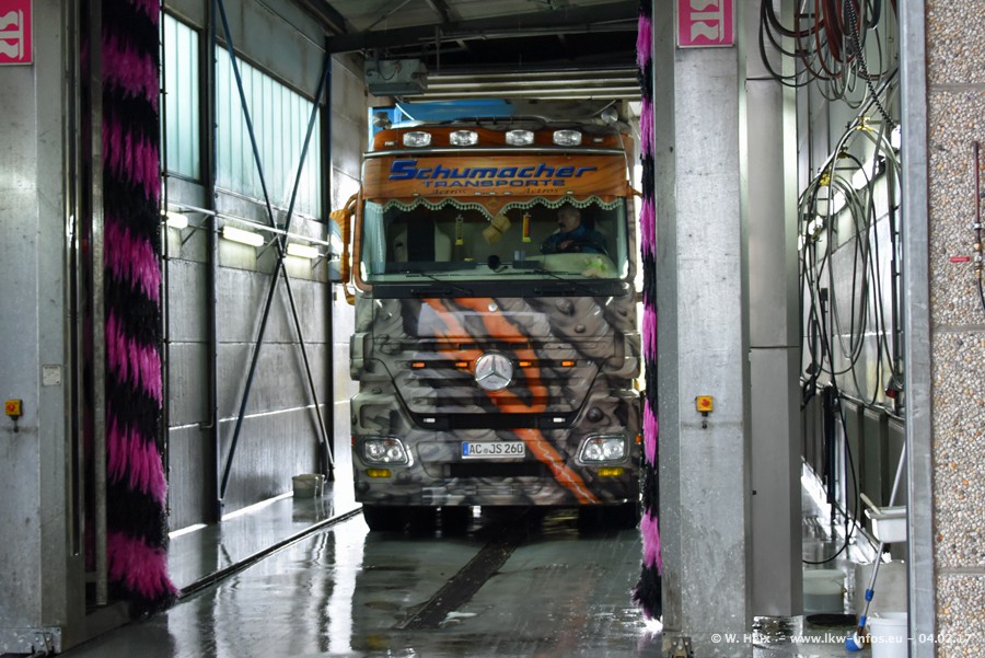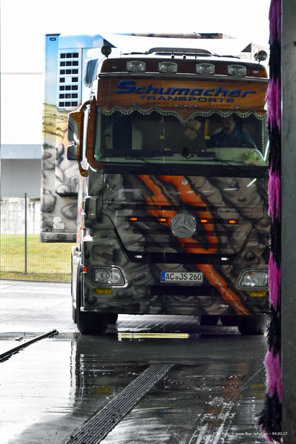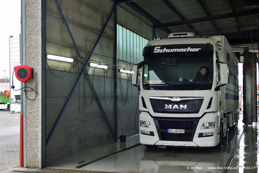 Es sind seit dem letzten Besuch bei Schumacher schon wieder rund 1,5 Jahre vergangen. Eigentlich sollte heute die Sonne scheinen, aber das Wetter war dann leider doch schlechter als erwartet. Trotzdem konnte ich wieder viele schöne Bilder machen. Bereits im Sommer 2015 (kurz nach meinem letzten Besuch) hat Schumacher den von der Spedition Sturm aus Viersen übernommenen Showtruck "Herpa/Die Geschichte der Nutzfahrzeuge" bekommen. Die Zugmaschine (Scania R 500 V8) wurde verkauft und durch einen MAN TGX Euro 6 ersetzt. Heute konnte ich von diesem LKW viele Bilder machen. Auf den ersten Fotos war der Showtruck (noch) nicht gewaschen. Aber nach der Fahrt durch die firmeneigene Waschanlage konnte ich nochmals schöne Fotos machen. In den letzten Monaten wurde der Fuhrpark zudem mit Zugmaschinen von Mercedes-Benz und MAN modernisiert. Aber bei diesem Besuch habe ich mich überwiegend auf das Fotografieren der Showtrucks beschränkt.