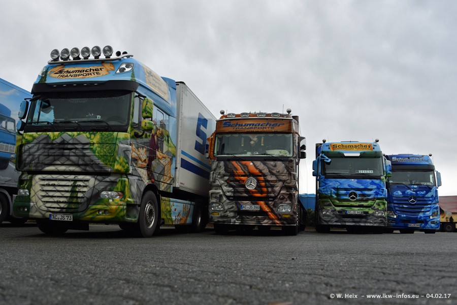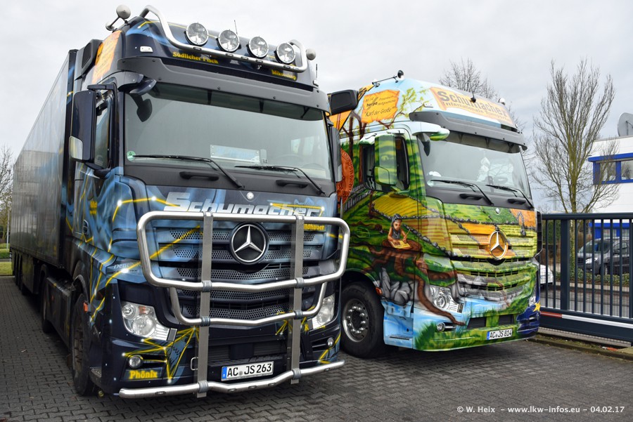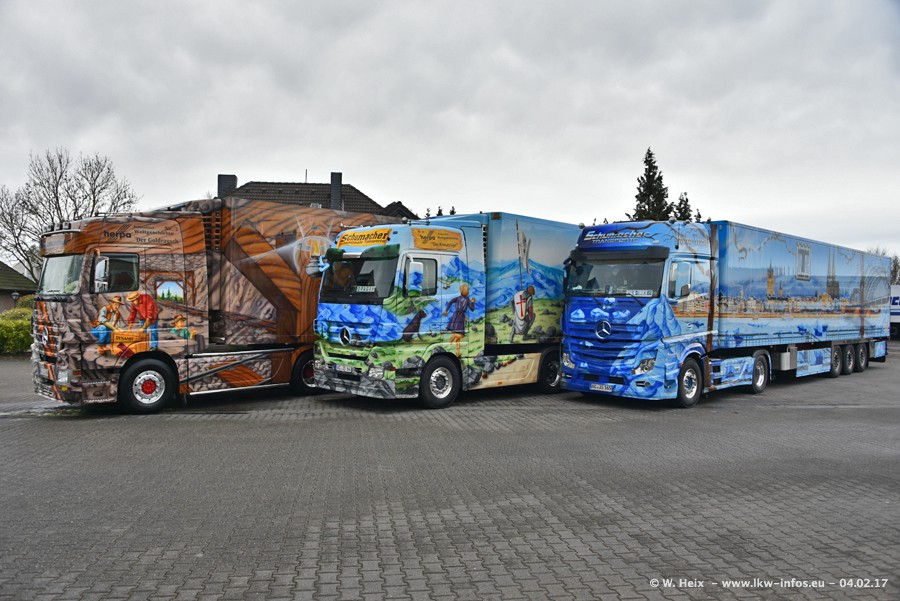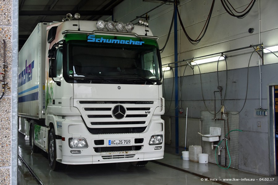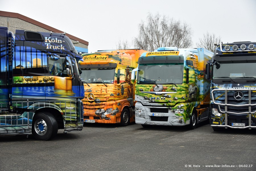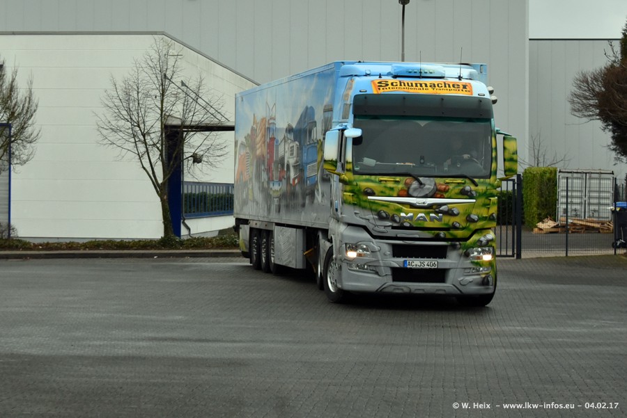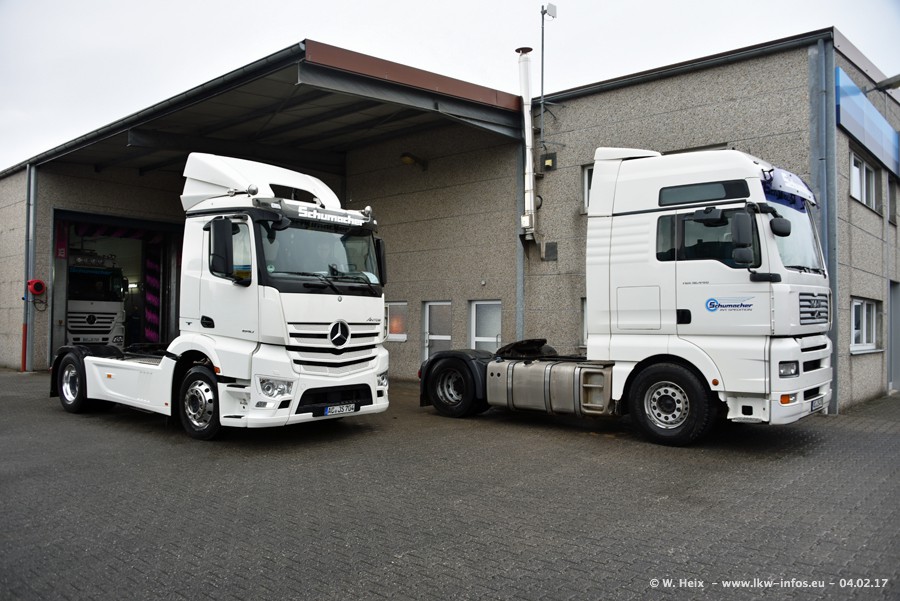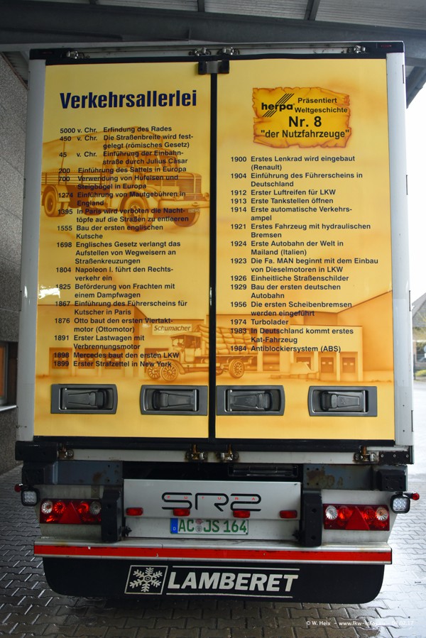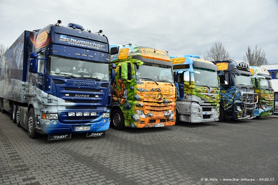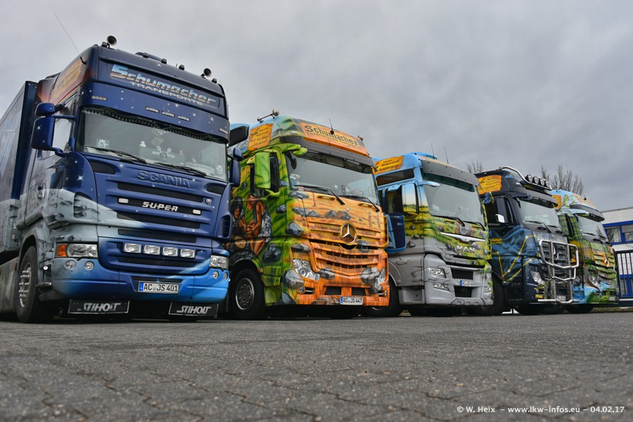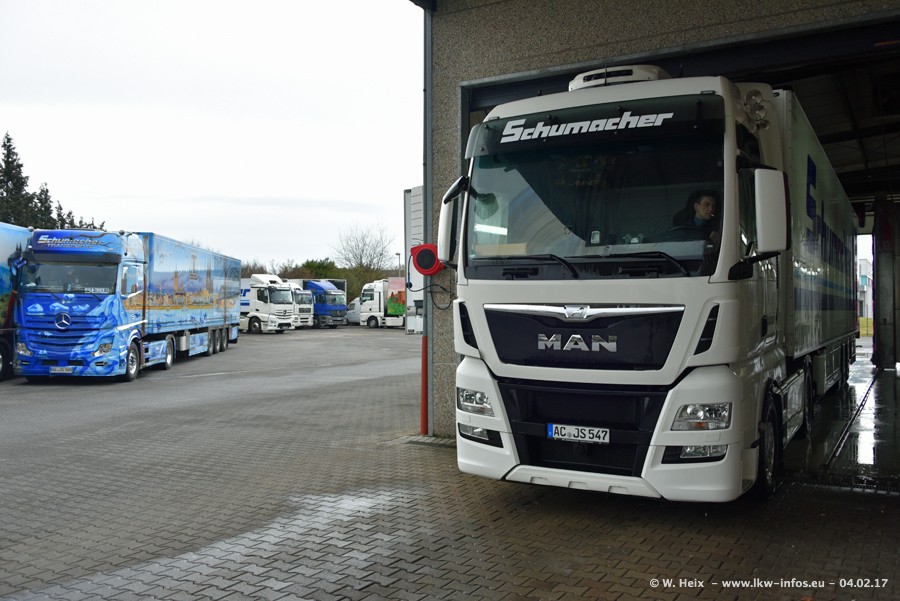 Es sind seit dem letzten Besuch bei Schumacher schon wieder rund 1,5 Jahre vergangen. Eigentlich sollte heute die Sonne scheinen, aber das Wetter war dann leider doch schlechter als erwartet. Trotzdem konnte ich wieder viele schöne Bilder machen. Bereits im Sommer 2015 (kurz nach meinem letzten Besuch) hat Schumacher den von der Spedition Sturm aus Viersen übernommenen Showtruck "Herpa/Die Geschichte der Nutzfahrzeuge" bekommen. Die Zugmaschine (Scania R 500 V8) wurde verkauft und durch einen MAN TGX Euro 6 ersetzt. Heute konnte ich von diesem LKW viele Bilder machen. Auf den ersten Fotos war der Showtruck (noch) nicht gewaschen. Aber nach der Fahrt durch die firmeneigene Waschanlage konnte ich nochmals schöne Fotos machen. In den letzten Monaten wurde der Fuhrpark zudem mit Zugmaschinen von Mercedes-Benz und MAN modernisiert. Aber bei diesem Besuch habe ich mich überwiegend auf das Fotografieren der Showtrucks beschränkt.