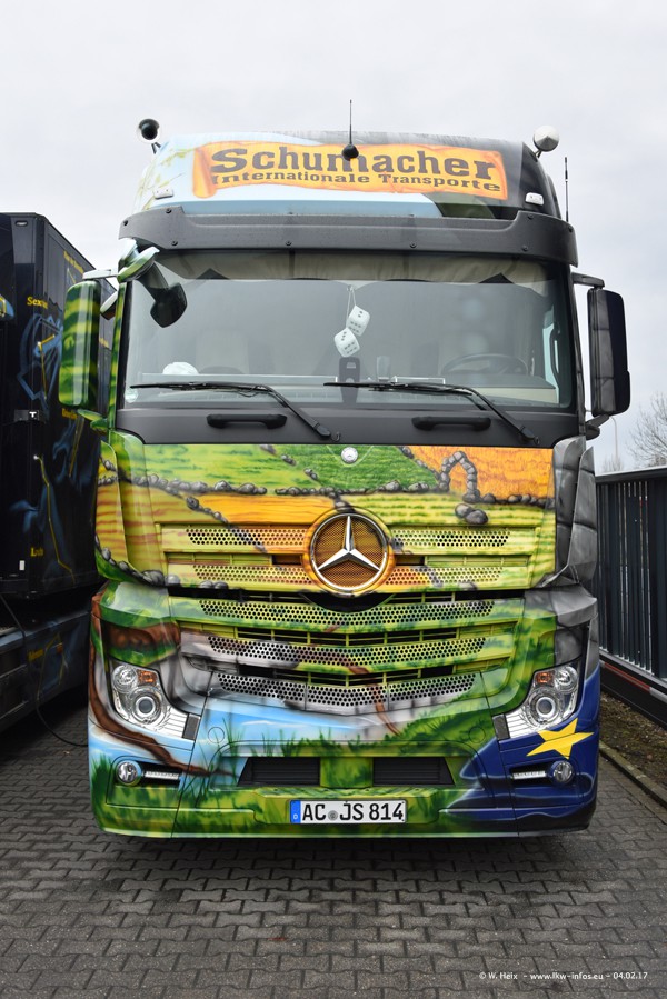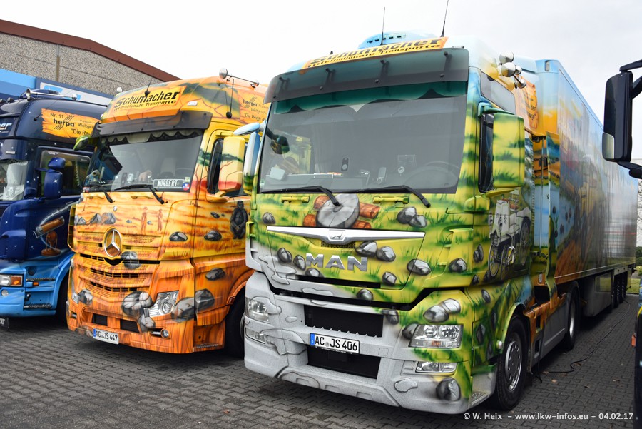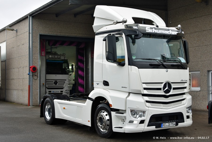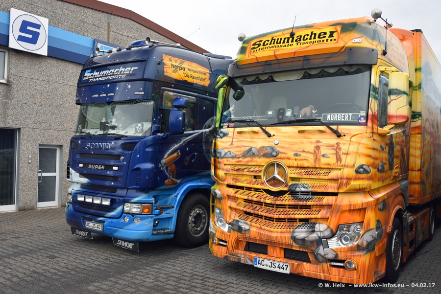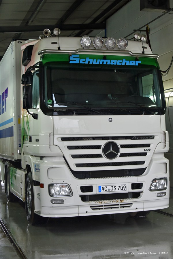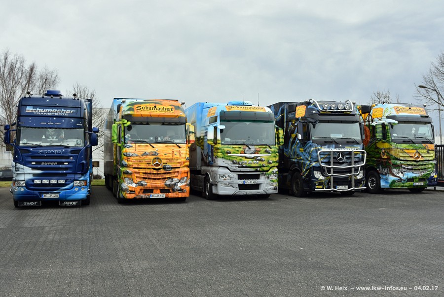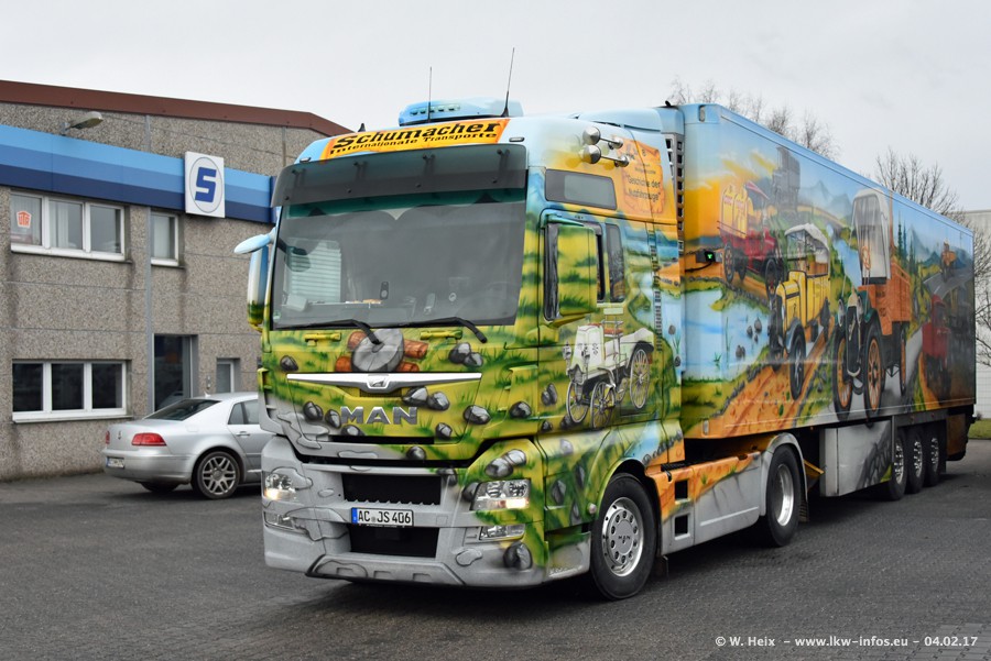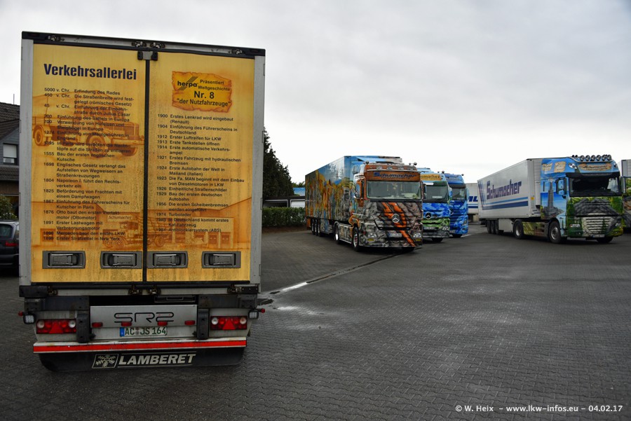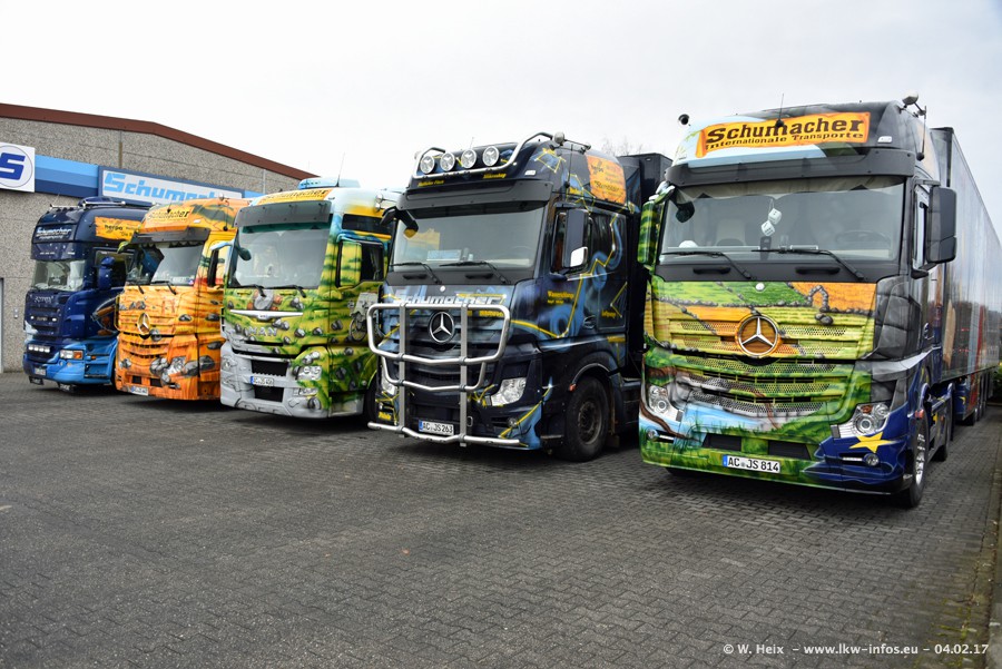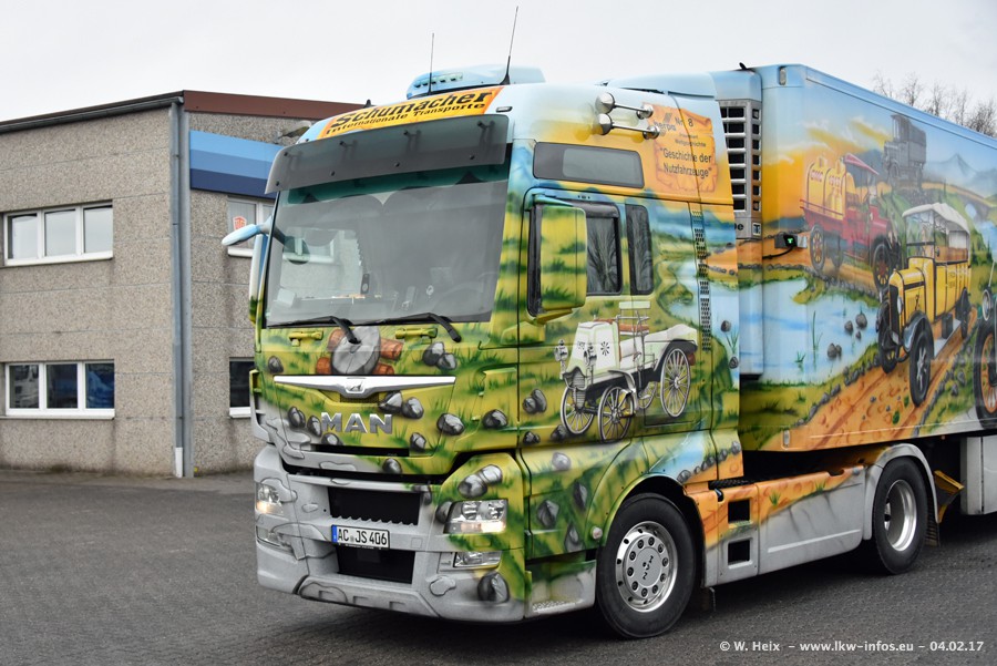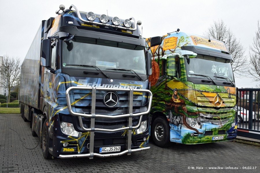 Es sind seit dem letzten Besuch bei Schumacher schon wieder rund 1,5 Jahre vergangen. Eigentlich sollte heute die Sonne scheinen, aber das Wetter war dann leider doch schlechter als erwartet. Trotzdem konnte ich wieder viele schöne Bilder machen. Bereits im Sommer 2015 (kurz nach meinem letzten Besuch) hat Schumacher den von der Spedition Sturm aus Viersen übernommenen Showtruck "Herpa/Die Geschichte der Nutzfahrzeuge" bekommen. Die Zugmaschine (Scania R 500 V8) wurde verkauft und durch einen MAN TGX Euro 6 ersetzt. Heute konnte ich von diesem LKW viele Bilder machen. Auf den ersten Fotos war der Showtruck (noch) nicht gewaschen. Aber nach der Fahrt durch die firmeneigene Waschanlage konnte ich nochmals schöne Fotos machen. In den letzten Monaten wurde der Fuhrpark zudem mit Zugmaschinen von Mercedes-Benz und MAN modernisiert. Aber bei diesem Besuch habe ich mich überwiegend auf das Fotografieren der Showtrucks beschränkt.