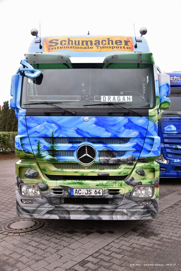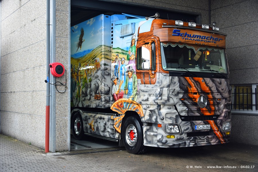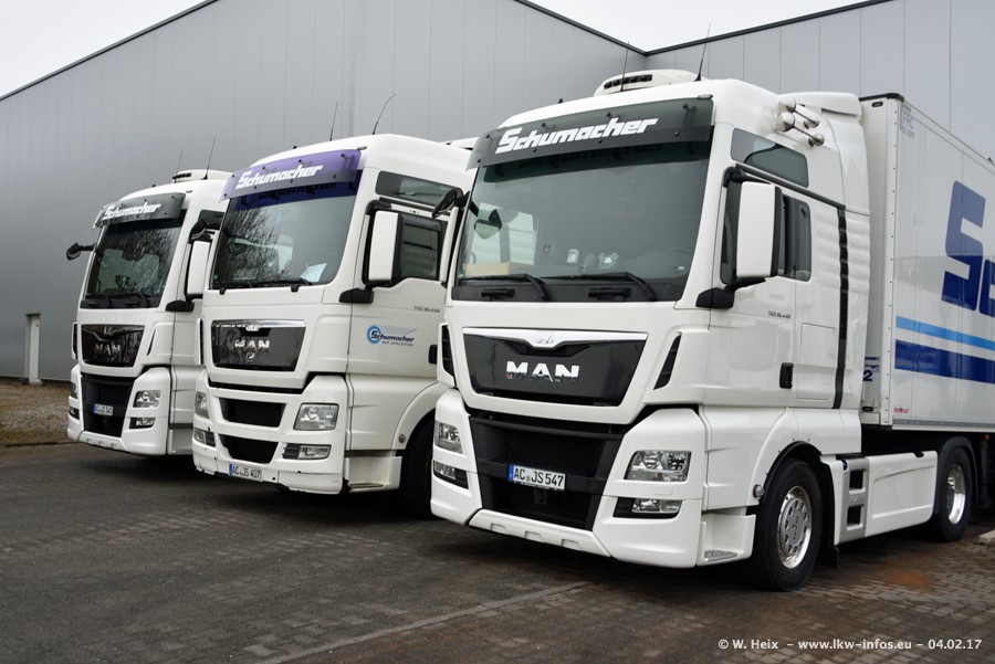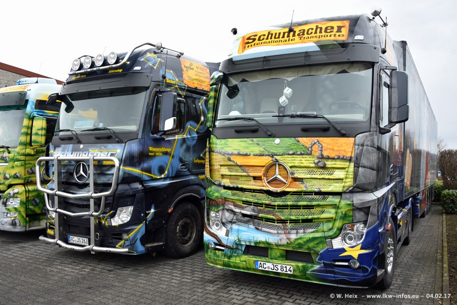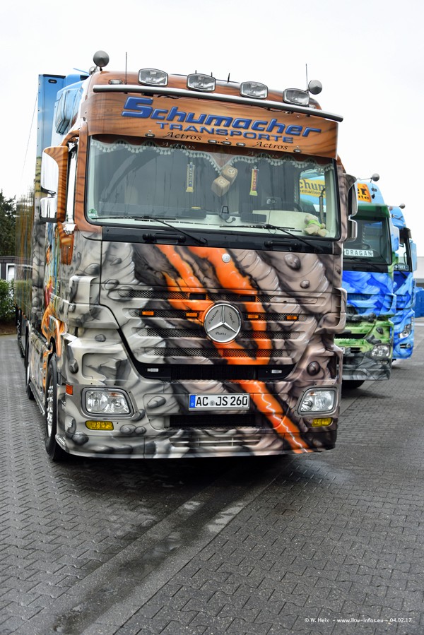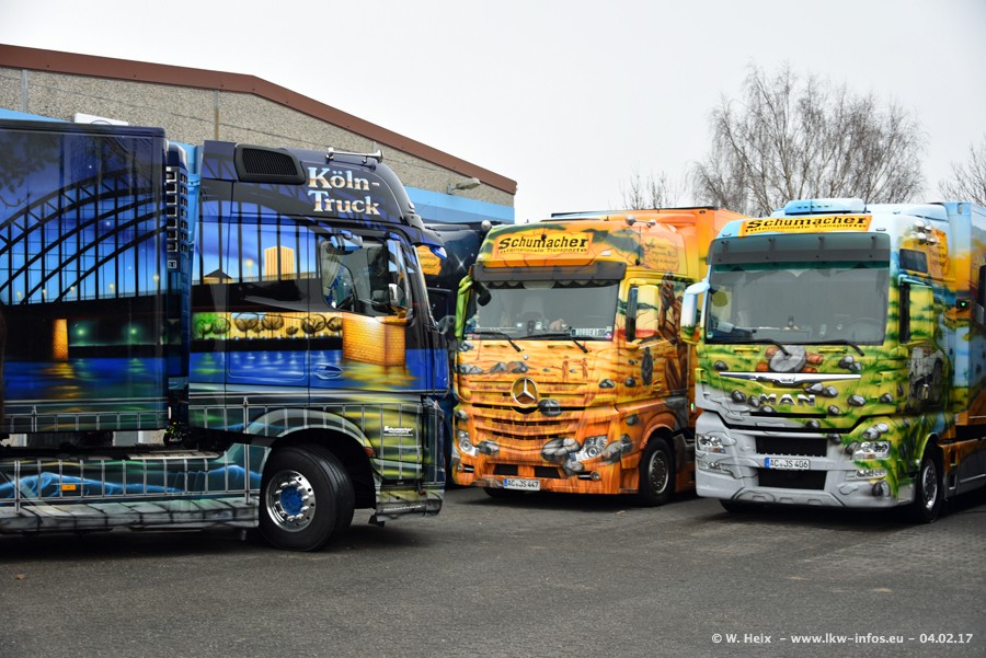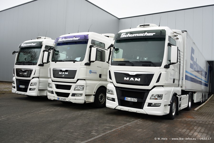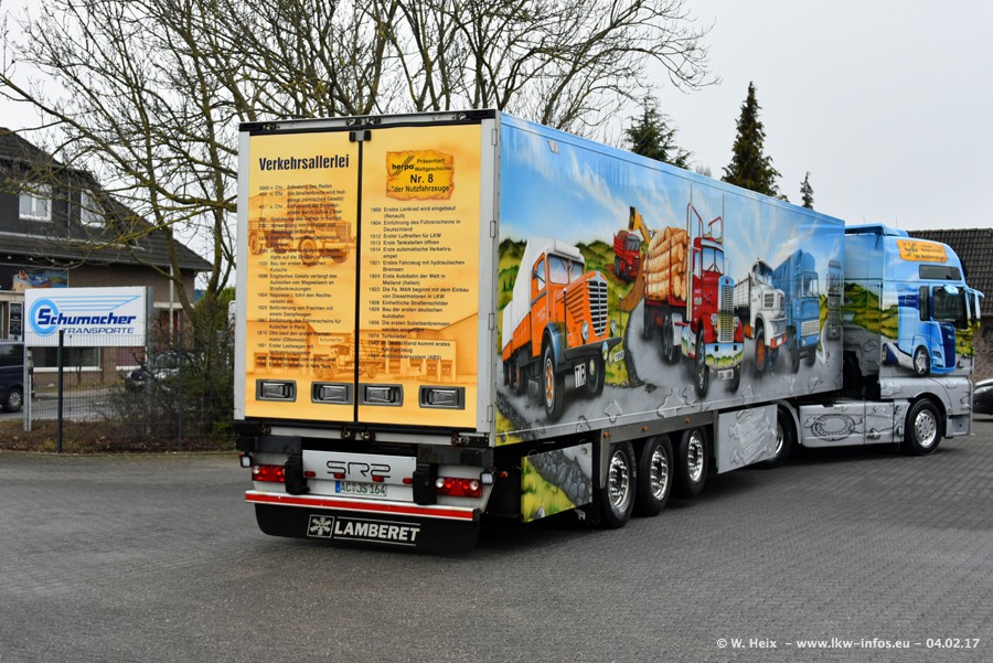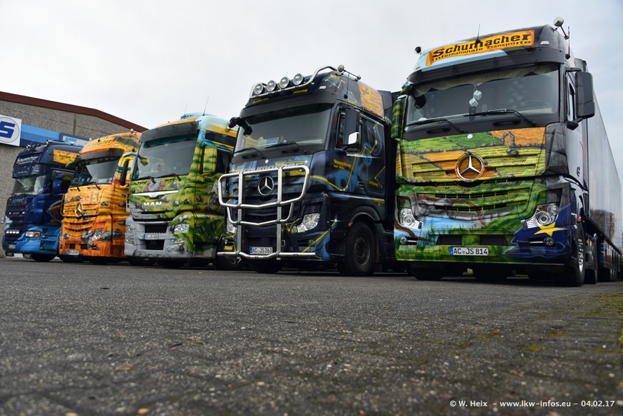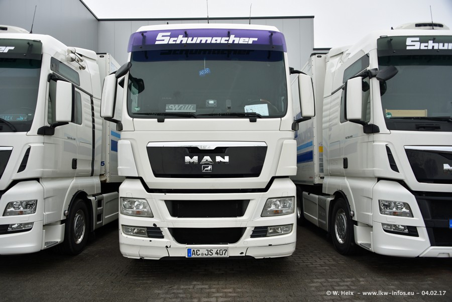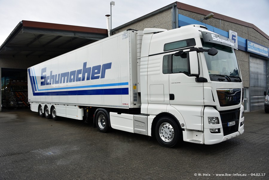 Es sind seit dem letzten Besuch bei Schumacher schon wieder rund 1,5 Jahre vergangen. Eigentlich sollte heute die Sonne scheinen, aber das Wetter war dann leider doch schlechter als erwartet. Trotzdem konnte ich wieder viele schöne Bilder machen. Bereits im Sommer 2015 (kurz nach meinem letzten Besuch) hat Schumacher den von der Spedition Sturm aus Viersen übernommenen Showtruck "Herpa/Die Geschichte der Nutzfahrzeuge" bekommen. Die Zugmaschine (Scania R 500 V8) wurde verkauft und durch einen MAN TGX Euro 6 ersetzt. Heute konnte ich von diesem LKW viele Bilder machen. Auf den ersten Fotos war der Showtruck (noch) nicht gewaschen. Aber nach der Fahrt durch die firmeneigene Waschanlage konnte ich nochmals schöne Fotos machen. In den letzten Monaten wurde der Fuhrpark zudem mit Zugmaschinen von Mercedes-Benz und MAN modernisiert. Aber bei diesem Besuch habe ich mich überwiegend auf das Fotografieren der Showtrucks beschränkt.