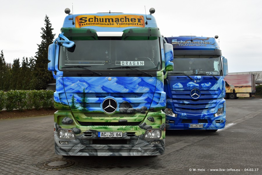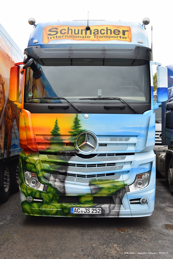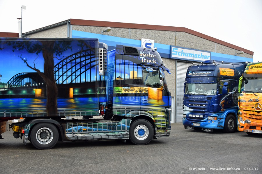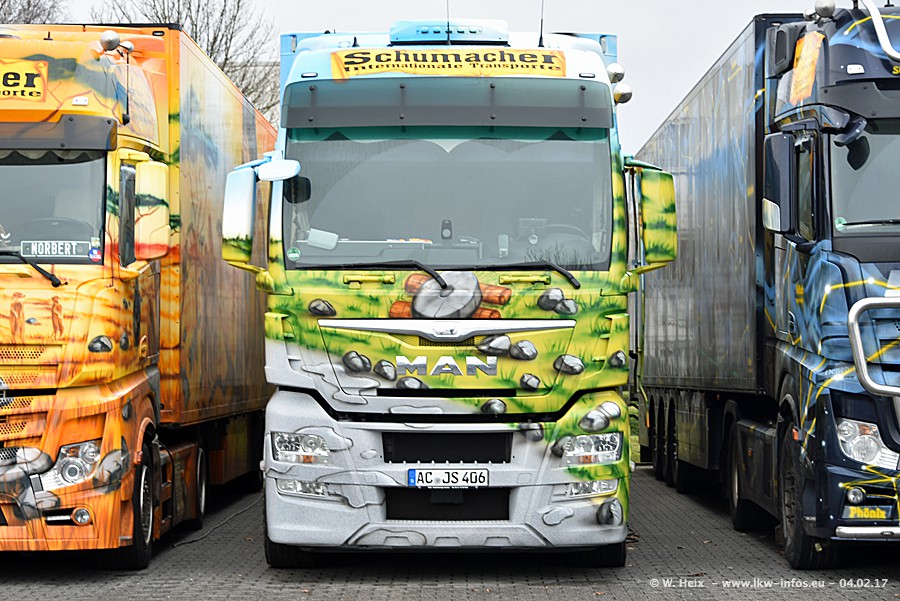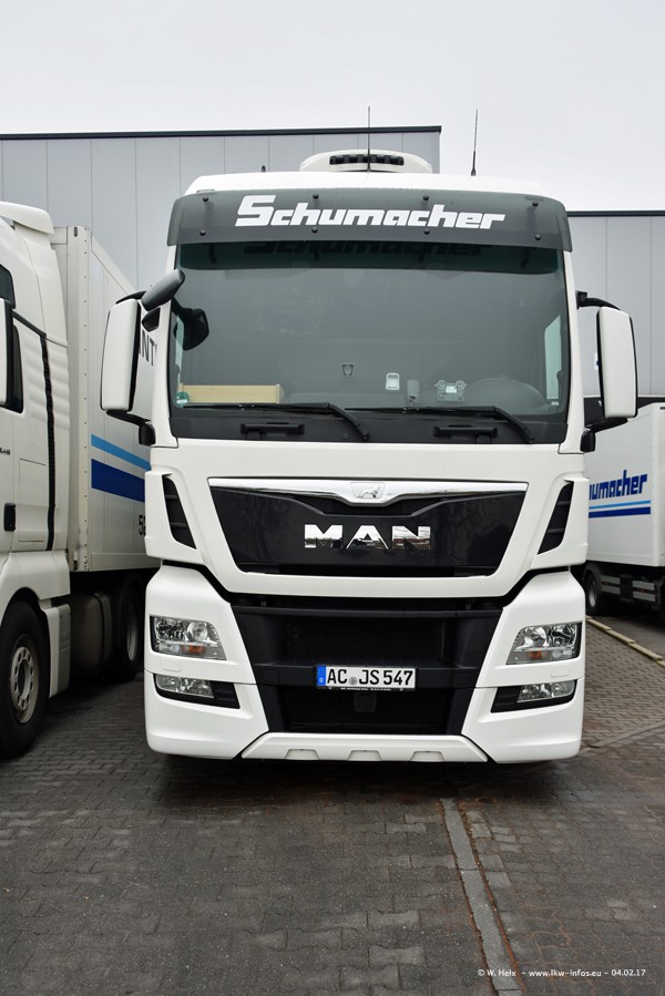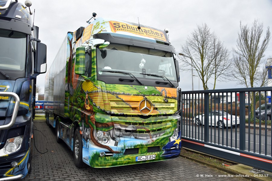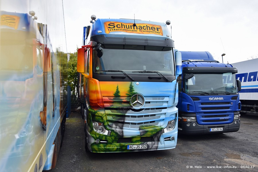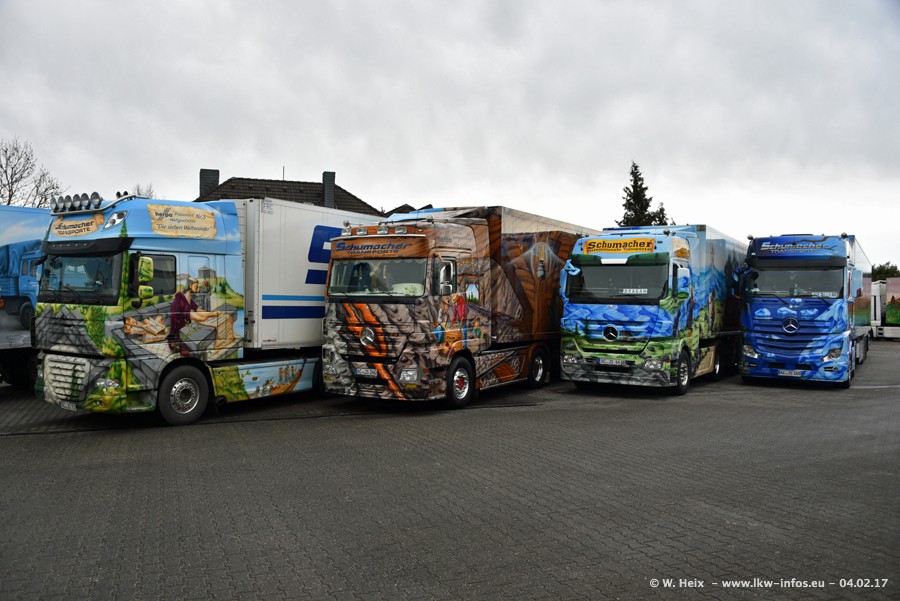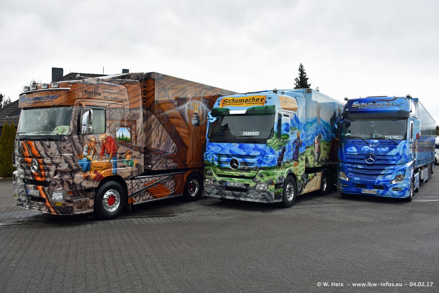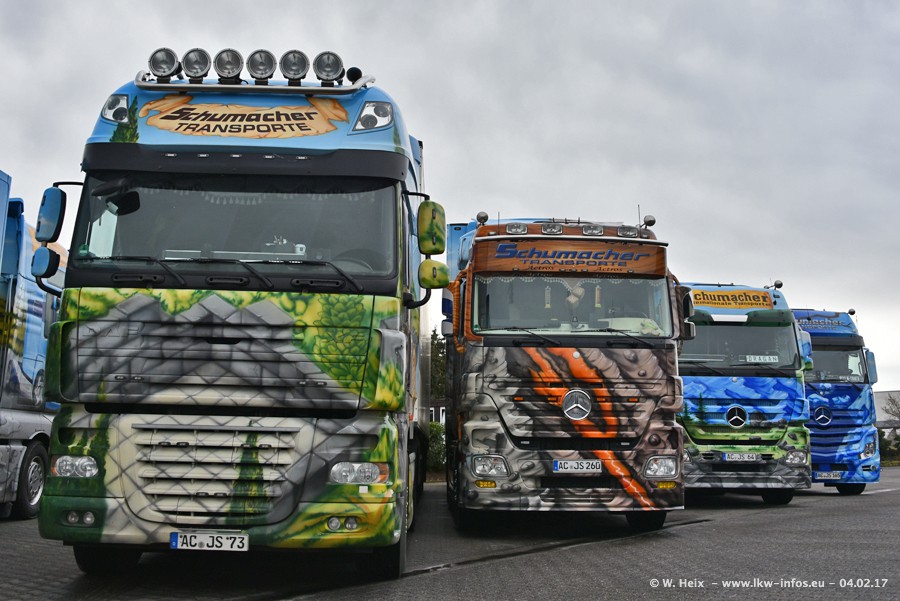 Es sind seit dem letzten Besuch bei Schumacher schon wieder rund 1,5 Jahre vergangen. Eigentlich sollte heute die Sonne scheinen, aber das Wetter war dann leider doch schlechter als erwartet. Trotzdem konnte ich wieder viele schöne Bilder machen. Bereits im Sommer 2015 (kurz nach meinem letzten Besuch) hat Schumacher den von der Spedition Sturm aus Viersen übernommenen Showtruck "Herpa/Die Geschichte der Nutzfahrzeuge" bekommen. Die Zugmaschine (Scania R 500 V8) wurde verkauft und durch einen MAN TGX Euro 6 ersetzt. Heute konnte ich von diesem LKW viele Bilder machen. Auf den ersten Fotos war der Showtruck (noch) nicht gewaschen. Aber nach der Fahrt durch die firmeneigene Waschanlage konnte ich nochmals schöne Fotos machen. In den letzten Monaten wurde der Fuhrpark zudem mit Zugmaschinen von Mercedes-Benz und MAN modernisiert. Aber bei diesem Besuch habe ich mich überwiegend auf das Fotografieren der Showtrucks beschränkt.