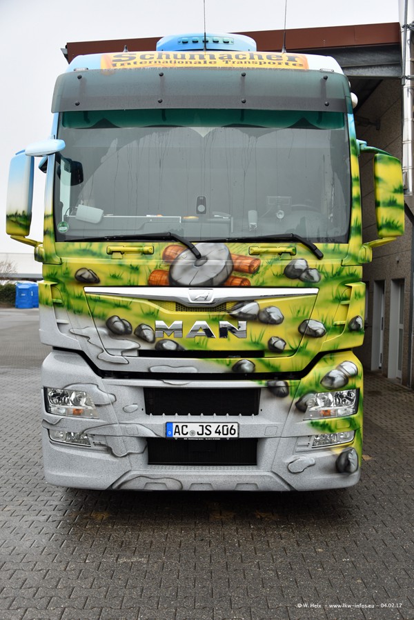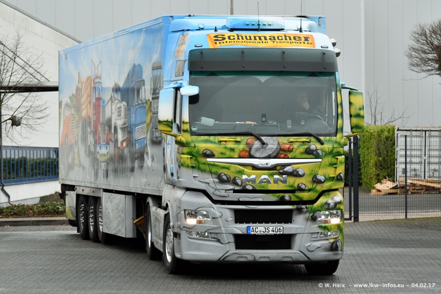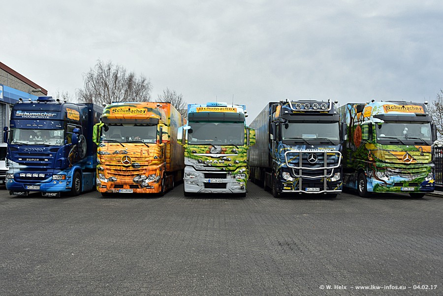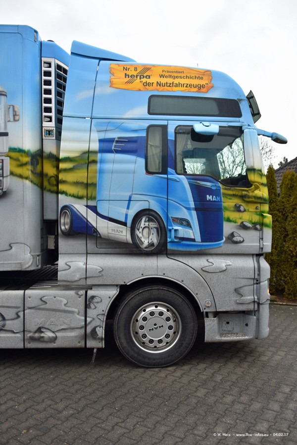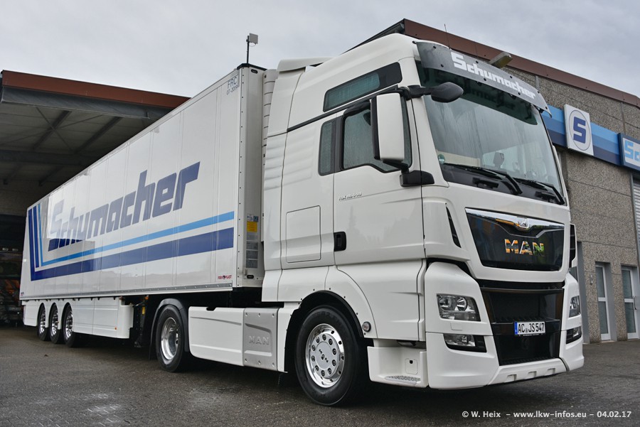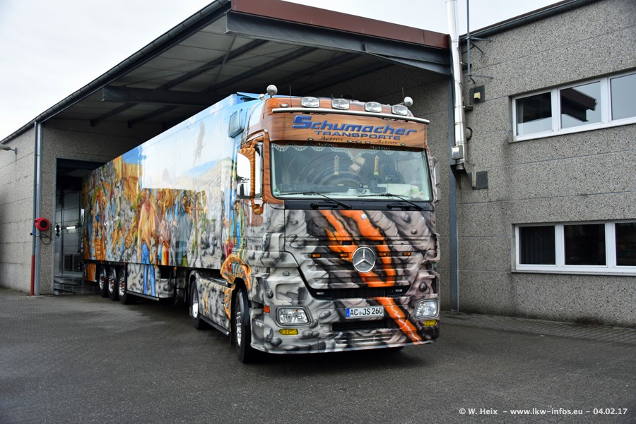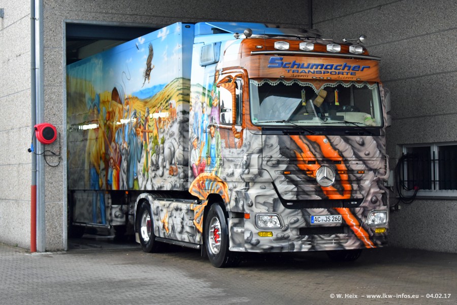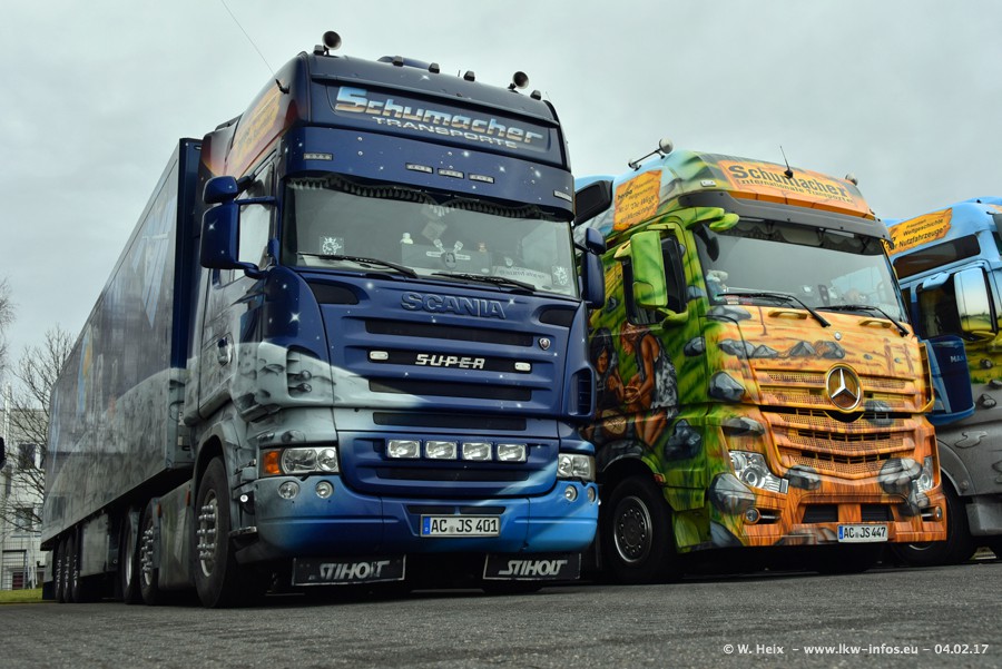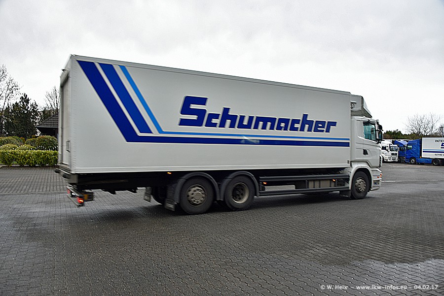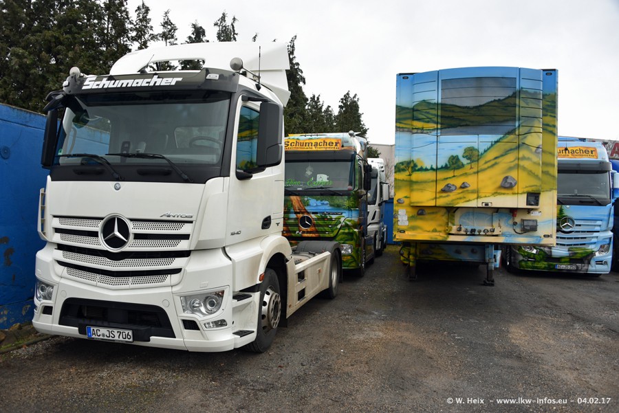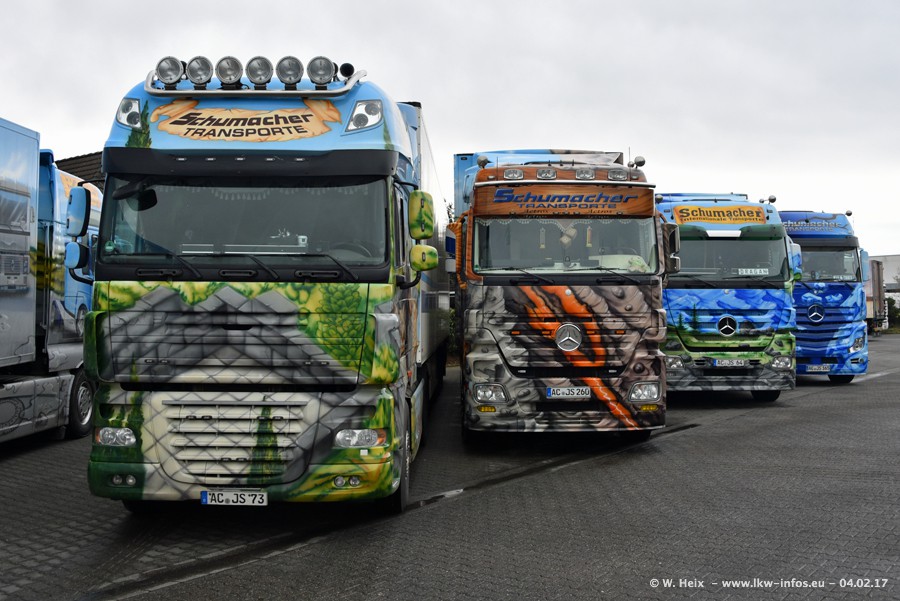 Es sind seit dem letzten Besuch bei Schumacher schon wieder rund 1,5 Jahre vergangen. Eigentlich sollte heute die Sonne scheinen, aber das Wetter war dann leider doch schlechter als erwartet. Trotzdem konnte ich wieder viele schöne Bilder machen. Bereits im Sommer 2015 (kurz nach meinem letzten Besuch) hat Schumacher den von der Spedition Sturm aus Viersen übernommenen Showtruck "Herpa/Die Geschichte der Nutzfahrzeuge" bekommen. Die Zugmaschine (Scania R 500 V8) wurde verkauft und durch einen MAN TGX Euro 6 ersetzt. Heute konnte ich von diesem LKW viele Bilder machen. Auf den ersten Fotos war der Showtruck (noch) nicht gewaschen. Aber nach der Fahrt durch die firmeneigene Waschanlage konnte ich nochmals schöne Fotos machen. In den letzten Monaten wurde der Fuhrpark zudem mit Zugmaschinen von Mercedes-Benz und MAN modernisiert. Aber bei diesem Besuch habe ich mich überwiegend auf das Fotografieren der Showtrucks beschränkt.