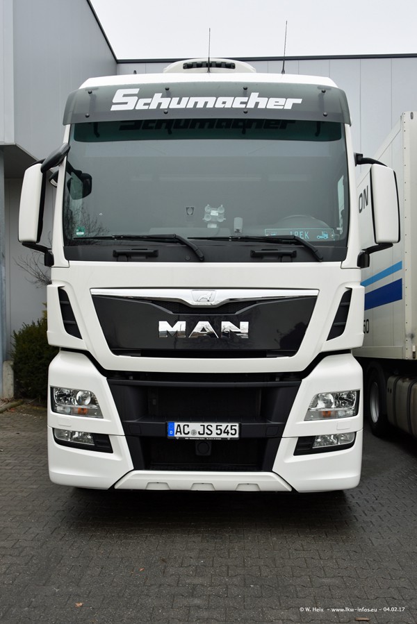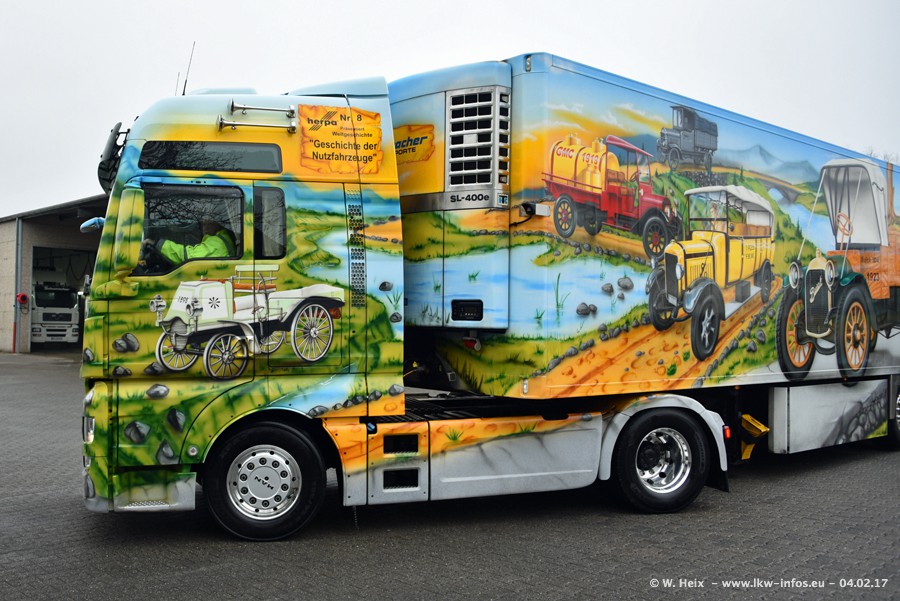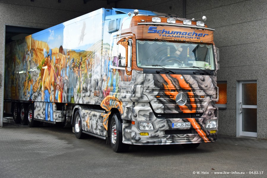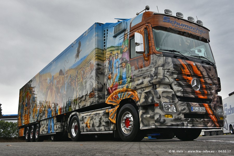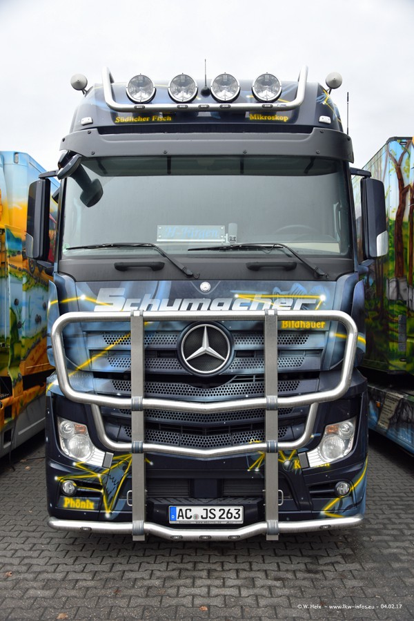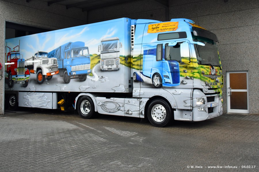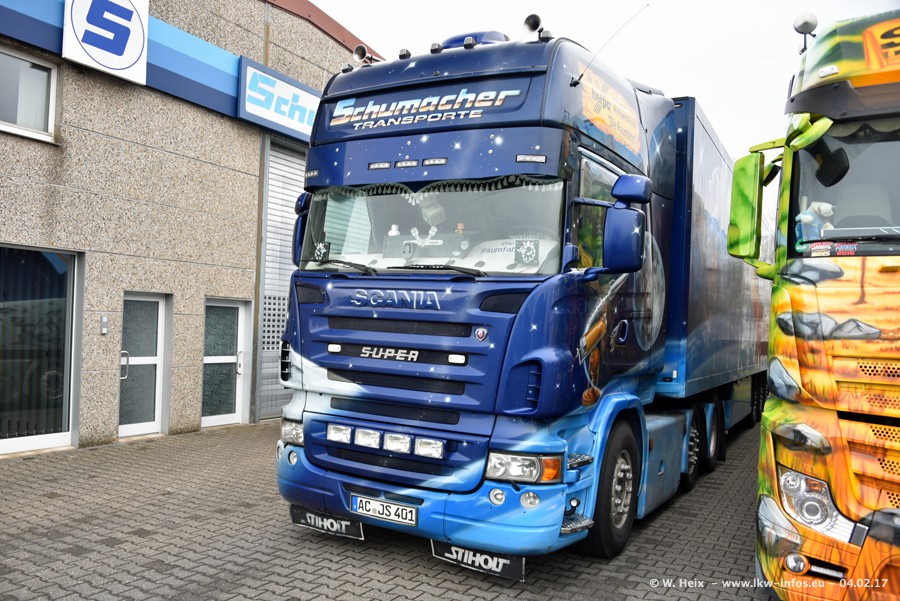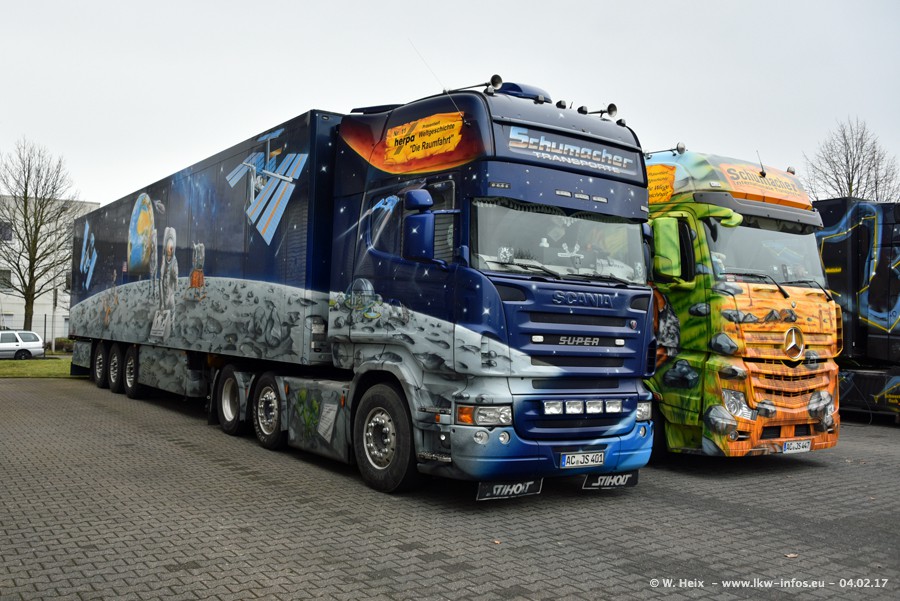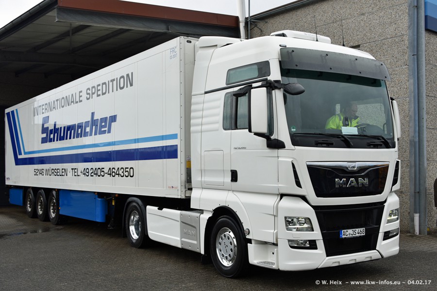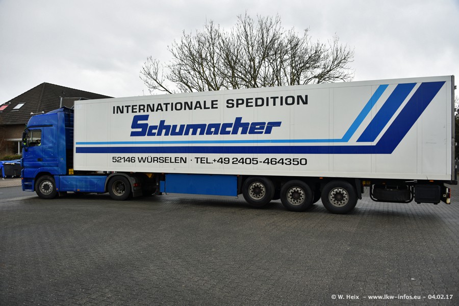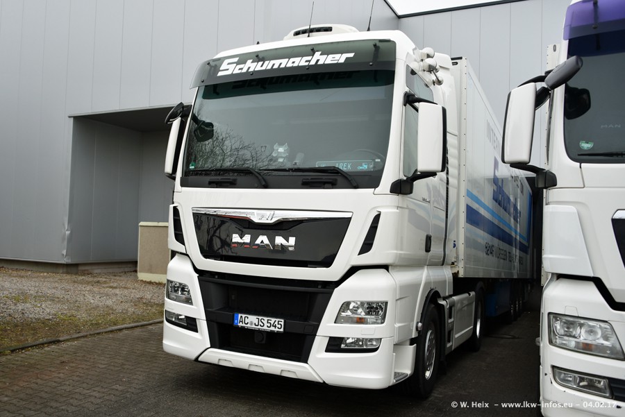 Es sind seit dem letzten Besuch bei Schumacher schon wieder rund 1,5 Jahre vergangen. Eigentlich sollte heute die Sonne scheinen, aber das Wetter war dann leider doch schlechter als erwartet. Trotzdem konnte ich wieder viele schöne Bilder machen. Bereits im Sommer 2015 (kurz nach meinem letzten Besuch) hat Schumacher den von der Spedition Sturm aus Viersen übernommenen Showtruck "Herpa/Die Geschichte der Nutzfahrzeuge" bekommen. Die Zugmaschine (Scania R 500 V8) wurde verkauft und durch einen MAN TGX Euro 6 ersetzt. Heute konnte ich von diesem LKW viele Bilder machen. Auf den ersten Fotos war der Showtruck (noch) nicht gewaschen. Aber nach der Fahrt durch die firmeneigene Waschanlage konnte ich nochmals schöne Fotos machen. In den letzten Monaten wurde der Fuhrpark zudem mit Zugmaschinen von Mercedes-Benz und MAN modernisiert. Aber bei diesem Besuch habe ich mich überwiegend auf das Fotografieren der Showtrucks beschränkt.