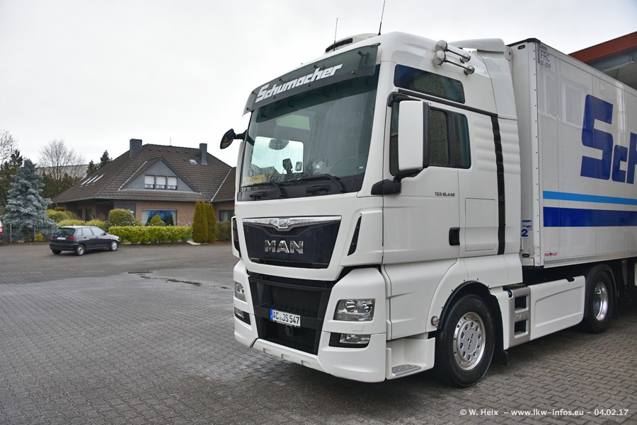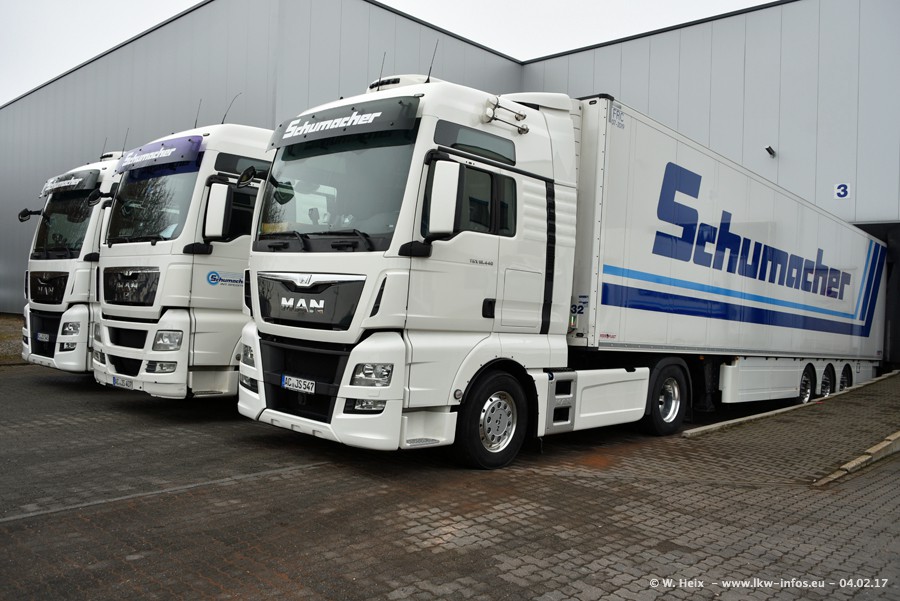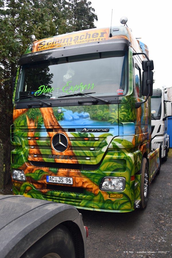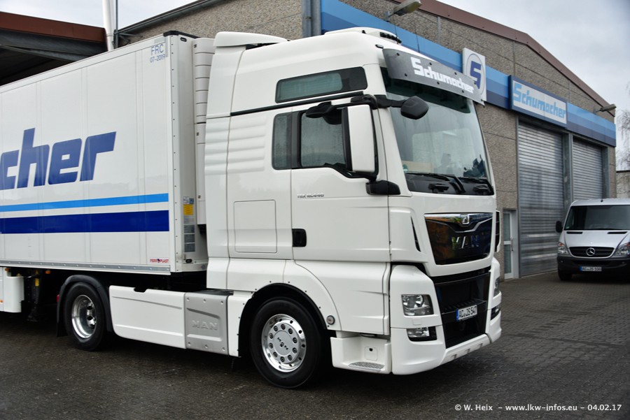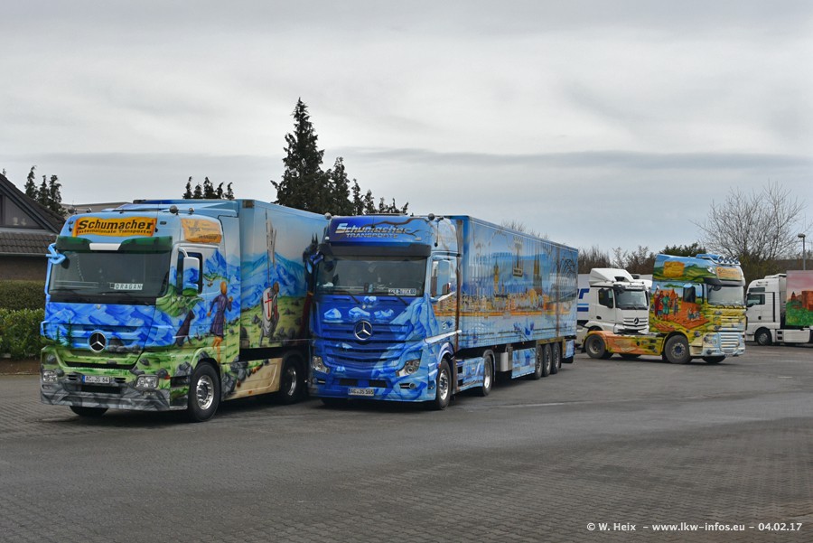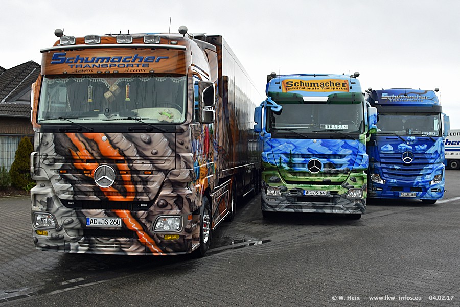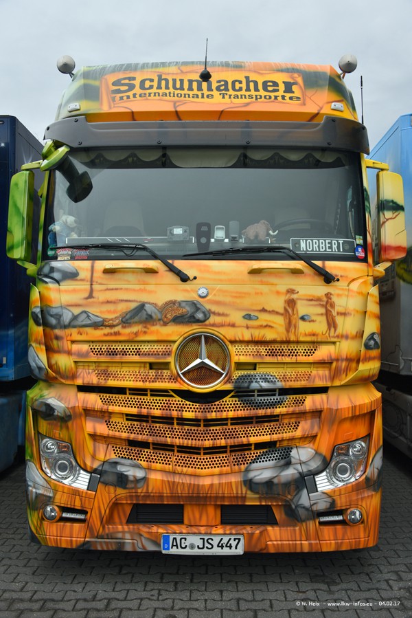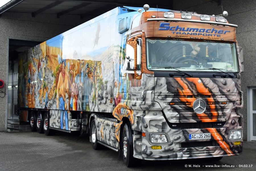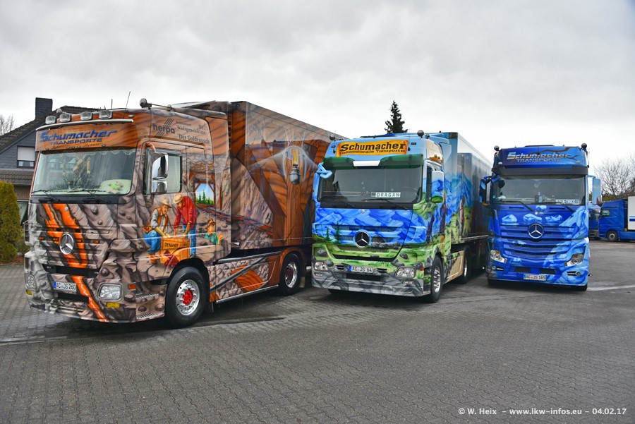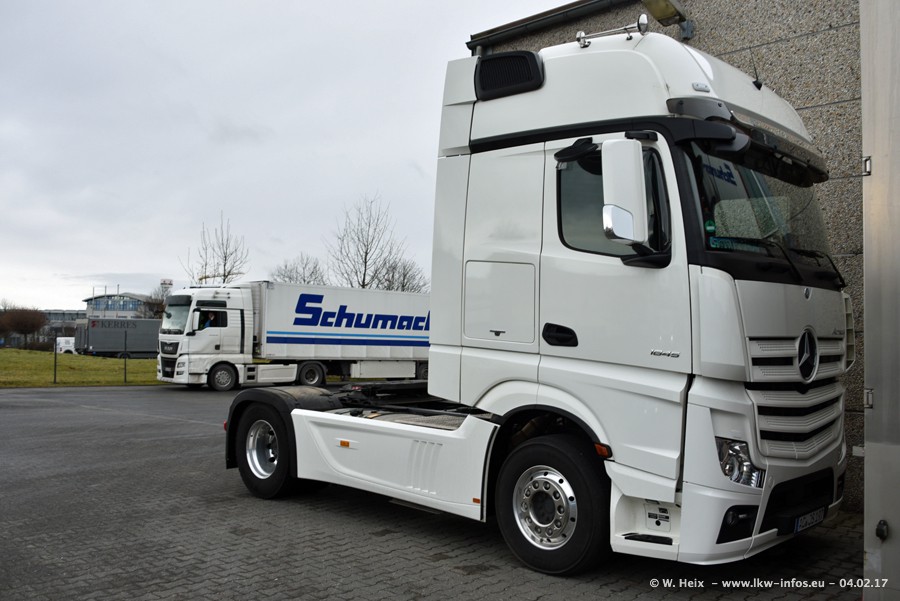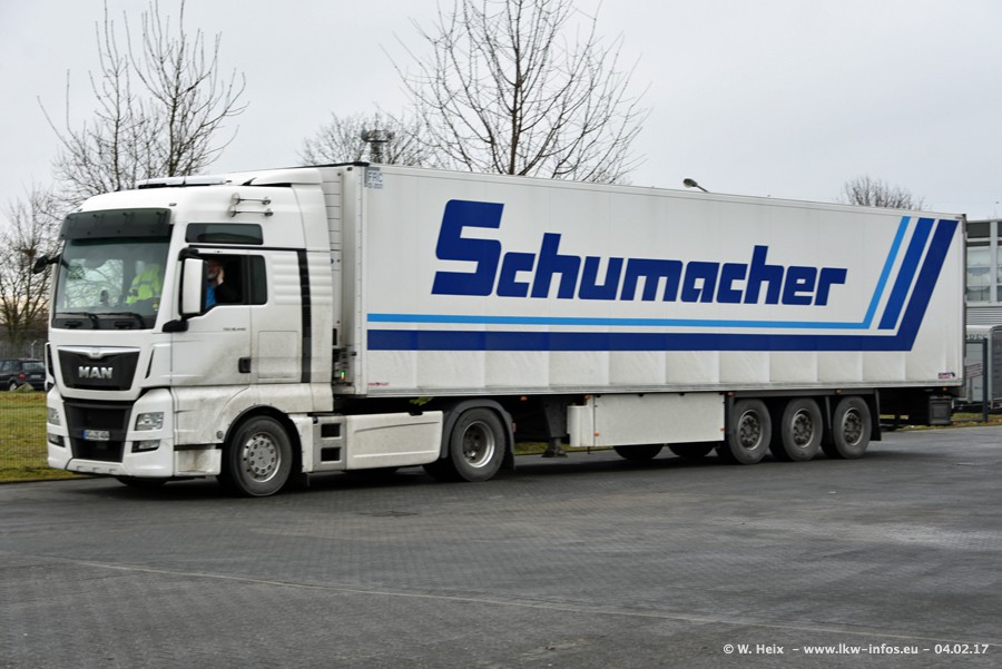 Es sind seit dem letzten Besuch bei Schumacher schon wieder rund 1,5 Jahre vergangen. Eigentlich sollte heute die Sonne scheinen, aber das Wetter war dann leider doch schlechter als erwartet. Trotzdem konnte ich wieder viele schöne Bilder machen. Bereits im Sommer 2015 (kurz nach meinem letzten Besuch) hat Schumacher den von der Spedition Sturm aus Viersen übernommenen Showtruck "Herpa/Die Geschichte der Nutzfahrzeuge" bekommen. Die Zugmaschine (Scania R 500 V8) wurde verkauft und durch einen MAN TGX Euro 6 ersetzt. Heute konnte ich von diesem LKW viele Bilder machen. Auf den ersten Fotos war der Showtruck (noch) nicht gewaschen. Aber nach der Fahrt durch die firmeneigene Waschanlage konnte ich nochmals schöne Fotos machen. In den letzten Monaten wurde der Fuhrpark zudem mit Zugmaschinen von Mercedes-Benz und MAN modernisiert. Aber bei diesem Besuch habe ich mich überwiegend auf das Fotografieren der Showtrucks beschränkt.