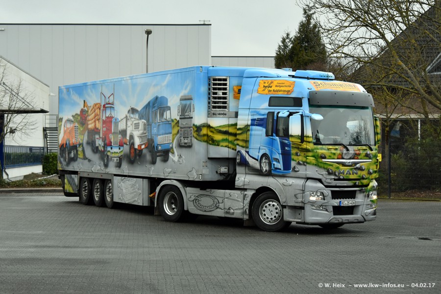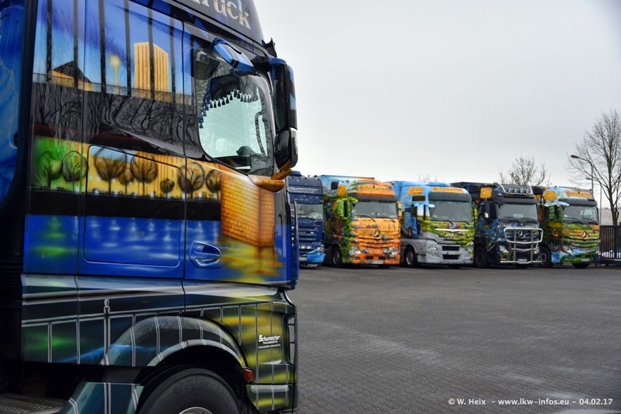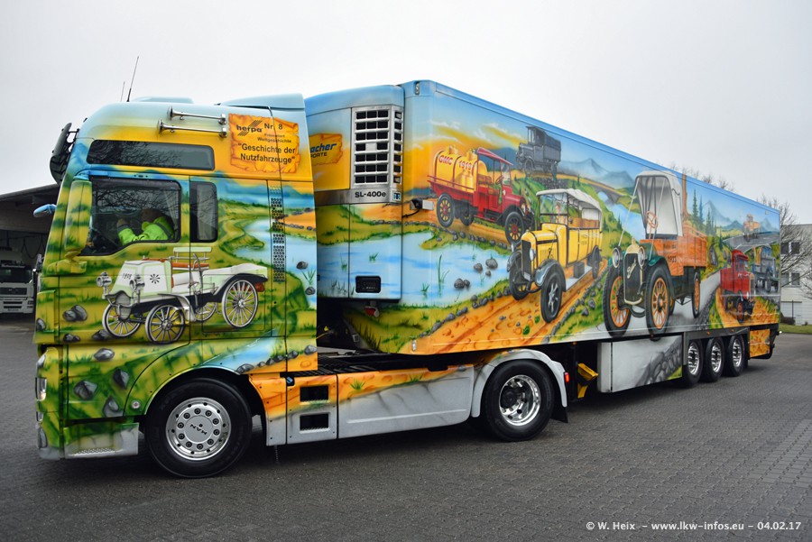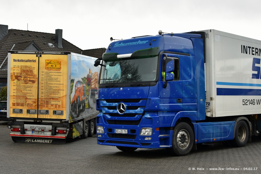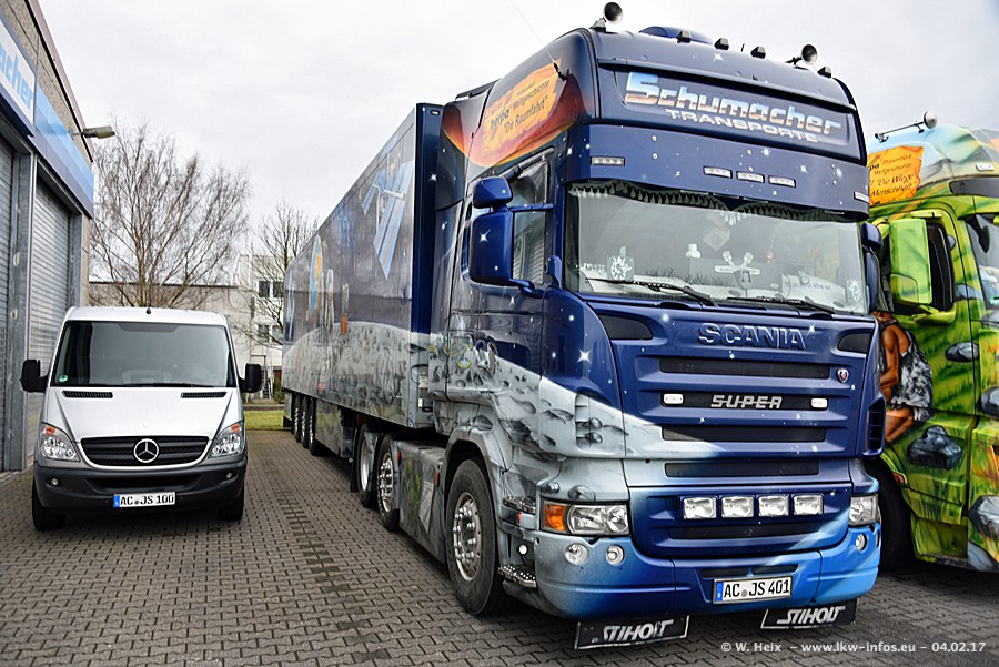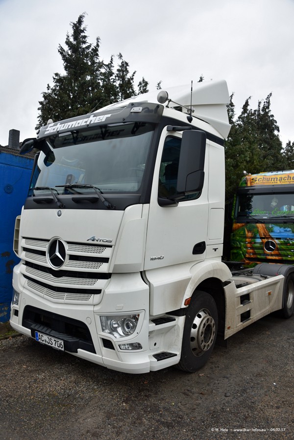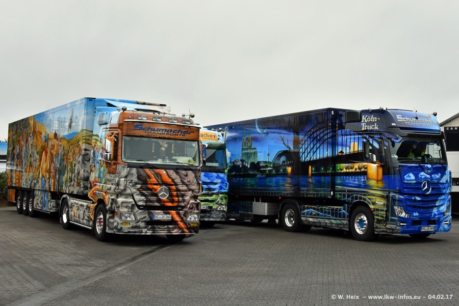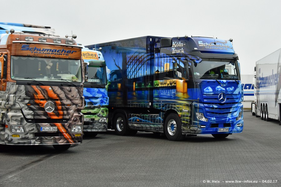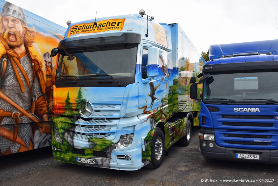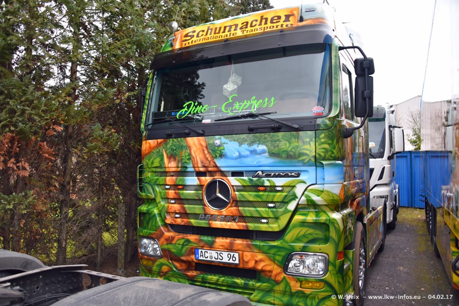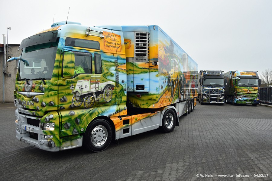 Es sind seit dem letzten Besuch bei Schumacher schon wieder rund 1,5 Jahre vergangen. Eigentlich sollte heute die Sonne scheinen, aber das Wetter war dann leider doch schlechter als erwartet. Trotzdem konnte ich wieder viele schöne Bilder machen. Bereits im Sommer 2015 (kurz nach meinem letzten Besuch) hat Schumacher den von der Spedition Sturm aus Viersen übernommenen Showtruck "Herpa/Die Geschichte der Nutzfahrzeuge" bekommen. Die Zugmaschine (Scania R 500 V8) wurde verkauft und durch einen MAN TGX Euro 6 ersetzt. Heute konnte ich von diesem LKW viele Bilder machen. Auf den ersten Fotos war der Showtruck (noch) nicht gewaschen. Aber nach der Fahrt durch die firmeneigene Waschanlage konnte ich nochmals schöne Fotos machen. In den letzten Monaten wurde der Fuhrpark zudem mit Zugmaschinen von Mercedes-Benz und MAN modernisiert. Aber bei diesem Besuch habe ich mich überwiegend auf das Fotografieren der Showtrucks beschränkt.