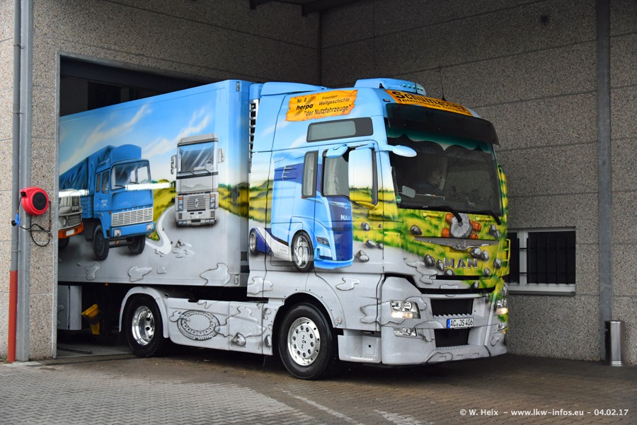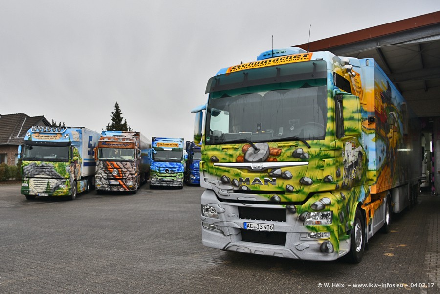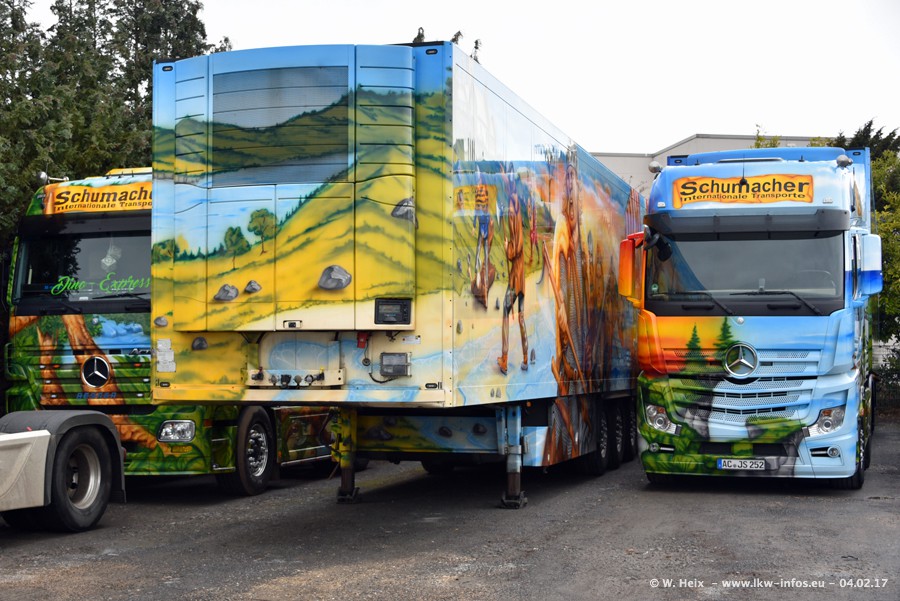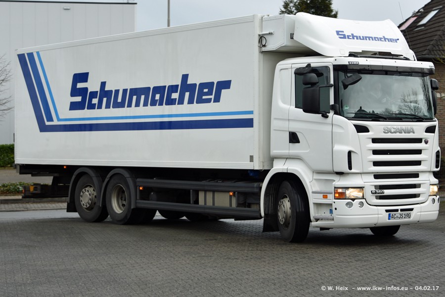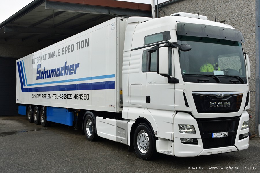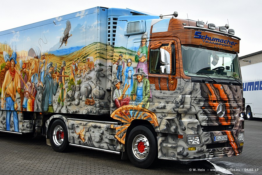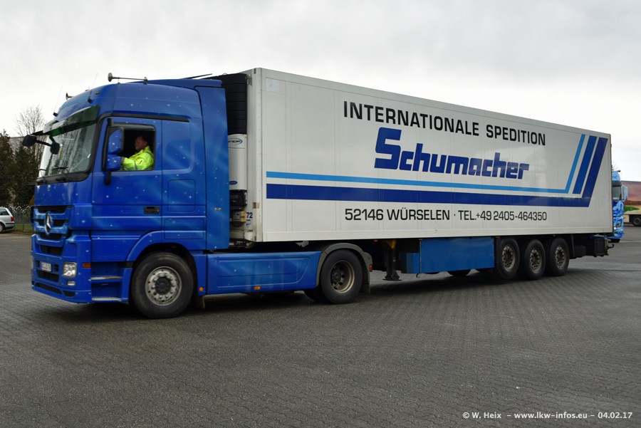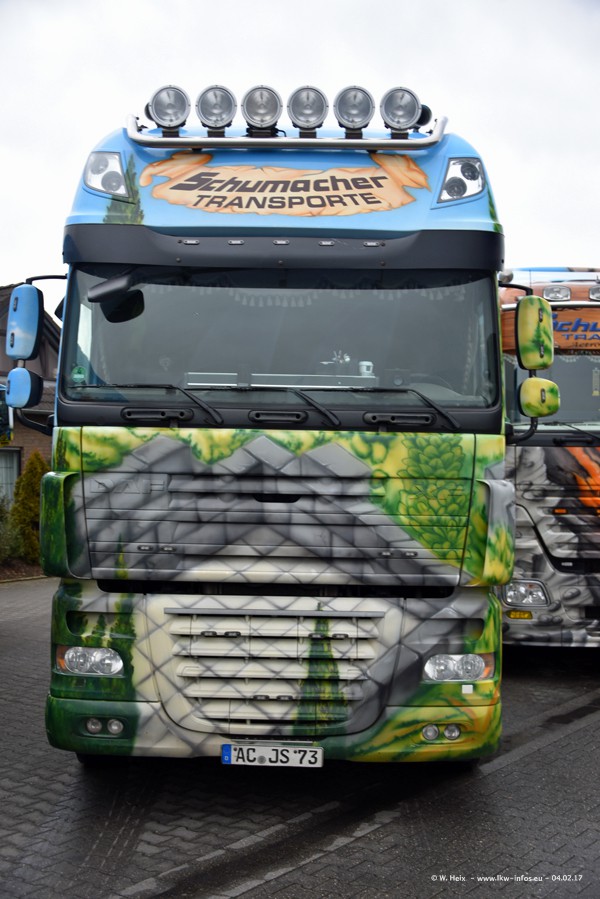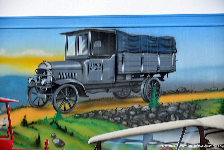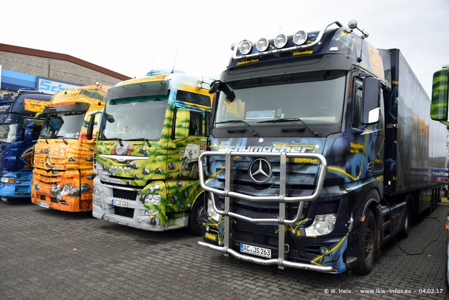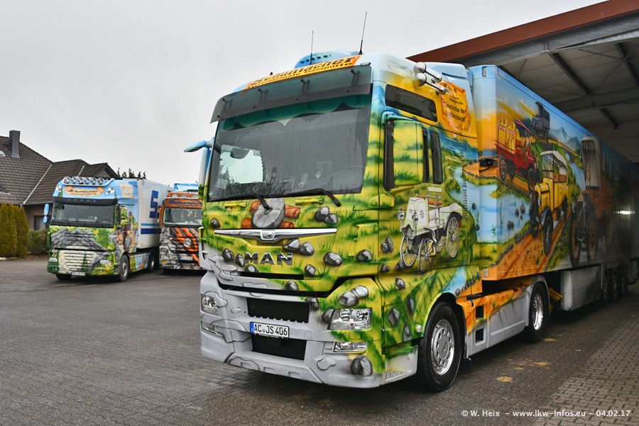 Es sind seit dem letzten Besuch bei Schumacher schon wieder rund 1,5 Jahre vergangen. Eigentlich sollte heute die Sonne scheinen, aber das Wetter war dann leider doch schlechter als erwartet. Trotzdem konnte ich wieder viele schöne Bilder machen. Bereits im Sommer 2015 (kurz nach meinem letzten Besuch) hat Schumacher den von der Spedition Sturm aus Viersen übernommenen Showtruck "Herpa/Die Geschichte der Nutzfahrzeuge" bekommen. Die Zugmaschine (Scania R 500 V8) wurde verkauft und durch einen MAN TGX Euro 6 ersetzt. Heute konnte ich von diesem LKW viele Bilder machen. Auf den ersten Fotos war der Showtruck (noch) nicht gewaschen. Aber nach der Fahrt durch die firmeneigene Waschanlage konnte ich nochmals schöne Fotos machen. In den letzten Monaten wurde der Fuhrpark zudem mit Zugmaschinen von Mercedes-Benz und MAN modernisiert. Aber bei diesem Besuch habe ich mich überwiegend auf das Fotografieren der Showtrucks beschränkt.