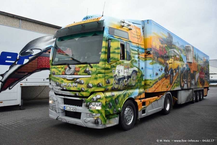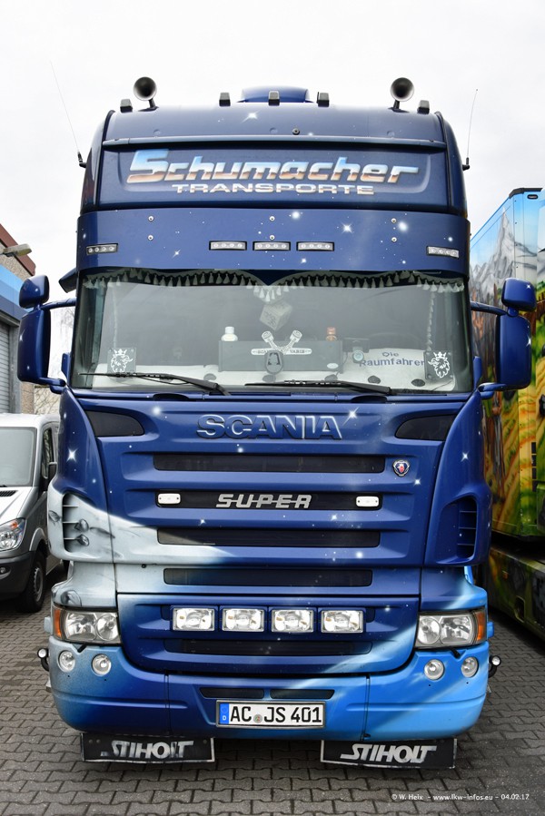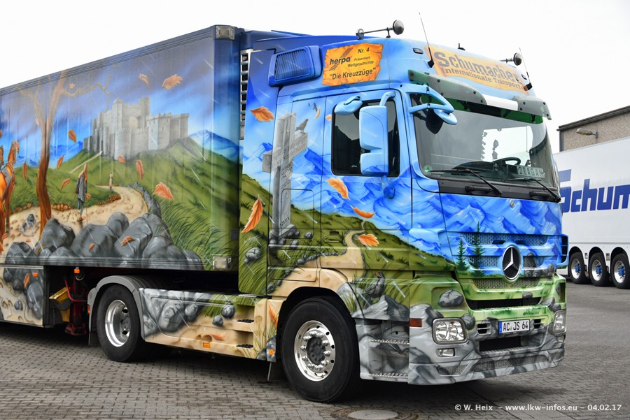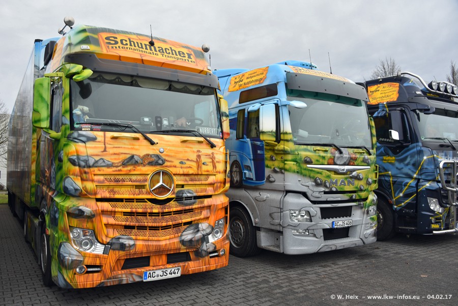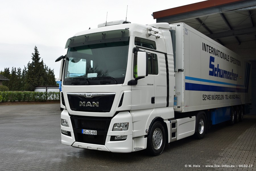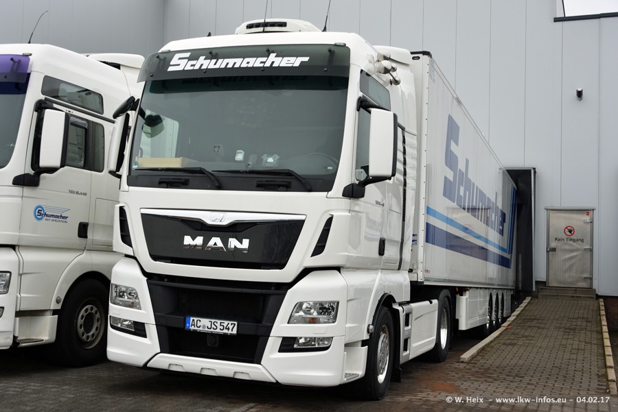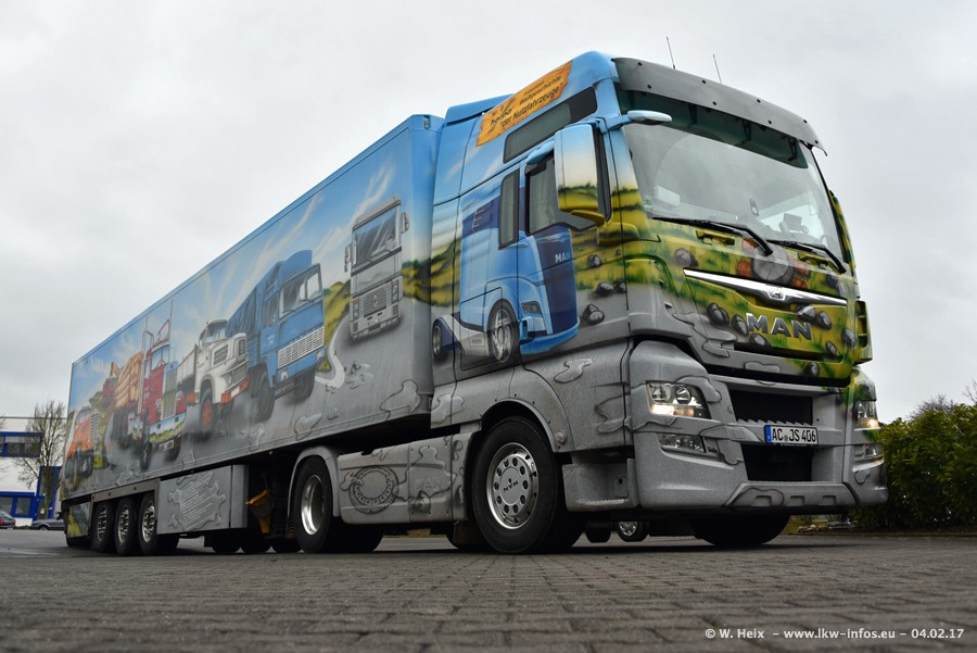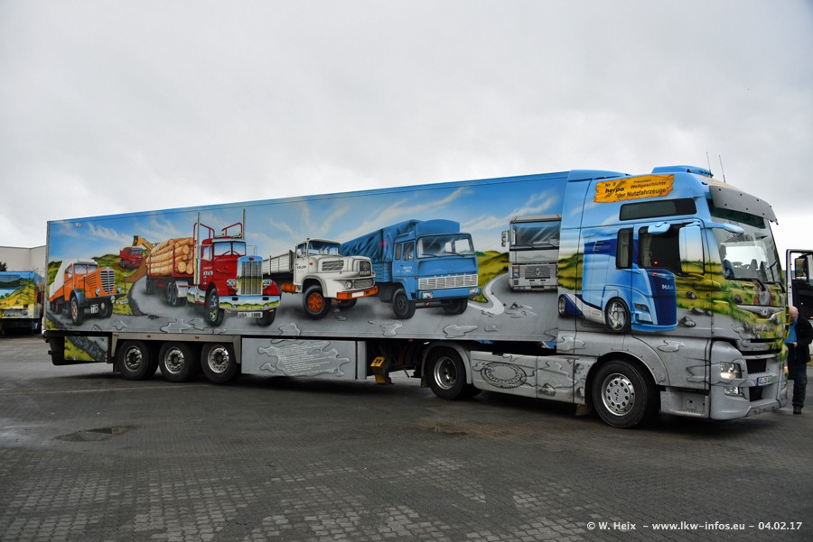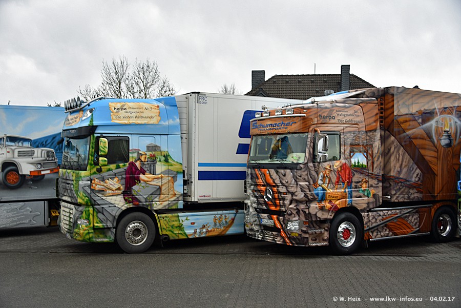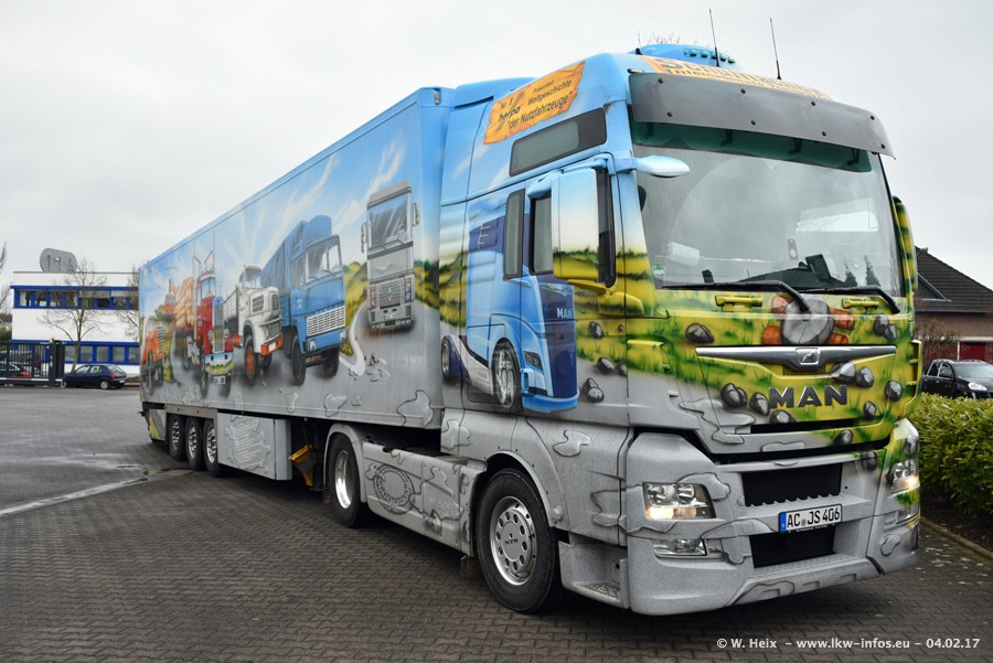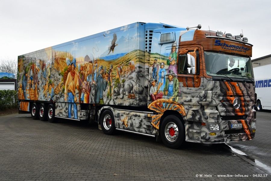 Es sind seit dem letzten Besuch bei Schumacher schon wieder rund 1,5 Jahre vergangen. Eigentlich sollte heute die Sonne scheinen, aber das Wetter war dann leider doch schlechter als erwartet. Trotzdem konnte ich wieder viele schöne Bilder machen. Bereits im Sommer 2015 (kurz nach meinem letzten Besuch) hat Schumacher den von der Spedition Sturm aus Viersen übernommenen Showtruck "Herpa/Die Geschichte der Nutzfahrzeuge" bekommen. Die Zugmaschine (Scania R 500 V8) wurde verkauft und durch einen MAN TGX Euro 6 ersetzt. Heute konnte ich von diesem LKW viele Bilder machen. Auf den ersten Fotos war der Showtruck (noch) nicht gewaschen. Aber nach der Fahrt durch die firmeneigene Waschanlage konnte ich nochmals schöne Fotos machen. In den letzten Monaten wurde der Fuhrpark zudem mit Zugmaschinen von Mercedes-Benz und MAN modernisiert. Aber bei diesem Besuch habe ich mich überwiegend auf das Fotografieren der Showtrucks beschränkt.
