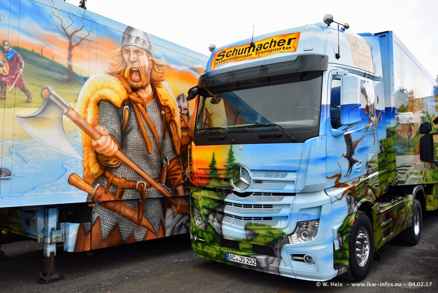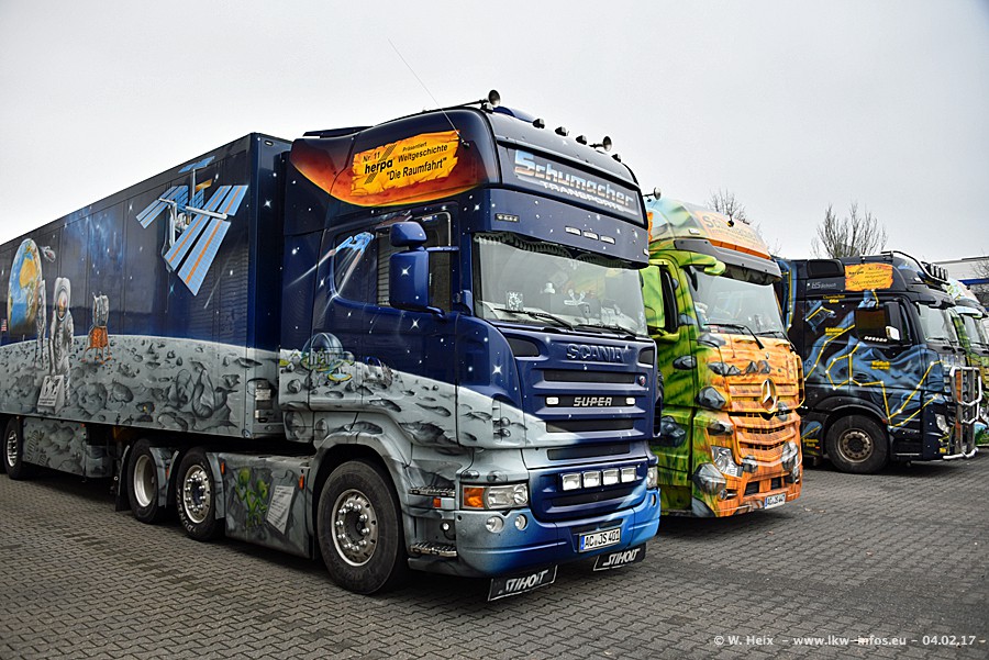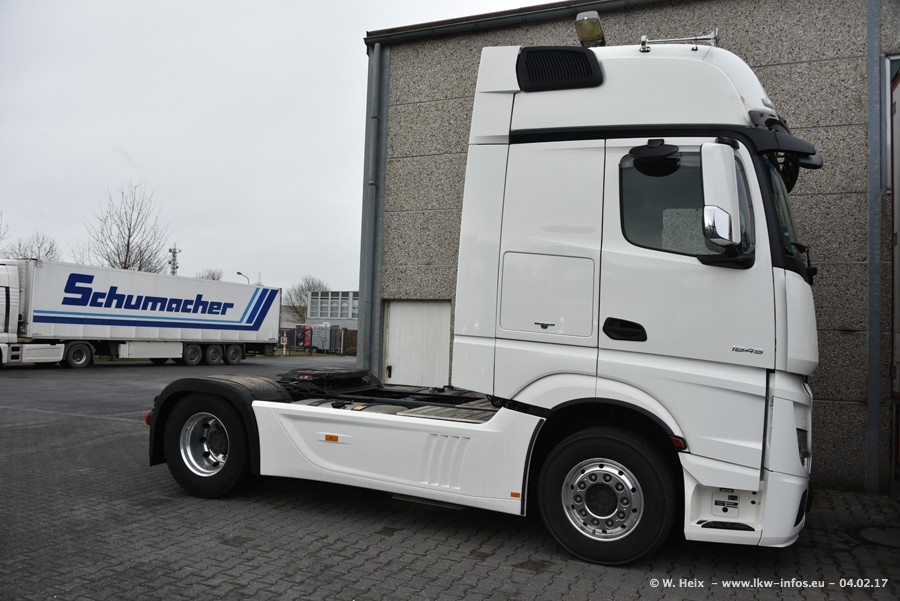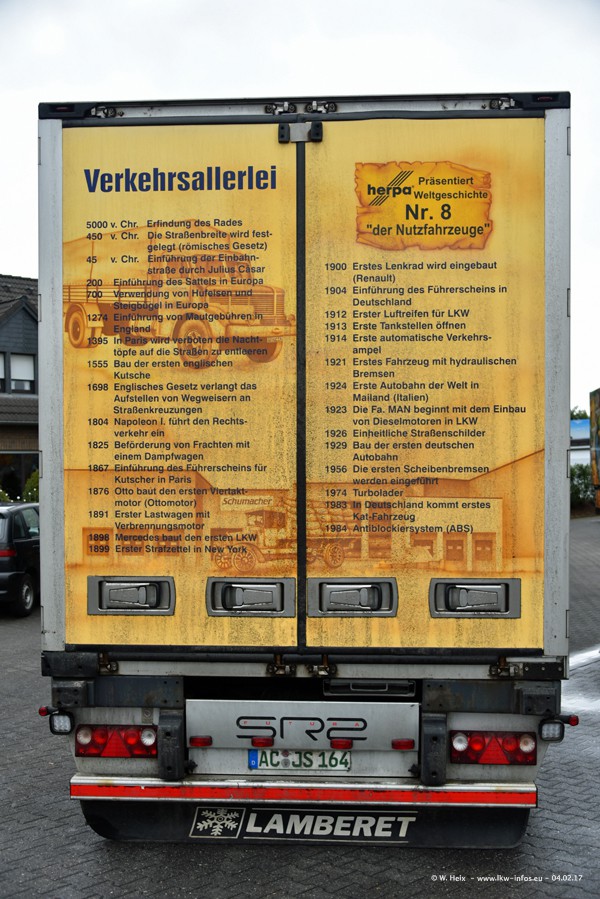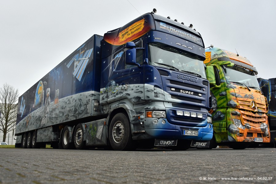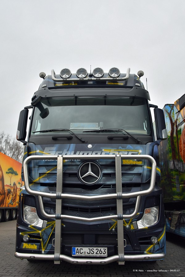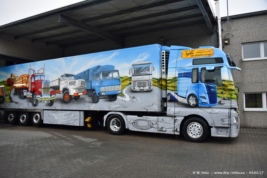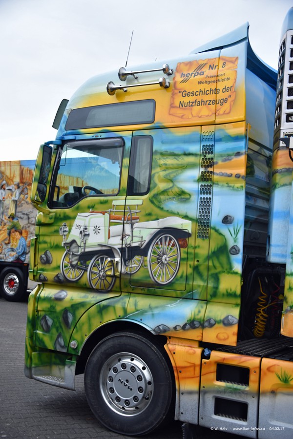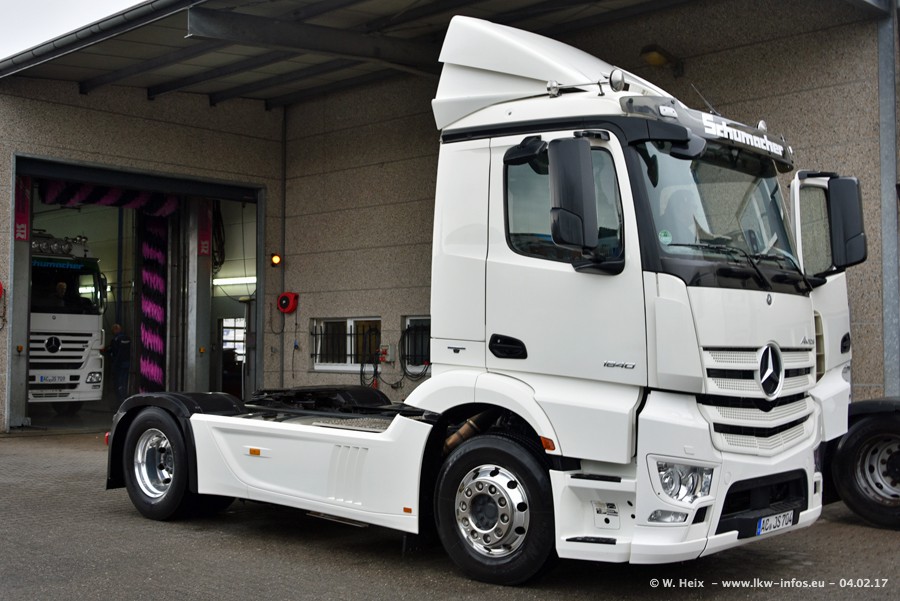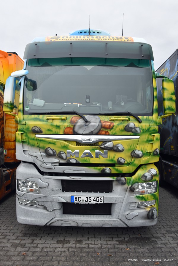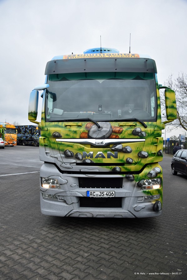 Es sind seit dem letzten Besuch bei Schumacher schon wieder rund 1,5 Jahre vergangen. Eigentlich sollte heute die Sonne scheinen, aber das Wetter war dann leider doch schlechter als erwartet. Trotzdem konnte ich wieder viele schöne Bilder machen. Bereits im Sommer 2015 (kurz nach meinem letzten Besuch) hat Schumacher den von der Spedition Sturm aus Viersen übernommenen Showtruck "Herpa/Die Geschichte der Nutzfahrzeuge" bekommen. Die Zugmaschine (Scania R 500 V8) wurde verkauft und durch einen MAN TGX Euro 6 ersetzt. Heute konnte ich von diesem LKW viele Bilder machen. Auf den ersten Fotos war der Showtruck (noch) nicht gewaschen. Aber nach der Fahrt durch die firmeneigene Waschanlage konnte ich nochmals schöne Fotos machen. In den letzten Monaten wurde der Fuhrpark zudem mit Zugmaschinen von Mercedes-Benz und MAN modernisiert. Aber bei diesem Besuch habe ich mich überwiegend auf das Fotografieren der Showtrucks beschränkt.