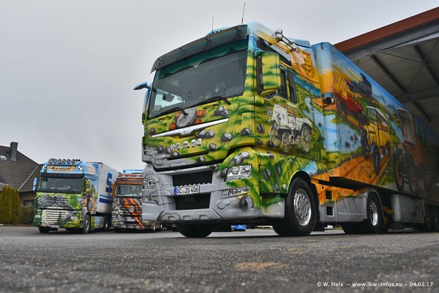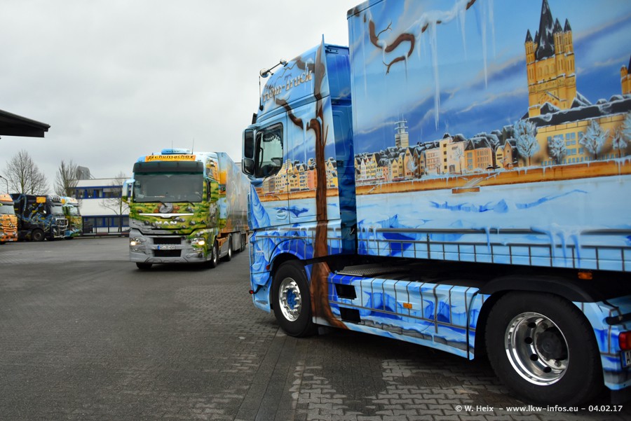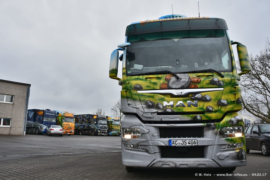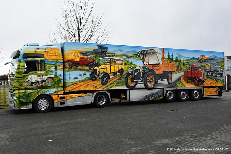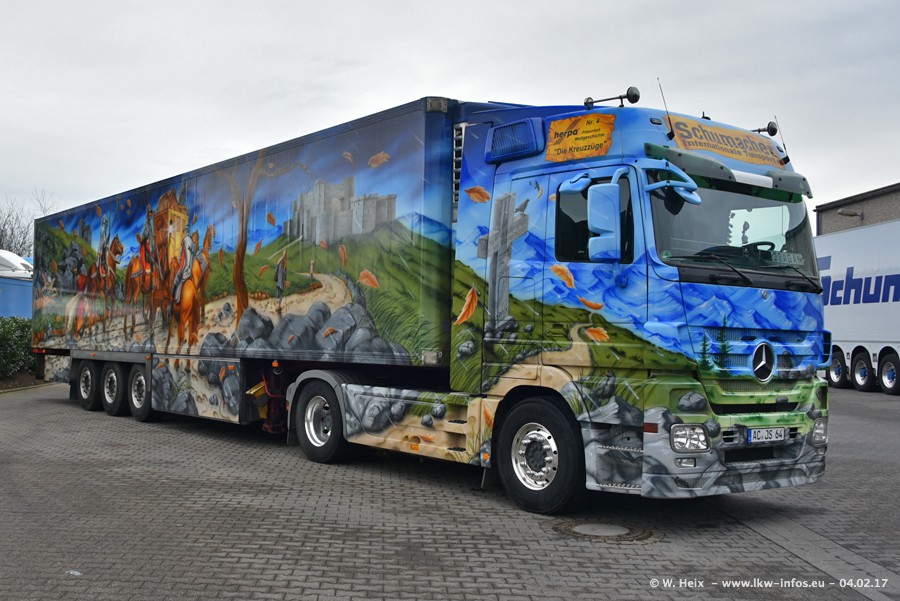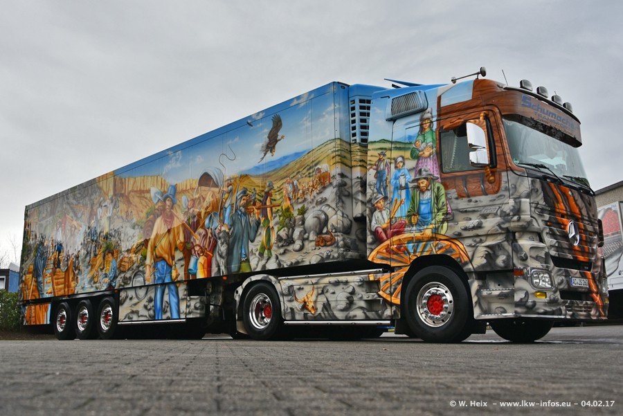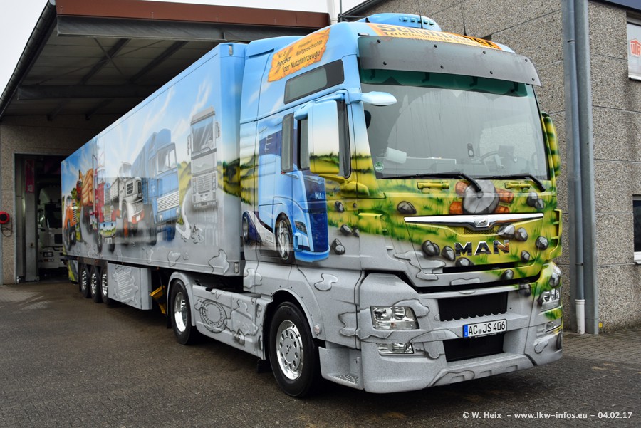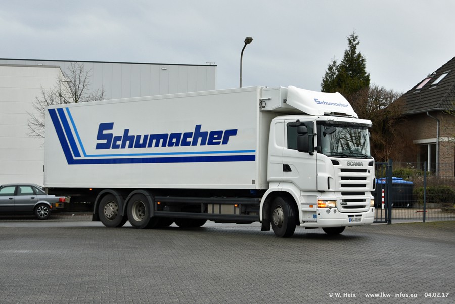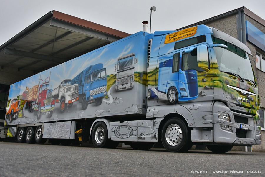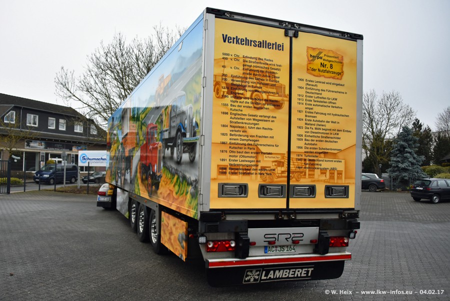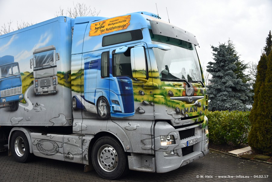 Es sind seit dem letzten Besuch bei Schumacher schon wieder rund 1,5 Jahre vergangen. Eigentlich sollte heute die Sonne scheinen, aber das Wetter war dann leider doch schlechter als erwartet. Trotzdem konnte ich wieder viele schöne Bilder machen. Bereits im Sommer 2015 (kurz nach meinem letzten Besuch) hat Schumacher den von der Spedition Sturm aus Viersen übernommenen Showtruck "Herpa/Die Geschichte der Nutzfahrzeuge" bekommen. Die Zugmaschine (Scania R 500 V8) wurde verkauft und durch einen MAN TGX Euro 6 ersetzt. Heute konnte ich von diesem LKW viele Bilder machen. Auf den ersten Fotos war der Showtruck (noch) nicht gewaschen. Aber nach der Fahrt durch die firmeneigene Waschanlage konnte ich nochmals schöne Fotos machen. In den letzten Monaten wurde der Fuhrpark zudem mit Zugmaschinen von Mercedes-Benz und MAN modernisiert. Aber bei diesem Besuch habe ich mich überwiegend auf das Fotografieren der Showtrucks beschränkt.