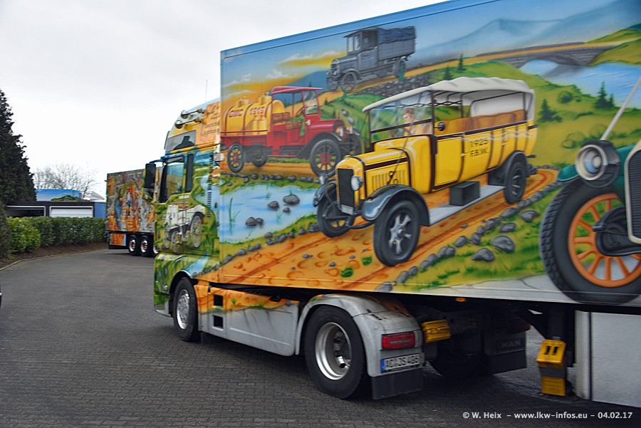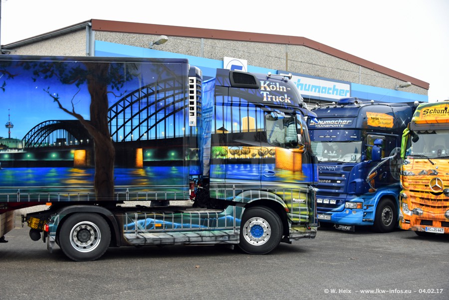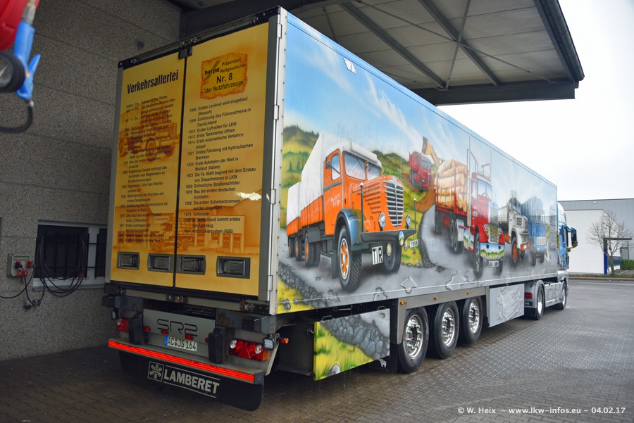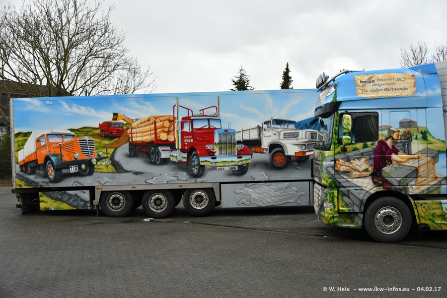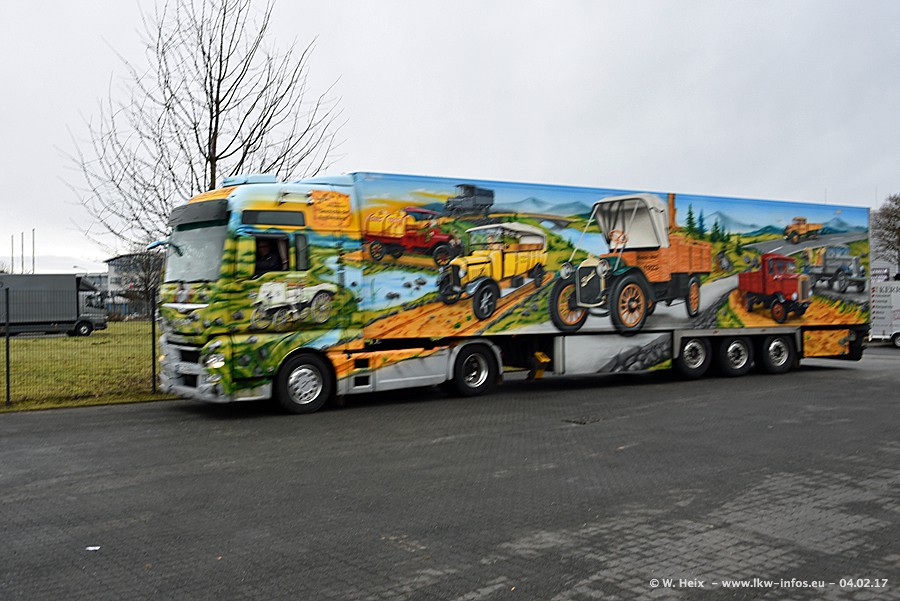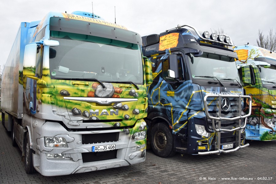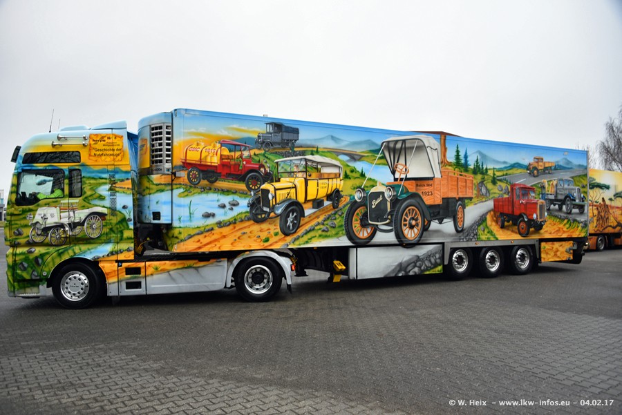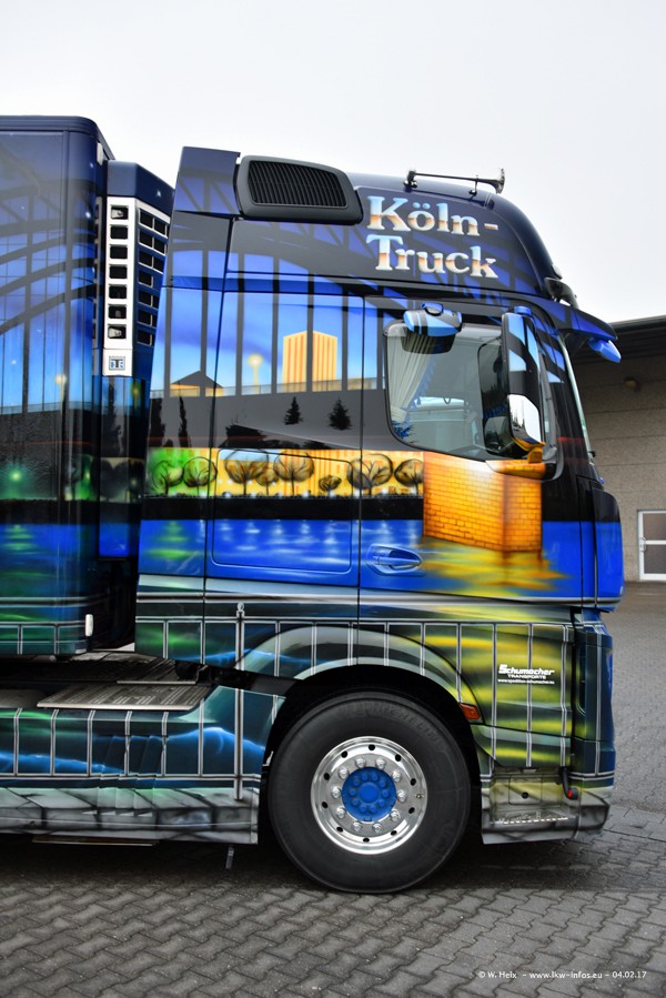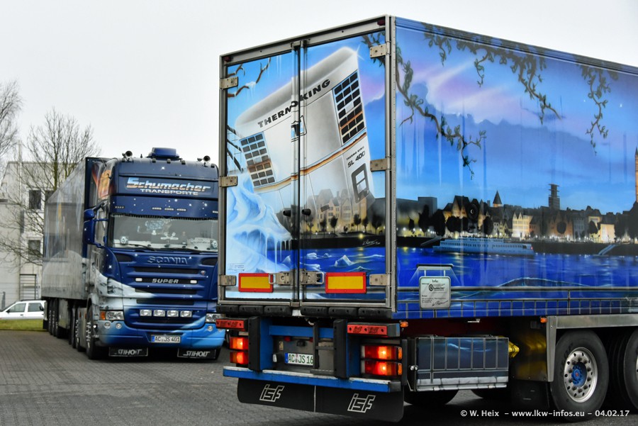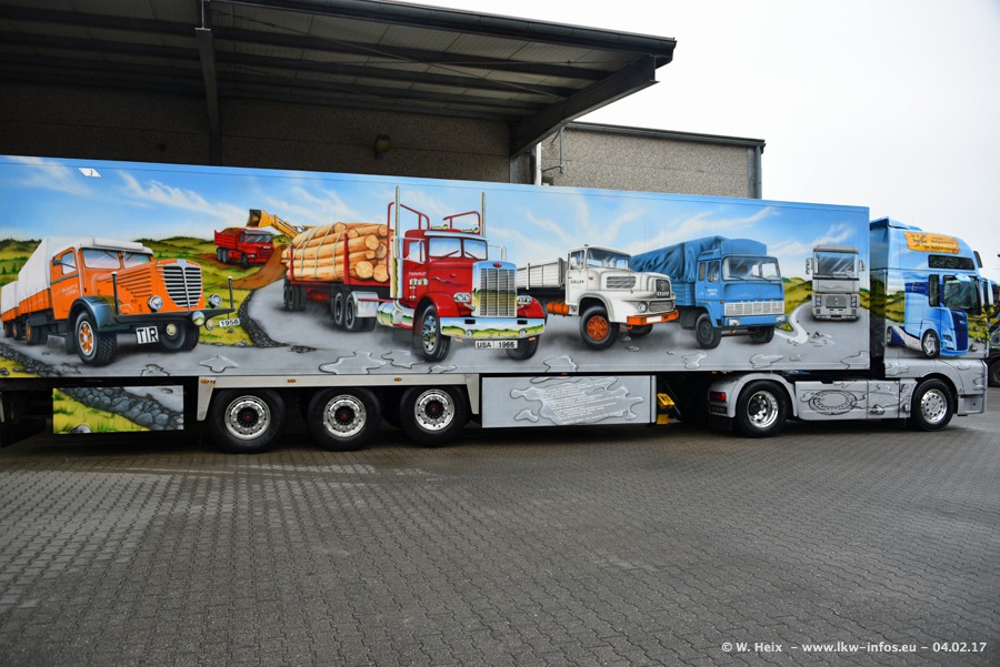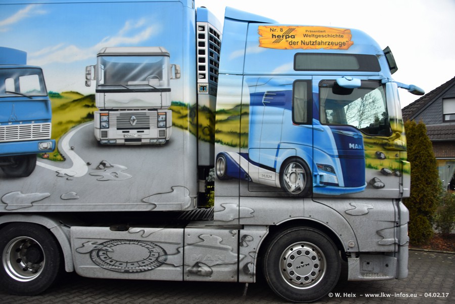 Es sind seit dem letzten Besuch bei Schumacher schon wieder rund 1,5 Jahre vergangen. Eigentlich sollte heute die Sonne scheinen, aber das Wetter war dann leider doch schlechter als erwartet. Trotzdem konnte ich wieder viele schöne Bilder machen. Bereits im Sommer 2015 (kurz nach meinem letzten Besuch) hat Schumacher den von der Spedition Sturm aus Viersen übernommenen Showtruck "Herpa/Die Geschichte der Nutzfahrzeuge" bekommen. Die Zugmaschine (Scania R 500 V8) wurde verkauft und durch einen MAN TGX Euro 6 ersetzt. Heute konnte ich von diesem LKW viele Bilder machen. Auf den ersten Fotos war der Showtruck (noch) nicht gewaschen. Aber nach der Fahrt durch die firmeneigene Waschanlage konnte ich nochmals schöne Fotos machen. In den letzten Monaten wurde der Fuhrpark zudem mit Zugmaschinen von Mercedes-Benz und MAN modernisiert. Aber bei diesem Besuch habe ich mich überwiegend auf das Fotografieren der Showtrucks beschränkt.