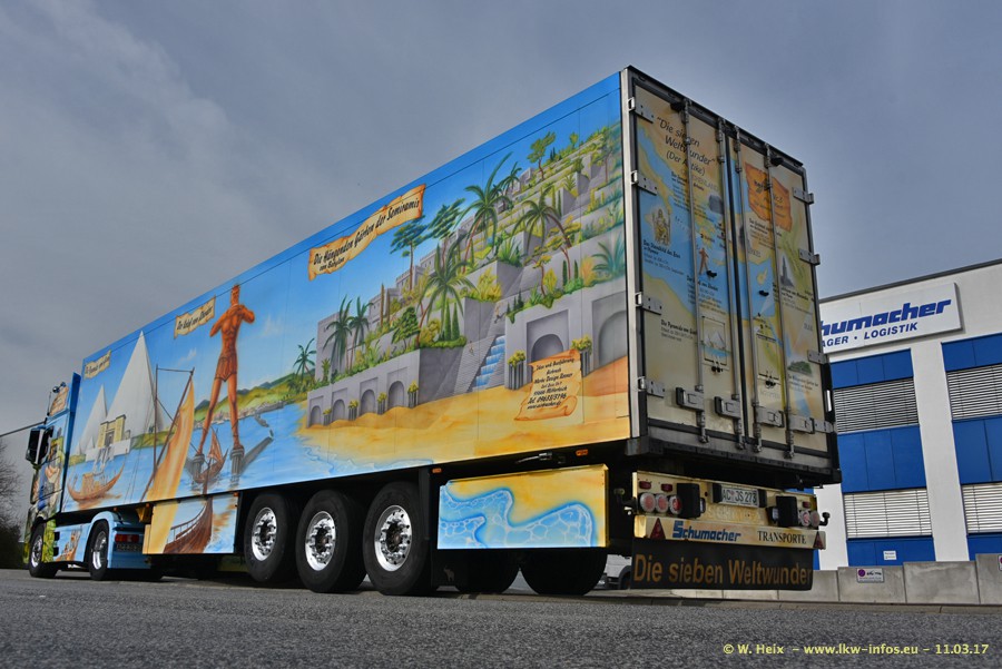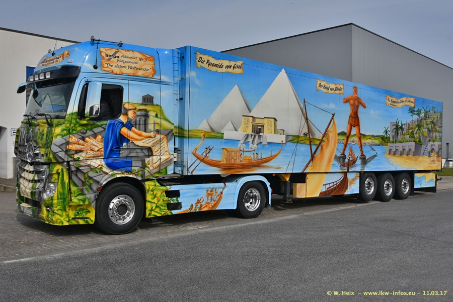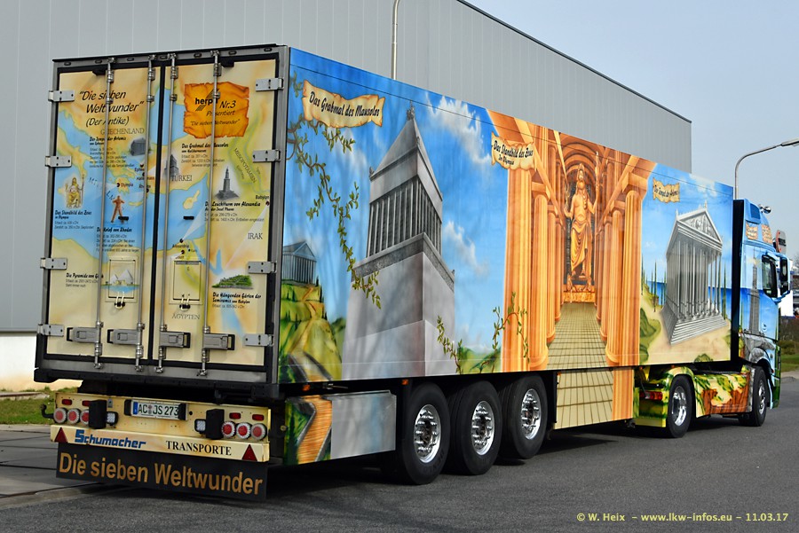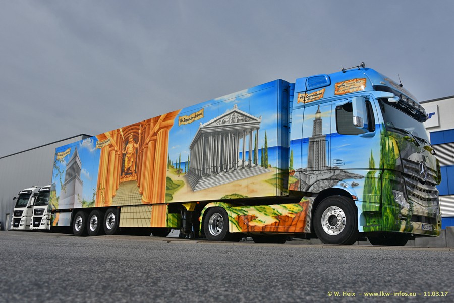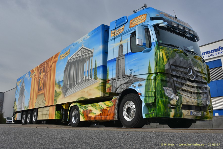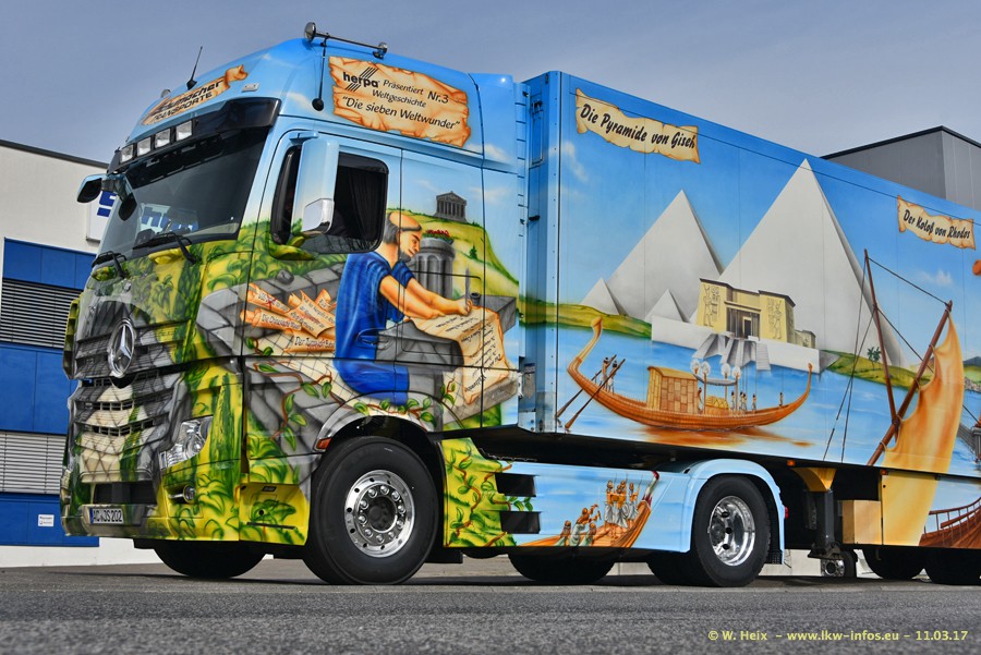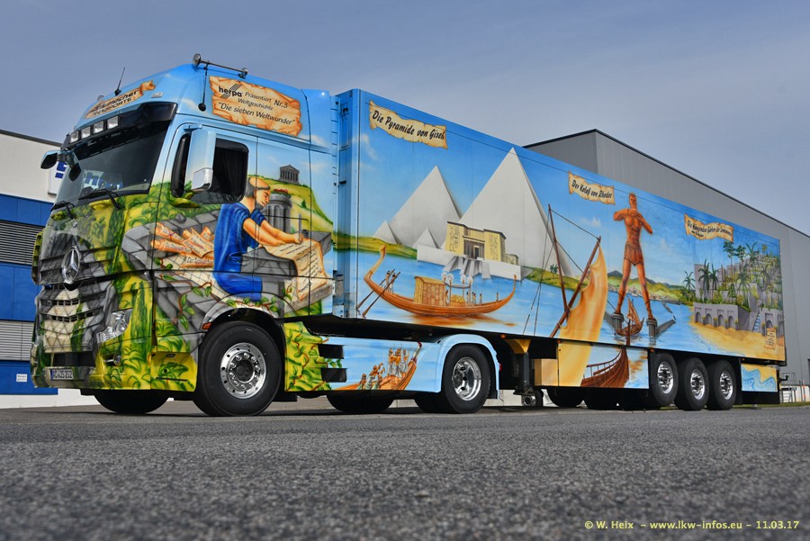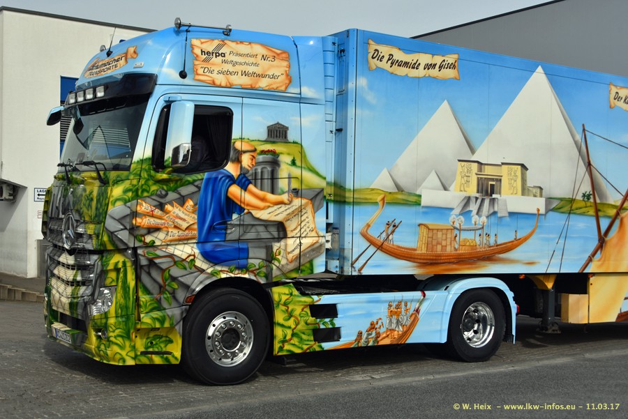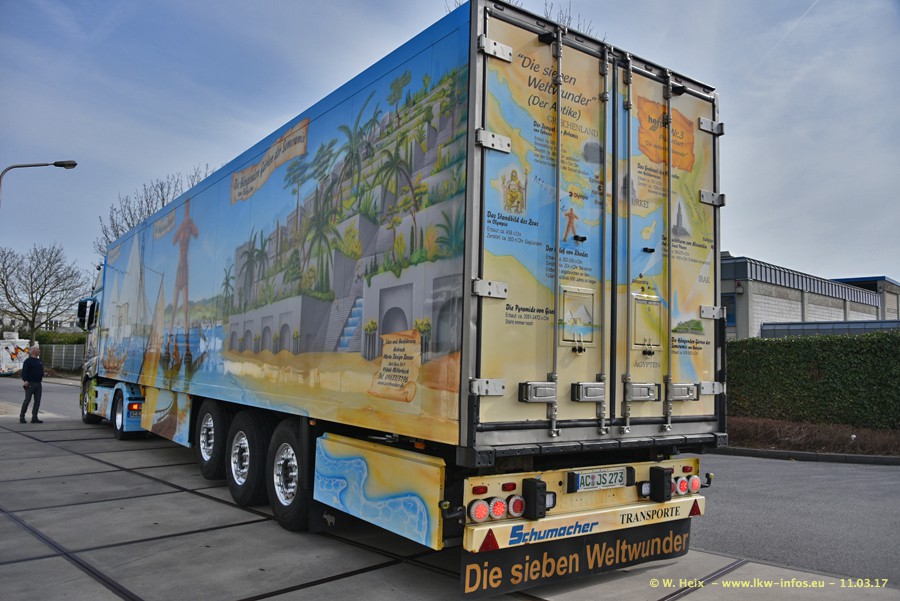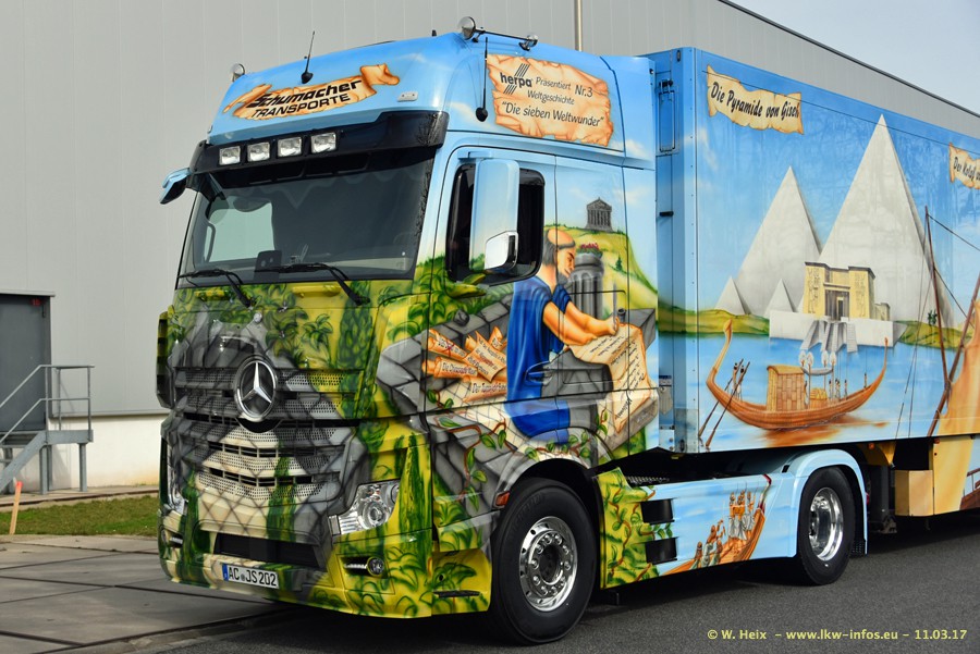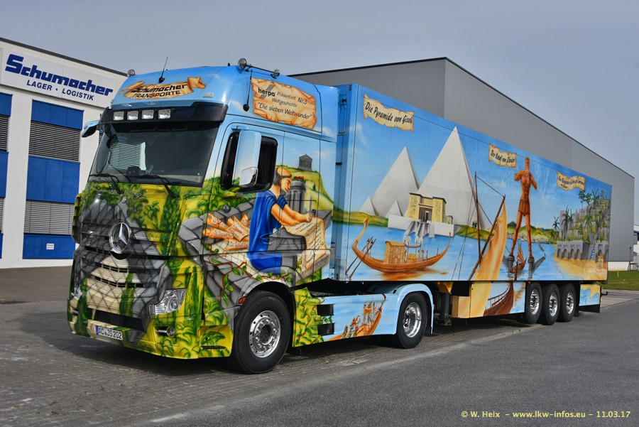 Ich war zwar erst vor fünf Wochen bei Schumacher, aber es gab einen guten Grund, die Firma direkt nochmal zu besuchen. Denn erstens war diesmal das Wetter viel schöner und der Herpa Showtruck Nr. 3 "Die sieben Weltwunder" hat vor knapp zwei Wochen eine neue Zugmaschine bekommen. Der alte DAF XF 105 wurde durch einen Mercedes-Benz Actros 4 ersetzt und auch der Auflieger wurde beim Airbrusher Rosner überarbeitet. Zudem ergab sich für mich die Möglichkeit, einige der Showtrucks in Form eines kleinen Fotoshootings außerhalb vom Firmengelände vor dem Kühllager (eine Straße weiter) von Schumacher zu fotografieren. Leider war das aus zeitlichen und organisatorischen Gründen nicht mit allen Showtrucks möglich. Ich versuche demnächst, auch die anderen Showtrucks nochmal in dieser Form zu fotografieren.