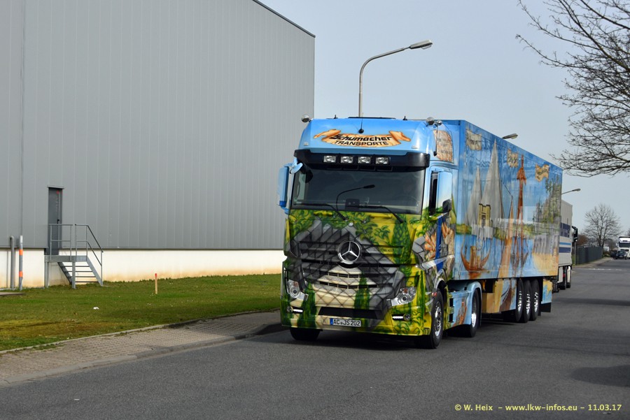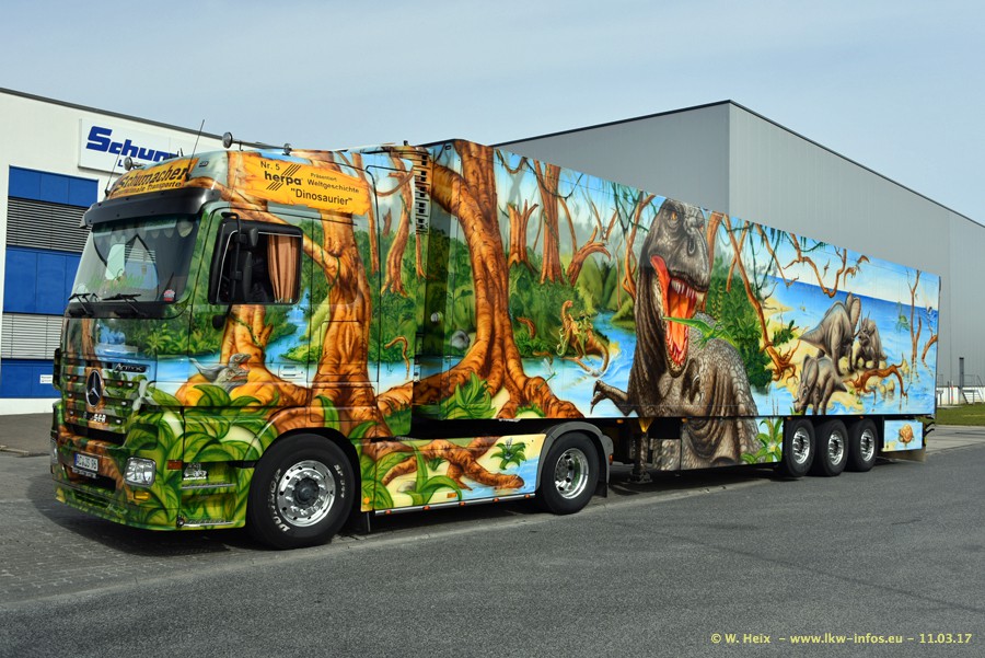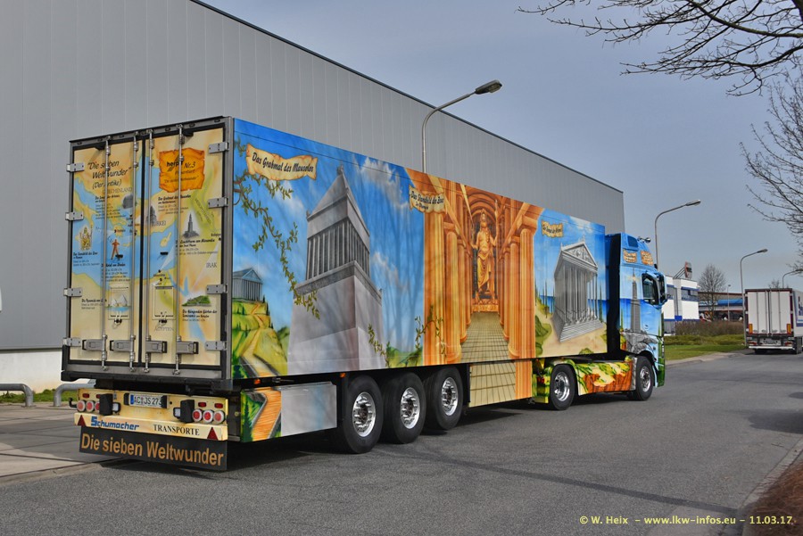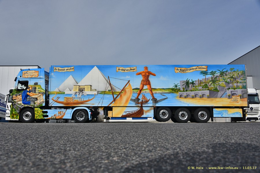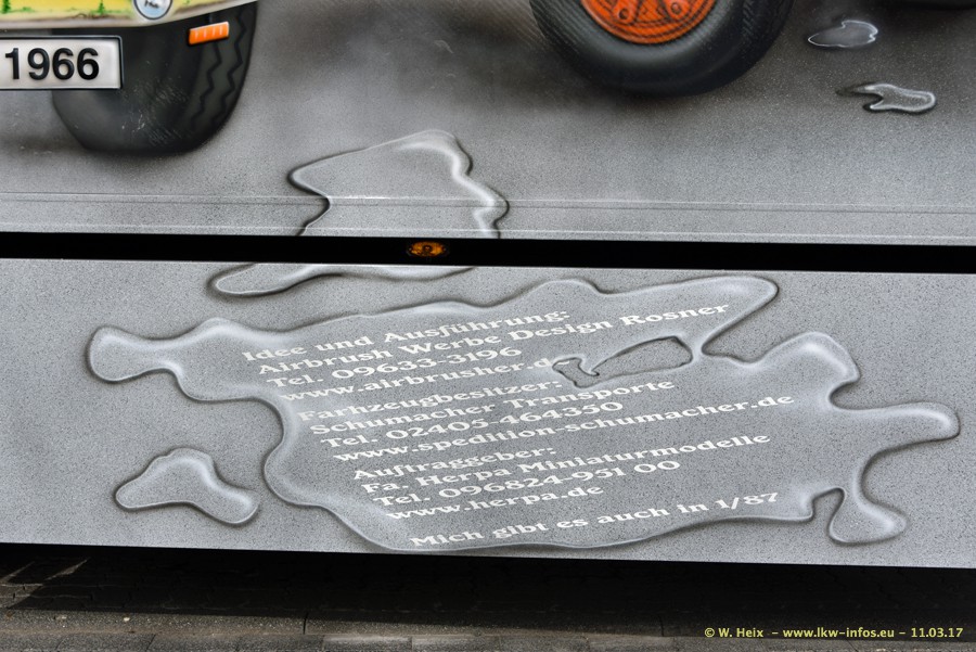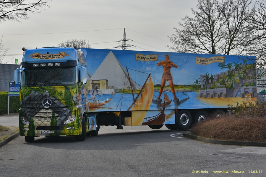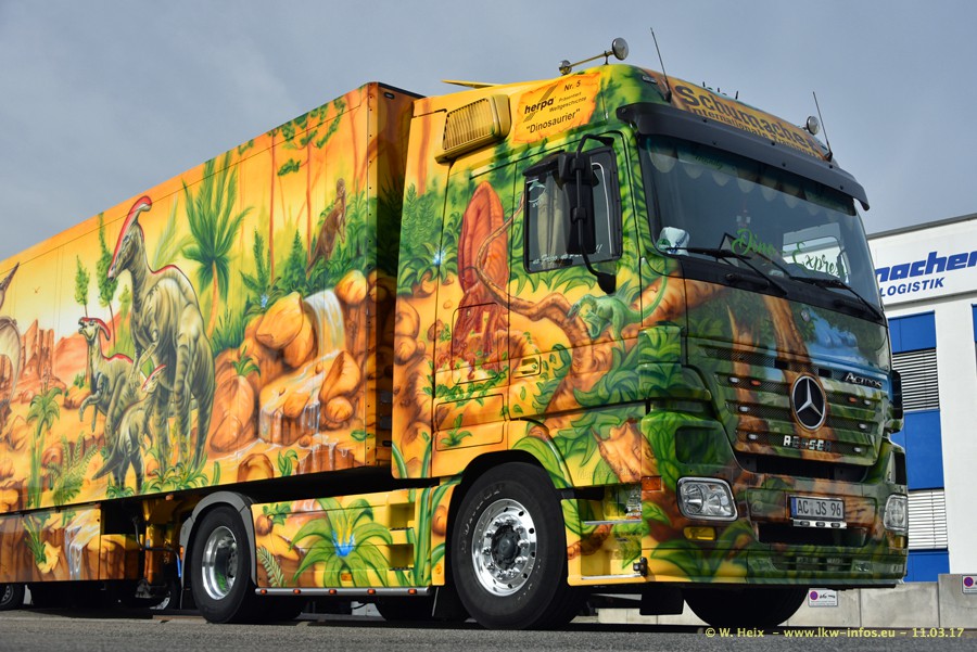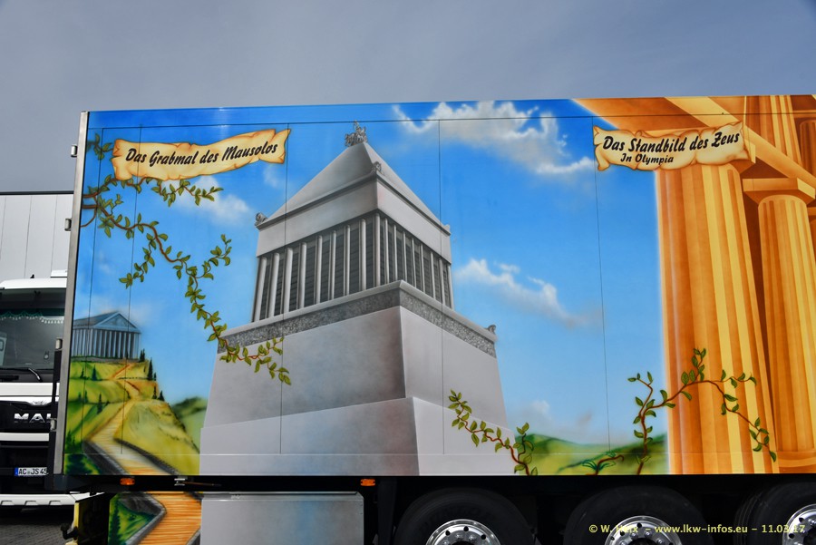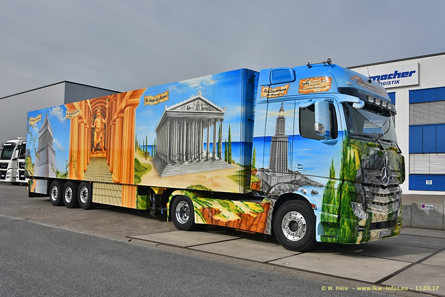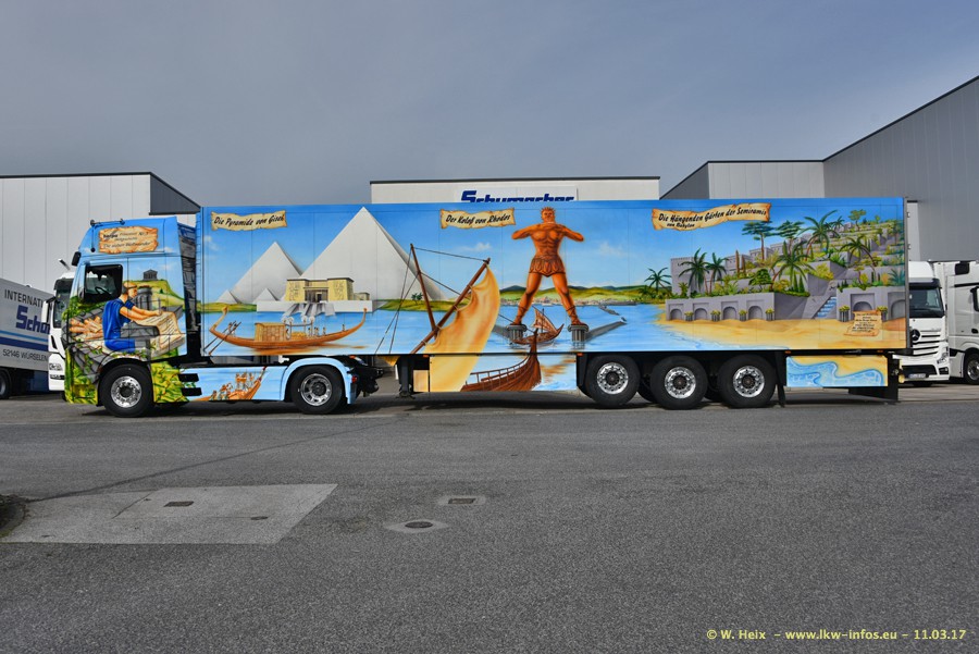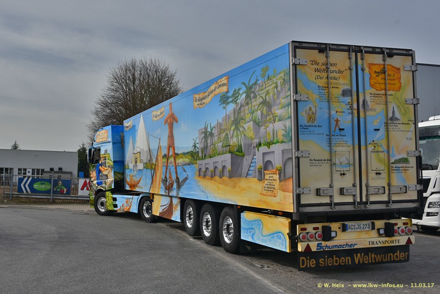 Ich war zwar erst vor fünf Wochen bei Schumacher, aber es gab einen guten Grund, die Firma direkt nochmal zu besuchen. Denn erstens war diesmal das Wetter viel schöner und der Herpa Showtruck Nr. 3 "Die sieben Weltwunder" hat vor knapp zwei Wochen eine neue Zugmaschine bekommen. Der alte DAF XF 105 wurde durch einen Mercedes-Benz Actros 4 ersetzt und auch der Auflieger wurde beim Airbrusher Rosner überarbeitet. Zudem ergab sich für mich die Möglichkeit, einige der Showtrucks in Form eines kleinen Fotoshootings außerhalb vom Firmengelände vor dem Kühllager (eine Straße weiter) von Schumacher zu fotografieren. Leider war das aus zeitlichen und organisatorischen Gründen nicht mit allen Showtrucks möglich. Ich versuche demnächst, auch die anderen Showtrucks nochmal in dieser Form zu fotografieren.