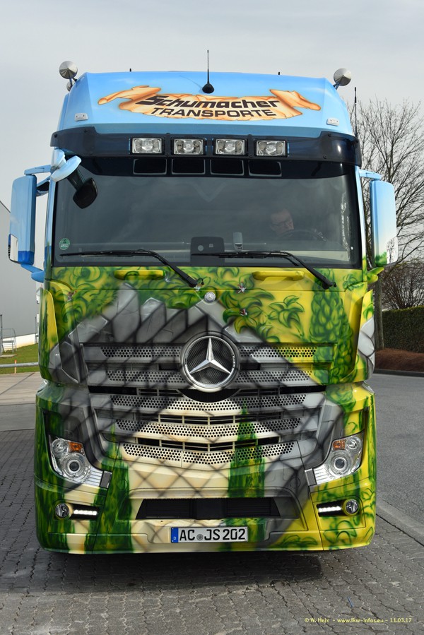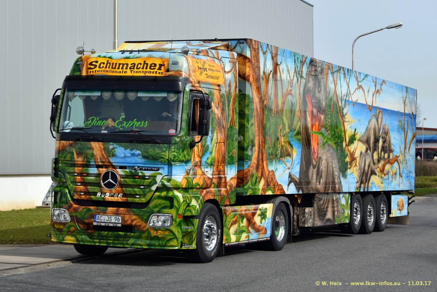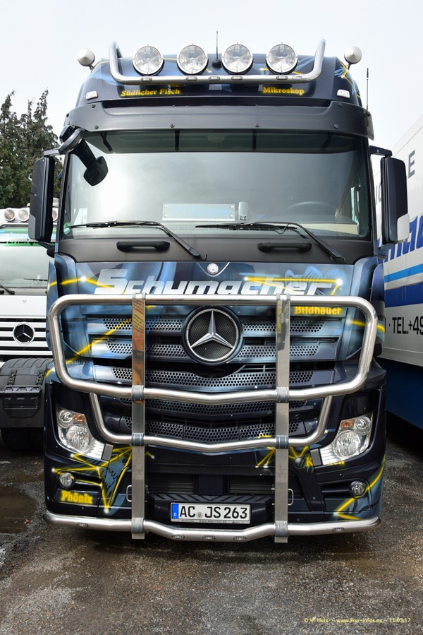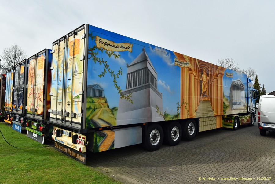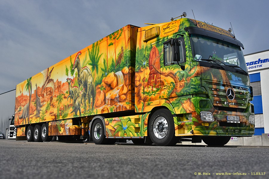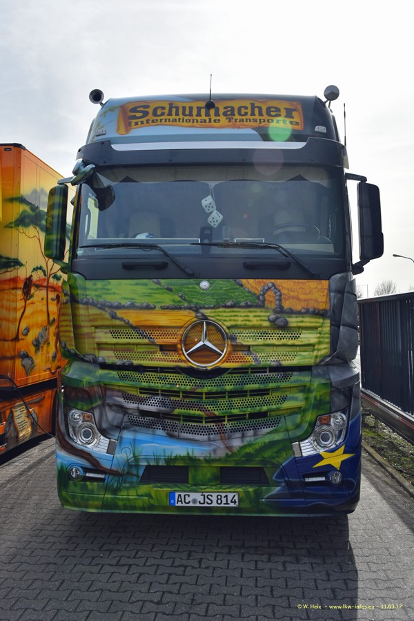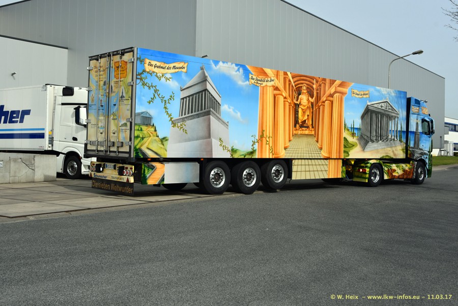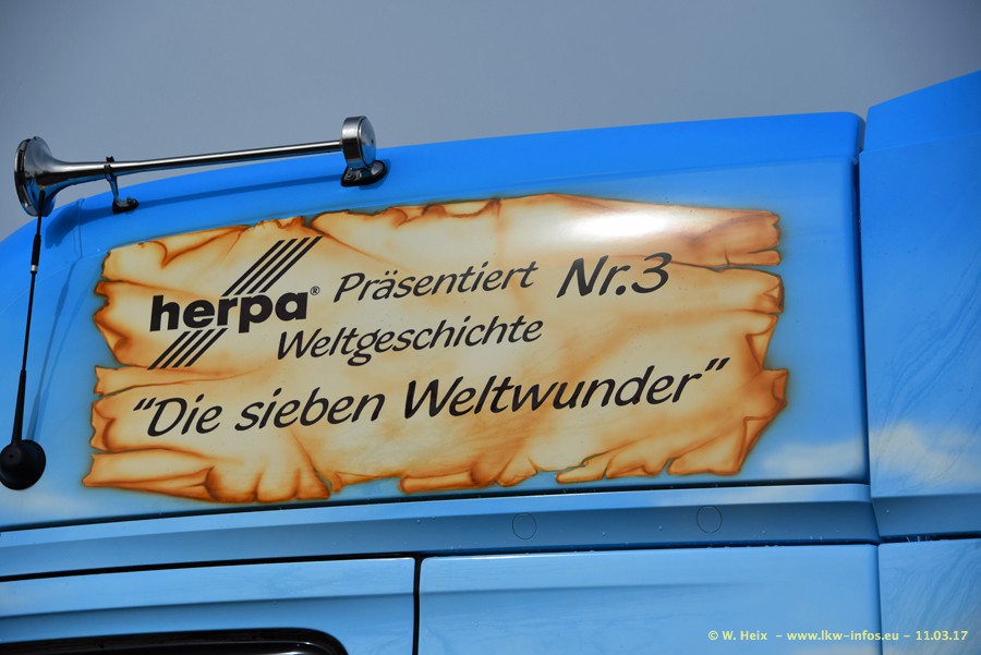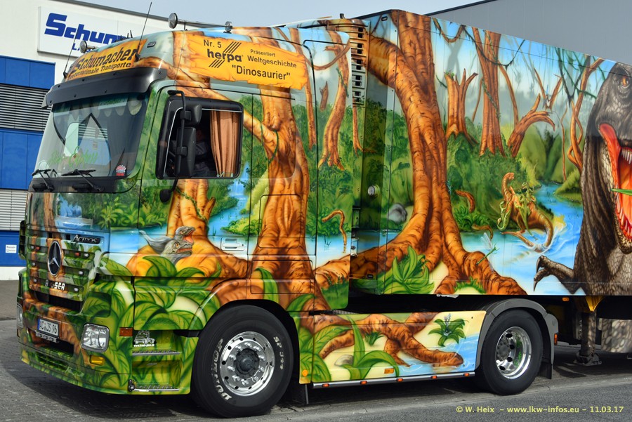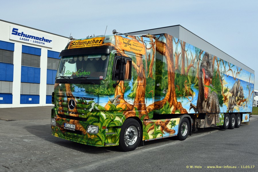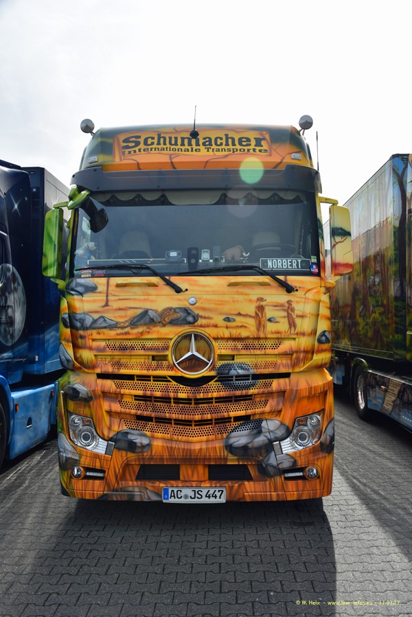 Ich war zwar erst vor fünf Wochen bei Schumacher, aber es gab einen guten Grund, die Firma direkt nochmal zu besuchen. Denn erstens war diesmal das Wetter viel schöner und der Herpa Showtruck Nr. 3 "Die sieben Weltwunder" hat vor knapp zwei Wochen eine neue Zugmaschine bekommen. Der alte DAF XF 105 wurde durch einen Mercedes-Benz Actros 4 ersetzt und auch der Auflieger wurde beim Airbrusher Rosner überarbeitet. Zudem ergab sich für mich die Möglichkeit, einige der Showtrucks in Form eines kleinen Fotoshootings außerhalb vom Firmengelände vor dem Kühllager (eine Straße weiter) von Schumacher zu fotografieren. Leider war das aus zeitlichen und organisatorischen Gründen nicht mit allen Showtrucks möglich. Ich versuche demnächst, auch die anderen Showtrucks nochmal in dieser Form zu fotografieren.
