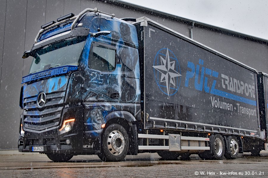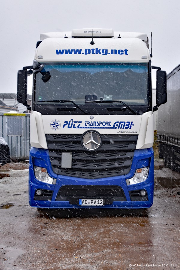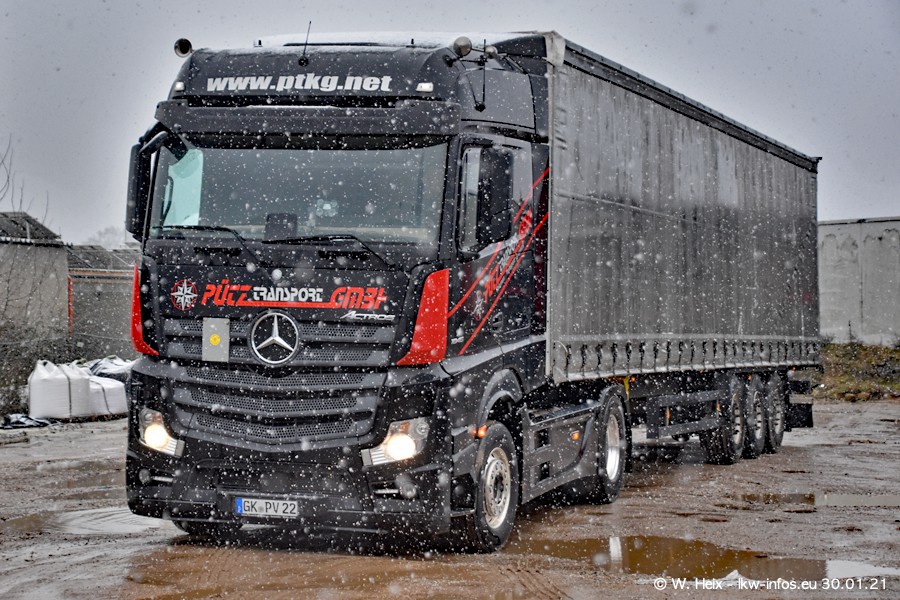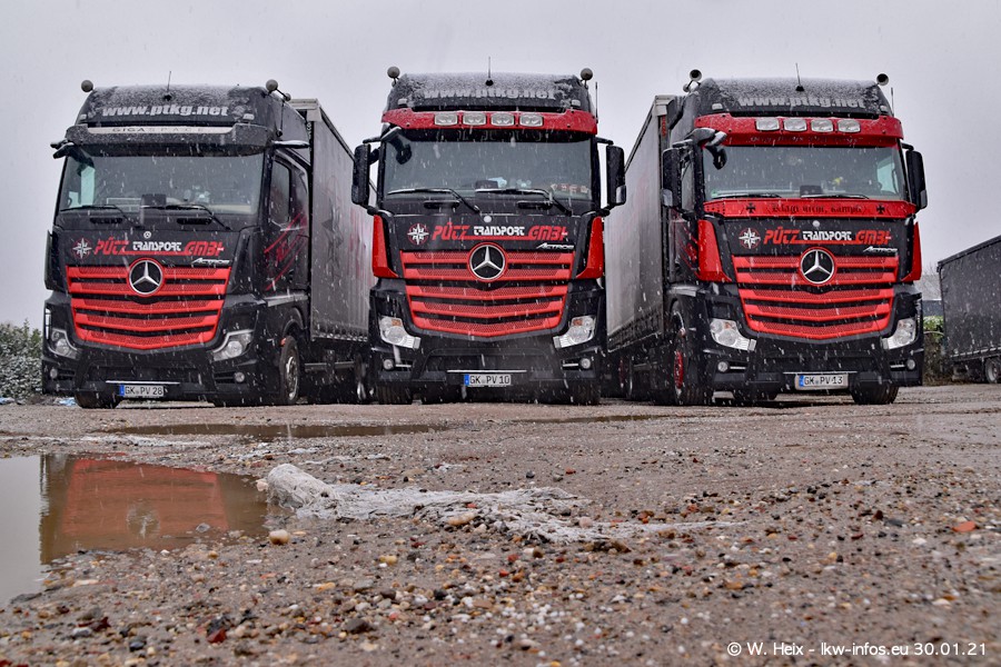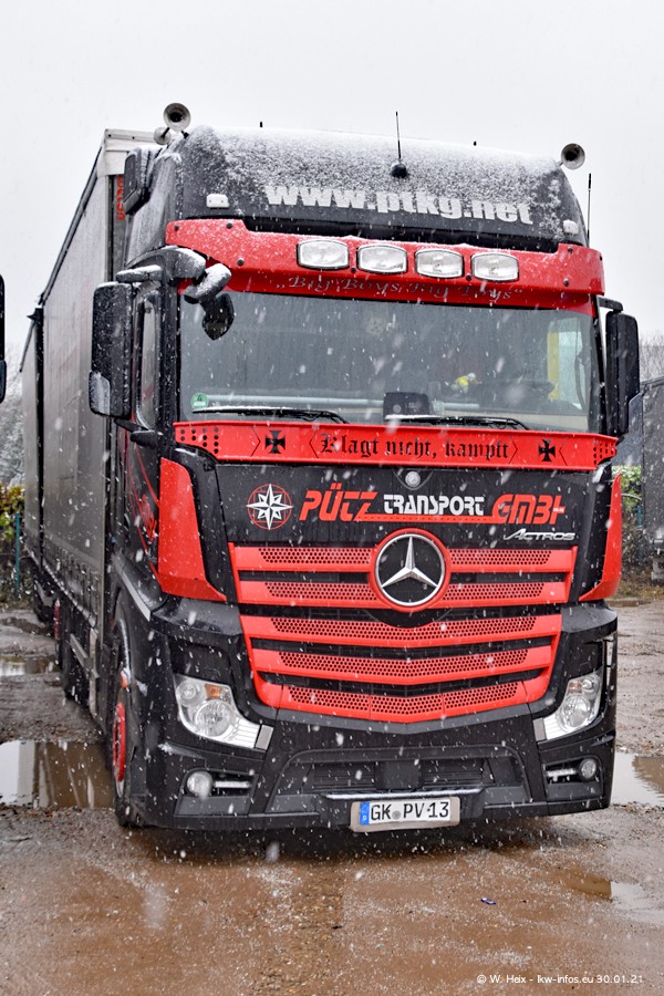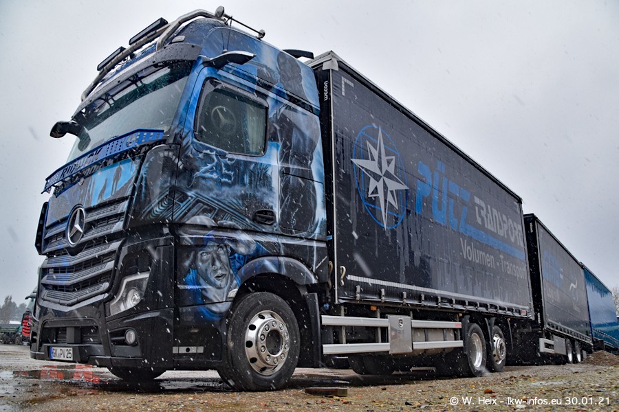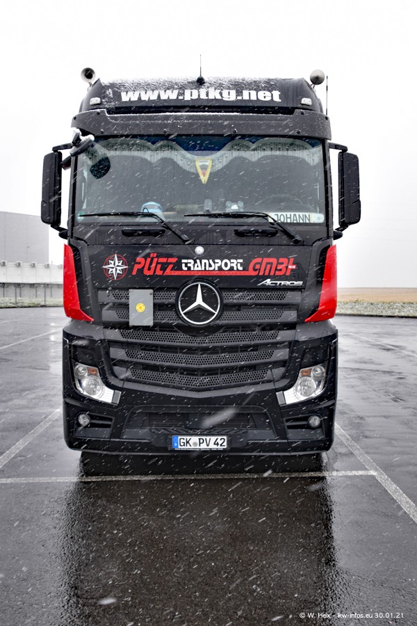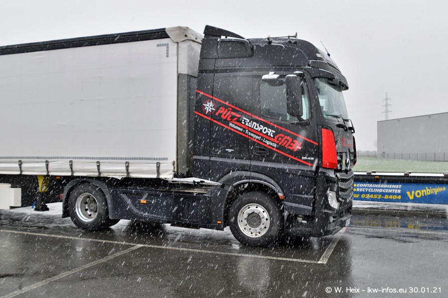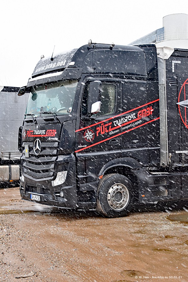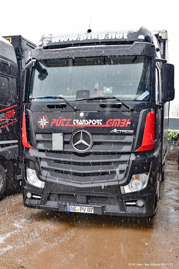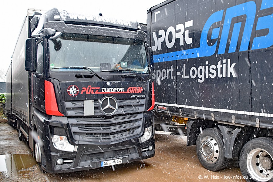 Dies ist mein erster Besuch bei der Firma Pütz in Übach-Palenberg (bei Aachen). Durch eine Reportage in der Zeitschrift "Fernfahrer" in der aktuellen Ausgabe 02/2021 wurde ich in dieser Woche auf die Firma aufmerksam. Denn zum 25-jährigen Firmenjubiläum hat man sich einen richtigen Showtruck/Supertruck gegönnt. Der neue Mercedes-Benz New Actros 4 bzw. Actros 5 (jeder nennt die Baureihe anders) wurde am Faherhaus aufwändig mit Airbrush-Motiven gestaltet. Insgesamt besteht der Fuhrpark aktuell aus 17 LKW. Bis auf einen DAF XF Euro 6 sind alle LKW von Mercedes-Benz. Leider hat mich das Wetter unangenehm überrascht mit einem Wintereinbruch mit Schneefall bei 0°C. Trotzdem habe ich die hier gezeigten Bilder gemacht und in den nächsten Monaten werde ich dann nochmal neue Bilder bei Sonnenschein machen .....