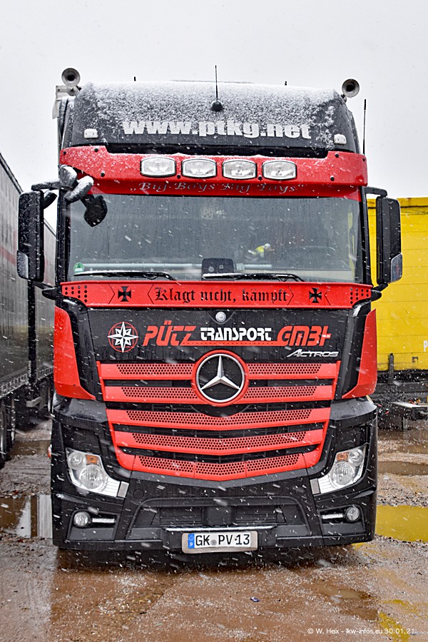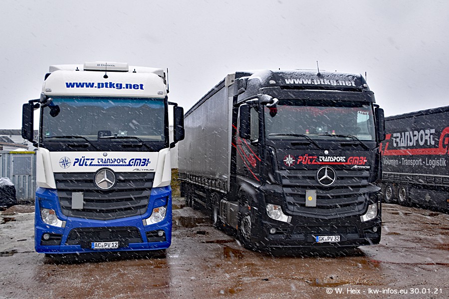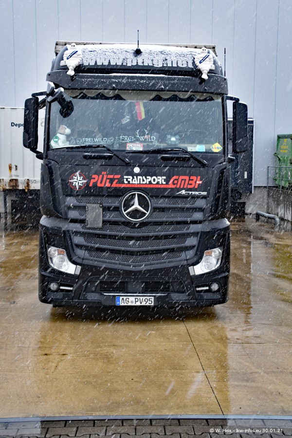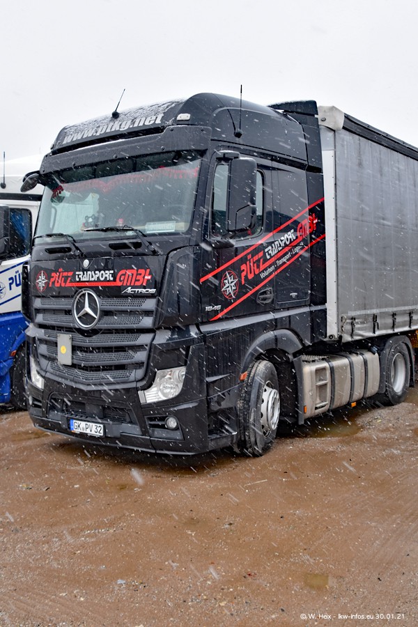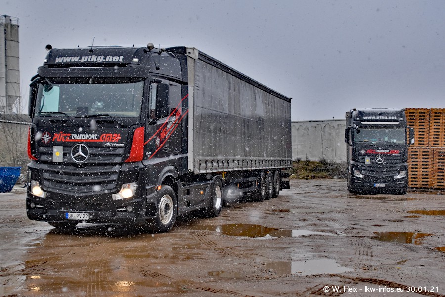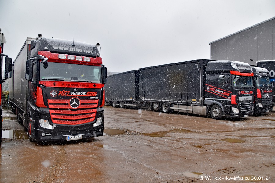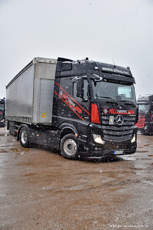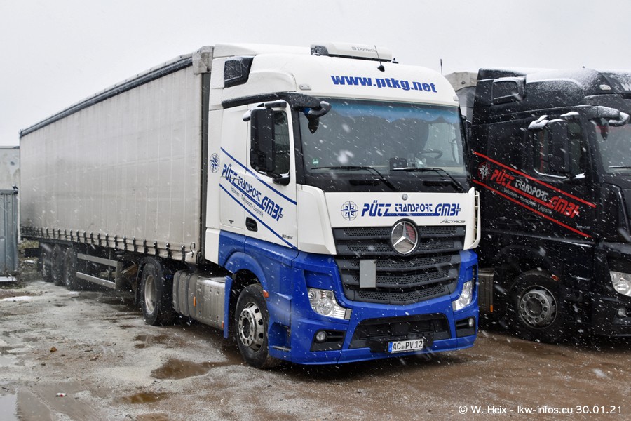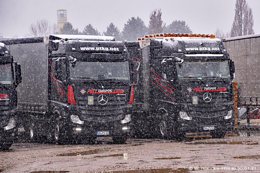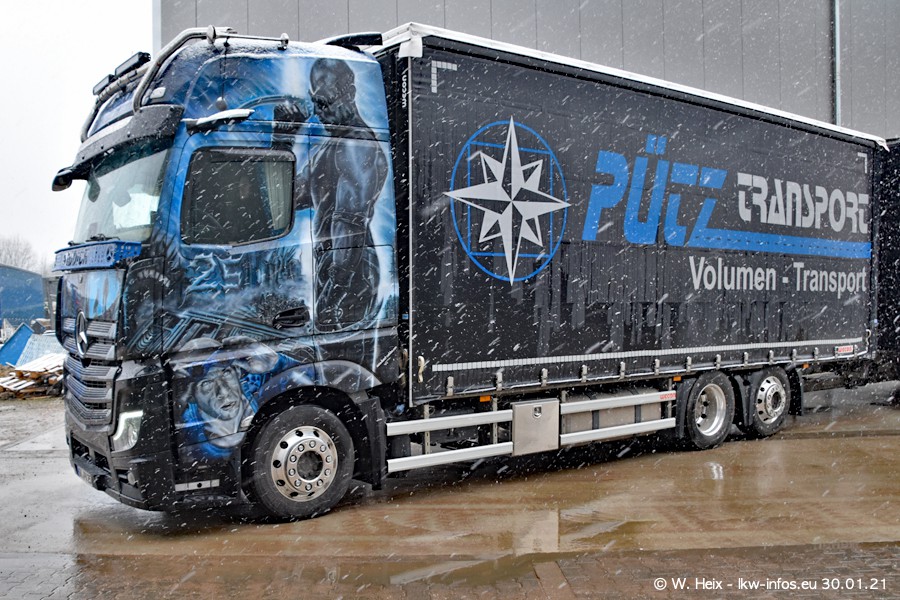 Dies ist mein erster Besuch bei der Firma Pütz in Übach-Palenberg (bei Aachen). Durch eine Reportage in der Zeitschrift "Fernfahrer" in der aktuellen Ausgabe 02/2021 wurde ich in dieser Woche auf die Firma aufmerksam. Denn zum 25-jährigen Firmenjubiläum hat man sich einen richtigen Showtruck/Supertruck gegönnt. Der neue Mercedes-Benz New Actros 4 bzw. Actros 5 (jeder nennt die Baureihe anders) wurde am Faherhaus aufwändig mit Airbrush-Motiven gestaltet. Insgesamt besteht der Fuhrpark aktuell aus 17 LKW. Bis auf einen DAF XF Euro 6 sind alle LKW von Mercedes-Benz. Leider hat mich das Wetter unangenehm überrascht mit einem Wintereinbruch mit Schneefall bei 0°C. Trotzdem habe ich die hier gezeigten Bilder gemacht und in den nächsten Monaten werde ich dann nochmal neue Bilder bei Sonnenschein machen .....