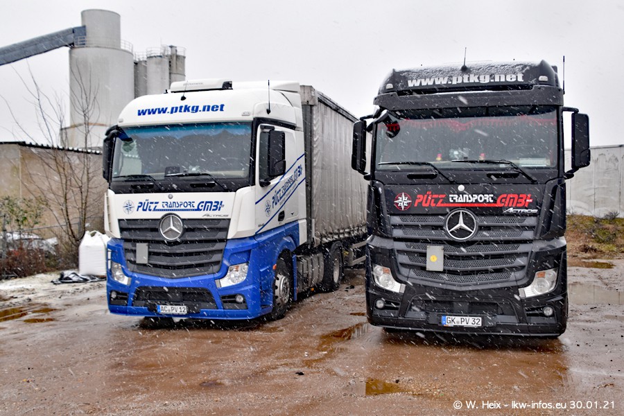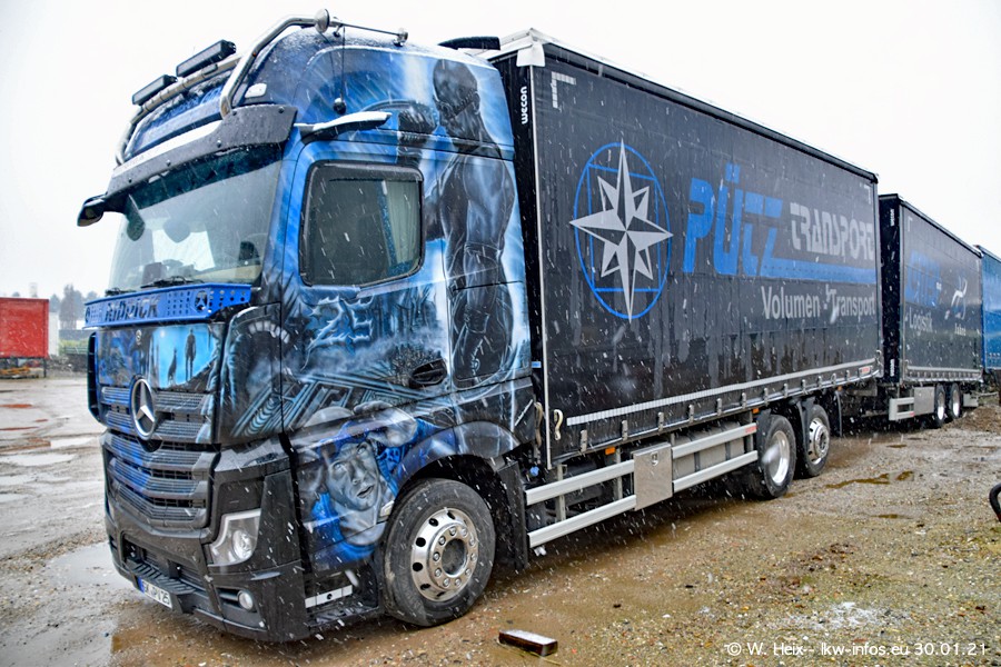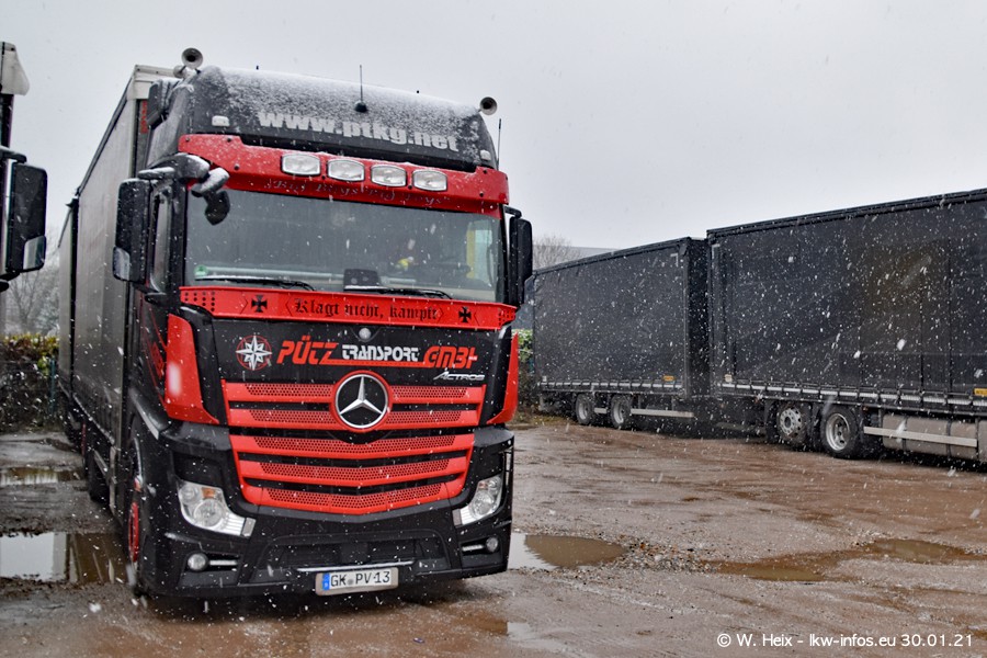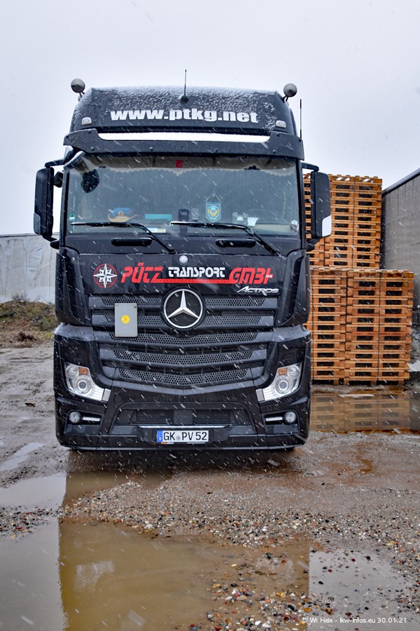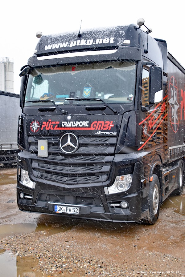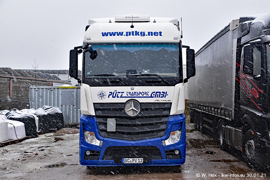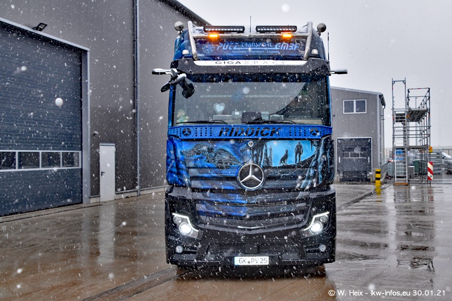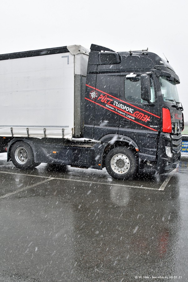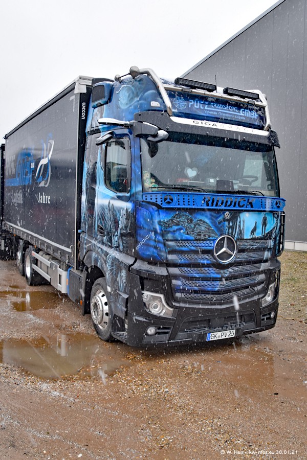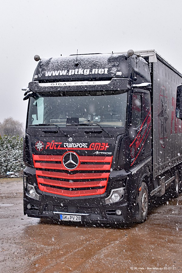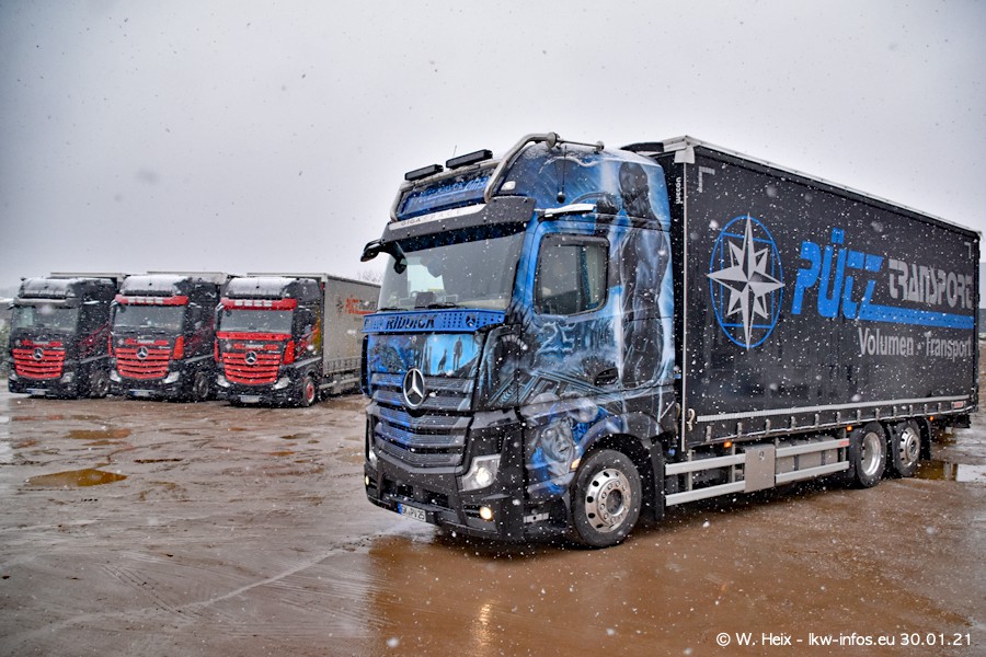 Dies ist mein erster Besuch bei der Firma Pütz in Übach-Palenberg (bei Aachen). Durch eine Reportage in der Zeitschrift "Fernfahrer" in der aktuellen Ausgabe 02/2021 wurde ich in dieser Woche auf die Firma aufmerksam. Denn zum 25-jährigen Firmenjubiläum hat man sich einen richtigen Showtruck/Supertruck gegönnt. Der neue Mercedes-Benz New Actros 4 bzw. Actros 5 (jeder nennt die Baureihe anders) wurde am Faherhaus aufwändig mit Airbrush-Motiven gestaltet. Insgesamt besteht der Fuhrpark aktuell aus 17 LKW. Bis auf einen DAF XF Euro 6 sind alle LKW von Mercedes-Benz. Leider hat mich das Wetter unangenehm überrascht mit einem Wintereinbruch mit Schneefall bei 0°C. Trotzdem habe ich die hier gezeigten Bilder gemacht und in den nächsten Monaten werde ich dann nochmal neue Bilder bei Sonnenschein machen .....