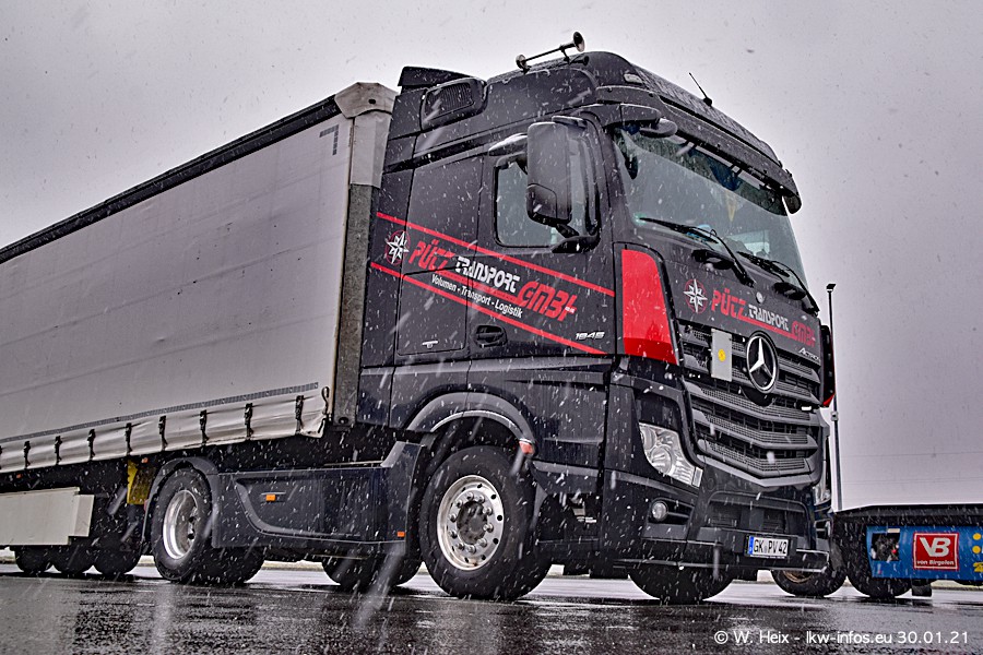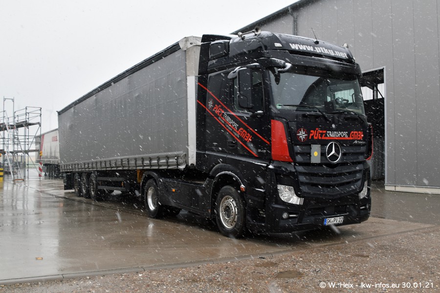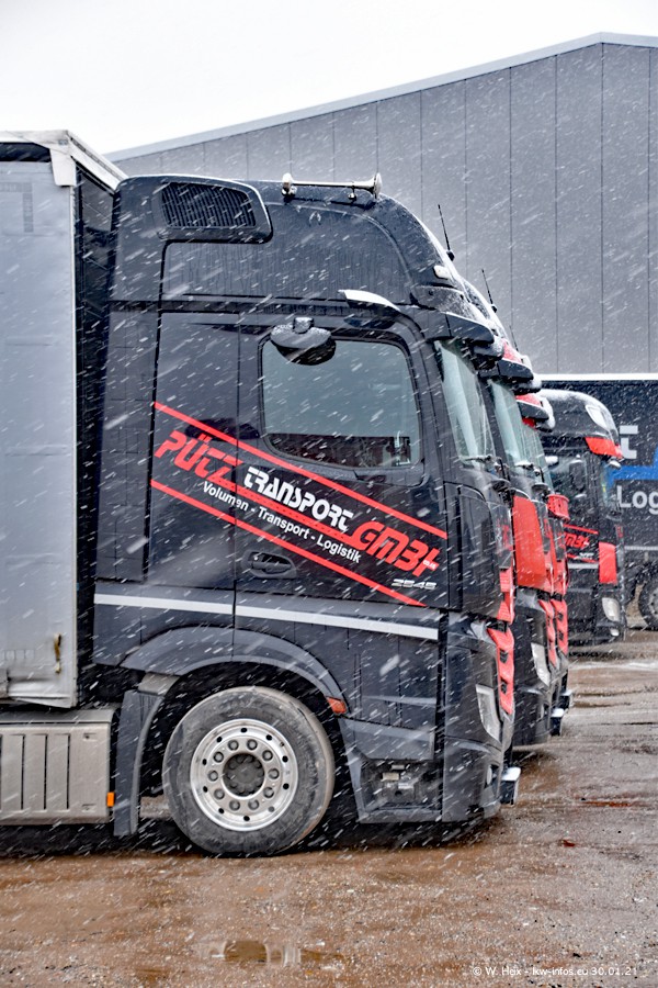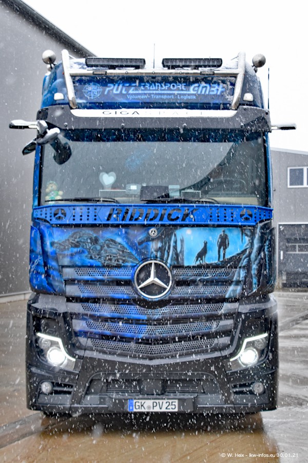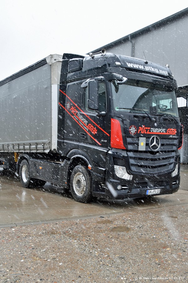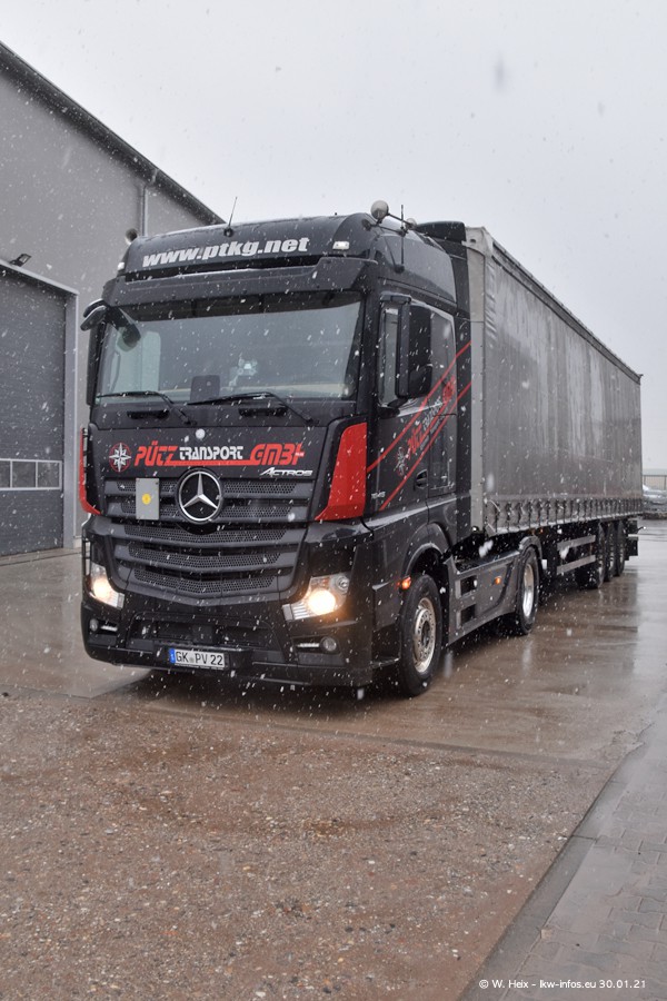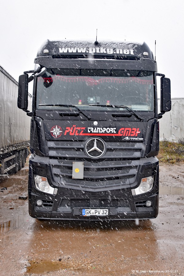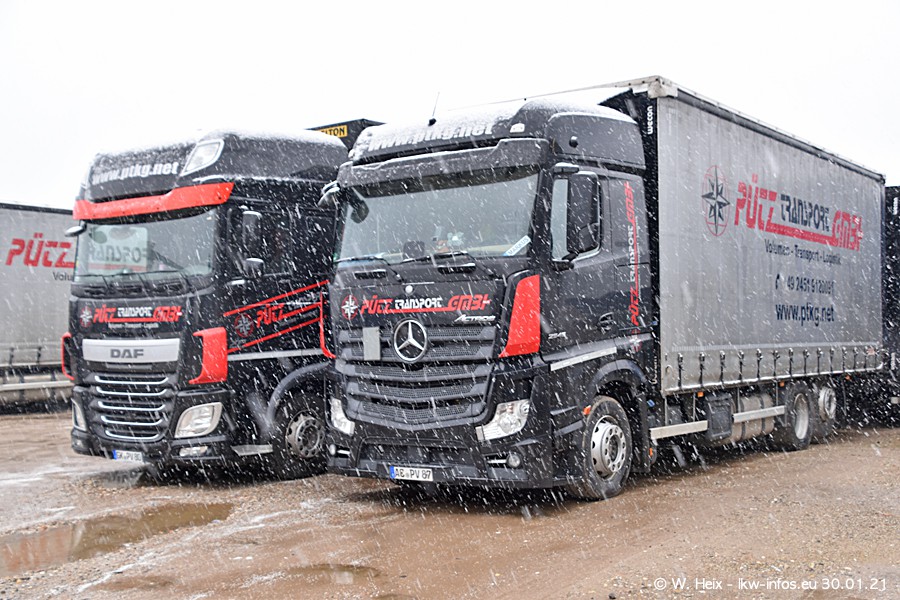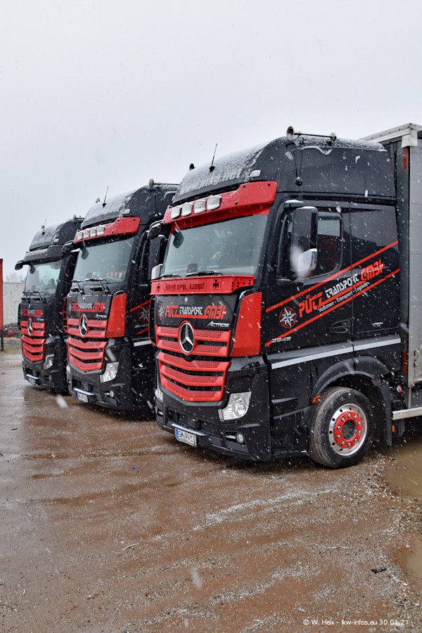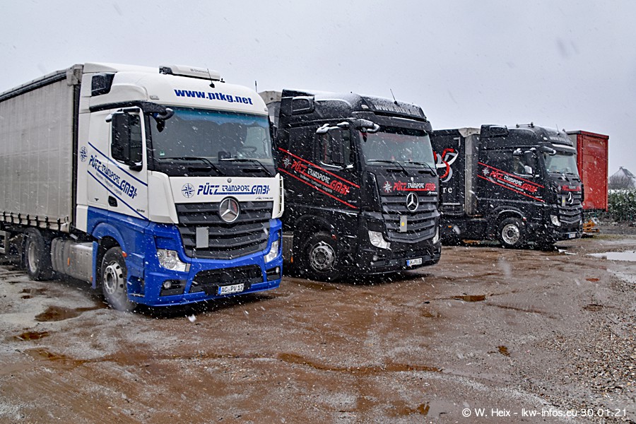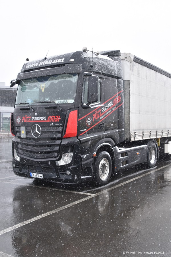 Dies ist mein erster Besuch bei der Firma Pütz in Übach-Palenberg (bei Aachen). Durch eine Reportage in der Zeitschrift "Fernfahrer" in der aktuellen Ausgabe 02/2021 wurde ich in dieser Woche auf die Firma aufmerksam. Denn zum 25-jährigen Firmenjubiläum hat man sich einen richtigen Showtruck/Supertruck gegönnt. Der neue Mercedes-Benz New Actros 4 bzw. Actros 5 (jeder nennt die Baureihe anders) wurde am Faherhaus aufwändig mit Airbrush-Motiven gestaltet. Insgesamt besteht der Fuhrpark aktuell aus 17 LKW. Bis auf einen DAF XF Euro 6 sind alle LKW von Mercedes-Benz. Leider hat mich das Wetter unangenehm überrascht mit einem Wintereinbruch mit Schneefall bei 0°C. Trotzdem habe ich die hier gezeigten Bilder gemacht und in den nächsten Monaten werde ich dann nochmal neue Bilder bei Sonnenschein machen .....
