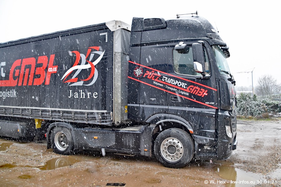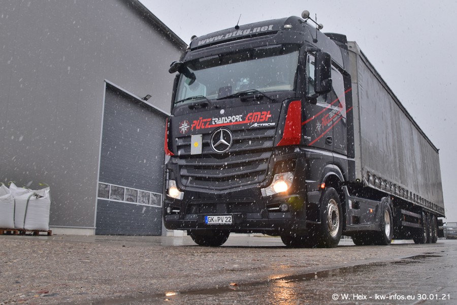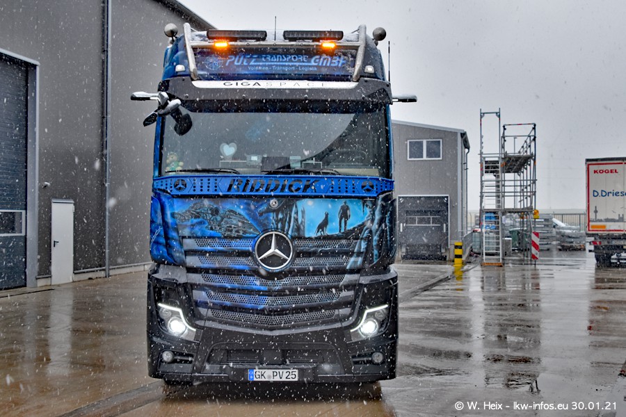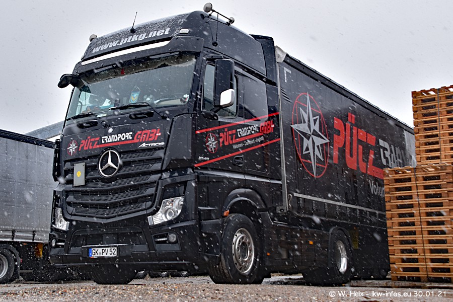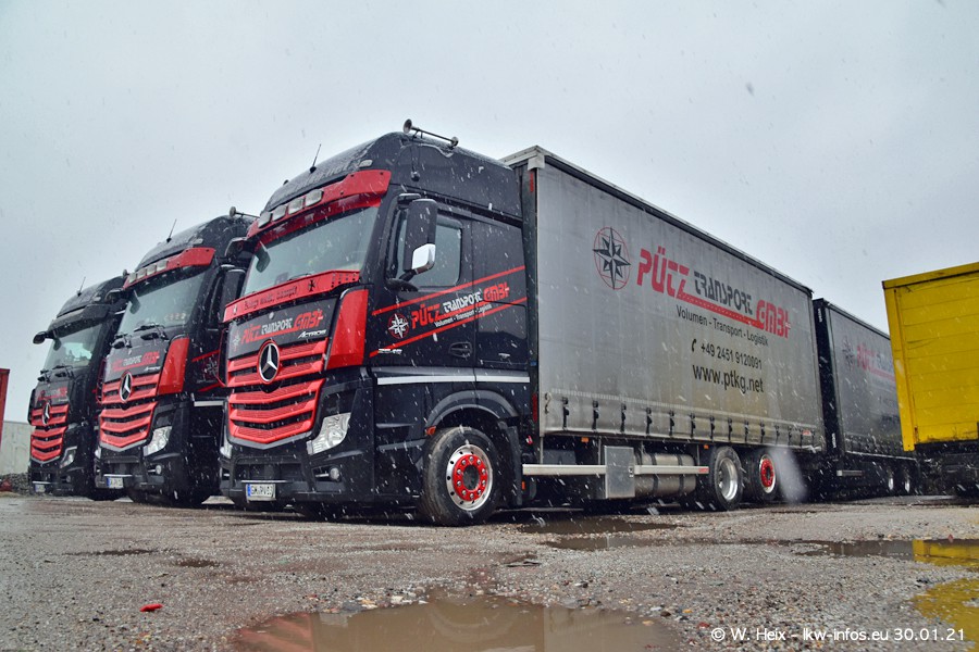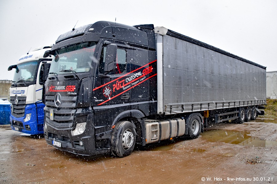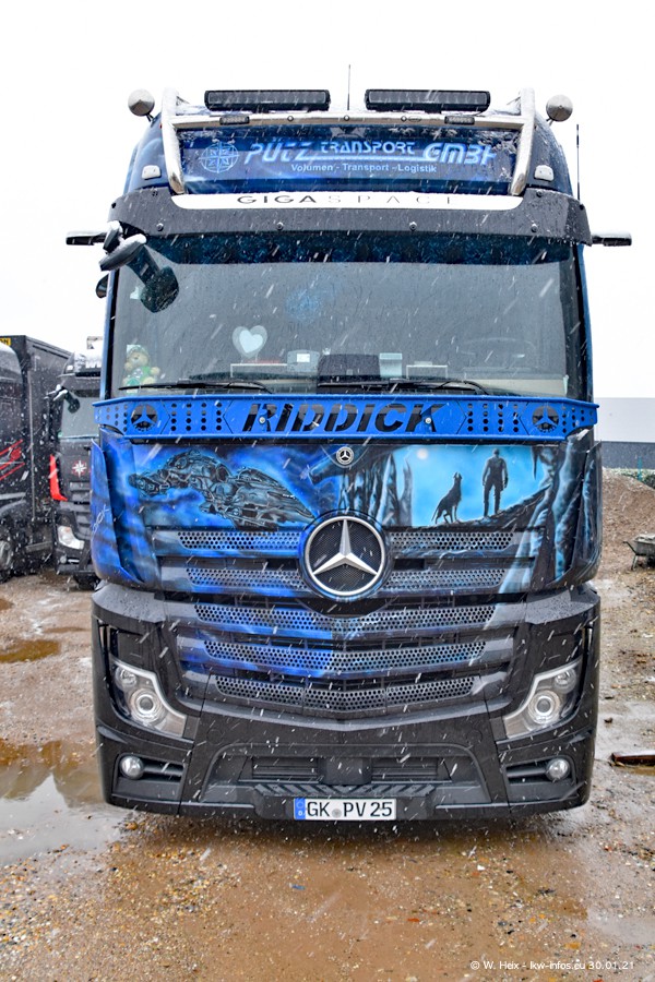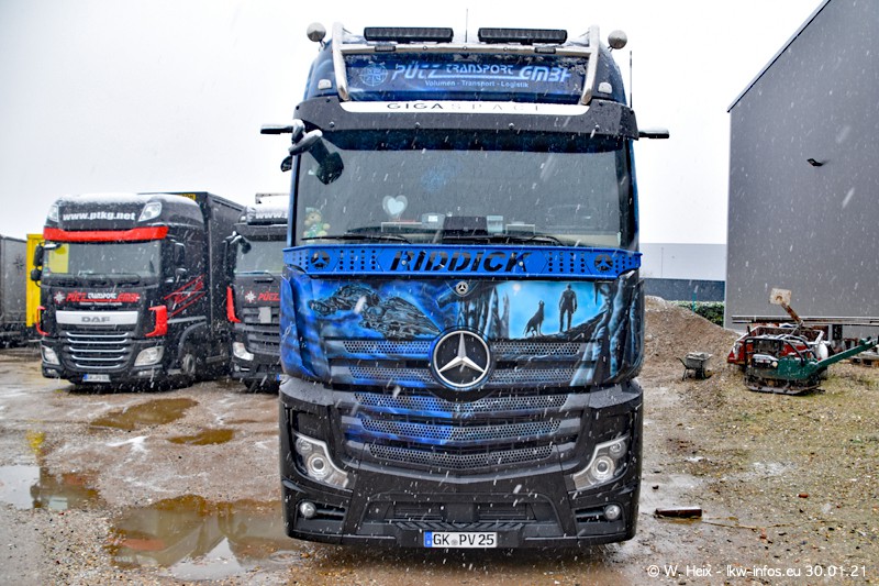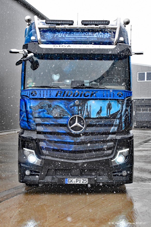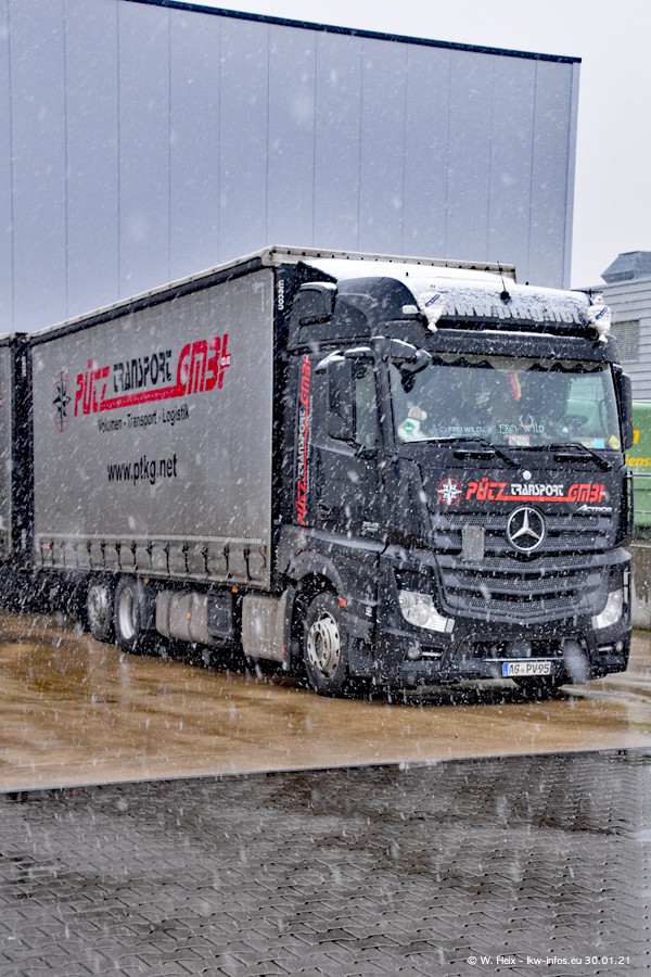 Dies ist mein erster Besuch bei der Firma Pütz in Übach-Palenberg (bei Aachen). Durch eine Reportage in der Zeitschrift "Fernfahrer" in der aktuellen Ausgabe 02/2021 wurde ich in dieser Woche auf die Firma aufmerksam. Denn zum 25-jährigen Firmenjubiläum hat man sich einen richtigen Showtruck/Supertruck gegönnt. Der neue Mercedes-Benz New Actros 4 bzw. Actros 5 (jeder nennt die Baureihe anders) wurde am Faherhaus aufwändig mit Airbrush-Motiven gestaltet. Insgesamt besteht der Fuhrpark aktuell aus 17 LKW. Bis auf einen DAF XF Euro 6 sind alle LKW von Mercedes-Benz. Leider hat mich das Wetter unangenehm überrascht mit einem Wintereinbruch mit Schneefall bei 0°C. Trotzdem habe ich die hier gezeigten Bilder gemacht und in den nächsten Monaten werde ich dann nochmal neue Bilder bei Sonnenschein machen .....