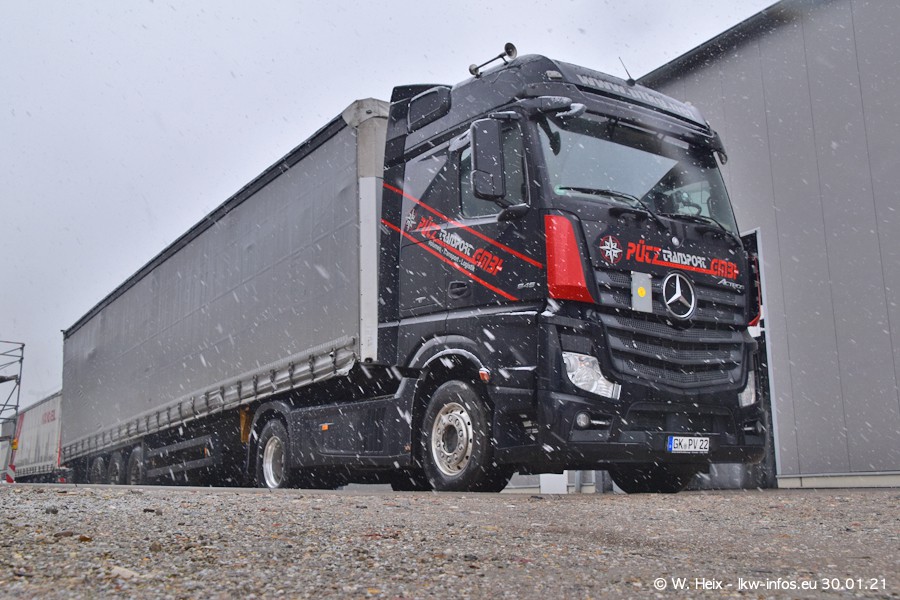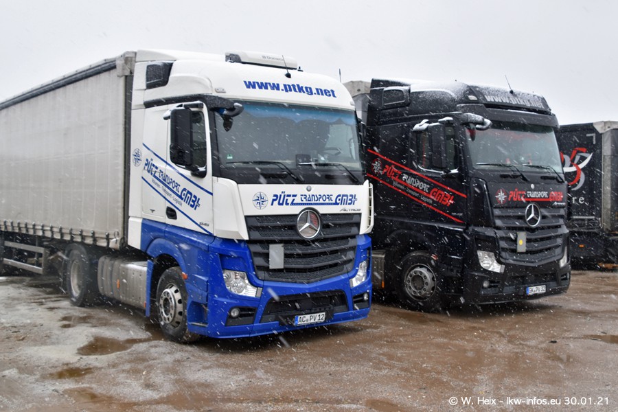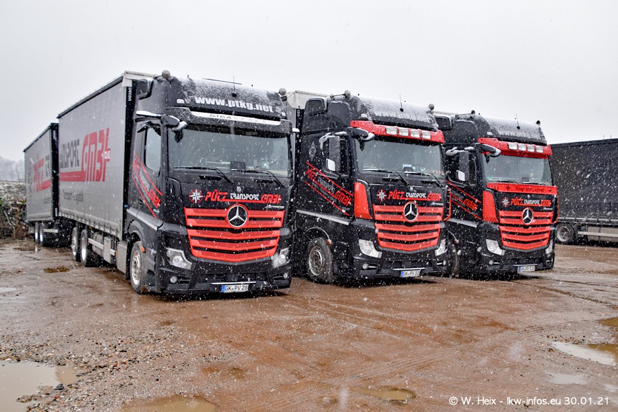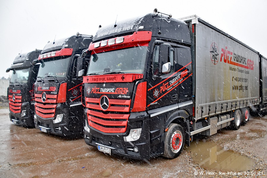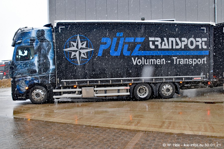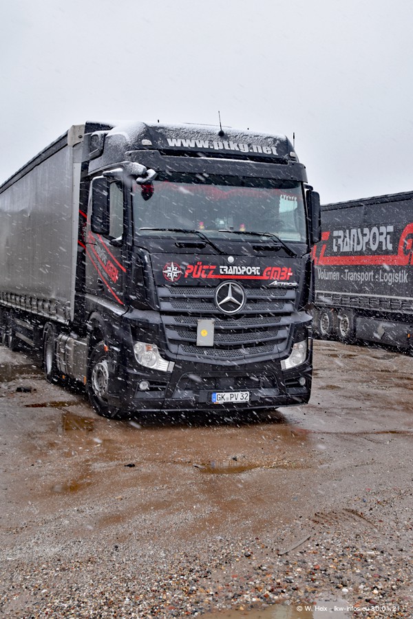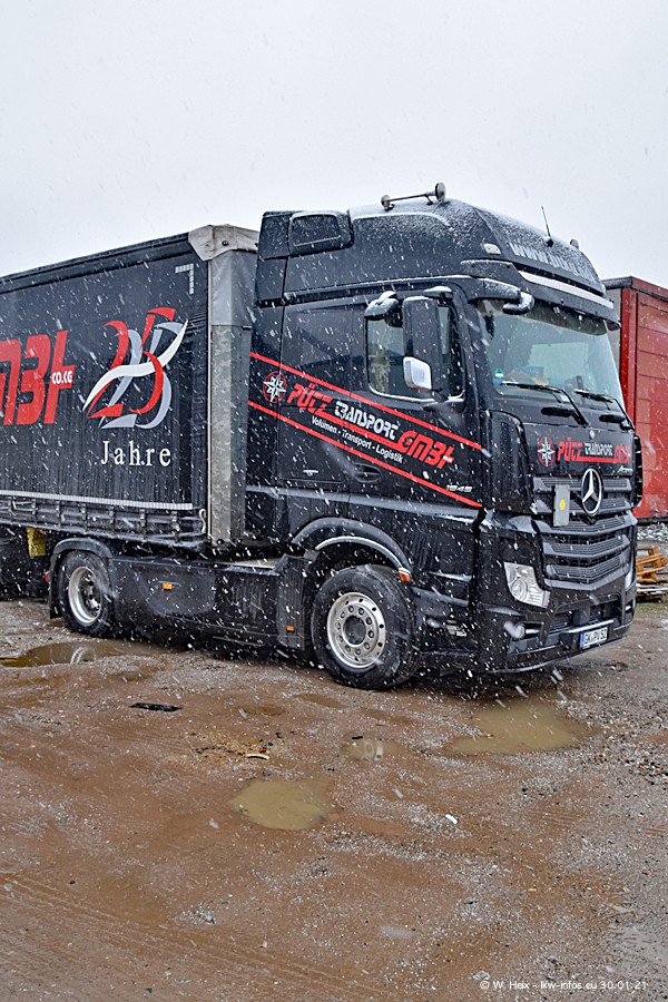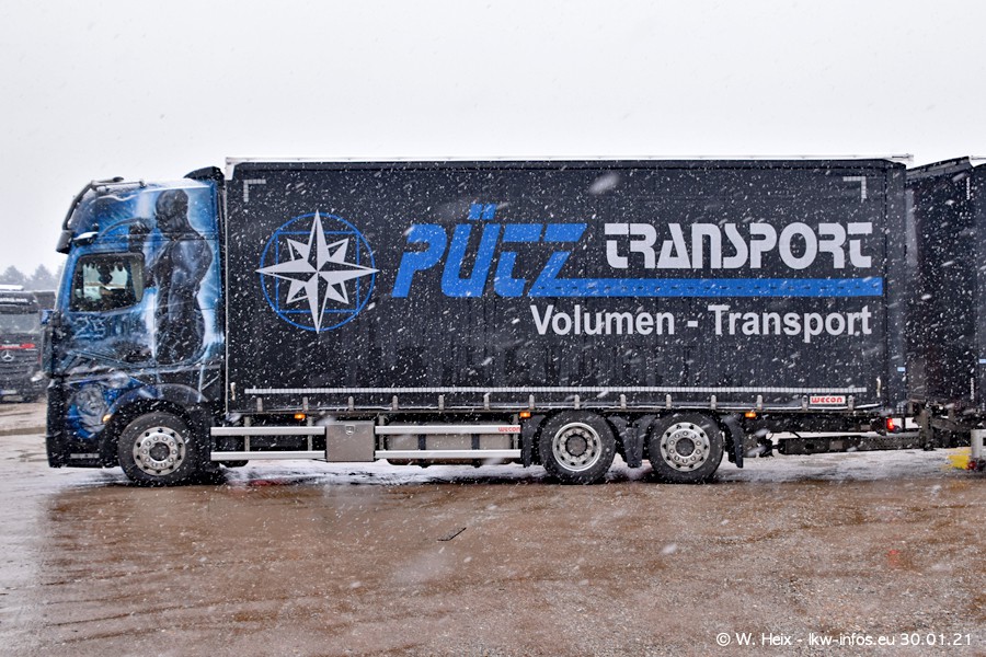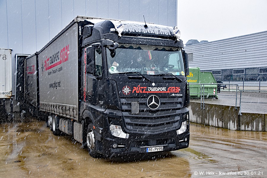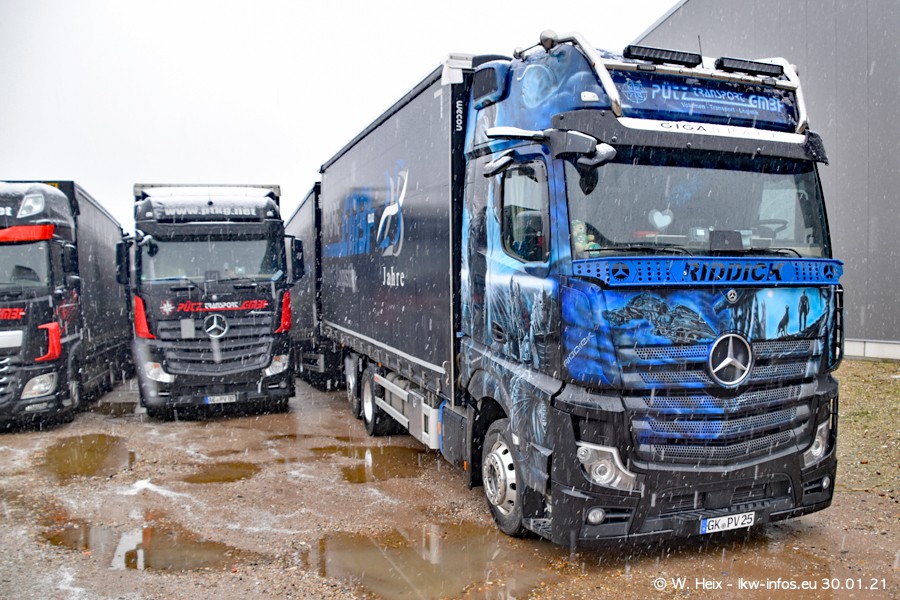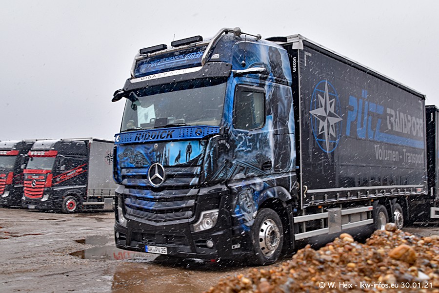 Dies ist mein erster Besuch bei der Firma Pütz in Übach-Palenberg (bei Aachen). Durch eine Reportage in der Zeitschrift "Fernfahrer" in der aktuellen Ausgabe 02/2021 wurde ich in dieser Woche auf die Firma aufmerksam. Denn zum 25-jährigen Firmenjubiläum hat man sich einen richtigen Showtruck/Supertruck gegönnt. Der neue Mercedes-Benz New Actros 4 bzw. Actros 5 (jeder nennt die Baureihe anders) wurde am Faherhaus aufwändig mit Airbrush-Motiven gestaltet. Insgesamt besteht der Fuhrpark aktuell aus 17 LKW. Bis auf einen DAF XF Euro 6 sind alle LKW von Mercedes-Benz. Leider hat mich das Wetter unangenehm überrascht mit einem Wintereinbruch mit Schneefall bei 0°C. Trotzdem habe ich die hier gezeigten Bilder gemacht und in den nächsten Monaten werde ich dann nochmal neue Bilder bei Sonnenschein machen .....