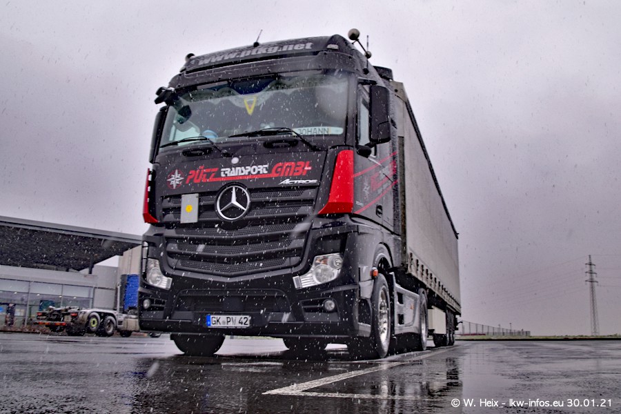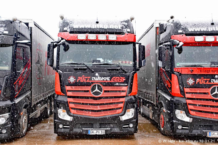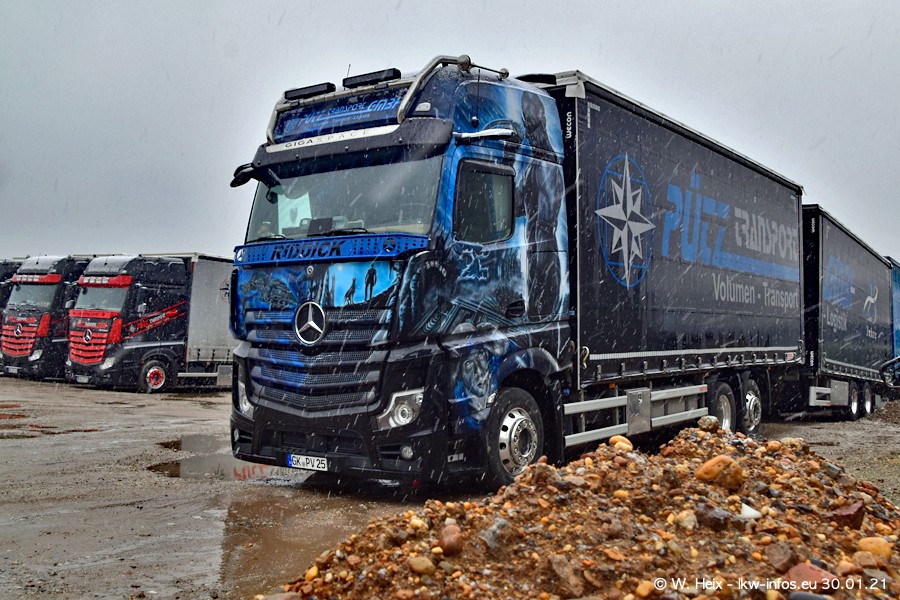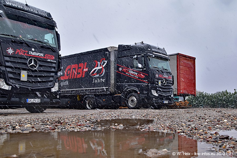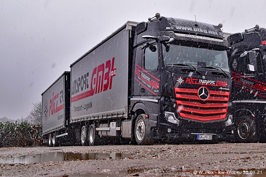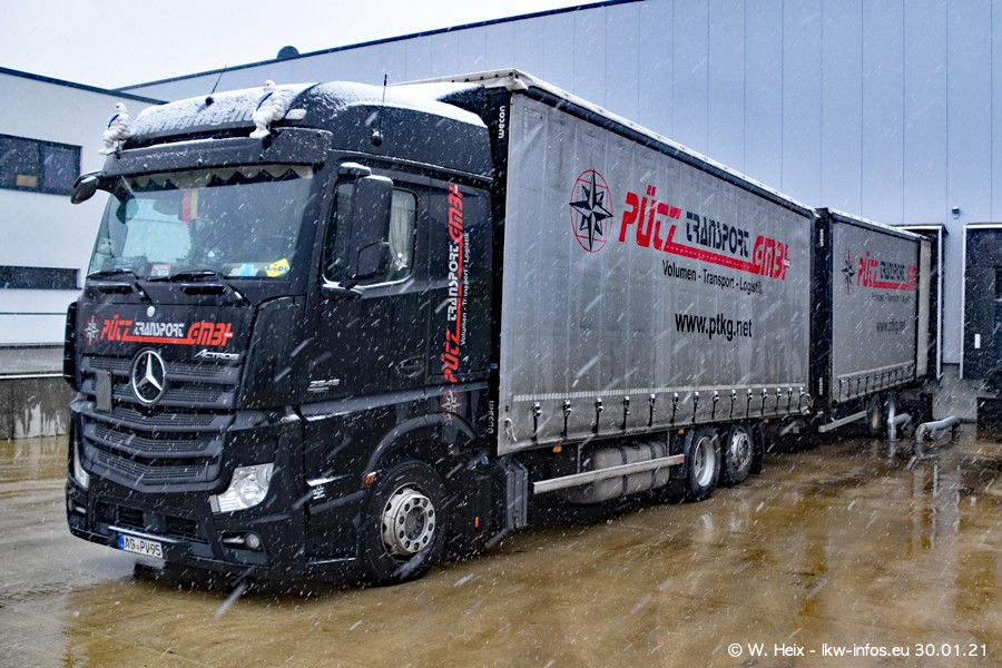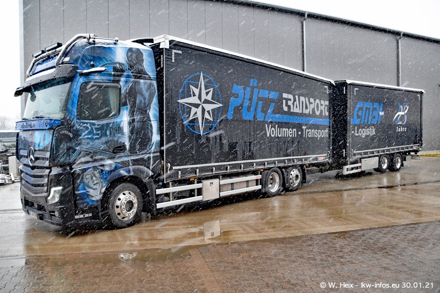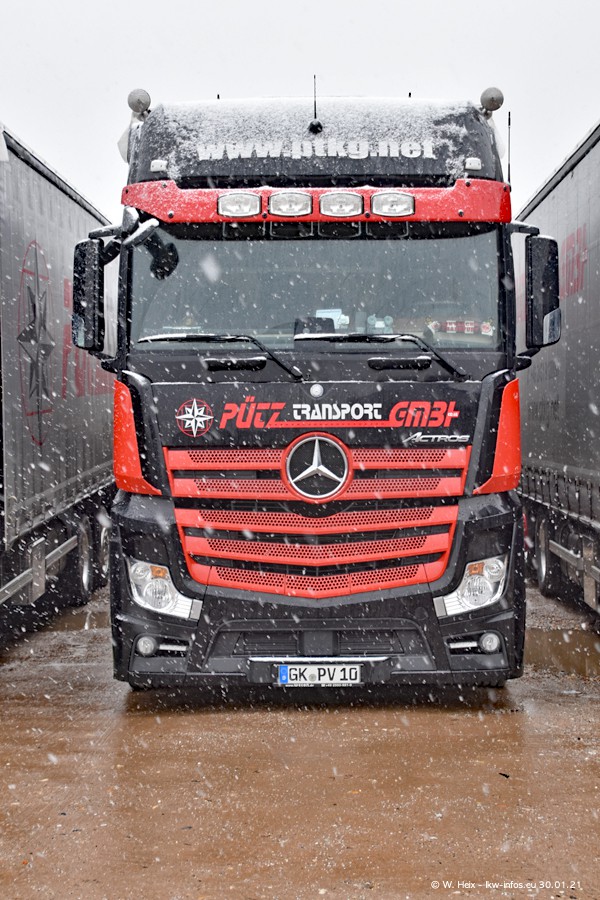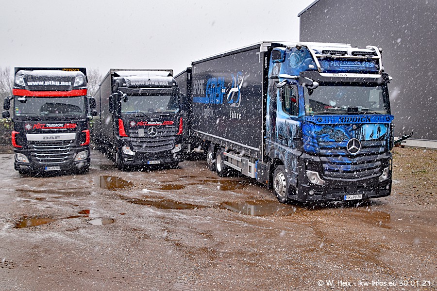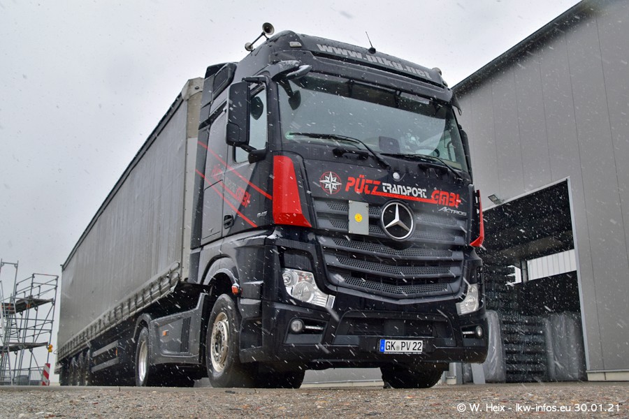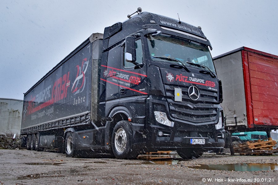 Dies ist mein erster Besuch bei der Firma Pütz in Übach-Palenberg (bei Aachen). Durch eine Reportage in der Zeitschrift "Fernfahrer" in der aktuellen Ausgabe 02/2021 wurde ich in dieser Woche auf die Firma aufmerksam. Denn zum 25-jährigen Firmenjubiläum hat man sich einen richtigen Showtruck/Supertruck gegönnt. Der neue Mercedes-Benz New Actros 4 bzw. Actros 5 (jeder nennt die Baureihe anders) wurde am Faherhaus aufwändig mit Airbrush-Motiven gestaltet. Insgesamt besteht der Fuhrpark aktuell aus 17 LKW. Bis auf einen DAF XF Euro 6 sind alle LKW von Mercedes-Benz. Leider hat mich das Wetter unangenehm überrascht mit einem Wintereinbruch mit Schneefall bei 0°C. Trotzdem habe ich die hier gezeigten Bilder gemacht und in den nächsten Monaten werde ich dann nochmal neue Bilder bei Sonnenschein machen .....