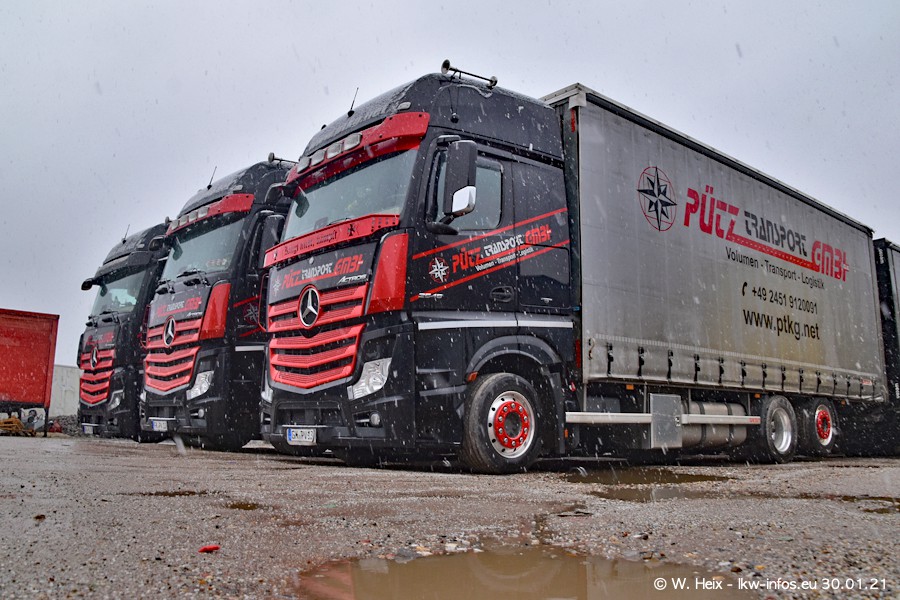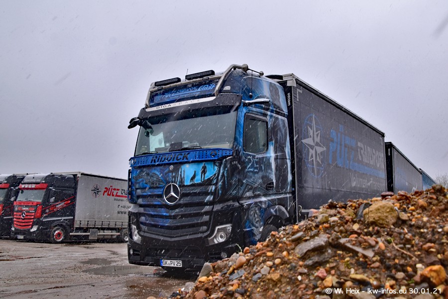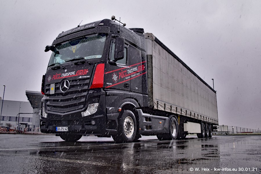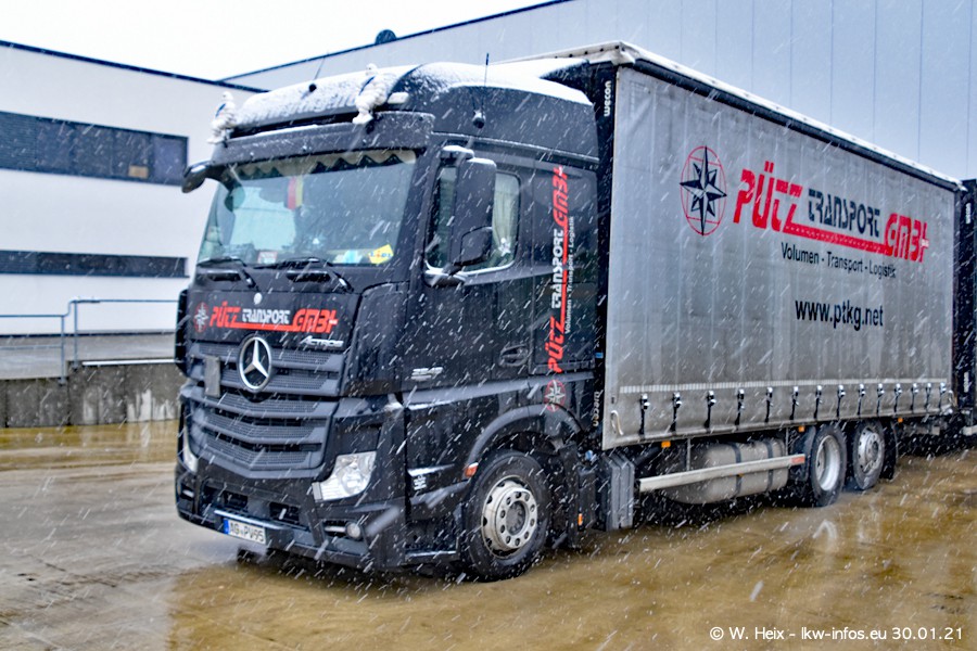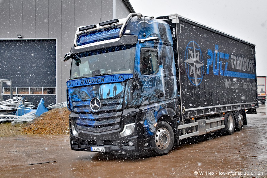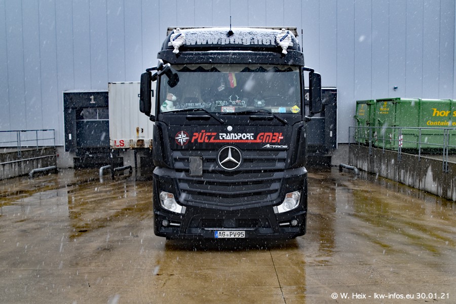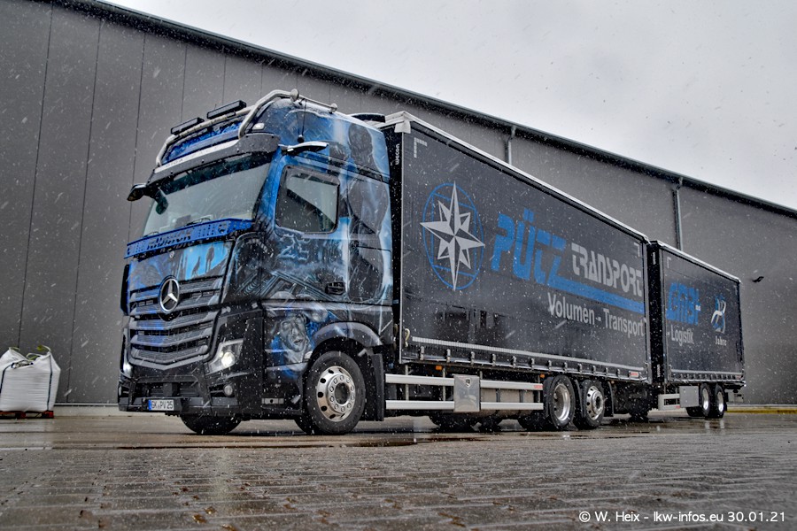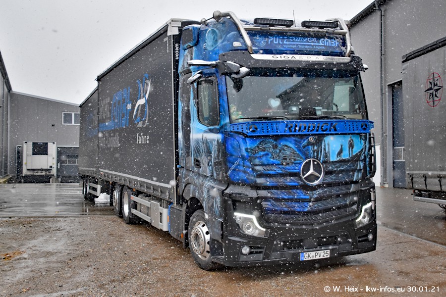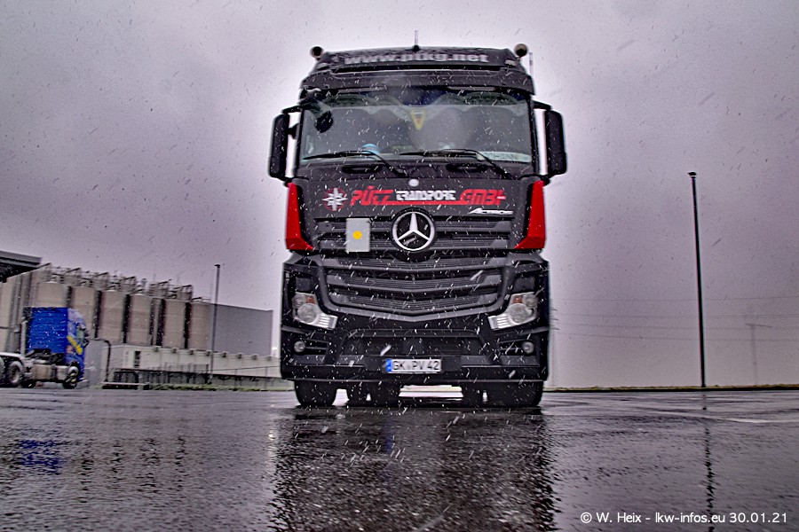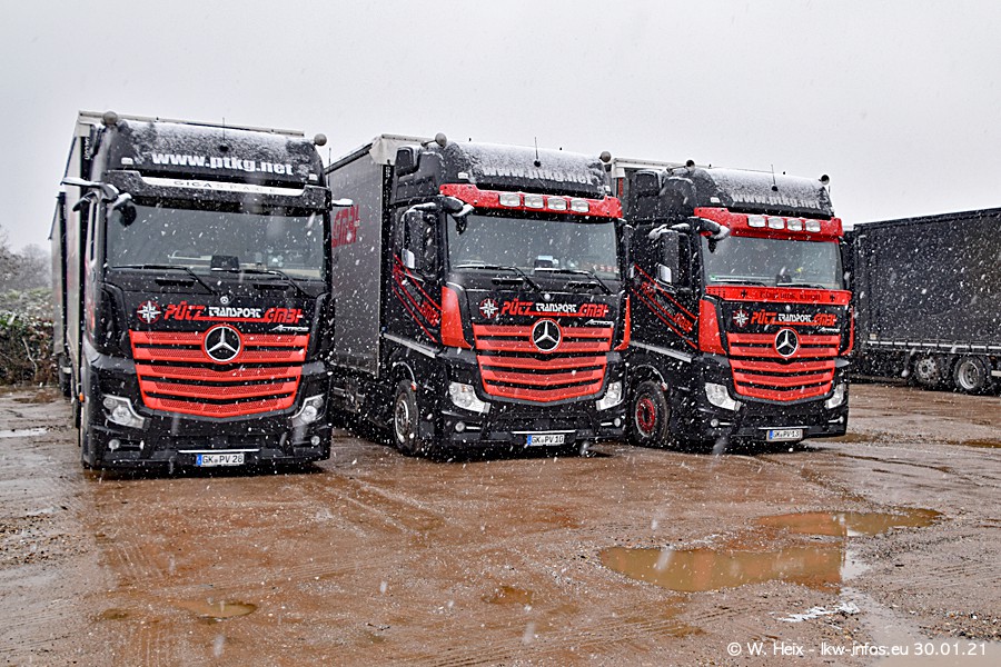 Dies ist mein erster Besuch bei der Firma Pütz in Übach-Palenberg (bei Aachen). Durch eine Reportage in der Zeitschrift "Fernfahrer" in der aktuellen Ausgabe 02/2021 wurde ich in dieser Woche auf die Firma aufmerksam. Denn zum 25-jährigen Firmenjubiläum hat man sich einen richtigen Showtruck/Supertruck gegönnt. Der neue Mercedes-Benz New Actros 4 bzw. Actros 5 (jeder nennt die Baureihe anders) wurde am Faherhaus aufwändig mit Airbrush-Motiven gestaltet. Insgesamt besteht der Fuhrpark aktuell aus 17 LKW. Bis auf einen DAF XF Euro 6 sind alle LKW von Mercedes-Benz. Leider hat mich das Wetter unangenehm überrascht mit einem Wintereinbruch mit Schneefall bei 0°C. Trotzdem habe ich die hier gezeigten Bilder gemacht und in den nächsten Monaten werde ich dann nochmal neue Bilder bei Sonnenschein machen .....