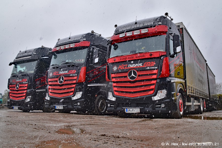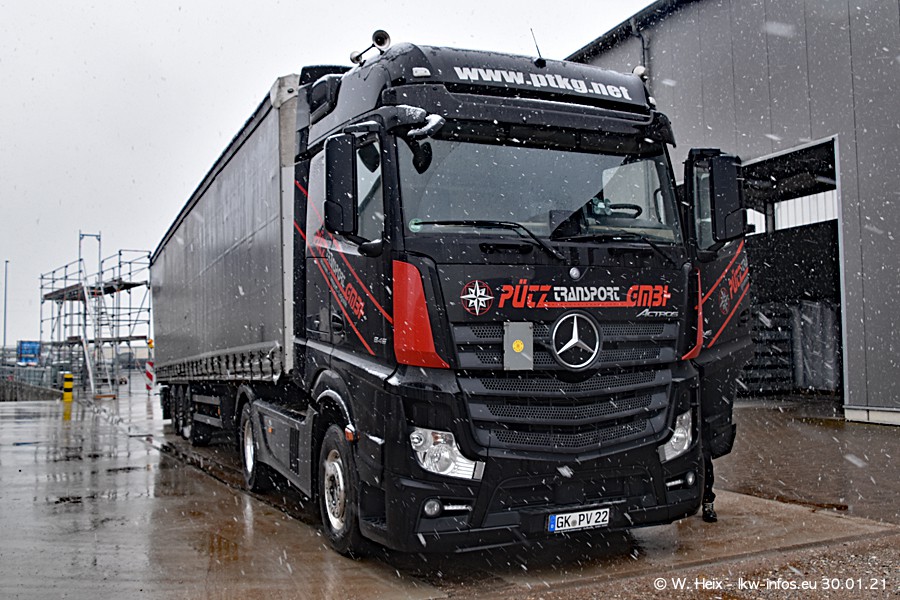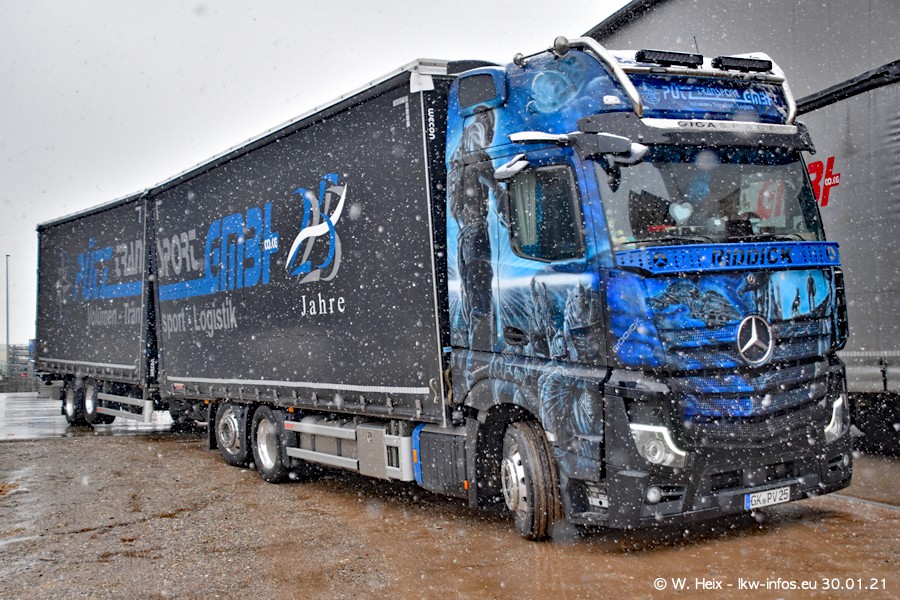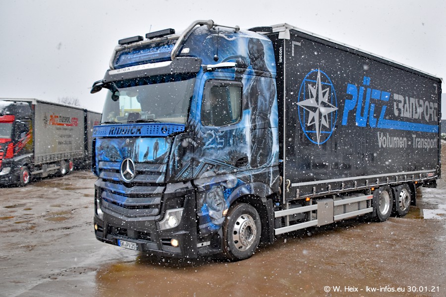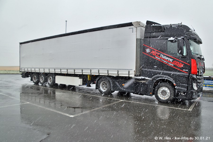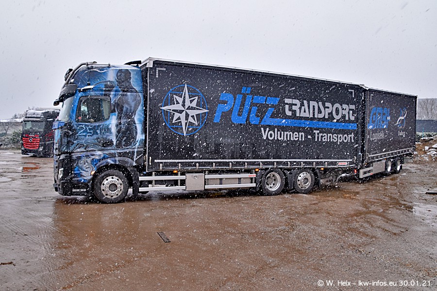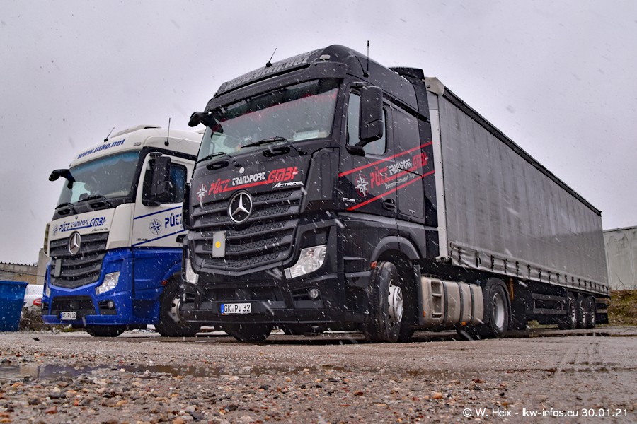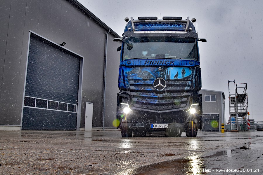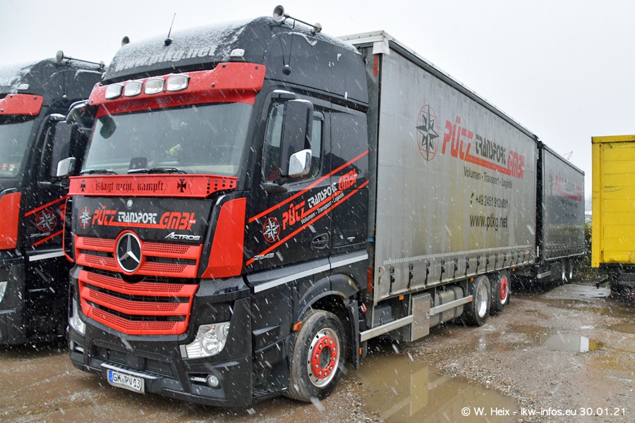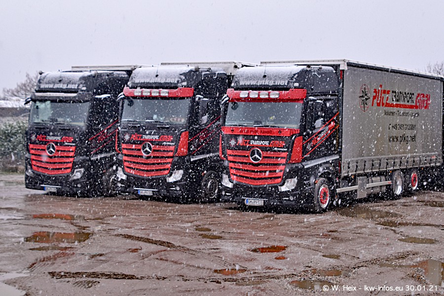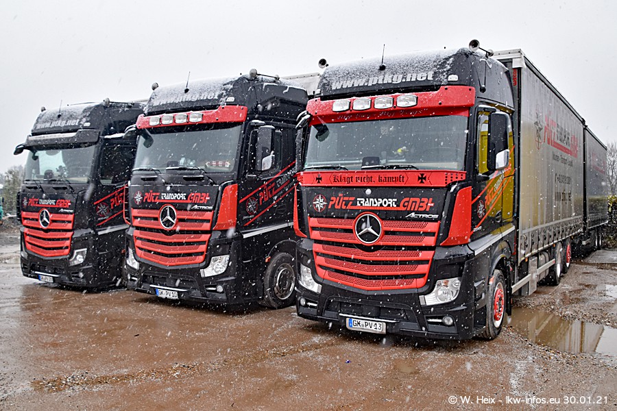 Dies ist mein erster Besuch bei der Firma Pütz in Übach-Palenberg (bei Aachen). Durch eine Reportage in der Zeitschrift "Fernfahrer" in der aktuellen Ausgabe 02/2021 wurde ich in dieser Woche auf die Firma aufmerksam. Denn zum 25-jährigen Firmenjubiläum hat man sich einen richtigen Showtruck/Supertruck gegönnt. Der neue Mercedes-Benz New Actros 4 bzw. Actros 5 (jeder nennt die Baureihe anders) wurde am Faherhaus aufwändig mit Airbrush-Motiven gestaltet. Insgesamt besteht der Fuhrpark aktuell aus 17 LKW. Bis auf einen DAF XF Euro 6 sind alle LKW von Mercedes-Benz. Leider hat mich das Wetter unangenehm überrascht mit einem Wintereinbruch mit Schneefall bei 0°C. Trotzdem habe ich die hier gezeigten Bilder gemacht und in den nächsten Monaten werde ich dann nochmal neue Bilder bei Sonnenschein machen .....