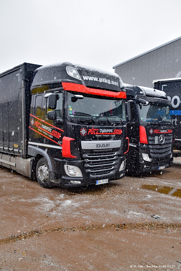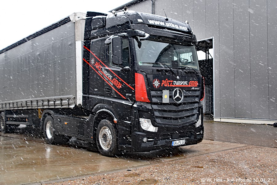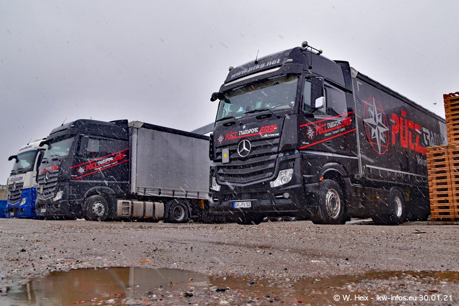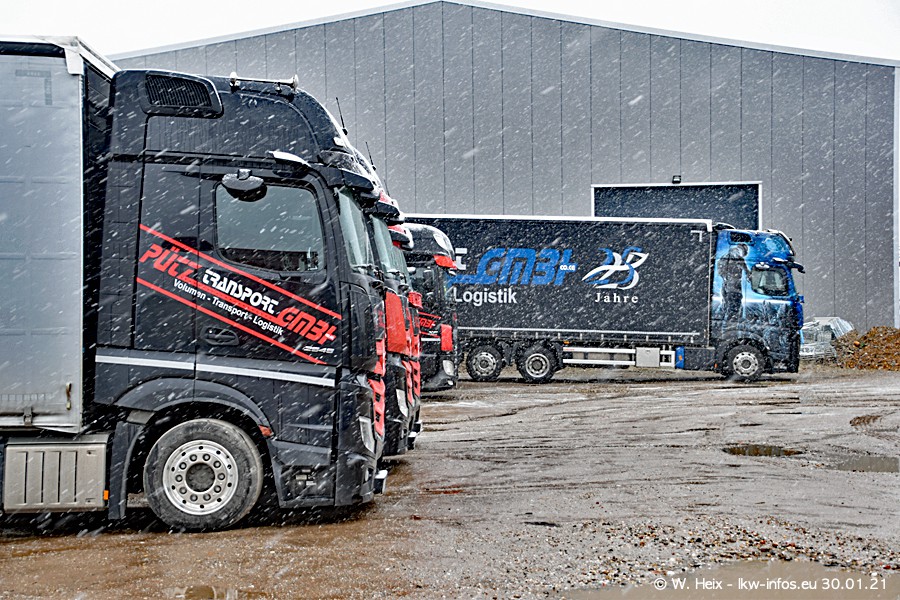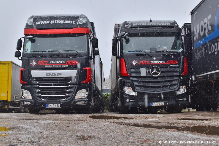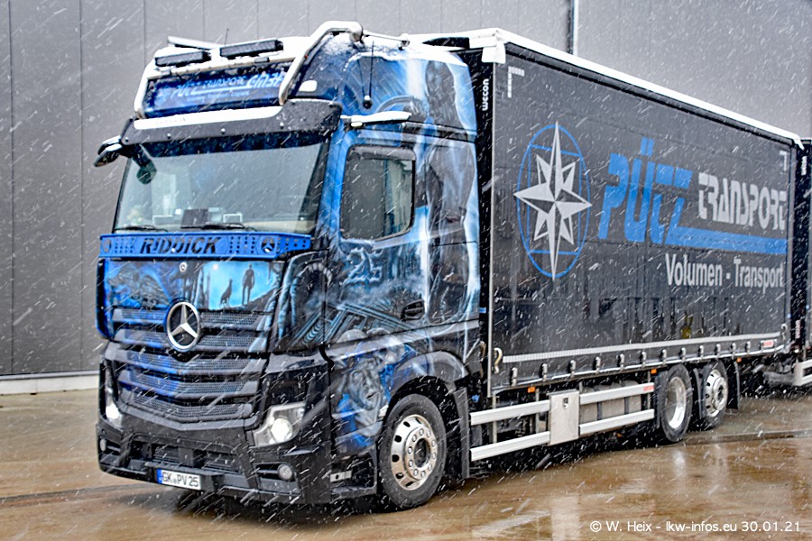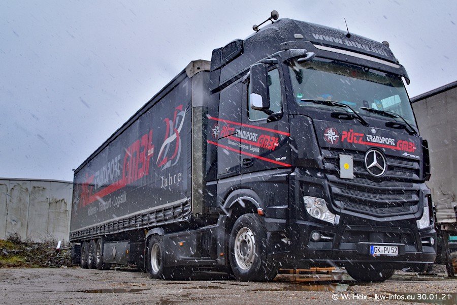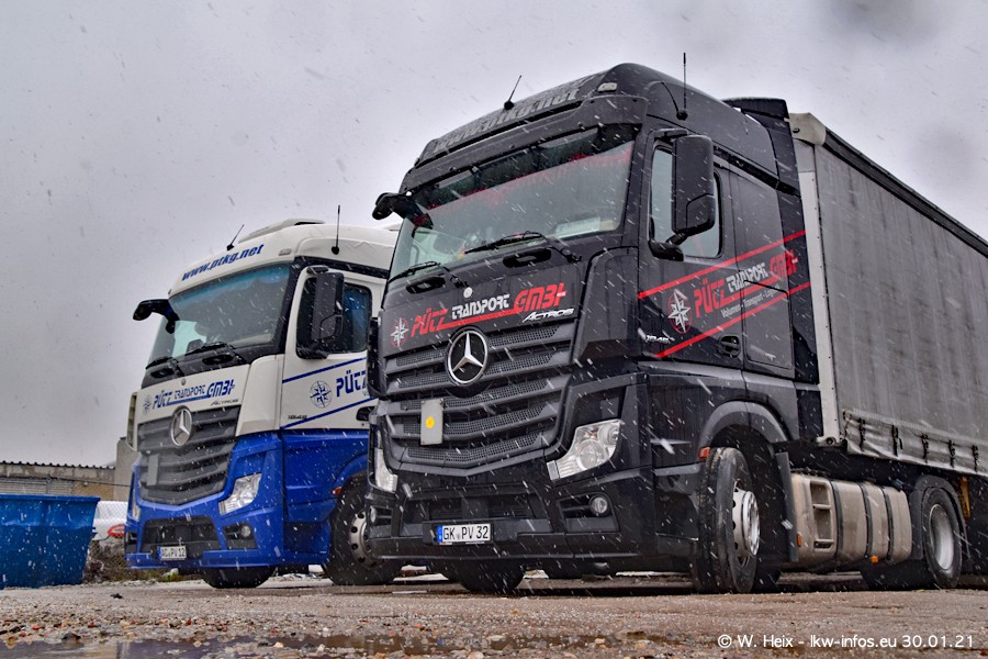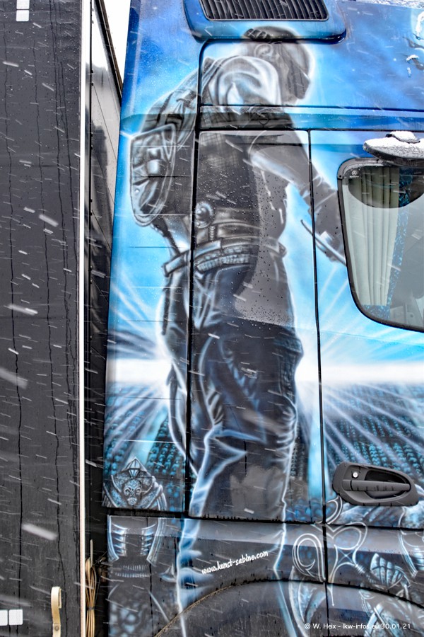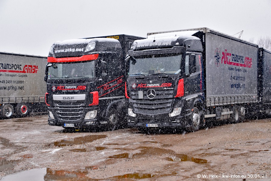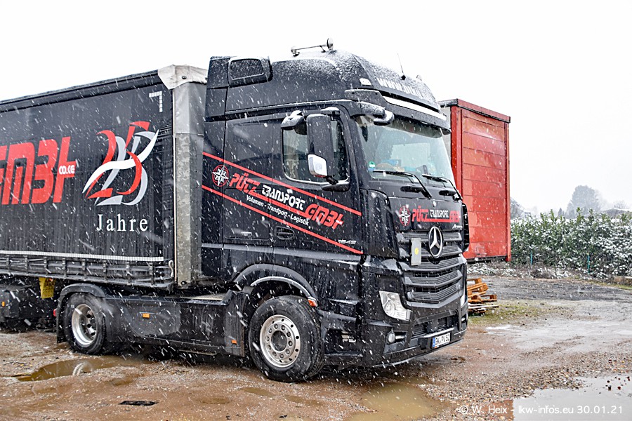 Dies ist mein erster Besuch bei der Firma Pütz in Übach-Palenberg (bei Aachen). Durch eine Reportage in der Zeitschrift "Fernfahrer" in der aktuellen Ausgabe 02/2021 wurde ich in dieser Woche auf die Firma aufmerksam. Denn zum 25-jährigen Firmenjubiläum hat man sich einen richtigen Showtruck/Supertruck gegönnt. Der neue Mercedes-Benz New Actros 4 bzw. Actros 5 (jeder nennt die Baureihe anders) wurde am Faherhaus aufwändig mit Airbrush-Motiven gestaltet. Insgesamt besteht der Fuhrpark aktuell aus 17 LKW. Bis auf einen DAF XF Euro 6 sind alle LKW von Mercedes-Benz. Leider hat mich das Wetter unangenehm überrascht mit einem Wintereinbruch mit Schneefall bei 0°C. Trotzdem habe ich die hier gezeigten Bilder gemacht und in den nächsten Monaten werde ich dann nochmal neue Bilder bei Sonnenschein machen .....