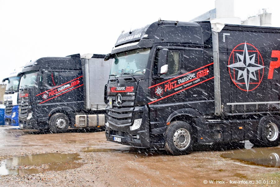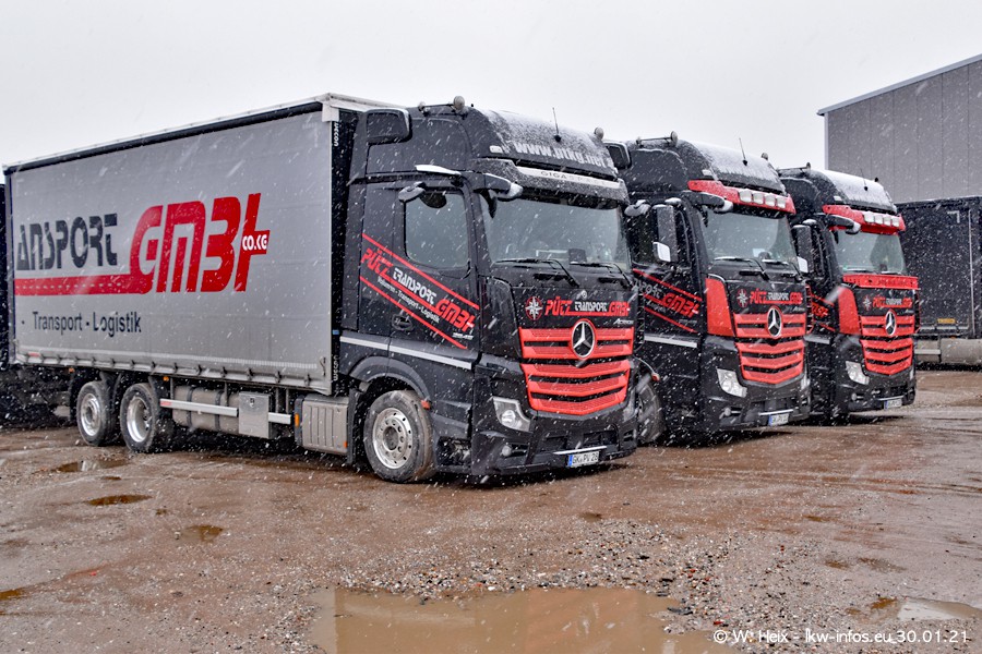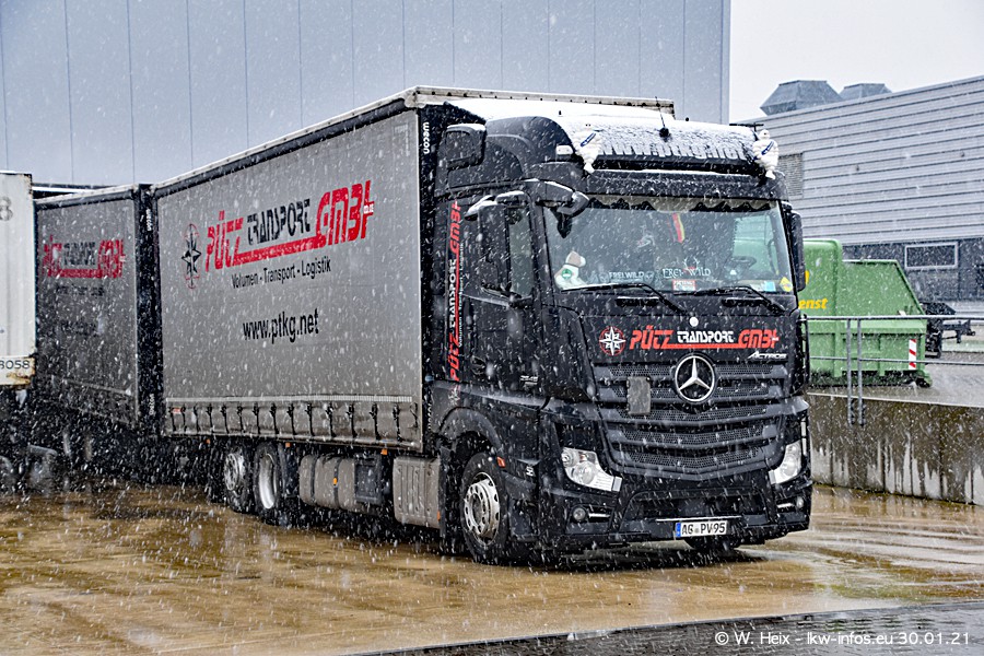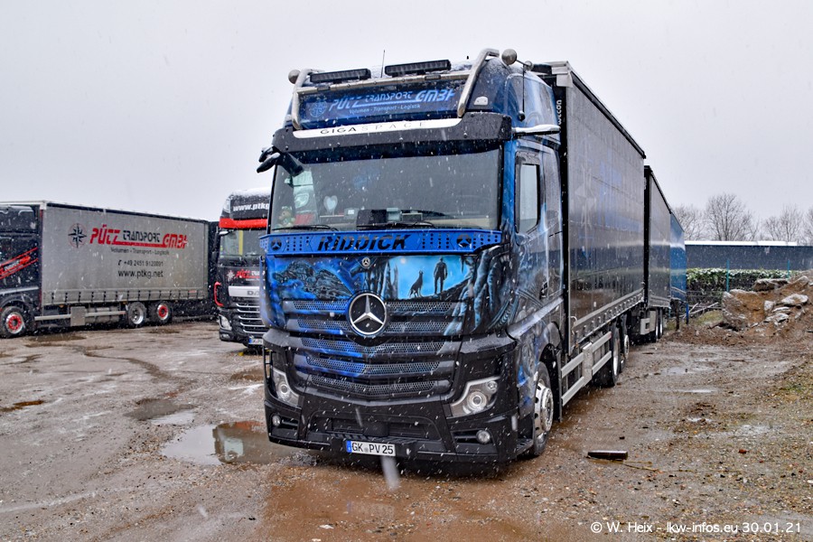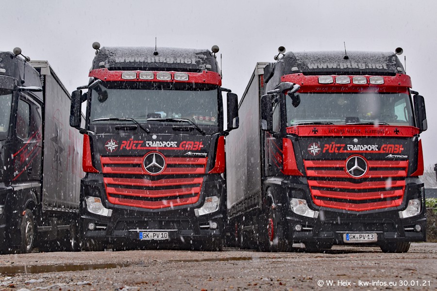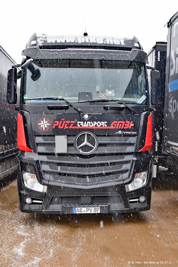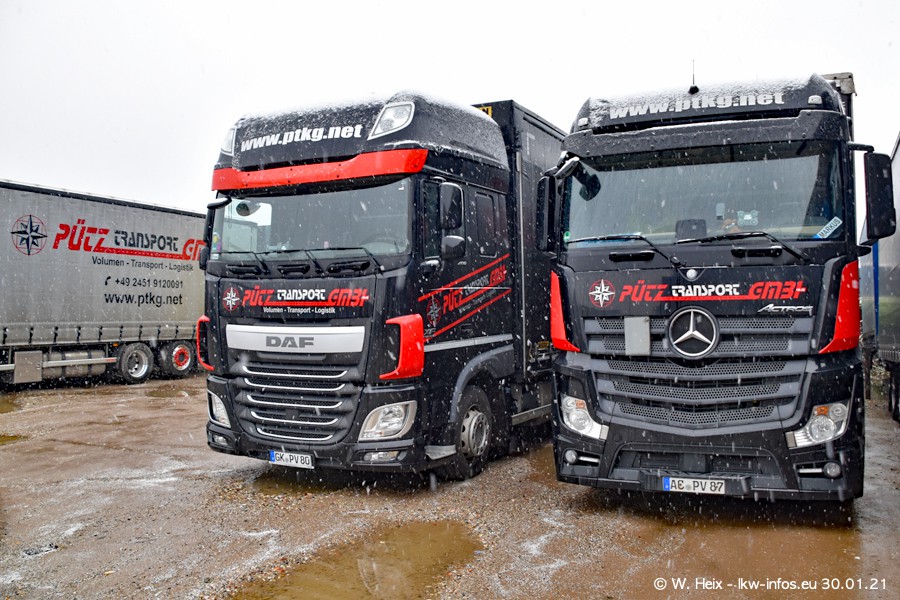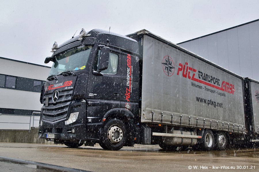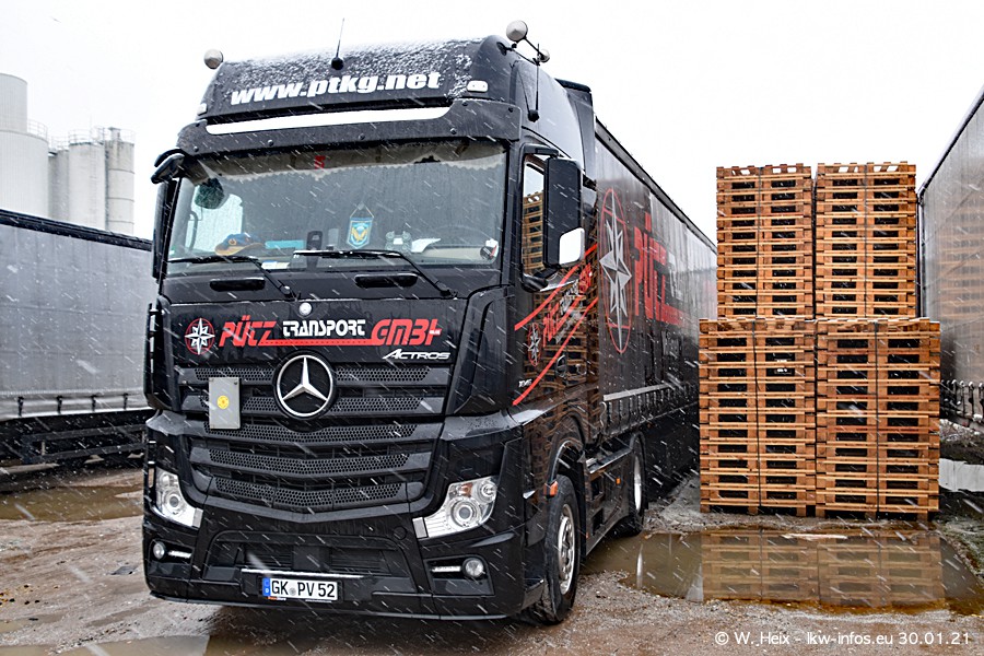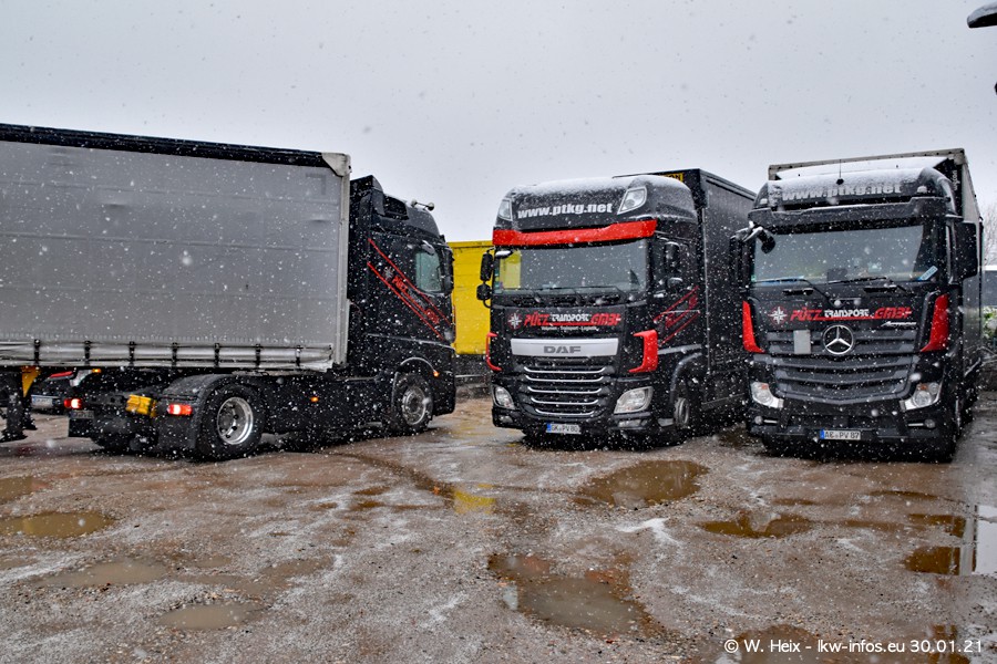 Dies ist mein erster Besuch bei der Firma Pütz in Übach-Palenberg (bei Aachen). Durch eine Reportage in der Zeitschrift "Fernfahrer" in der aktuellen Ausgabe 02/2021 wurde ich in dieser Woche auf die Firma aufmerksam. Denn zum 25-jährigen Firmenjubiläum hat man sich einen richtigen Showtruck/Supertruck gegönnt. Der neue Mercedes-Benz New Actros 4 bzw. Actros 5 (jeder nennt die Baureihe anders) wurde am Faherhaus aufwändig mit Airbrush-Motiven gestaltet. Insgesamt besteht der Fuhrpark aktuell aus 17 LKW. Bis auf einen DAF XF Euro 6 sind alle LKW von Mercedes-Benz. Leider hat mich das Wetter unangenehm überrascht mit einem Wintereinbruch mit Schneefall bei 0°C. Trotzdem habe ich die hier gezeigten Bilder gemacht und in den nächsten Monaten werde ich dann nochmal neue Bilder bei Sonnenschein machen .....