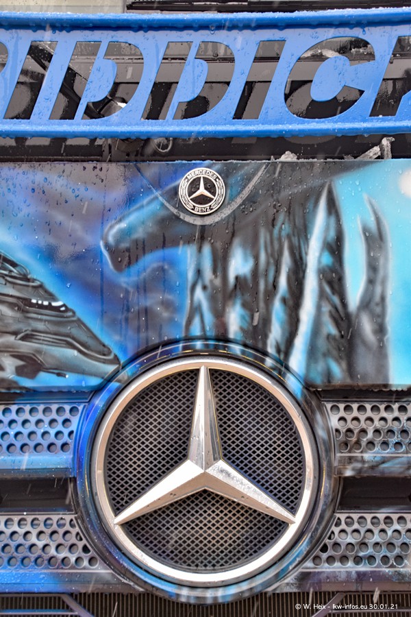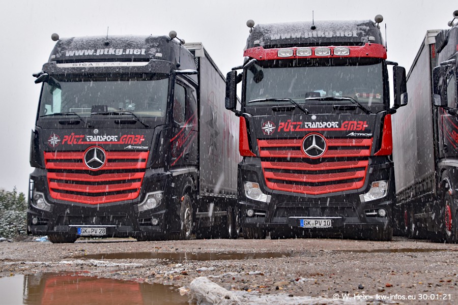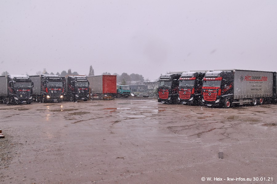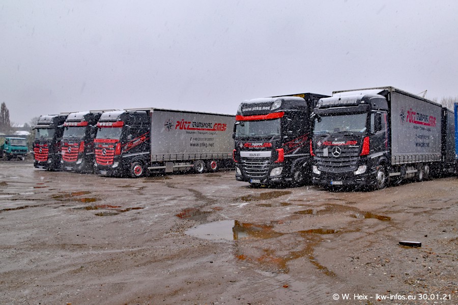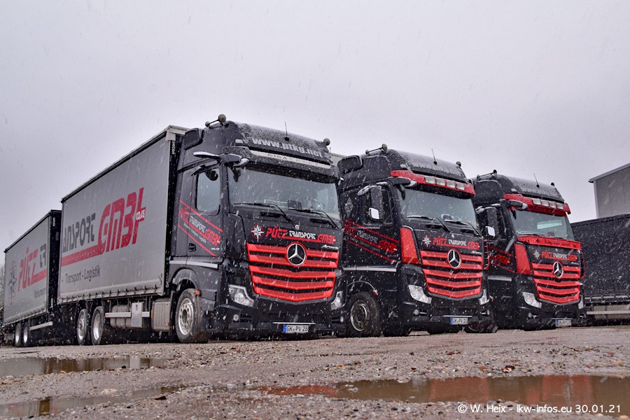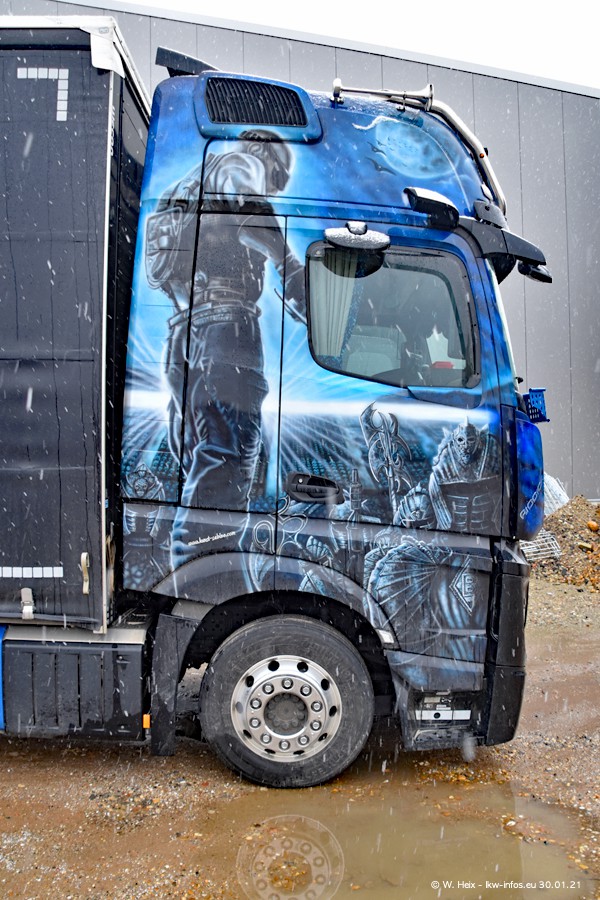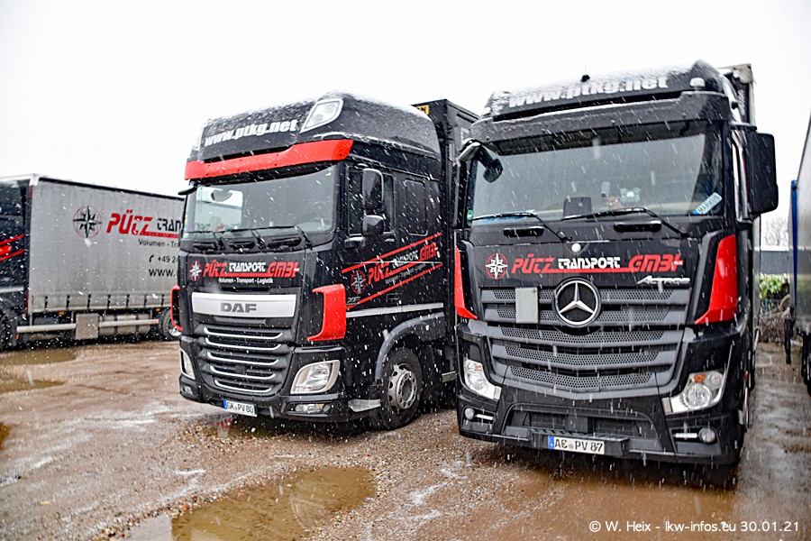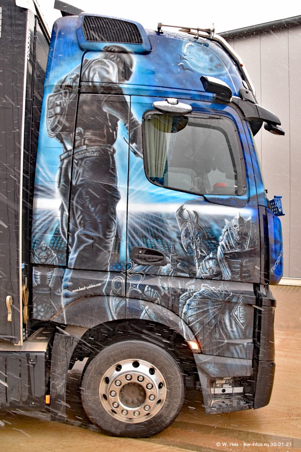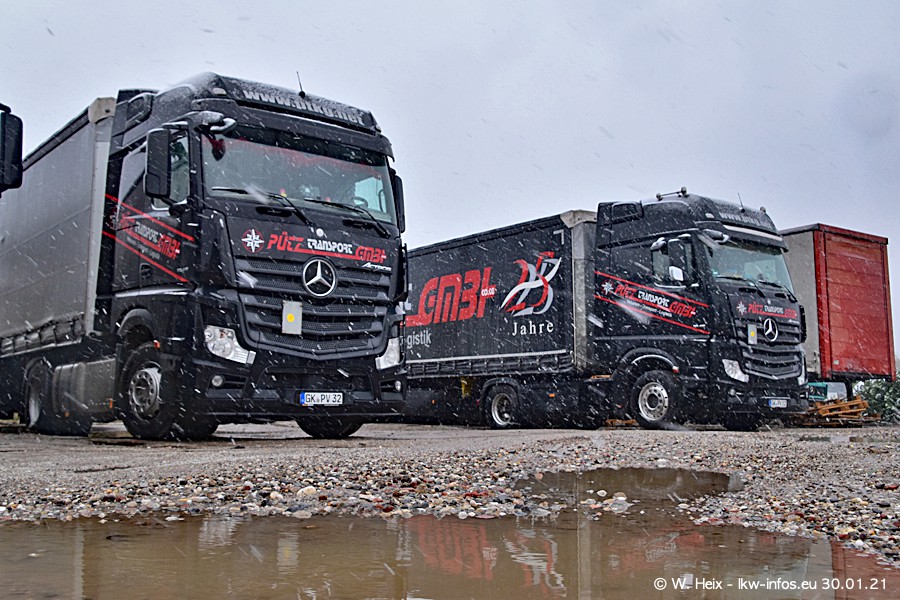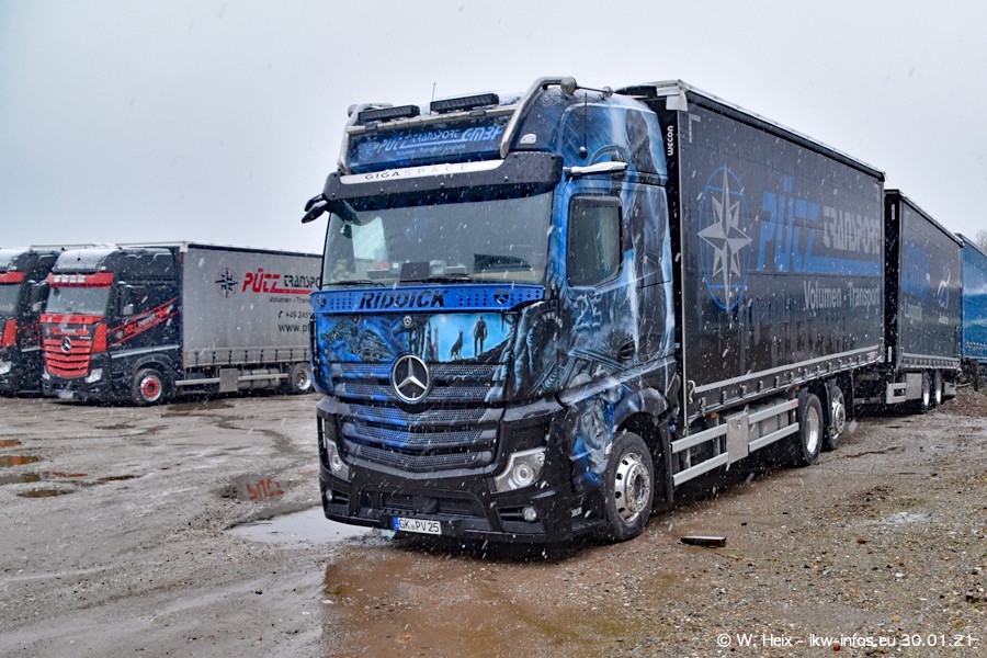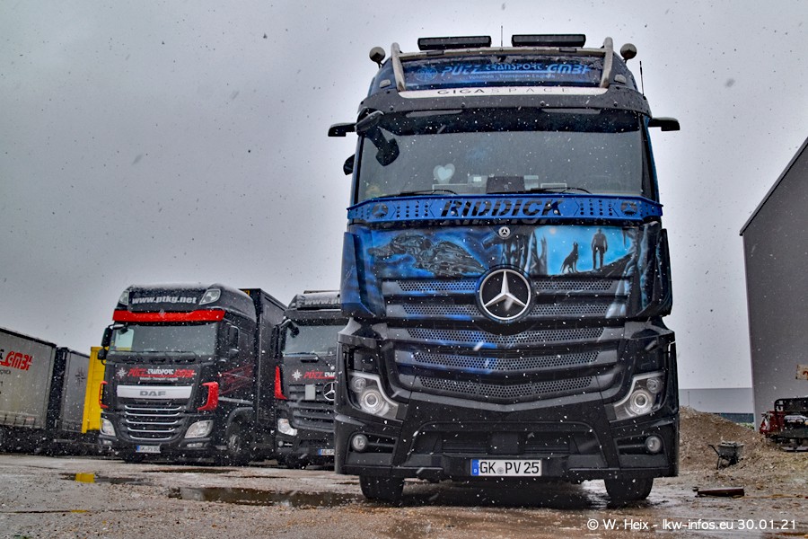 Dies ist mein erster Besuch bei der Firma Pütz in Übach-Palenberg (bei Aachen). Durch eine Reportage in der Zeitschrift "Fernfahrer" in der aktuellen Ausgabe 02/2021 wurde ich in dieser Woche auf die Firma aufmerksam. Denn zum 25-jährigen Firmenjubiläum hat man sich einen richtigen Showtruck/Supertruck gegönnt. Der neue Mercedes-Benz New Actros 4 bzw. Actros 5 (jeder nennt die Baureihe anders) wurde am Faherhaus aufwändig mit Airbrush-Motiven gestaltet. Insgesamt besteht der Fuhrpark aktuell aus 17 LKW. Bis auf einen DAF XF Euro 6 sind alle LKW von Mercedes-Benz. Leider hat mich das Wetter unangenehm überrascht mit einem Wintereinbruch mit Schneefall bei 0°C. Trotzdem habe ich die hier gezeigten Bilder gemacht und in den nächsten Monaten werde ich dann nochmal neue Bilder bei Sonnenschein machen .....