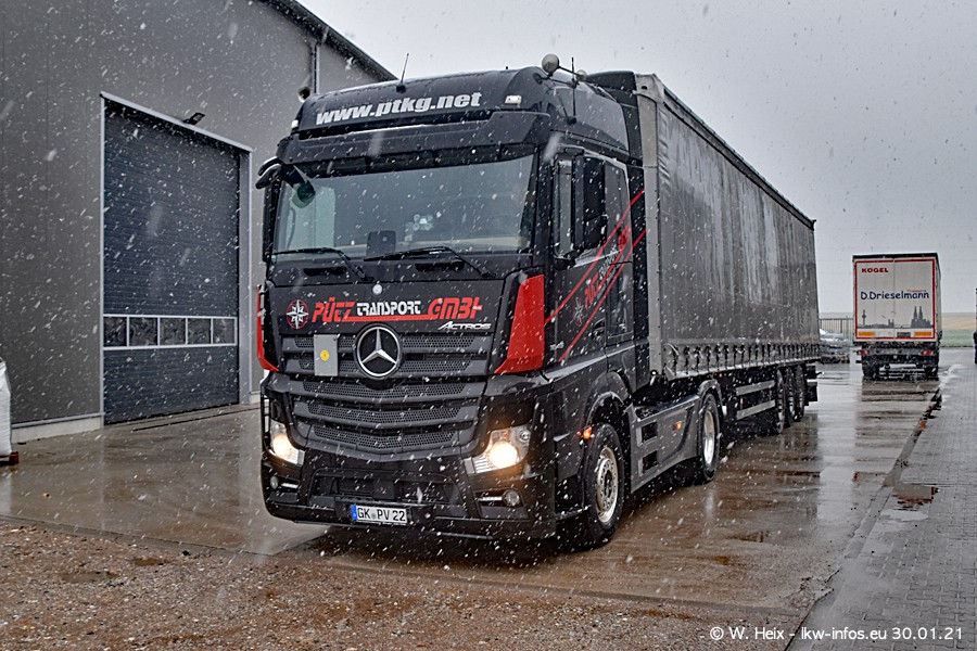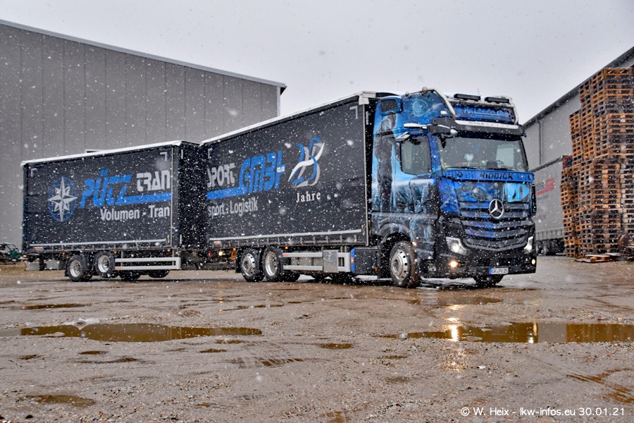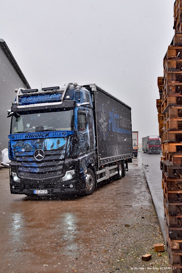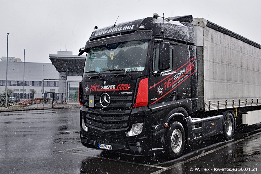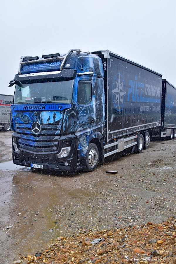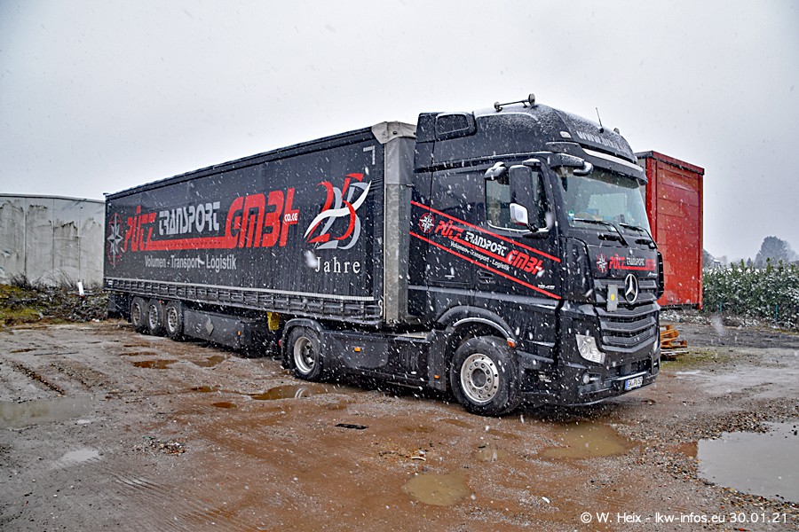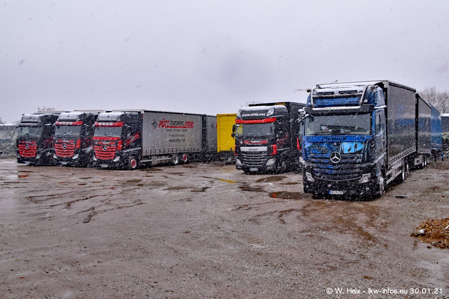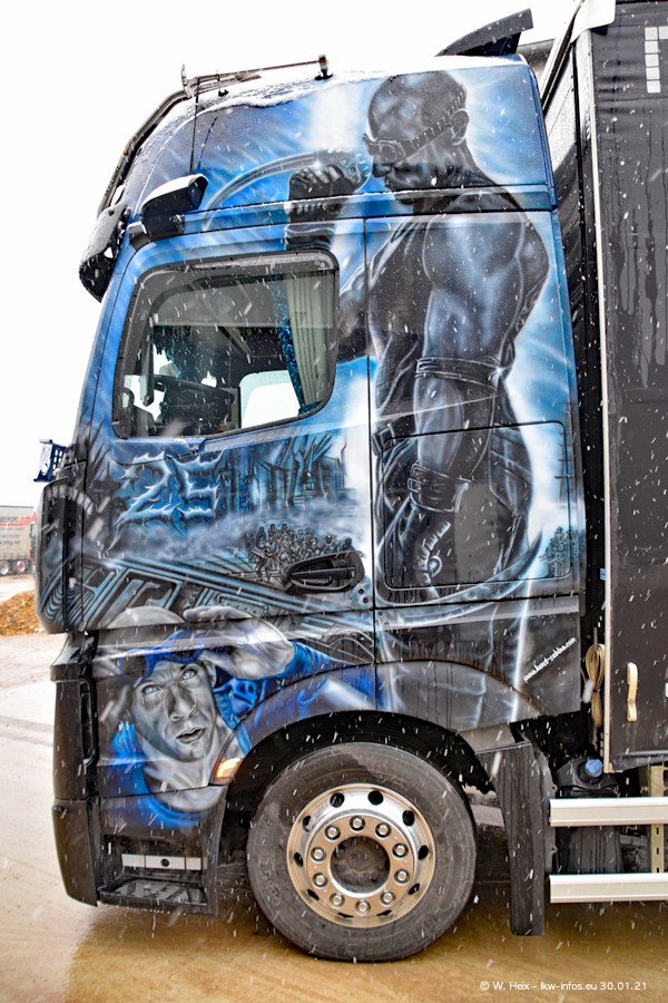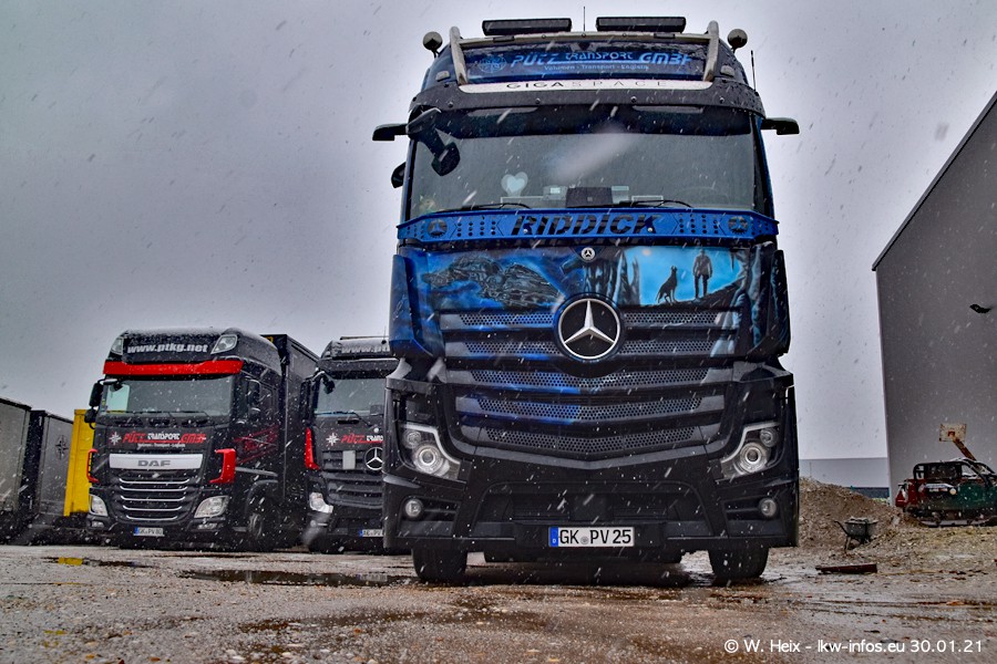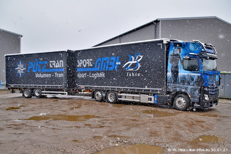 Dies ist mein erster Besuch bei der Firma Pütz in Übach-Palenberg (bei Aachen). Durch eine Reportage in der Zeitschrift "Fernfahrer" in der aktuellen Ausgabe 02/2021 wurde ich in dieser Woche auf die Firma aufmerksam. Denn zum 25-jährigen Firmenjubiläum hat man sich einen richtigen Showtruck/Supertruck gegönnt. Der neue Mercedes-Benz New Actros 4 bzw. Actros 5 (jeder nennt die Baureihe anders) wurde am Faherhaus aufwändig mit Airbrush-Motiven gestaltet. Insgesamt besteht der Fuhrpark aktuell aus 17 LKW. Bis auf einen DAF XF Euro 6 sind alle LKW von Mercedes-Benz. Leider hat mich das Wetter unangenehm überrascht mit einem Wintereinbruch mit Schneefall bei 0°C. Trotzdem habe ich die hier gezeigten Bilder gemacht und in den nächsten Monaten werde ich dann nochmal neue Bilder bei Sonnenschein machen .....