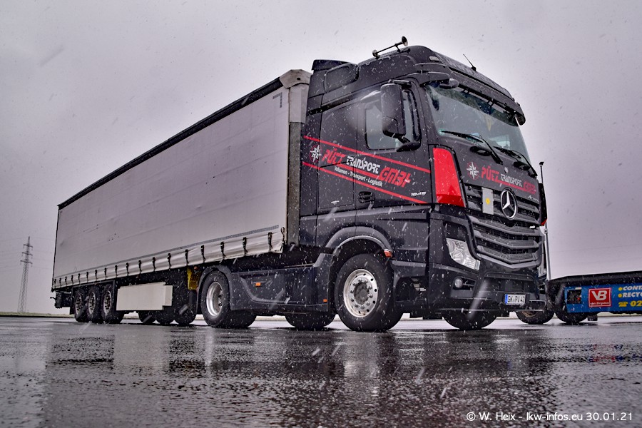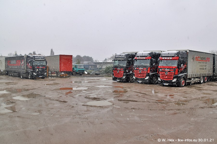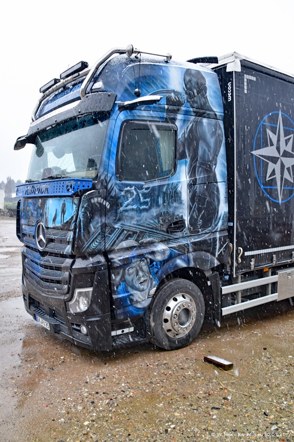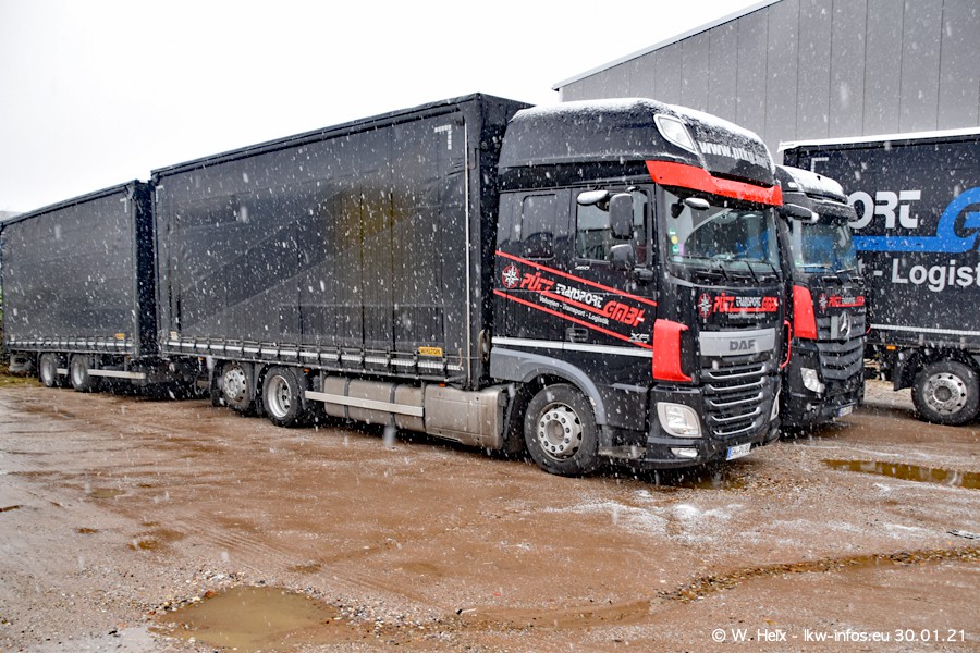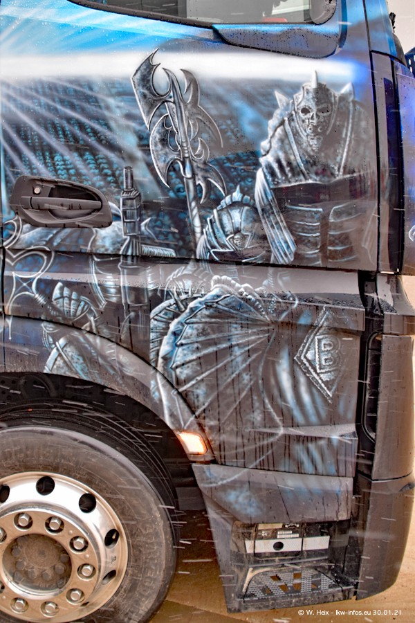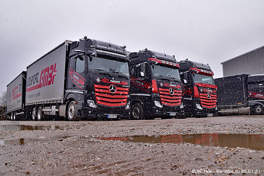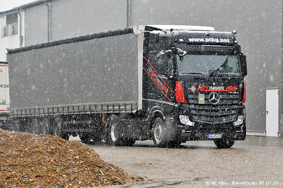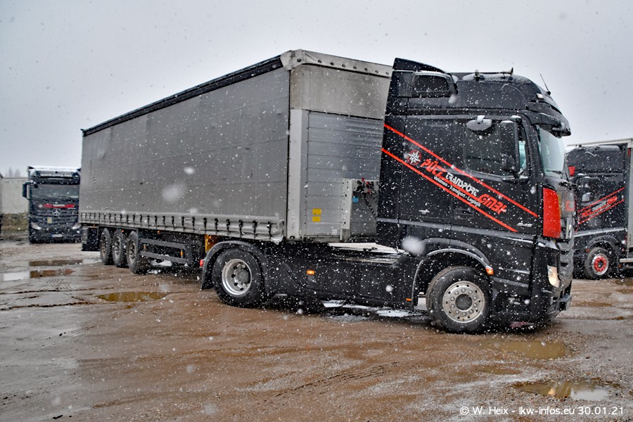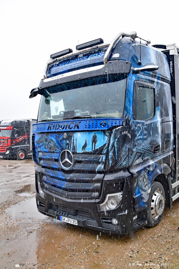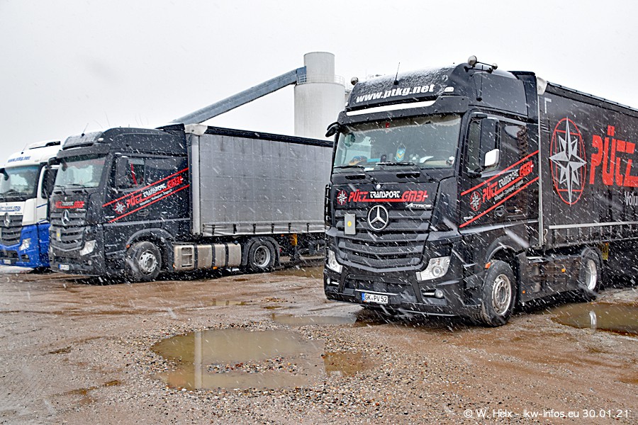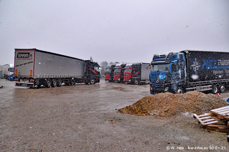 Dies ist mein erster Besuch bei der Firma Pütz in Übach-Palenberg (bei Aachen). Durch eine Reportage in der Zeitschrift "Fernfahrer" in der aktuellen Ausgabe 02/2021 wurde ich in dieser Woche auf die Firma aufmerksam. Denn zum 25-jährigen Firmenjubiläum hat man sich einen richtigen Showtruck/Supertruck gegönnt. Der neue Mercedes-Benz New Actros 4 bzw. Actros 5 (jeder nennt die Baureihe anders) wurde am Faherhaus aufwändig mit Airbrush-Motiven gestaltet. Insgesamt besteht der Fuhrpark aktuell aus 17 LKW. Bis auf einen DAF XF Euro 6 sind alle LKW von Mercedes-Benz. Leider hat mich das Wetter unangenehm überrascht mit einem Wintereinbruch mit Schneefall bei 0°C. Trotzdem habe ich die hier gezeigten Bilder gemacht und in den nächsten Monaten werde ich dann nochmal neue Bilder bei Sonnenschein machen .....