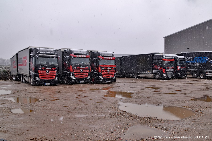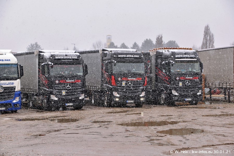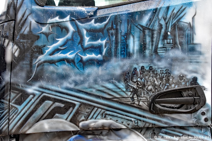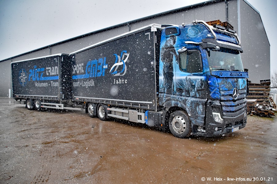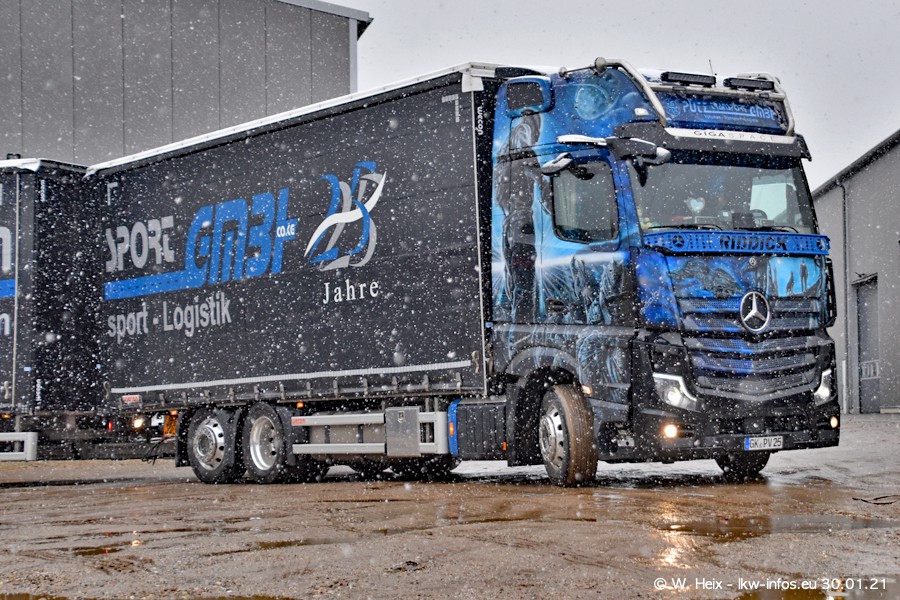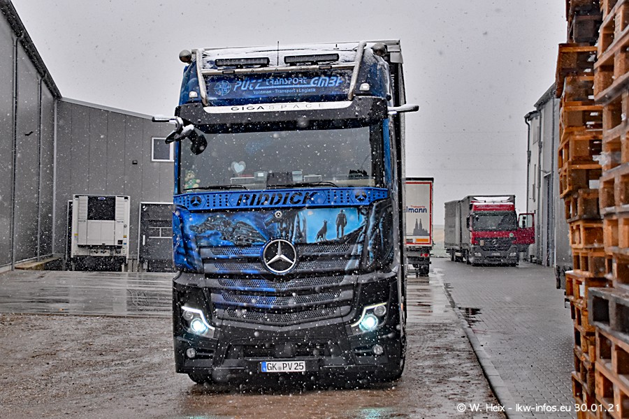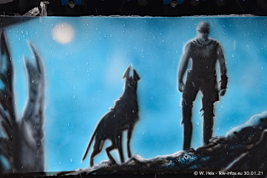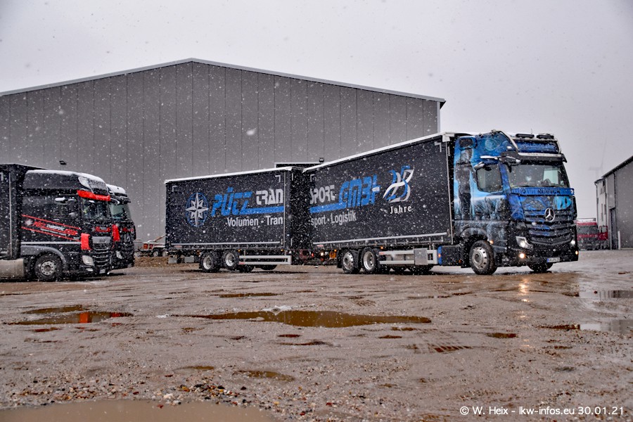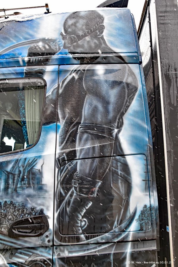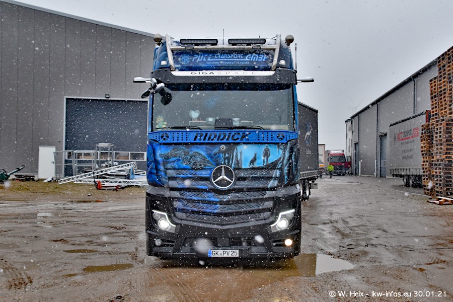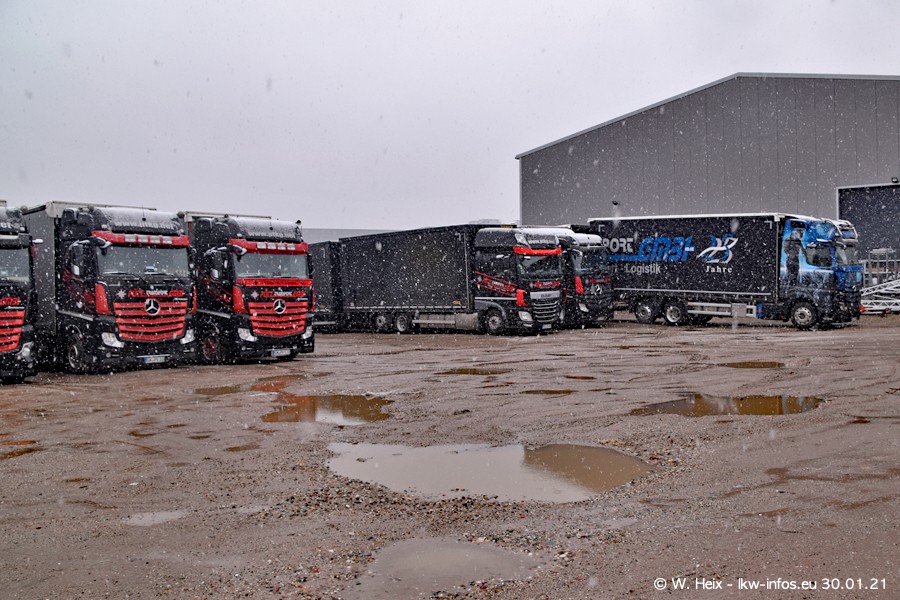 Dies ist mein erster Besuch bei der Firma Pütz in Übach-Palenberg (bei Aachen). Durch eine Reportage in der Zeitschrift "Fernfahrer" in der aktuellen Ausgabe 02/2021 wurde ich in dieser Woche auf die Firma aufmerksam. Denn zum 25-jährigen Firmenjubiläum hat man sich einen richtigen Showtruck/Supertruck gegönnt. Der neue Mercedes-Benz New Actros 4 bzw. Actros 5 (jeder nennt die Baureihe anders) wurde am Faherhaus aufwändig mit Airbrush-Motiven gestaltet. Insgesamt besteht der Fuhrpark aktuell aus 17 LKW. Bis auf einen DAF XF Euro 6 sind alle LKW von Mercedes-Benz. Leider hat mich das Wetter unangenehm überrascht mit einem Wintereinbruch mit Schneefall bei 0°C. Trotzdem habe ich die hier gezeigten Bilder gemacht und in den nächsten Monaten werde ich dann nochmal neue Bilder bei Sonnenschein machen .....