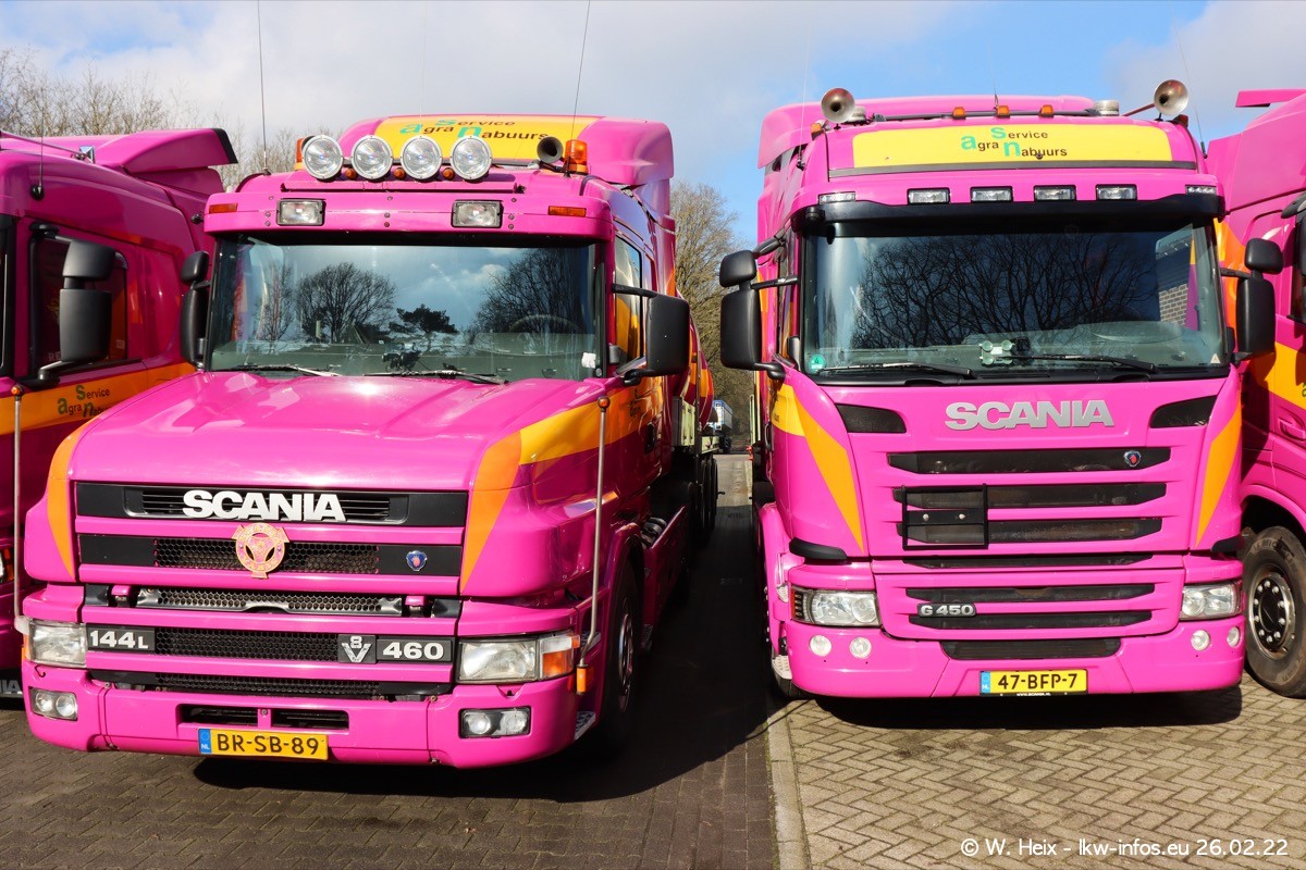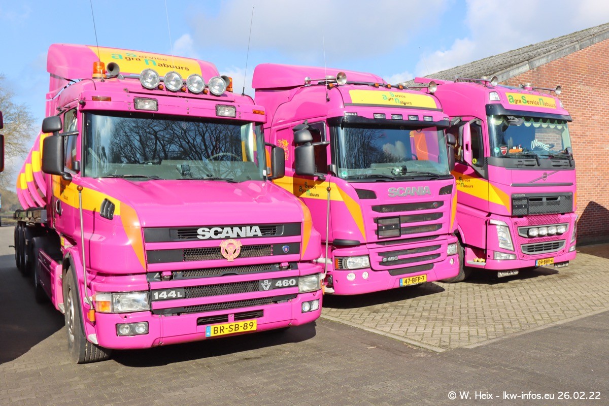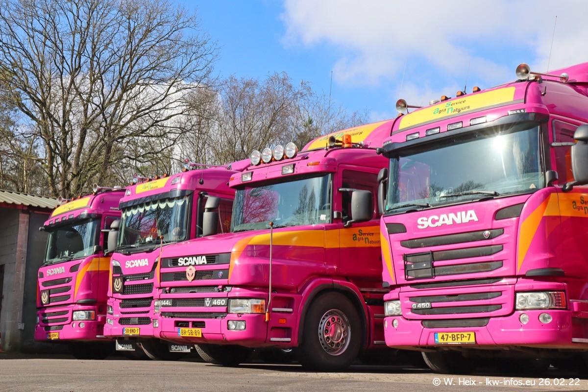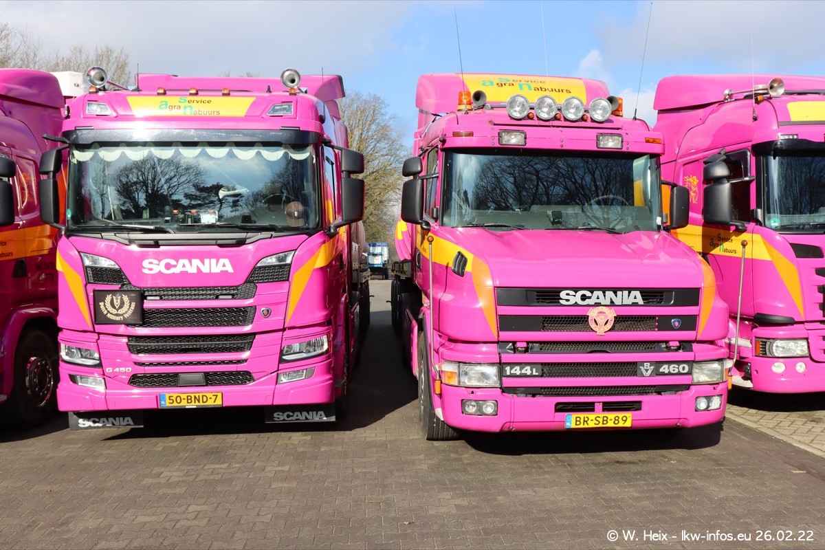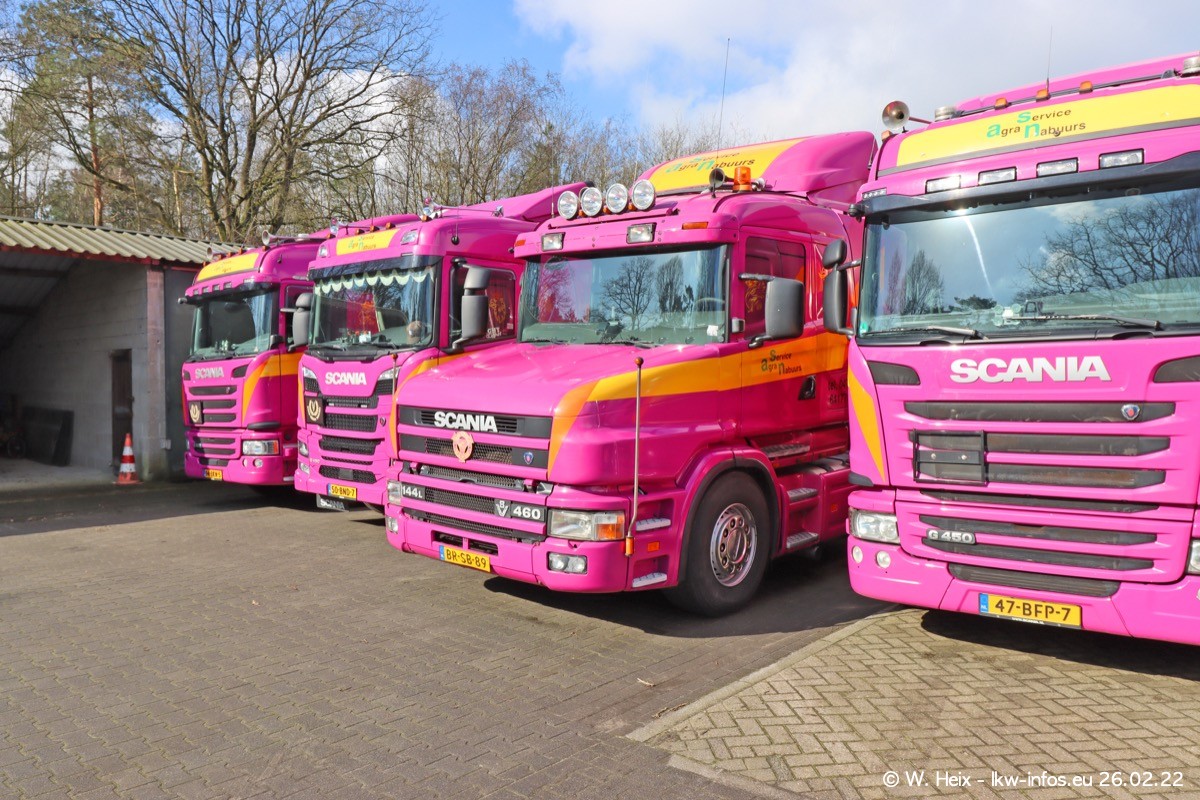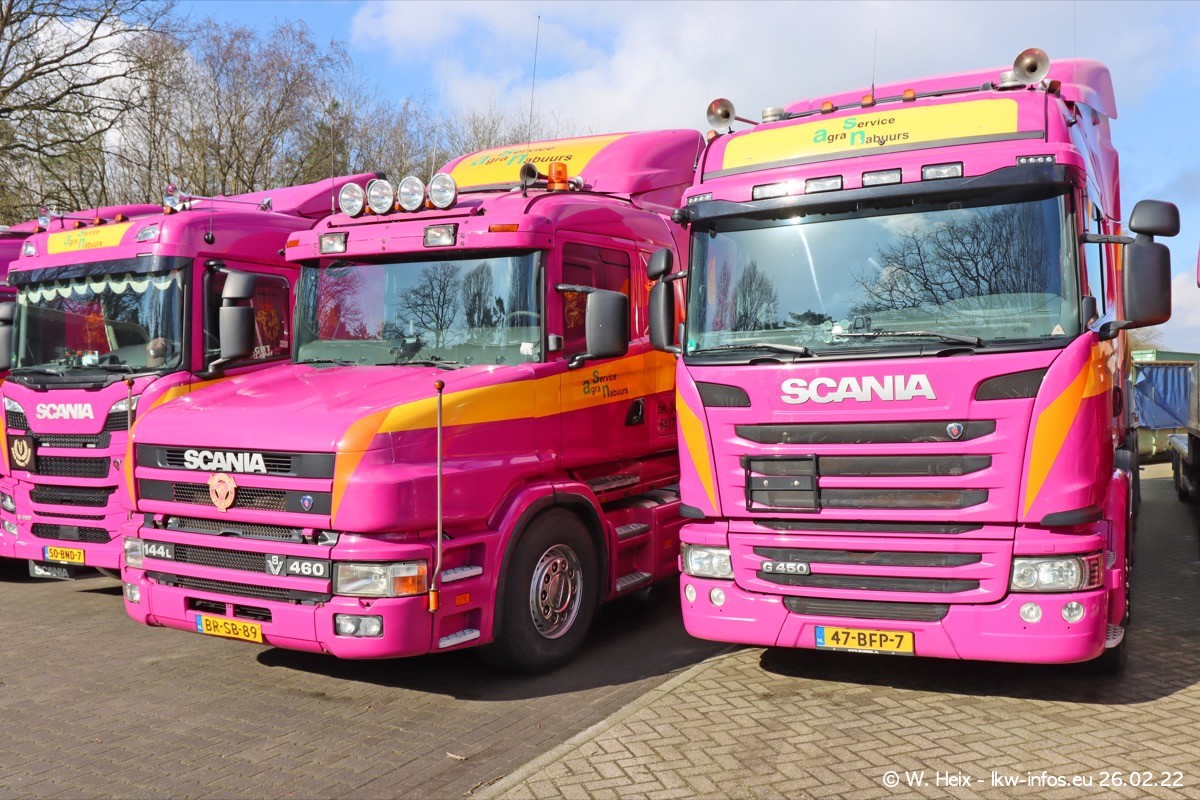 Mein erster Besuch bei der Firma Agra Service Nabuurs in Overloon (in der Nähe von Boxmeer gelegen) begann direkt mit einem schönen Fotoshooting, mit dem ich so nicht gerechnet bzw,. das ich so nicht geplant hatte. Aber gerade so macht das Hobby Spaß! Alle sieben LKW standen frisch gewaschen nebeneinander auf dem Hof. Sechs davon sind im täglichen Einsatz. Der SCANIA T 144 L 460 V8 Hauber wird nur noch als Ersatz und für Hobbyzwecke verwendet und ist inzwischen schon 21 (!) Jahre alt. Das Wetter war fast perfekt, wobei es gegen Ende des Fotoshootings leider wieder grau wurde, der Nebel kam langsam zurück.