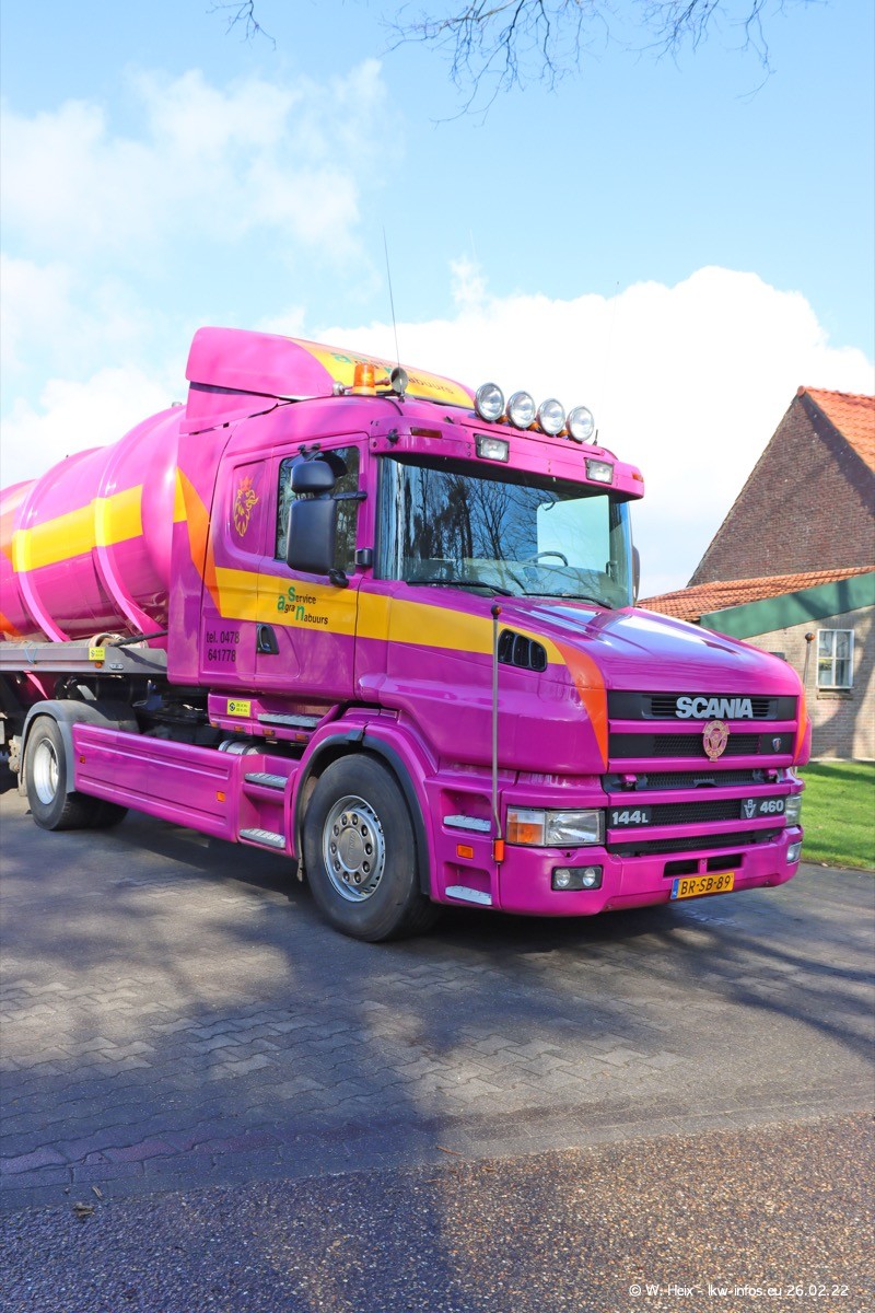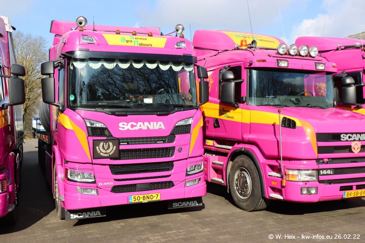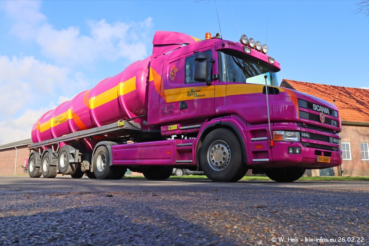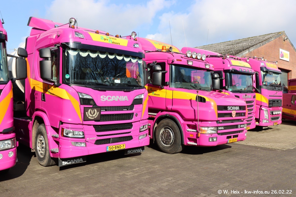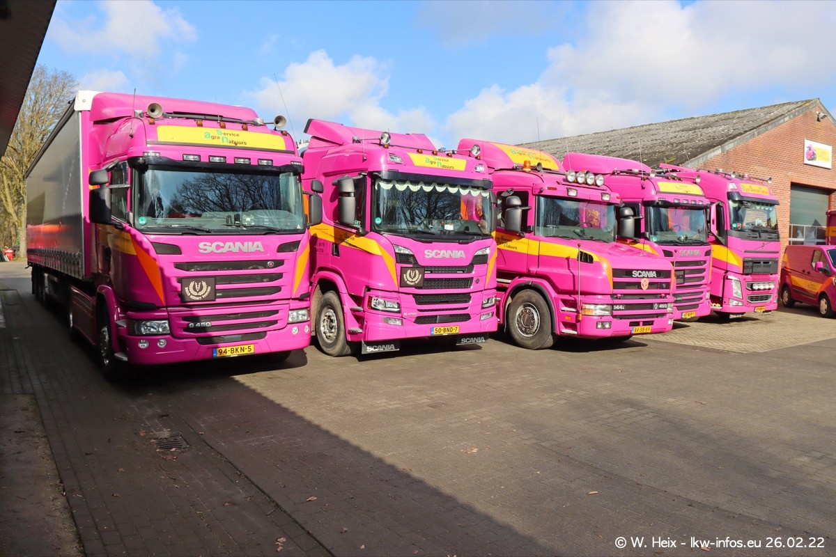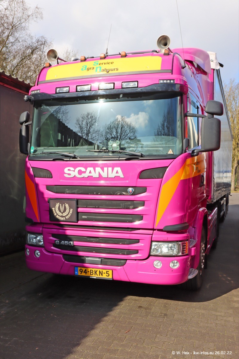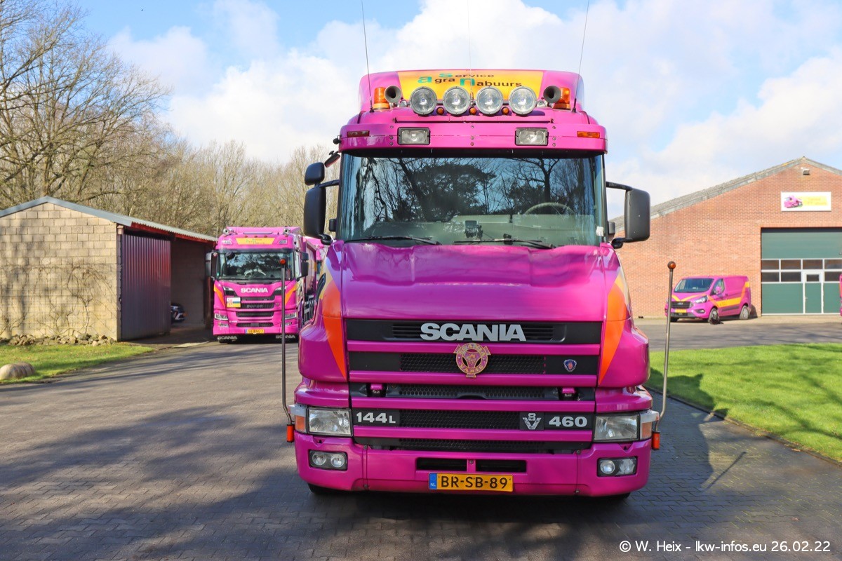 Mein erster Besuch bei der Firma Agra Service Nabuurs in Overloon (in der Nähe von Boxmeer gelegen) begann direkt mit einem schönen Fotoshooting, mit dem ich so nicht gerechnet bzw,. das ich so nicht geplant hatte. Aber gerade so macht das Hobby Spaß! Alle sieben LKW standen frisch gewaschen nebeneinander auf dem Hof. Sechs davon sind im täglichen Einsatz. Der SCANIA T 144 L 460 V8 Hauber wird nur noch als Ersatz und für Hobbyzwecke verwendet und ist inzwischen schon 21 (!) Jahre alt. Das Wetter war fast perfekt, wobei es gegen Ende des Fotoshootings leider wieder grau wurde, der Nebel kam langsam zurück.