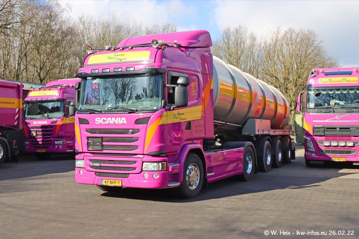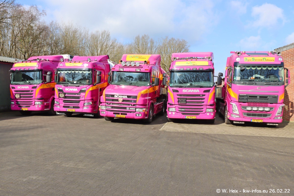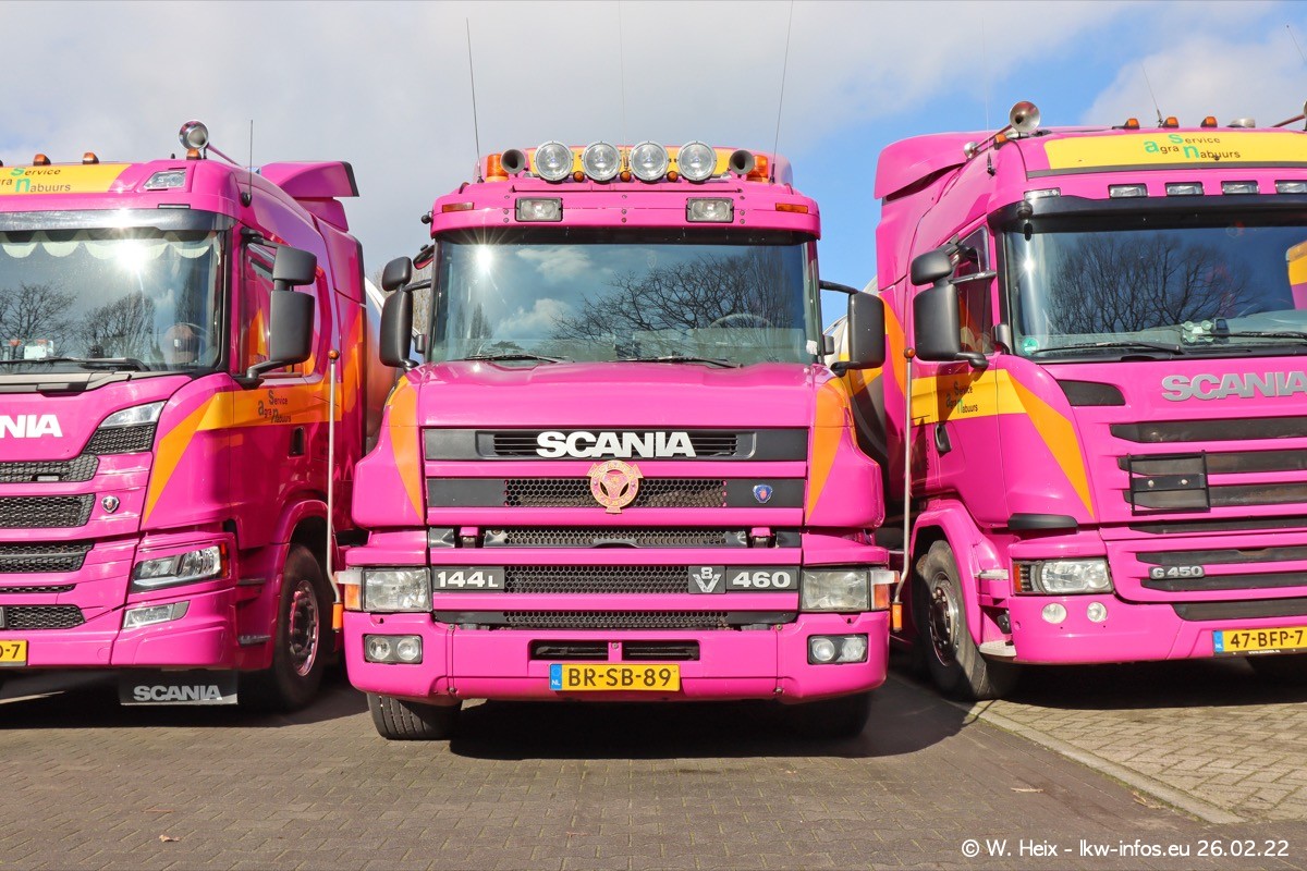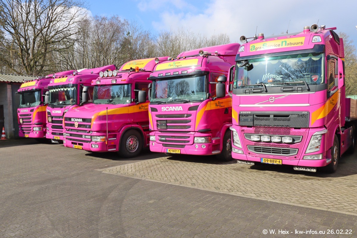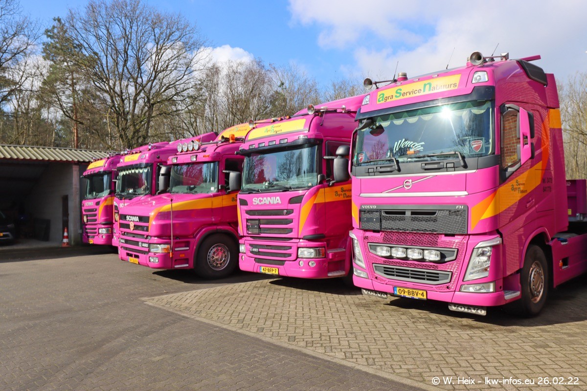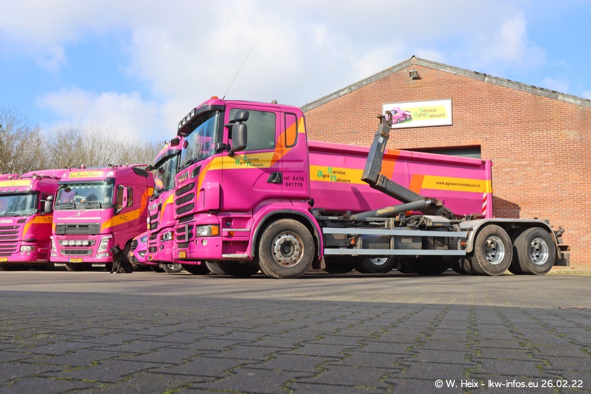 Mein erster Besuch bei der Firma Agra Service Nabuurs in Overloon (in der Nähe von Boxmeer gelegen) begann direkt mit einem schönen Fotoshooting, mit dem ich so nicht gerechnet bzw,. das ich so nicht geplant hatte. Aber gerade so macht das Hobby Spaß! Alle sieben LKW standen frisch gewaschen nebeneinander auf dem Hof. Sechs davon sind im täglichen Einsatz. Der SCANIA T 144 L 460 V8 Hauber wird nur noch als Ersatz und für Hobbyzwecke verwendet und ist inzwischen schon 21 (!) Jahre alt. Das Wetter war fast perfekt, wobei es gegen Ende des Fotoshootings leider wieder grau wurde, der Nebel kam langsam zurück.