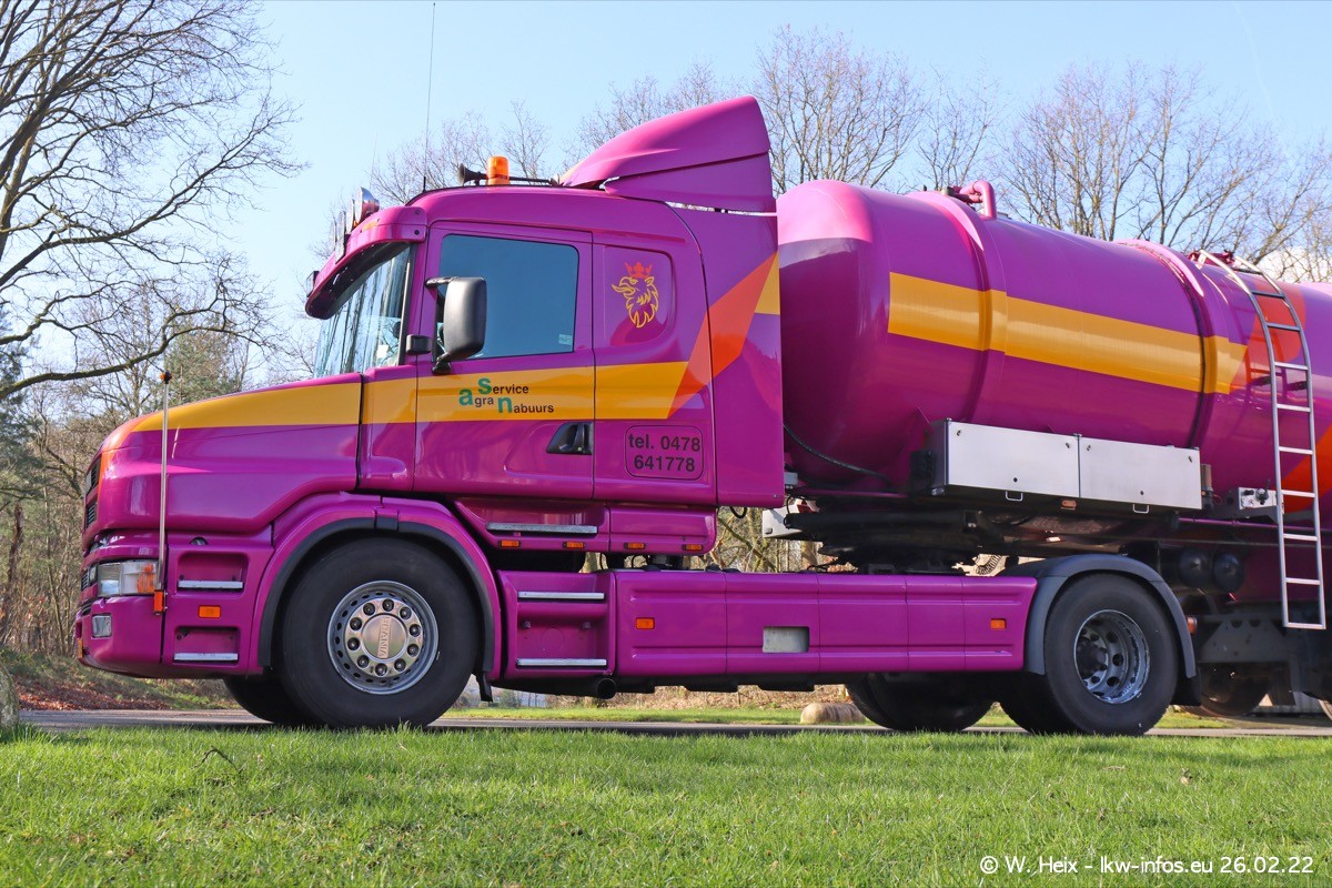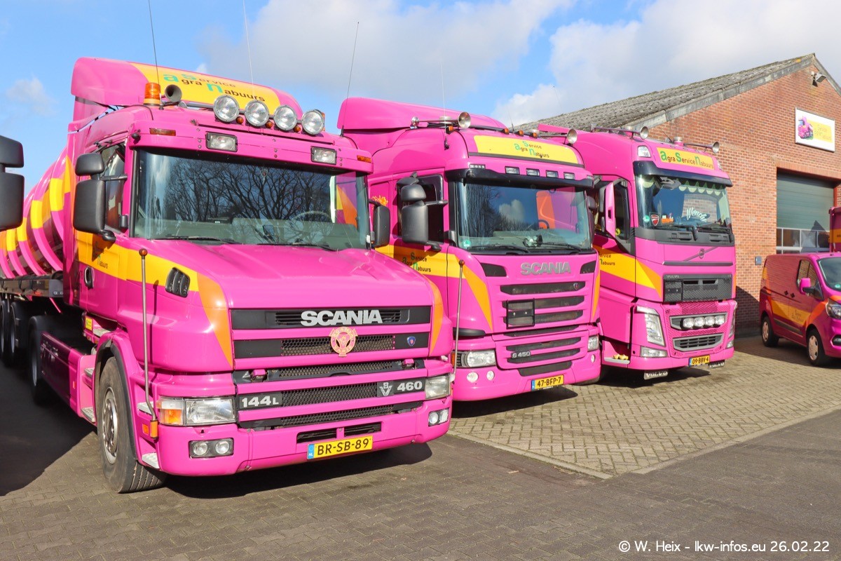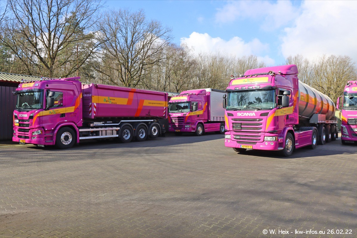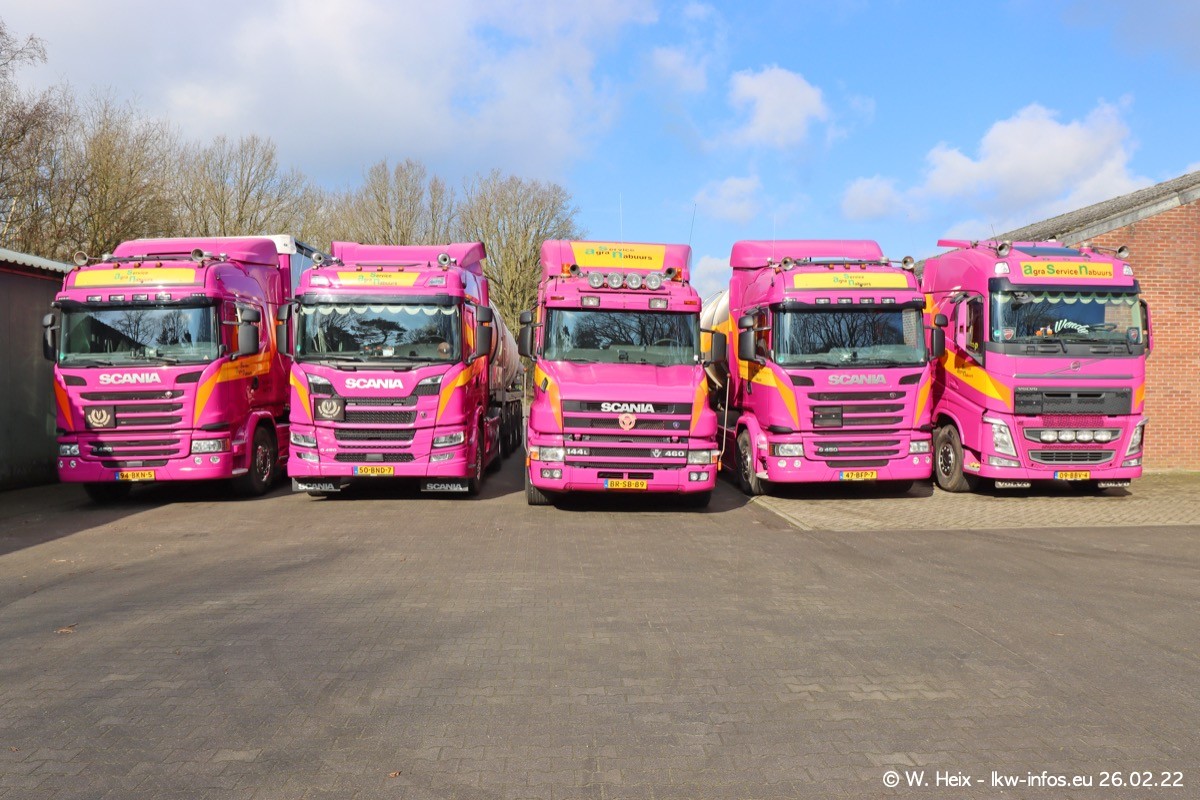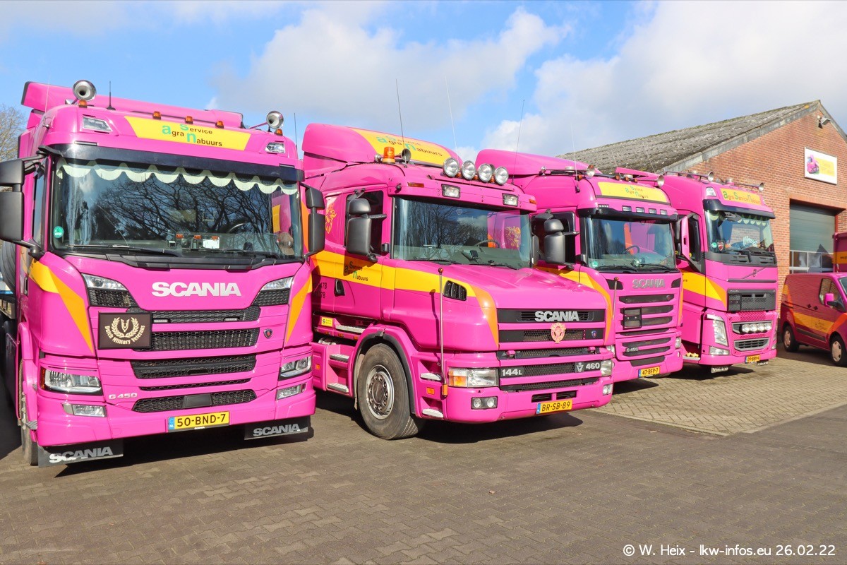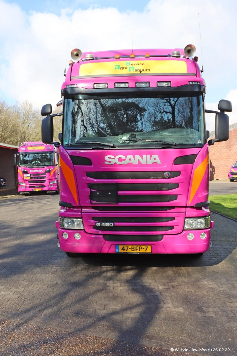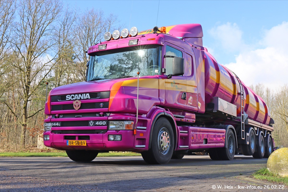 Mein erster Besuch bei der Firma Agra Service Nabuurs in Overloon (in der Nähe von Boxmeer gelegen) begann direkt mit einem schönen Fotoshooting, mit dem ich so nicht gerechnet bzw,. das ich so nicht geplant hatte. Aber gerade so macht das Hobby Spaß! Alle sieben LKW standen frisch gewaschen nebeneinander auf dem Hof. Sechs davon sind im täglichen Einsatz. Der SCANIA T 144 L 460 V8 Hauber wird nur noch als Ersatz und für Hobbyzwecke verwendet und ist inzwischen schon 21 (!) Jahre alt. Das Wetter war fast perfekt, wobei es gegen Ende des Fotoshootings leider wieder grau wurde, der Nebel kam langsam zurück.