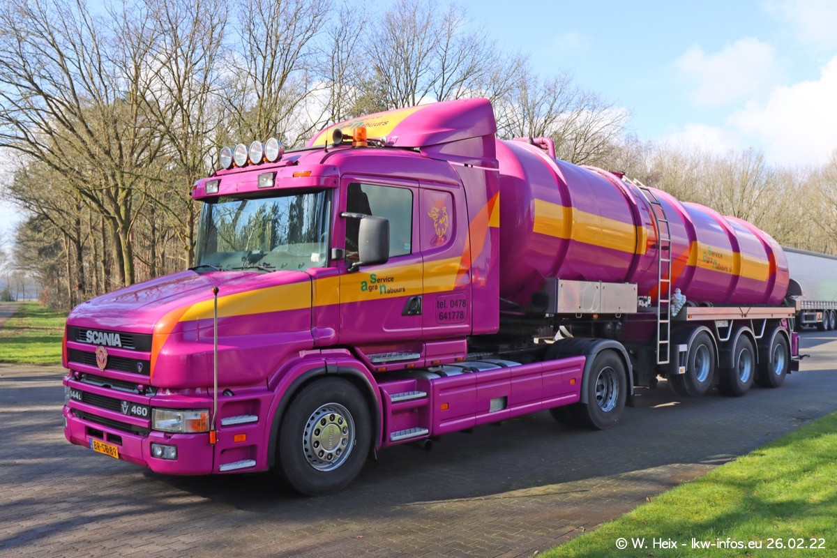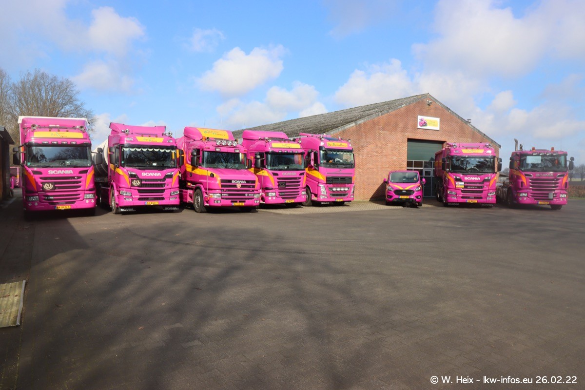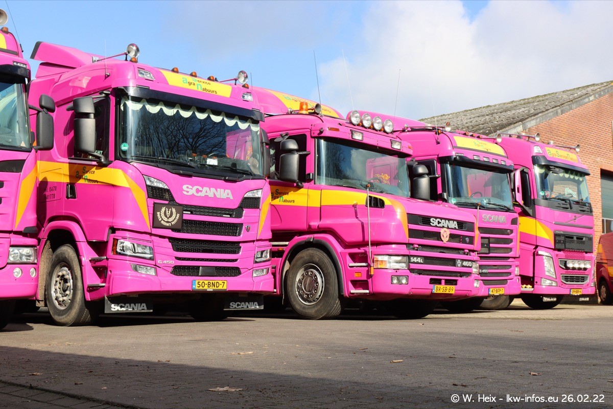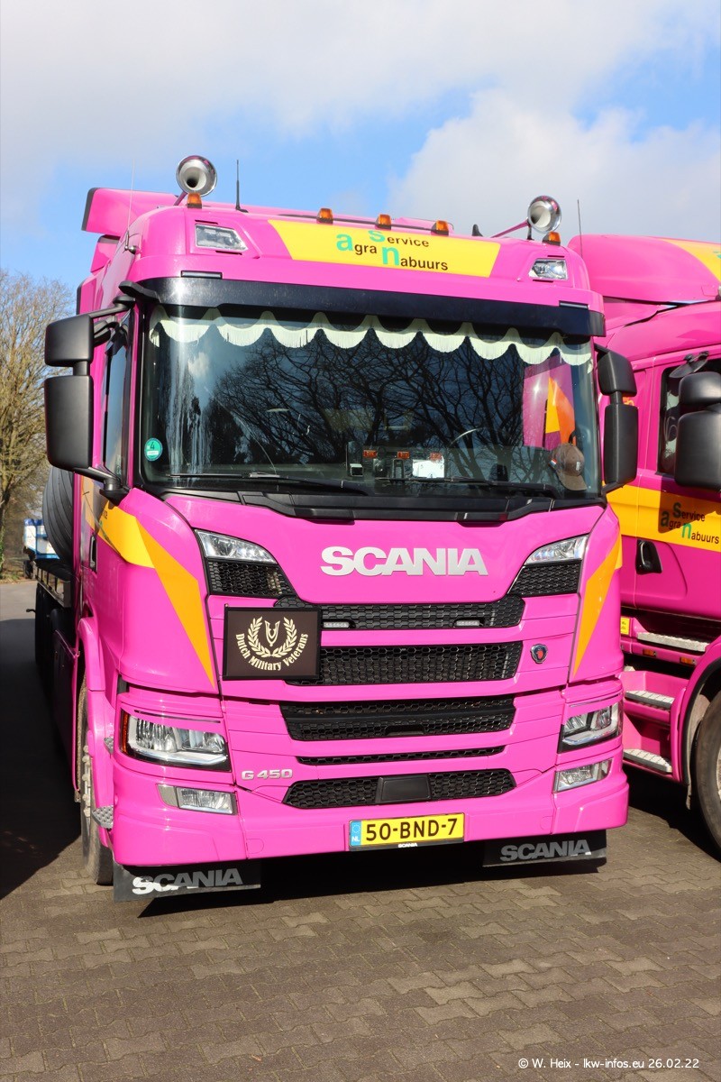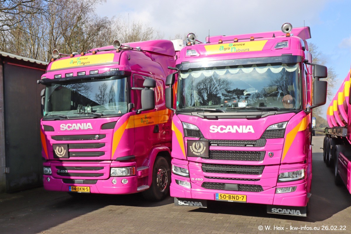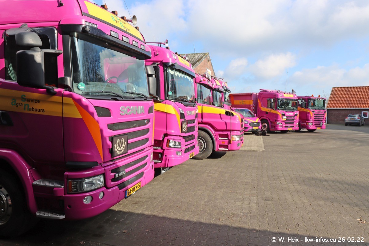 Mein erster Besuch bei der Firma Agra Service Nabuurs in Overloon (in der Nähe von Boxmeer gelegen) begann direkt mit einem schönen Fotoshooting, mit dem ich so nicht gerechnet bzw,. das ich so nicht geplant hatte. Aber gerade so macht das Hobby Spaß! Alle sieben LKW standen frisch gewaschen nebeneinander auf dem Hof. Sechs davon sind im täglichen Einsatz. Der SCANIA T 144 L 460 V8 Hauber wird nur noch als Ersatz und für Hobbyzwecke verwendet und ist inzwischen schon 21 (!) Jahre alt. Das Wetter war fast perfekt, wobei es gegen Ende des Fotoshootings leider wieder grau wurde, der Nebel kam langsam zurück.