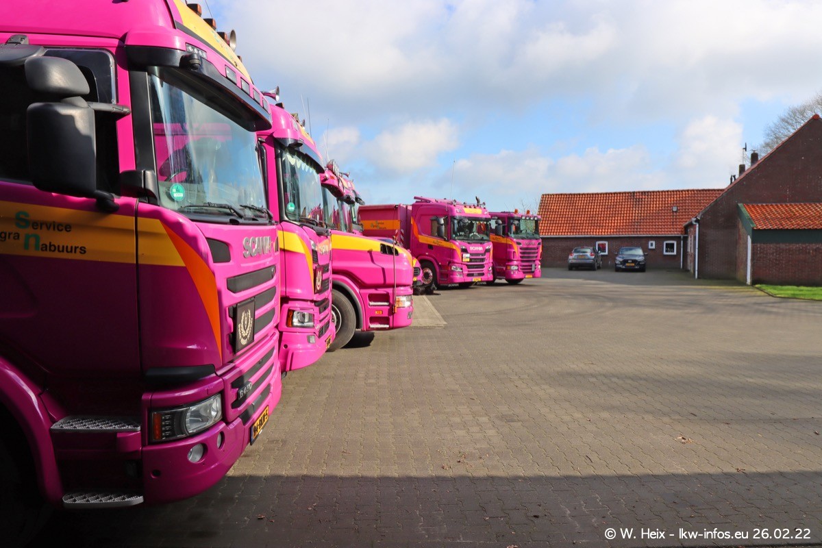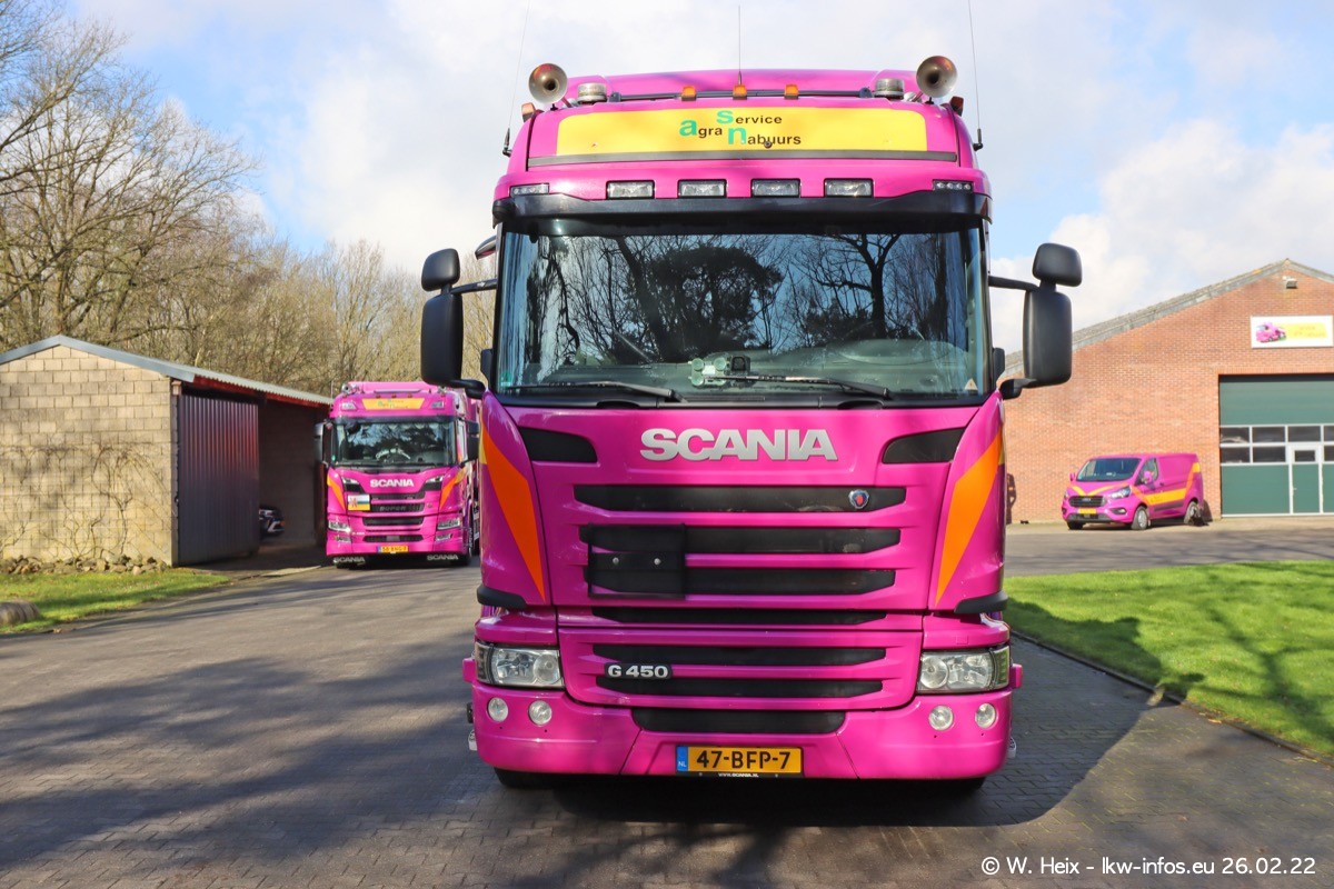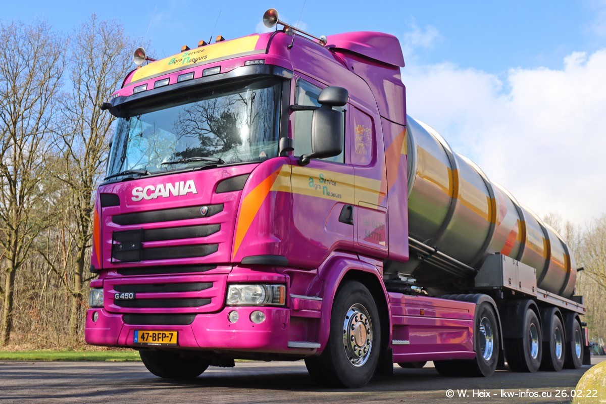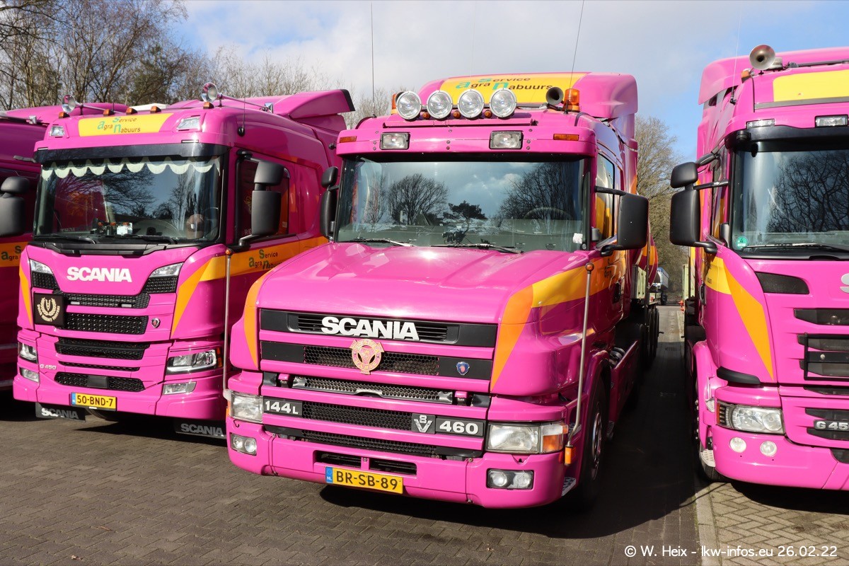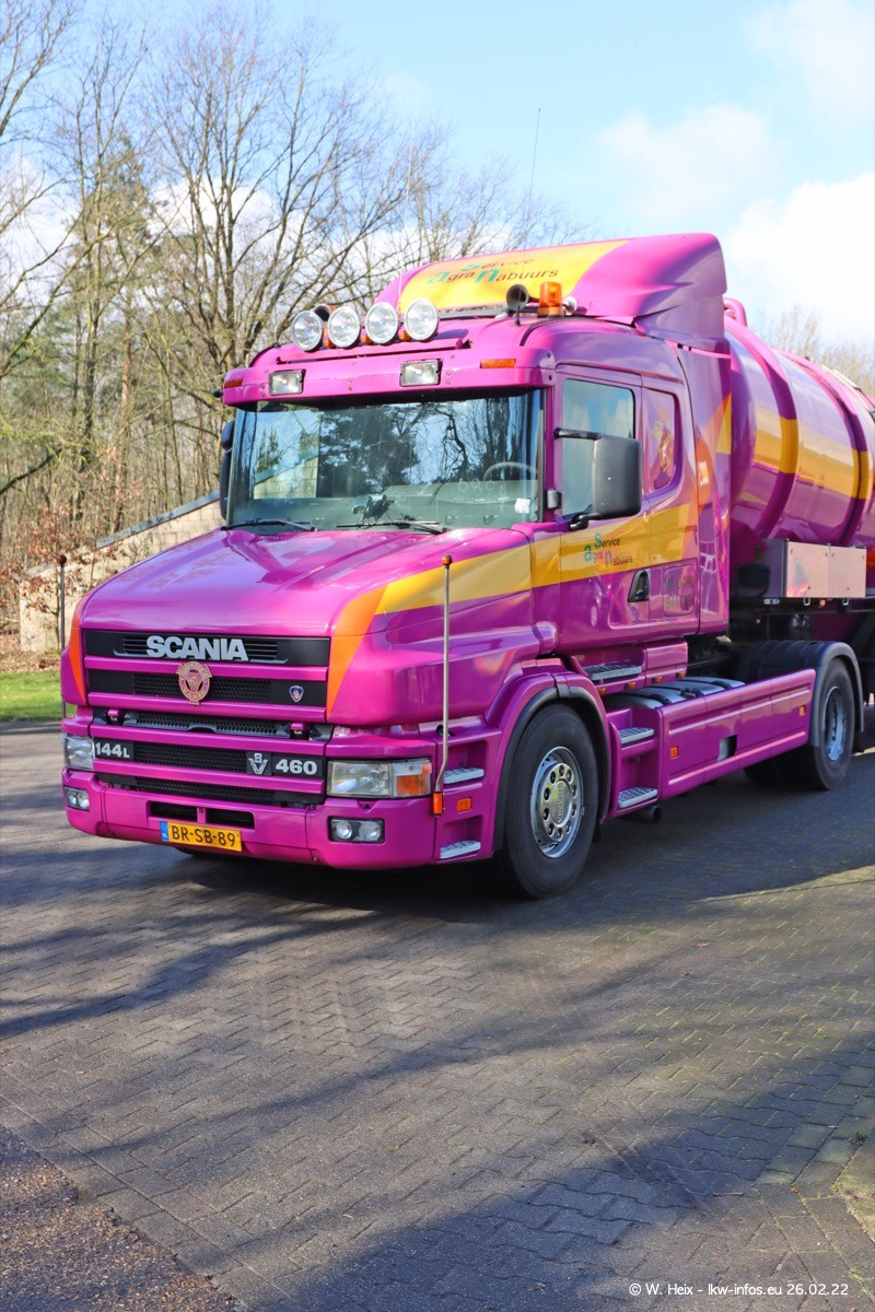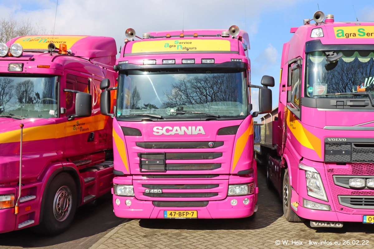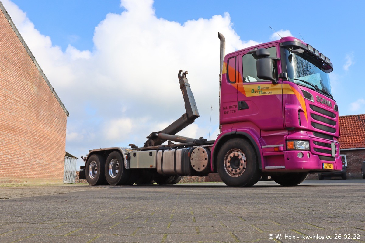 Mein erster Besuch bei der Firma Agra Service Nabuurs in Overloon (in der Nähe von Boxmeer gelegen) begann direkt mit einem schönen Fotoshooting, mit dem ich so nicht gerechnet bzw,. das ich so nicht geplant hatte. Aber gerade so macht das Hobby Spaß! Alle sieben LKW standen frisch gewaschen nebeneinander auf dem Hof. Sechs davon sind im täglichen Einsatz. Der SCANIA T 144 L 460 V8 Hauber wird nur noch als Ersatz und für Hobbyzwecke verwendet und ist inzwischen schon 21 (!) Jahre alt. Das Wetter war fast perfekt, wobei es gegen Ende des Fotoshootings leider wieder grau wurde, der Nebel kam langsam zurück.