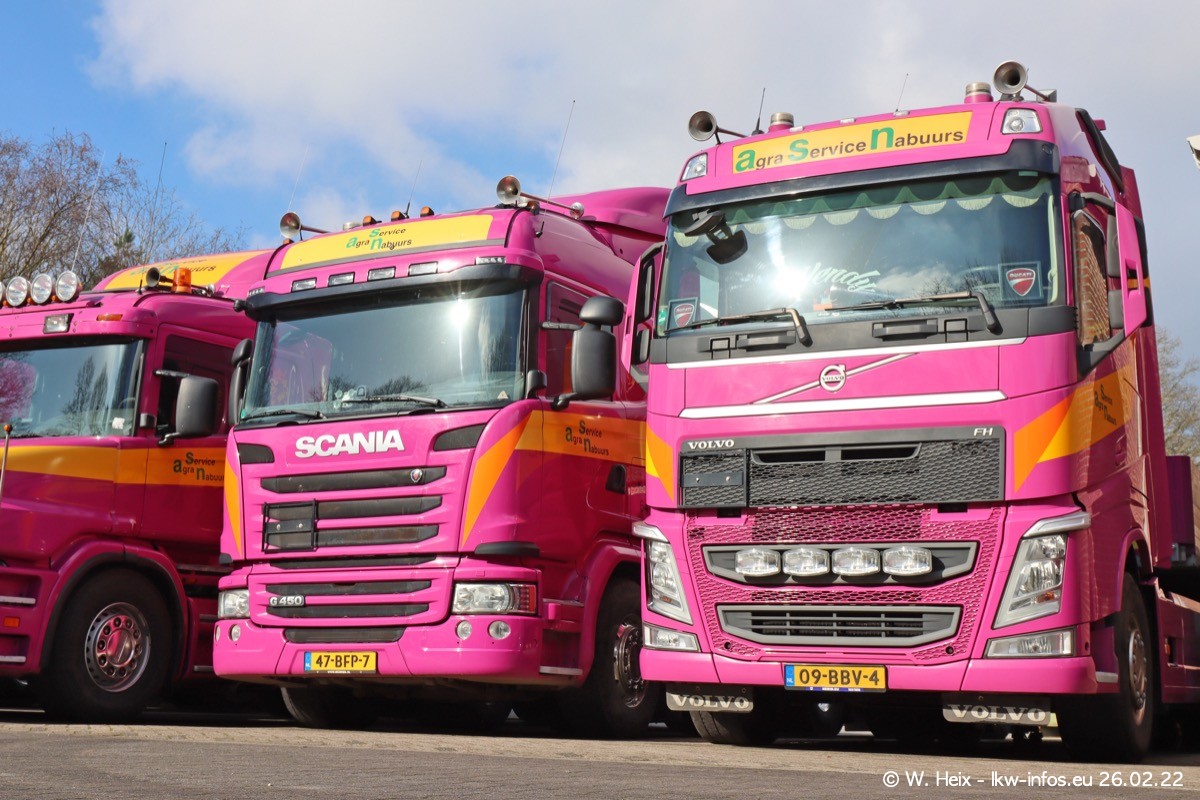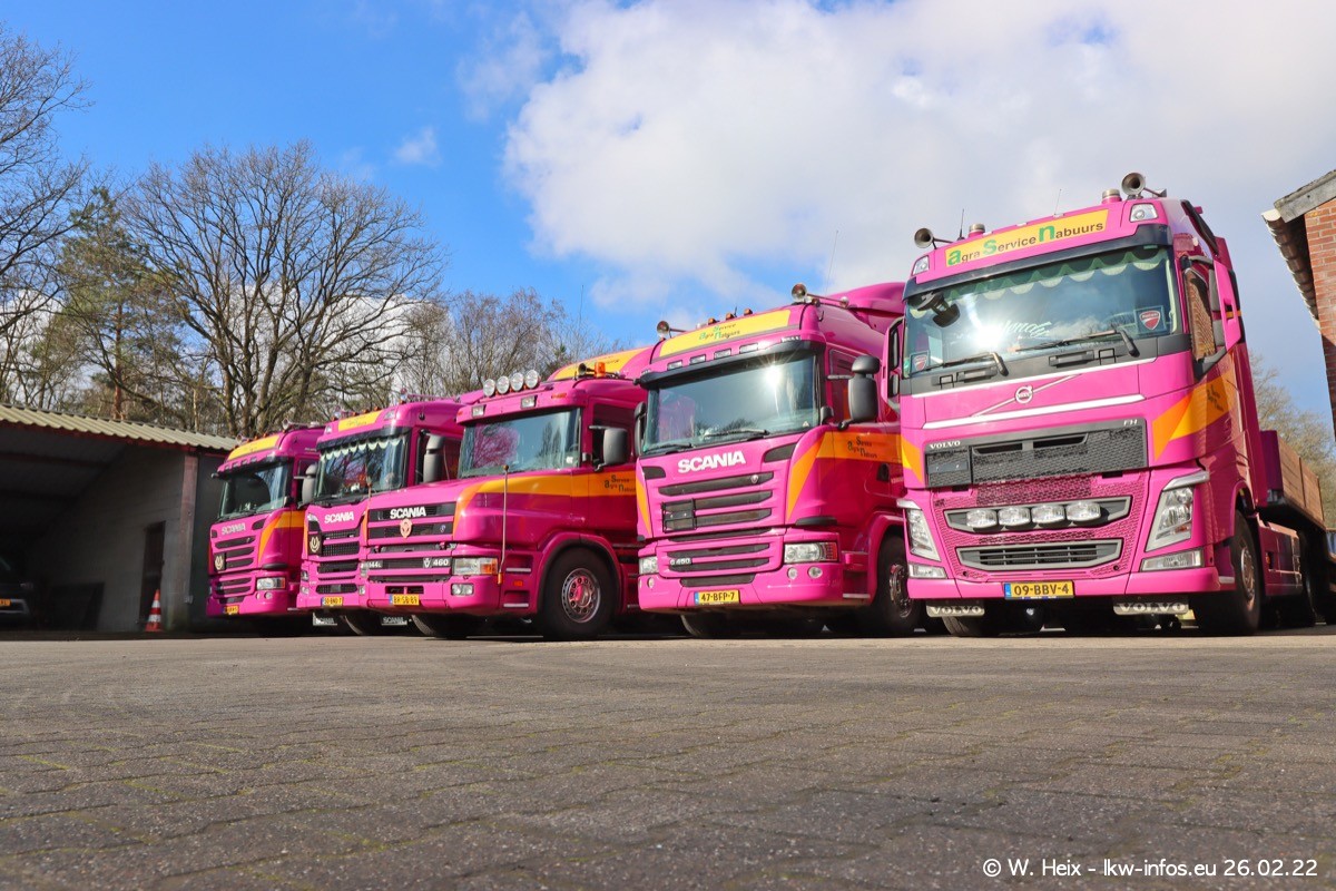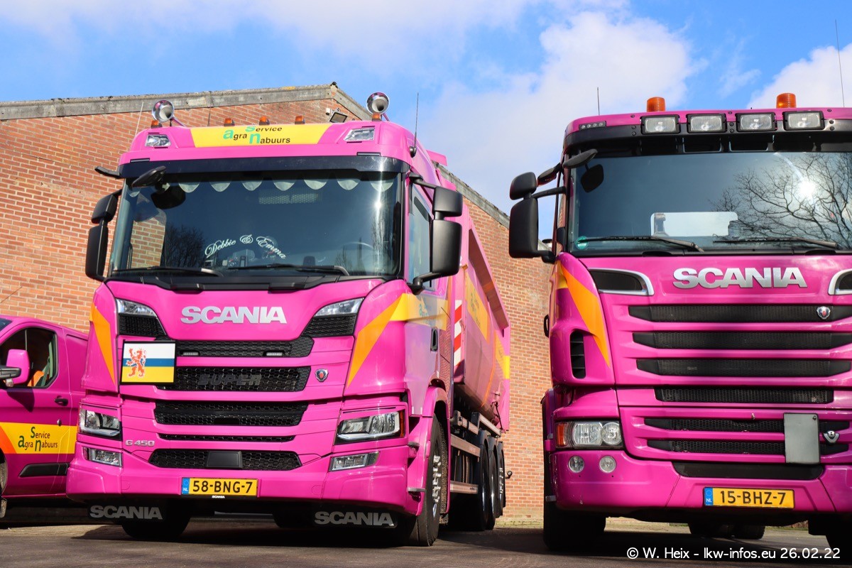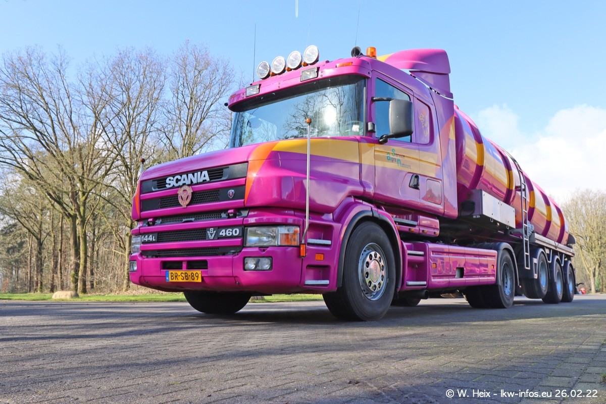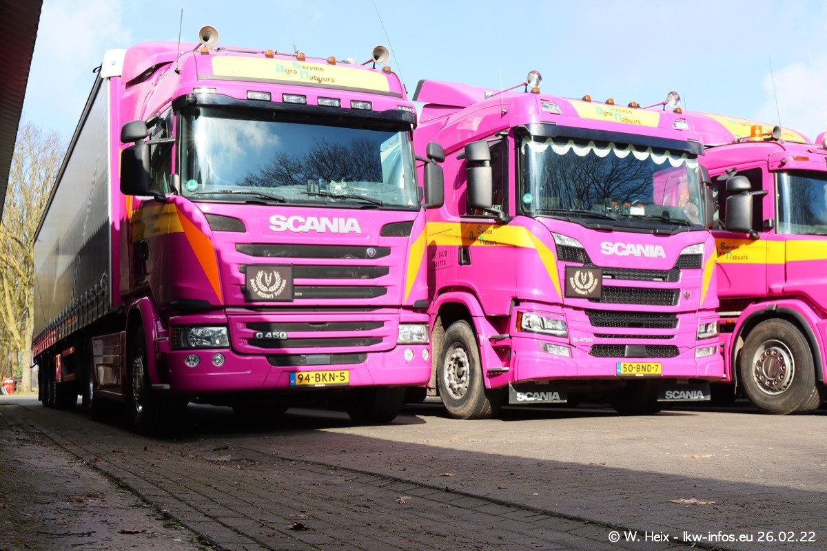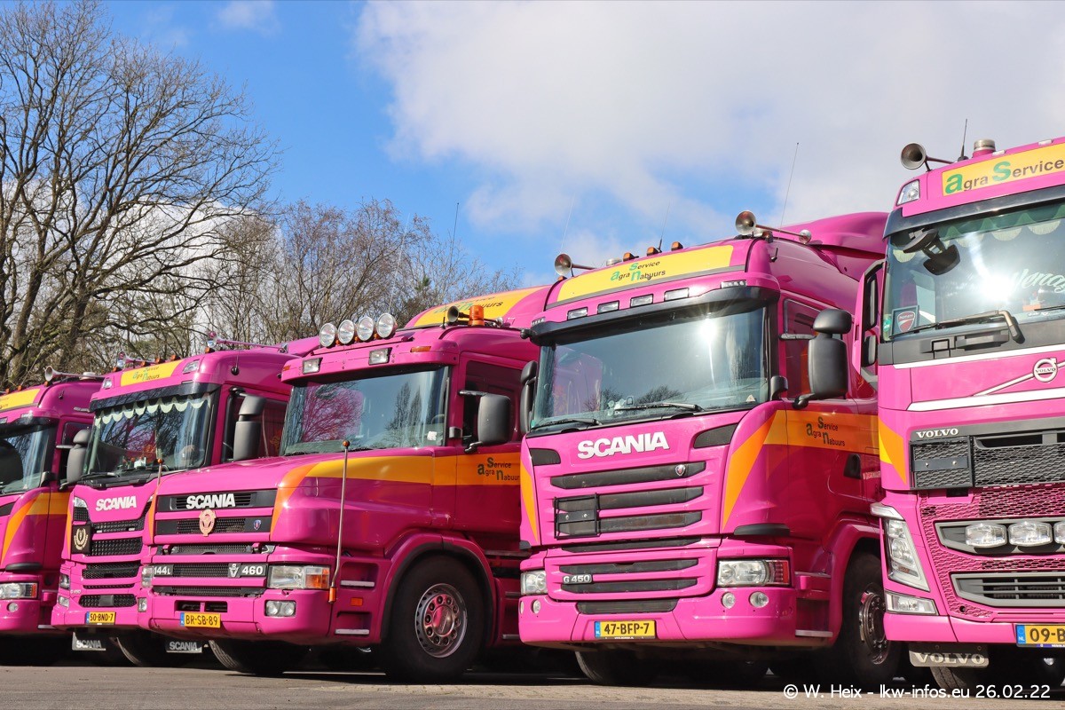 Mein erster Besuch bei der Firma Agra Service Nabuurs in Overloon (in der Nähe von Boxmeer gelegen) begann direkt mit einem schönen Fotoshooting, mit dem ich so nicht gerechnet bzw,. das ich so nicht geplant hatte. Aber gerade so macht das Hobby Spaß! Alle sieben LKW standen frisch gewaschen nebeneinander auf dem Hof. Sechs davon sind im täglichen Einsatz. Der SCANIA T 144 L 460 V8 Hauber wird nur noch als Ersatz und für Hobbyzwecke verwendet und ist inzwischen schon 21 (!) Jahre alt. Das Wetter war fast perfekt, wobei es gegen Ende des Fotoshootings leider wieder grau wurde, der Nebel kam langsam zurück.