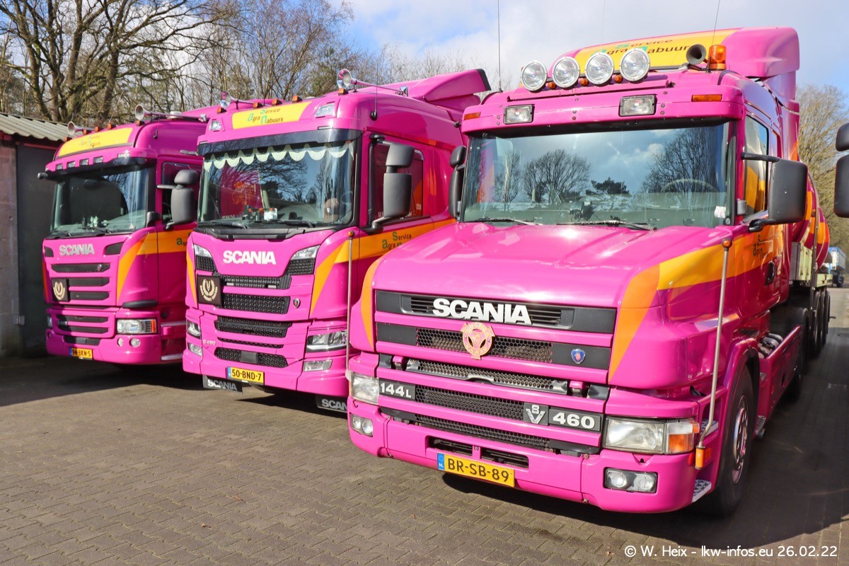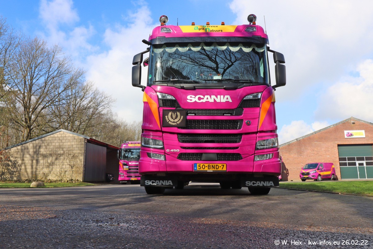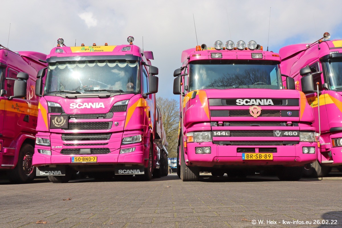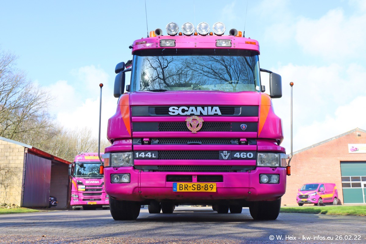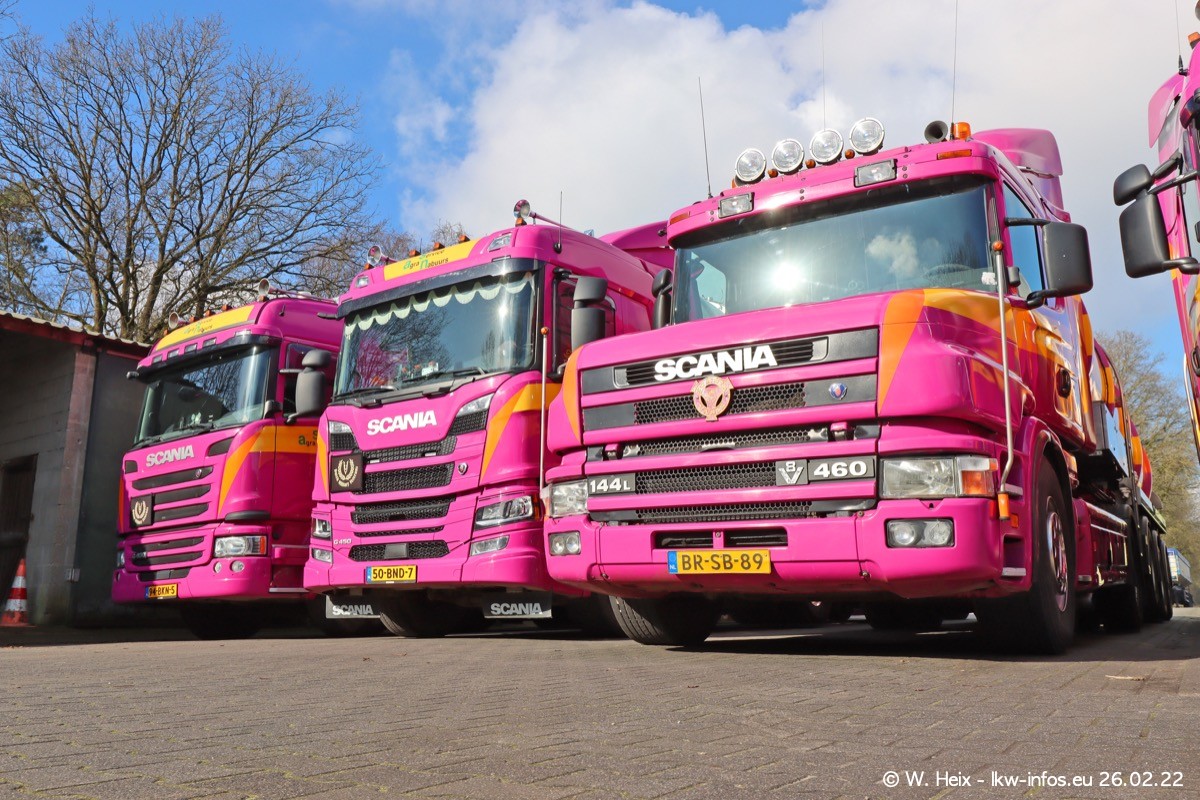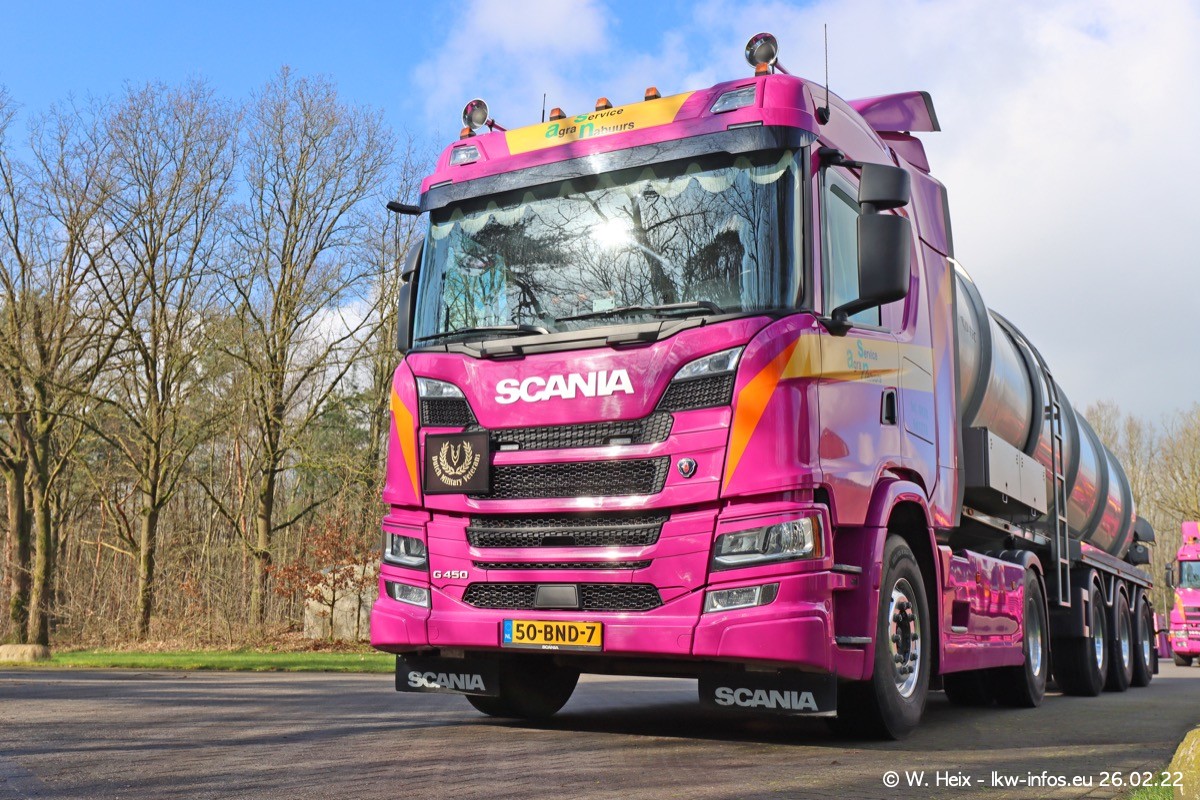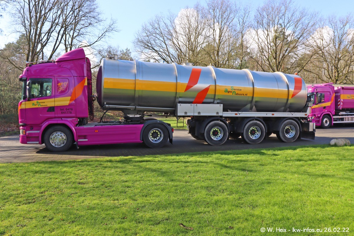 Mein erster Besuch bei der Firma Agra Service Nabuurs in Overloon (in der Nähe von Boxmeer gelegen) begann direkt mit einem schönen Fotoshooting, mit dem ich so nicht gerechnet bzw,. das ich so nicht geplant hatte. Aber gerade so macht das Hobby Spaß! Alle sieben LKW standen frisch gewaschen nebeneinander auf dem Hof. Sechs davon sind im täglichen Einsatz. Der SCANIA T 144 L 460 V8 Hauber wird nur noch als Ersatz und für Hobbyzwecke verwendet und ist inzwischen schon 21 (!) Jahre alt. Das Wetter war fast perfekt, wobei es gegen Ende des Fotoshootings leider wieder grau wurde, der Nebel kam langsam zurück.