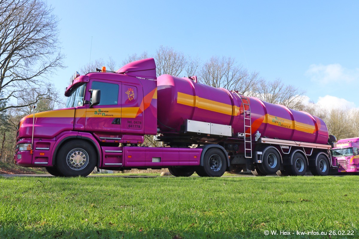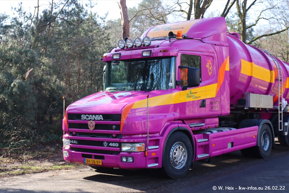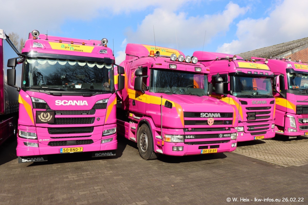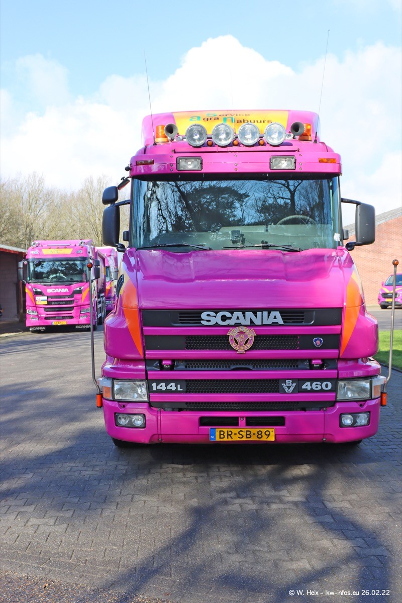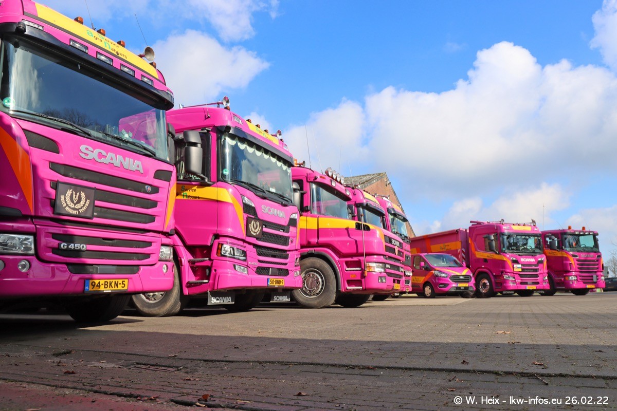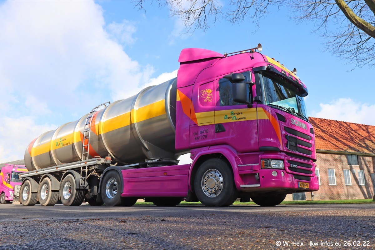 Mein erster Besuch bei der Firma Agra Service Nabuurs in Overloon (in der Nähe von Boxmeer gelegen) begann direkt mit einem schönen Fotoshooting, mit dem ich so nicht gerechnet bzw,. das ich so nicht geplant hatte. Aber gerade so macht das Hobby Spaß! Alle sieben LKW standen frisch gewaschen nebeneinander auf dem Hof. Sechs davon sind im täglichen Einsatz. Der SCANIA T 144 L 460 V8 Hauber wird nur noch als Ersatz und für Hobbyzwecke verwendet und ist inzwischen schon 21 (!) Jahre alt. Das Wetter war fast perfekt, wobei es gegen Ende des Fotoshootings leider wieder grau wurde, der Nebel kam langsam zurück.